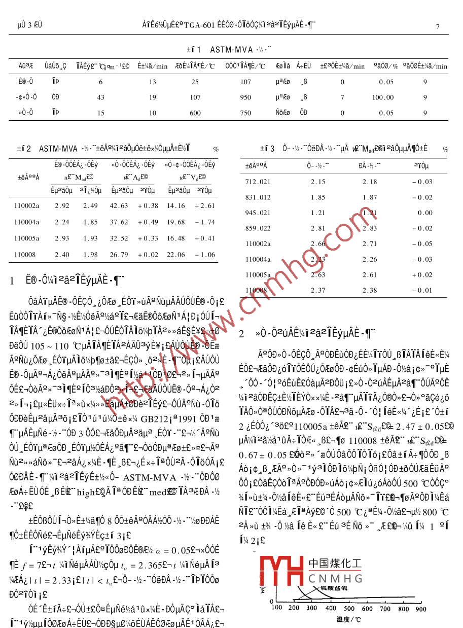 山13%3U1akμcAVol, 13 No. 32000Ae60AGUANGDONG ELECTRIC POWERJun.2000TAA±a9A007290X“2000903-000603TGA-601EE00-0l09aa2IEyμAE「ATEey2Uf-C8007af"1aeiucAHEONeNDMiEuf-1afs1a0Y 510600E000aa°TTGA601E0-0100uAa1ioua-f"y·0160 Ai HAeuNeEy4YE00AEAA0UE0j¢0-·02AEjc0·02AEμ DAHAi2a2Ey12a6AE0c0E÷110EI2a%· ETuAEtIYE10n2-C0AE0cCE;D0 AUTET'icx031作BA0 AuaieilyE-fDEoy正Ey1a隨10,道xkEE-1aBAE1 ax=DSAES10± OEC Ia. BAEA914i0DAA2aE8100EE00160c0E-0£x0·0Ex0-·0E2EyE0D-0AaA£9TQ533.2TAT×± eESAef9ADetermination of testing parameters of TGA-601 thermogravimetric analyzerLI Shu-iief-QIAN Yi-huaE Guangdong Power Test Research Institutef -Guangzhou 510600f-ChinazoAbstracte In light of the structural features of TGA-601 thermogravimetric analyzer and through analysis of a vast amount offea dataf-testing parameters such as inner moisture volatile matterfetc are redeterminedf which remedies the de-fects in configuration and testing method of the analyzer and gives further play to its advantages of stable performance andhigh automation level. The determination of calibration factors also improves the accuracy of test results as well as the workKey words%thermogravimetric analyzer E>moisture contentEmash contentEwvolatile matterEodetermination of parametersAAuAH iE E34OFOi HA TGA-601 EE00-0lo0cf- bfCEEIi FEh2uAOH OAjCEE Ii E2uA0H OA2kuE12aA0÷00A0U1a0T602 aEOjEfaAU20÷011b10AA0眶。.BE-0C0E100、62a001y910,8TAx-TAeip3c0 olHl39IEEliEjfA X0:0TA1§14100~3-EE¥AE4Aa00ysiE0AE20x÷UEAE1000℃21TA正『0E官±4℃E"aE1EUAE2x÷10621 CH OEOUEU00110iA0Tao. 1 mgf-2aAix4E-ETa003%E"1 sigmaf-ninert AHiE1Esaia' GuAEuNe-y2-2"EuNe2TEyOA%Y AA101uy0samplefqEooFo-0+o1 i OFo i Eo INOFEO iE4-1y3o *exy ASTM Ee/EE-4Bia2TEy0+i 1 20e101u TODDHA2uA°2x°0E-c0A0 CA+ 3yAEODAV4% AHA:0 SIADOAU100土ex4-“0BU620iiEHa1-E±-"ya^TENe06E00A00÷土EaaCAA9AuA00oipa101100±ex啊E8-0c1@ A ASTM-MⅤA·“A0-·“E0T01±eA00jc0-c0μAi2a1bA÷E·1a°A00E.0μA12a%i2aa100 e+eA9Ou00210E0±129i2a00UoA·cuAE0 ilaoD£x0·0pAi2a0 PqUoDNICEi2LE30££A£ciaa0u0±e330±exNAr¥A-0E∞0-c·000UA0±0μAA¥A-0 Di*f ANub中國煤化工6×00420TGA601E000160c00Iu=μA0H0A£~±0aAEcCNMHA°0E0a^a0UTE8-O2a'E+AoNu2n*oNOr9iE80E3AuAA30f-20-02a 62101 TGA-601 EtUV-U lo Eu ia@HA ASTM-們E土ANu|eEN-00°0-c-02aE±AN0. BIAIA MVA印Ne“2E0A0UT01°GB··“ DDHAA2a±N,-EE12aA0xkE-E0Ei2a£n0ae0 aTOAC u4YOCRE÷10pa~0 DAE-T14iE0aE0EU兩嫩據(jù)2 allEy i£HU 3 EUATEe2UuEfQTGA-601 EE00-0100C1i2a2lEyuAEr"±「1ASTM-MVA1·A03E0ac^AEy"℃-18E短/ min EOEVlA/001A″E/℃olaA自±30E短/min9a00/%a03E/miE8-0|pμE0Bco0000.0ip750±2 ASTM-MVA·“士eAP2a010eex)0μAE%±30--“0DA.·A"M28i2a0uA啊土%E8·0EA·0Ey∞00EA·0Ey∞0·c-00EA·0Ey土 bAotAuf m.2tEAECue v.EG712.0210.03E2auμEpμ2a0μ2opEu2a0μ20u831.012110002a2.9242.63+0.3814.16+2.6110004a2.241.8537,62+0,4919.68-1.74859.022l10005a2.939332.52+0.3316.48+0.412.712E0-0V4i2a2IEyHAE-110005a2.6+0.022.370.010 aATHAl⑥·OEcO00E0T>0 A NUHAAUOUE-0iEEuoolTAi"NS-hEn20eA Wa iE-EaE80oFEoN1AiDiOUiIASEIA E800oN1A200E0TA64TA2aEEY±020·02uAEi2a21 EyHAE·qD600105~110℃ HAIASEIA2 AAUYE¥EA0UE0EaBANu0o、E0μA16b0±a£Ec0,62ET甲EAU0UAoOD0-0EC0, AoODEuODi EE). B lATAleEEv4E8-OHAo-Ai oeA uAA@,"3INEQiva110D102-2 i-HAAsEOf-FEaoDiolioEOUi OFEoOD-CEuos lHAD-OVaj C9THE00·0}°oEUE£0aμA2Bo£0·020AEuA2aq0UA°OE0E2~030aD02,12100e0-A022a0E士EEY0xE,2aAT了A020°ace2n12ux1A+0y20N1A6,01019.eE200BeE2apA36E1010100±exGB212i1991091a們 HAEuNe300.BAap,Er.“214A02c0096891000+Ae”s112.47±0.050OU EOTH FEoOD, EOTW/OEAiaE-0oODuFEo+Emnf-AQ HAvi2ava uA- TOFE, BE-10 110008 eAe"&"s,sEd0.67±0.052002ye0U0a000T6E0a土A÷00,8N》N22A×E9.E2Ex÷1909.160A2A0,A20y=9地N00:0B0EA00EAE·T2aEyE0- ASTM-MVA··”000FEoA-EUOE BE"highf@ATa Eie"med 0 TA 3E DA-100 COaECOO1A9ODOD uAoicFEluiOA00U 500 COOC40±40aeEs£“EU3EAoμAN6T0A0BEaNE"00Ea,1Ay回0500℃E,0au800士08010E30800+80A0008E2A,0隨自EEE自9E5-、E‰面1啊0± DONee-Eμ NeEy4YEc±3E1v42j2i¨ 1yEy4Y1AiμA2T00DEEa=0.05£-x00ESE f=7E-t vi NeuAAUgOW ta=2.365E-t vi neHA l3中國煤化工AA1t1=2.3312tl