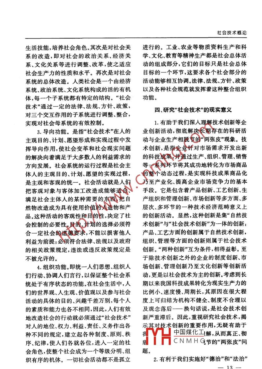 社會技術(shù)概論[哲學(xué)研究]田鵬穎(東北大學(xué)文法學(xué)院,遼寧沈陽110006)[關(guān)鍵詞]社會技術(shù);自然技術(shù);技術(shù);技術(shù)哲學(xué)[摘要]“社會技術(shù)”是存在的,它是社會科學(xué)在實踐應(yīng)用中的一個中間環(huán)節(jié),是由一定社會的政府創(chuàng)造、發(fā)明(制定)的,由全體社會成員或一定社會階層接受、使用的,是調(diào)整人與人、人與社會的關(guān)系,解央社會矛盾進而實現(xiàn)保障和改造社會目的的實踐性知識體系。“社會技術(shù)”可分為多種類型;它與社會科學(xué)、社會意識形態(tài)、“自然技術(shù)”等既有聯(lián)系又有區(qū)別;它具有保障、改造、導(dǎo)向、組織等功能。研究社會技術(shù)對于深入理解企業(yè)技術(shù)創(chuàng)新、實施德法兼治的治國方略、繼承和弘揚傳統(tǒng)文化以及深化技術(shù)哲學(xué)研究等,都具有重要的現(xiàn)實意義。.[中圖分類號)B029 ([文獻標(biāo)識碼]A [文章編號)1001 - 6198(2002)02 - 0009- 06目前哲學(xué)界贊同“社會技術(shù)”提法的人器 、新材料、新工藝這些硬的方面;也包括.日漸增多,但對“社會技術(shù)”的論證卻顯單程序設(shè)計、管理方法、預(yù)測、決策這些軟的薄。本文試圖對“社會技術(shù)”的界定、類別、方面。”(2]性質(zhì)和功能等問題加以探討,并就教于學(xué)其三,“社會技術(shù)根據(jù)社會科學(xué)理論,界同仁。根據(jù)社會調(diào)查得來的資料,制定政策、計劃與方案,擬定可操作的程序和規(guī)則,以解決一、社會技術(shù)的界定和類別社會面臨的問題?!盋3]1.社會技術(shù)的界定其四,日本哲學(xué)家三木清在其《技術(shù)哲關(guān)于“社會技術(shù)”的看法,就承認(rèn)其存學(xué)》中說:“技術(shù)存在于主體對環(huán)境的積極在的學(xué)者來說,主要有以下幾種觀點。適應(yīng)和使之發(fā)生變化并創(chuàng)造新的環(huán)境的過其一,“所謂社會技術(shù),系指調(diào)整人際程中一-如果我們所說的環(huán)境不僅僅指自(含組織關(guān)系)技術(shù)關(guān)系、經(jīng)濟關(guān)系以及其然環(huán)境,還包括社會環(huán)境的話,那么除了有他社會關(guān)系,以促進社會全面進步和可持作用于自然的技術(shù),還應(yīng)當(dāng)有作用于社會續(xù)發(fā)展的方式方法體系,即社會領(lǐng)域中的的技術(shù)。相對于自然技術(shù)來說,應(yīng)當(dāng)有社會實踐性知識體系?!?1]技術(shù)。前者以自然科學(xué)為基礎(chǔ),而后者以社其二,“現(xiàn)代技術(shù)的概念,不只是新機會科學(xué)為基礎(chǔ)。”他還指出:“作為產(chǎn)業(yè)革命中國煤化工[收稿日期)2001-11-26YHCNMHG[作者簡介]田鵬穎(1963一),男,遼寧沈陽人,博士研究生,高級經(jīng)濟師,主要從事技術(shù)哲學(xué)研究.一9-社會科學(xué)輯刊U 2002年第2期(總第139期)結(jié)果而出現(xiàn)的難題都是社會問題,社會的政策以及風(fēng)俗習(xí)慣、道德規(guī)范,等等。政治性技術(shù)用之于解決現(xiàn)代的根本問題,2.社會技術(shù)的類別當(dāng)然應(yīng)該被看作現(xiàn)代技術(shù)中特別重要的一關(guān)于技術(shù)類型的劃分,羅波爾在《技術(shù)個組成部分?!?4],系統(tǒng)論》中提出一個用一般系統(tǒng)論和現(xiàn)有其五,“技術(shù)產(chǎn)生的問題,還得需要技科學(xué)學(xué)科進行分類的方法。他把“技術(shù)”分術(shù)解決。需要技術(shù)來解決有兩方面的涵義:為:自然方面(科學(xué)、工程學(xué)、生態(tài)學(xué))、人類一是指自然技術(shù)所帶來的環(huán)境問題的解:方面(人類學(xué)、生理學(xué)、心理學(xué)、美學(xué))和社決,或是直接依靠自然技術(shù)去解決(如對污會方面(經(jīng)濟學(xué)、社會學(xué)、政治學(xué)、歷史學(xué))。水的循環(huán)利用技術(shù)) ,或是依靠自然技術(shù)的美國技術(shù)哲學(xué)家卡爾米切姆則把“技術(shù)”分進步去解決(如改進技術(shù)減少環(huán)境污染);為意志的技術(shù)、對象的技術(shù)、過程的技術(shù)、二是指要控制自然技術(shù)對環(huán)境的干預(yù),就.知識的技術(shù)四類。[6)法國技術(shù)哲學(xué)家埃呂要運用法律這一‘社會技術(shù)’,不僅在人類爾較早地提出了“政治技術(shù)”、“社會組織技的日常生活中使用技術(shù),而且還要用技術(shù)術(shù)”、“社會心理技術(shù)”等“社會技術(shù)?!边@些保護物種和環(huán)境,進行生物學(xué)意義上的研類型劃分有助于加深我們對“社會技術(shù)”的究,采取法律強制措施。技術(shù)威脅自然,并認(rèn)識。社會技術(shù)的類型其實可作多種劃分,且也管理這種威脅?!?5)大到國家制度,小到企業(yè)、機關(guān)、學(xué)校管理,上述五種觀點,有的是從解決社會問凡是有人、有組織的地方便有它的存在。依.題考慮,有的從應(yīng)對“自然技術(shù)”的挑戰(zhàn)著據(jù)社會技術(shù)在多方面性質(zhì)、特點的不同,我眼,有的從技術(shù)發(fā)生作用的特點人手。盡管們可以做進-步的劃分。角度和側(cè)重點有所不同,但有一點是相同例如,根據(jù)社會技術(shù)的領(lǐng)域不同,“社的,即都認(rèn)為“社會技術(shù)”是社會科學(xué)的應(yīng)會技術(shù)”可分為“社會政治技術(shù)”、“社會經(jīng)用,是人們改造社會的手