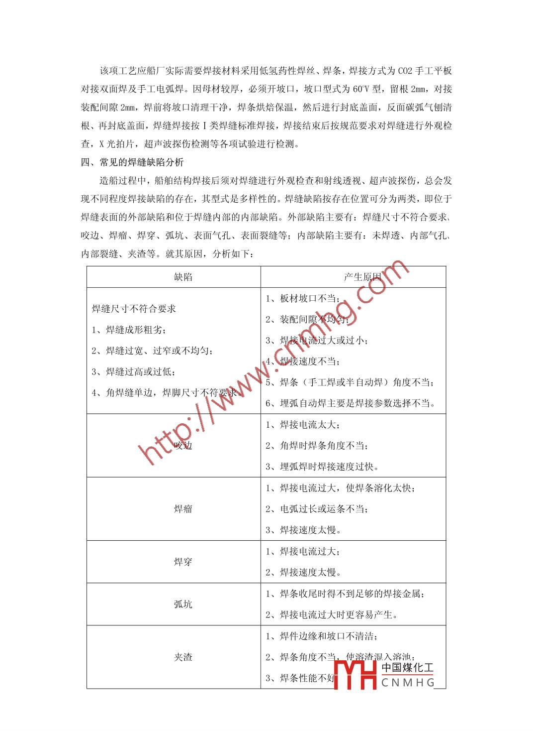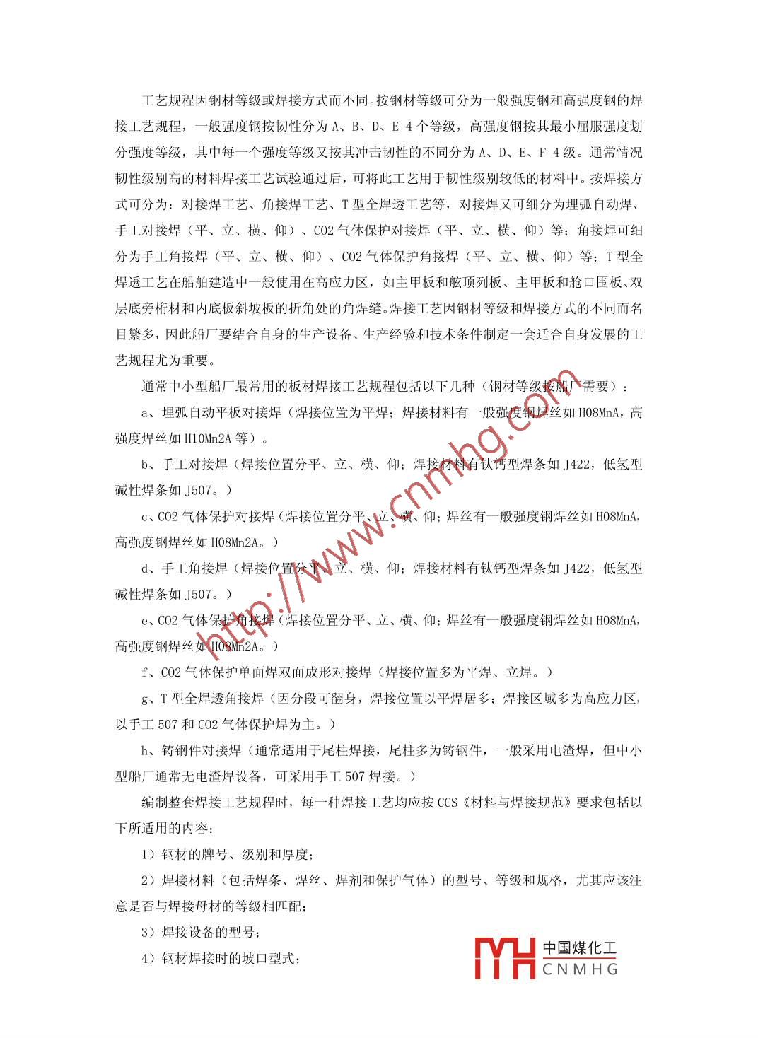 焊接工藝認(rèn)可及其應(yīng)用郝鑫西北造船廠甘肅省731600【摘要】近幾年,隨著航運(yùn)業(yè)和造船業(yè)的迅猛發(fā)展,世界造船業(yè)向中國的產(chǎn)業(yè)轉(zhuǎn)移,在我國沿海沿江地區(qū)引發(fā)了較大規(guī)模的造船熱。各類規(guī)模不等的民營造船企業(yè)遍布在經(jīng)濟(jì)較為發(fā)達(dá)的沿海沿江地區(qū)。船舶開工建造前,造船廠應(yīng)根據(jù)自身的技術(shù)條件和生產(chǎn)設(shè)備等因素,同時(shí)結(jié)合批準(zhǔn)圖紙中的鋼材使用型號制定詳細(xì)的工藝規(guī)程。工藝規(guī)程因鋼材等級或焊接方式而不同。按鋼材等級可分為一般強(qiáng)度鋼和高強(qiáng)度鋼的焊接工藝規(guī)程,一般強(qiáng)度鋼按韌性分為A、B、D、E4個(gè)等級,高強(qiáng)度鋼按其最小屈服強(qiáng)度劃分強(qiáng)度等級,其中每一個(gè)強(qiáng)度等級又按其沖擊韌性的不同分為A、D、E、F4級【關(guān)鍵詞】焊接、發(fā)展、認(rèn)可、工藝中圖分類號:P755.1文獻(xiàn)標(biāo)識(shí)碼:A文章編號The welding procedure qualification and its application( Abstract I In recent years, with the rapid development of the shipping industry and shipbuilding, the worldshipbuilding industry to China's industrial transfer, led to large-scale shipbuilding heat in coastal areas along theYangtze River in China. Of all sizes, ranging from private shipbuilding enterprises throughout the moreeconomically developed coastal areas along the Y angtze River. Emerging private shipbuilding enterprises to applyfor the construction of CCs-class ship, the welding process is one of the necessary conditions for recognition as hebegan to build the shipyard and surveyor attaches great importance to the reasonable development of the weldingprocess and the implementation of the construction process welding process directly affects thethe quality of theconstruction of the ship(Key words] Welding, development, approval, proces近幾年,隨著航運(yùn)業(yè)和造船業(yè)的迅猛發(fā)展,世界造船業(yè)向中國的產(chǎn)業(yè)轉(zhuǎn)移,在我國沿海沿江地區(qū)引發(fā)了較大規(guī)模的造船熱。各類規(guī)模不等的民營造船企業(yè)遍布在經(jīng)濟(jì)較為發(fā)達(dá)的沿海沿江地區(qū)。新興的民營造船企業(yè)申請建造CCS級船舶時(shí),焊接工藝認(rèn)可作為開工建造的必要條件之一受到船廠和驗(yàn)船師的高度重視,焊接工藝的合理制定和建造過程中焊接工藝的執(zhí)行程度直接影響著船舶的建造質(zhì)量。焊接工藝規(guī)程的制定船舶開工建造前,造船廠應(yīng)根據(jù)自身的技術(shù)條件和生產(chǎn)設(shè)備等因素,同時(shí)結(jié)合批準(zhǔn)圖紙中的鋼材使用型號制定詳細(xì)的工藝規(guī)程。中國煤化工CNMHG工藝規(guī)程因鋼材等級或焊接方式而不同。按鋼材等級可分為一般強(qiáng)度鋼和高強(qiáng)度鋼的焊接工藝規(guī)程,一般強(qiáng)度鋼按韌性分為A、B、D、E4個(gè)等級,高強(qiáng)度鋼按其最小屈服強(qiáng)度劃分強(qiáng)度等級,其中每一個(gè)強(qiáng)度等級又按其沖擊韌性的不同分為A、D、E、F4級。通常情況韌性級別高的材料焊接工藝試驗(yàn)通過后,可將此工藝用于韌性級別較低的材料中。按焊接方式可分為:對接焊工芑、角接焊工藝、T型全焊透工藝等,對接焊又可細(xì)分為埋弧自動(dòng)焊、手工對接焊(平、立、橫、仰)、C02氣體保護(hù)對接焊(平、立、橫、仰)等;角接焊可細(xì)分為手工角接焊(平、立、橫、仰)、CO2氣體保護(hù)角接焊(平、立、橫、仰)等;T型全焊透工藝在船舶建造中一般使用在高應(yīng)力區(qū),如主甲板和舷頂列板、主甲板和艙口圍板、雙層底旁桁材和內(nèi)底板斜坡板的折角處的角焊縫。焊接工藝因鋼材等級和焊接方式的不同而名目繁多,因此船廠要結(jié)合自身的生產(chǎn)設(shè)備、生產(chǎn)經(jīng)驗(yàn)和技術(shù)條件制定一套適合自身發(fā)展的工藝規(guī)程尤為重要。通常中小型船廠最常用的板材焊接工藝規(guī)程包括以下幾種(鋼材等級按船廠需要)a、埋弧自動(dòng)平板對接焊(焊接位置為平焊;焊接材料有一般強(qiáng)度鋼焊絲如HOδMnA,髙強(qiáng)度焊絲如H0Mn2A等)b、手工對接焊(焊接位置分平、立、橫、仰;焊接材料有鈦鈣型焊條如J422,低氫型堿性焊條如J507。)c、CO2氣體保護(hù)對接焊(焊接位置分平、立、橫、仰;焊絲有一般強(qiáng)度鋼焊絲如HO8MnA高強(qiáng)度鋼焊絲如H08Mn2A。)d、手工角接焊(焊接位置分平、立、橫、仰;焊接材料有鈦鈣型焊條如J422,低氫型堿性焊條如J507。)e、CO2氣體保護(hù)角接焊(焊接位置分平、立、橫、仰;焊絲有一般強(qiáng)度鋼焊絲如H8MnA高強(qiáng)度鋼焊絲如H08Mn2A。)f、CO2氣體保護(hù)單面焊雙面成形對接焊(焊接位置多為平焊、立焊。)g、T型全焊透角接焊(因分段可翻身,焊接位置以平焊居多;焊接區(qū)域多為高應(yīng)力區(qū),以手工507和C02氣體保護(hù)焊為主。)h、鑄鋼件對接焊(通常適用于尾柱焊接,尾柱多為鑄鋼件,一般釆用電渣焊,但中小型船廠通常無電渣焊設(shè)備,可采用手工507焊接。)編制整套焊接工藝規(guī)程時(shí),每一種焊接工藝均應(yīng)按αCS《材料與焊接規(guī)范》要求包括以下所適用的內(nèi)容:1)鋼材的牌號、級別和厚度2)焊接材料(包括焊條、焊絲、焊劑和保護(hù)氣體)的型號、等級和規(guī)格,尤其應(yīng)該注意是否與焊接母材的等級相匹配: