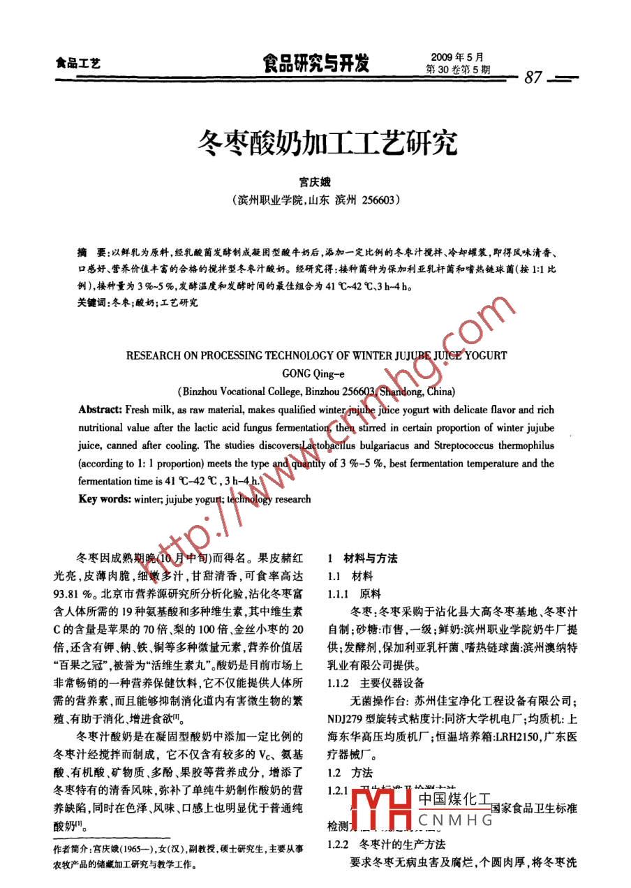 食品工藝食品研究與開發(fā)2009年5月第30卷第5期—87冬棗酸奶加工工藝研究宮慶娥濱州職業(yè)學(xué)院,山東濱州256603)摘要:以鮮乳為原料,經(jīng)乳酸菌發(fā)酵制成凝固型釀牛奶后,添加一定比例的冬棗汁攪拌、冷卻罐裝,即得風(fēng)味清香口感妤、營養(yǎng)價(jià)值豐富的合格的攪拌型冬棗汁酸奶。經(jīng)研究得:接種菌種為保加利亞乳杄菌和嗜熱鏈球蘺(按1:1比例)接種量為3%-5%,發(fā)酵溫度和發(fā)酵時(shí)間的最佳組合為41℃42℃3h-4h關(guān)鍵詞:冬棗;酸奶;工藝研究RESEARCH ON PROCESSING TECHNOLOGY OF WINTER JUJUBE JUICE YOGURTGONG Qing-eBinzhou Vocational College, Binzhou 256603, Shandong, China)Abstract: Fresh milk, as raw material, makes qualified winter jujube juice yogurt with delicate flavor and richnutritional value after the lactic acid fungus fermentation, then stirred in certain proportion of winter jujubejuice, canned after cooling. The studies discovers: Lactobacilus bulgaricus and Streptococcus thermophilus(according to 1: I proportion)meets the type and quantity of 3 %-5%, best fermentation temperature and thefermentation time is4l℃42℃,3h-4h.Key words: winter; jujube yogurt; technology research冬棗因成熟期晚(10月中旬)而得名。果皮赭紅1材料與方法光亮,皮薄肉脆,細(xì)嫩多汁,甘甜清香,可食率高達(dá)1材料9381%。北京市營養(yǎng)源研究所分析化驗(yàn)沾化冬棗富1.1.1原料含人體所需的19種氨基酸和多種維生素其中維生素冬棗:冬棗采購于沾化縣大高冬棗基地、冬棗汁C的含量是蘋果的70倍、梨的100倍、金絲小棗的20自制;砂糖:市售,一級;鮮奶:濱州職業(yè)學(xué)院奶牛廠提倍還含有鉀、鈉、鐵銅等多種微量元素,營養(yǎng)價(jià)值居供;發(fā)酵劑,保加利亞乳桿菌、嗜熱鏈球菌濱州澳納特“百果之冠”,被譽(yù)為“活維生素丸”。酸奶是目前市場上乳業(yè)有限公司提供。非常暢銷的一種營養(yǎng)保健飲料,它不僅能提供人體所1.1.2主要儀器設(shè)備需的營養(yǎng)素而且能夠抑制消化道內(nèi)有害微生物的繁無菌操作臺:蘇州佳寶凈化工程設(shè)備有限公司;殖、有助于消化增進(jìn)食欲。ND279型旋轉(zhuǎn)式粘度計(jì)同濟(jì)大學(xué)機(jī)電廠;均質(zhì)機(jī):上冬棗汁酸奶是在凝固型酸奶中添加一定比例的海東華高壓均質(zhì)機(jī)廠;恒溫培養(yǎng)箱:LRH2150,廣東醫(yī)冬棗汁經(jīng)攪拌而制成,它不僅含有較多的vc、氨基療器械廠酸、有機(jī)酸礦物質(zhì)多酚、果膠等營養(yǎng)成分,增添了12方法冬棗特有的清香風(fēng)味彌補(bǔ)了單純牛奶制作酸奶的營121+ sId養(yǎng)缺陷,同時(shí)在色澤、風(fēng)味、口感上也明顯優(yōu)于普通純中國煤化工國家食品衛(wèi)生標(biāo)準(zhǔn)酸奶"。檢測CNMHG作者簡介:宮慶娥(95-),女(漢),副教授碩士研究生,主要從事1.2冬棗汁的生產(chǎn)方法農(nóng)牧產(chǎn)品的儲藏加工研充與教學(xué)工作要求冬棗無病蟲害及腐爛,個(gè)圓肉厚,將冬棗洗2009年5月88第30卷第5期食品研究與開發(fā)食品工藝凈去核。按鮮棗與水1:的比例打漿,然后在80℃~灌裝后的產(chǎn)品移入0℃-7℃條件冷藏24h進(jìn)行后熟,90℃加熱20min-30min,過濾,取汁進(jìn)一步促使芳香物質(zhì)的產(chǎn)生和粘稠度的改善。1.23攪拌型冬棗汁酸奶生產(chǎn)方法8)成品貯藏1231工藝流程所得產(chǎn)品在0℃~7℃冷藏條件下貯藏原料乳驗(yàn)收與預(yù)處理→預(yù)熱均質(zhì)→殺菌→冷卻→菌種→母發(fā)酵劑→生產(chǎn)發(fā)酵劑2結(jié)果與分析21冬棗汁加入量及酸奶最佳后熟時(shí)間試驗(yàn)添加發(fā)酵劑→保溫發(fā)酵→冷卻→添加冬棗汁→攪冬棗汁加入量的確定是該課題研究的關(guān)鍵技術(shù)。拌→灌裝→冷藏后熟→成品本研究通過實(shí)驗(yàn)篩選出冬棗汁的最佳加入量及酸奶冬棗汁最佳后熟時(shí)間,結(jié)果見表1。123.2操作要點(diǎn)表1冬棗汁加入量及酸奶最佳后熟時(shí)間試驗(yàn)1)原料乳驗(yàn)收與預(yù)處理Table 1 winter Date juice and yogurt addition要求原料奶來源于健康無病奶牛所產(chǎn)的鮮乳,色澤呈乳白或微黃色,氣味芳香、無異味,酸度不超過處理A冬棗汁加入量%B后熟時(shí)間d感官評定(得分)18°,對鮮乳進(jìn)行密度檢查(密度1026-1032平均quantity added/%time/d為1030)與酒精試驗(yàn)(70%酒精試驗(yàn)無絮狀沉淀),檢驗(yàn)合格者進(jìn)行過濾凈化處理后方可用于酸奶加工。2)預(yù)熱、調(diào)配、均質(zhì)將鮮奶置于不銹鋼鍋內(nèi),加熱到55℃-60℃,加入白砂糖并攪拌均勻,在高壓均質(zhì)機(jī)內(nèi)用40MPa均質(zhì)05888處理使料液達(dá)到均勻乳化和細(xì)膩的組織狀態(tài)。3)殺菌、冷卻67893131將均質(zhì)料液加熱到90℃-95℃殺菌5min,冷卻至42℃左右。分析表明冬棗汁加入量以3℃為最適宜,過高影4)添加發(fā)酵劑響酸奶的穩(wěn)定性,過低冬棗的清香則太淡,營養(yǎng)價(jià)值也將活化后的混合發(fā)酵劑充分?jǐn)嚢杈鶆虬?%比例加降低;同時(shí)確定在0℃-7℃的貯藏條件下,產(chǎn)品風(fēng)味人冷卻后的料液中同時(shí)攪拌5mn使發(fā)酵劑均勻分布。最佳的冷藏后熟時(shí)間為7d5)保溫發(fā)酵22最佳接種量的試驗(yàn)在41℃-42℃條件下保溫發(fā)酵,3h-4h本研究采用的是保加利亞乳桿菌和嗜熱鏈球菌6)冷卻加冬棗汁按11的比例混合菌種接種發(fā)酵,避免單一菌種帶來將保溫發(fā)酵好的酸奶冷卻至20℃左右加入冬棗的缺陷研究表明最佳
