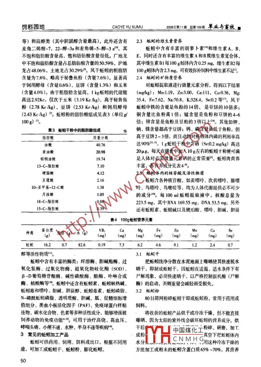 飼料園地CAOYE YU XUMU2009年第11益第168期 草業(yè)與畜牧■蚯蚓飼料添加劑在養(yǎng)禽業(yè)中的應(yīng)用李維,張勇(沈陽(yáng)農(nóng)業(yè)大學(xué)畜牧獸醫(yī)學(xué)院,遼寧沈陽(yáng)110161)摘要:綜述了蚯蚓的品種、生活習(xí)性、生活條件、營(yíng)養(yǎng)成分、加工產(chǎn)品以及蚯蚓飼料在畜牧業(yè)中的應(yīng)用及其應(yīng)用前景等關(guān)鍵詞:蚯蚓;營(yíng)養(yǎng)作用;肉雞中圖分類(lèi)號(hào): S816文獻(xiàn)標(biāo)識(shí)碼: B文章編號(hào): 1673-8403(2009)11-0048-051蚯蚓的品種1.4 白頸環(huán)毛蚓蚯蚓又稱蛐蟮、地龍,隸屬于環(huán)節(jié)動(dòng)物[ ]寡毛長(zhǎng)80~150毫米,寬2.5 ~5毫米,背色中灰色或栗綱。目前,全世界已知的蚯蚓品種約2700多種,我色,后部淡綠色。分布于長(zhǎng)江中下游一-帶,具有分布國(guó)有160多種。蚯蚓除了在農(nóng)業(yè)生產(chǎn)中有改土肥田的較廣、定居性較好的特點(diǎn),宜在桌地、紅薯等作物地作用外,由于其蛋白含量高,營(yíng)養(yǎng)豐富,繁殖迅速,里養(yǎng)殖。食性雜,人工養(yǎng)殖產(chǎn)量高,藥用價(jià)值高,經(jīng)濟(jì)效益好1.5 愛(ài)勝屬蚯蚓而被很多國(guó)家重視并養(yǎng)殖與研究,現(xiàn)已在食品、醫(yī)該屬近20種,在我國(guó)各省區(qū)都有分布。目前世界藥、飼料和環(huán)保等領(lǐng)域廣泛應(yīng)用29。上養(yǎng)殖最普遍的就是該屬的赤子愛(ài)勝蚓和紅色愛(ài)勝1.1威廉環(huán)毛蚓蚓。赤子愛(ài)勝蚓長(zhǎng)60~130毫米,寬3~5毫米,成熟體-般長(zhǎng)90-250毫米,寬5~10毫米, 背面青黃或重0.4~1.2克。背面及側(cè)面橙紅或栗紅色,外觀有明顯灰綠色,背中線青灰色。目前在江蘇、上海- -帶養(yǎng)殖條紋,尾部?jī)蓚?cè)姜黃色。喜在爛草堆、污泥、垃圾場(chǎng)較多。生活,具有趨肥性強(qiáng)、繁殖率高、定居性好、肉質(zhì)肥1.2 湖北環(huán)毛蚓厚及營(yíng)養(yǎng)價(jià)值高等優(yōu)點(diǎn)"。體細(xì)長(zhǎng),長(zhǎng)70-220毫米, 寬3~6毫米,身草綠1.6 大平二號(hào)蚯蚓色,背中線紫綠或深綠色,常見(jiàn)一紅色的背血管。腹大平二號(hào)蚯蚓優(yōu)系是用大平二號(hào)蚯蚓在20年的養(yǎng)面灰色,尾部體腔液中常有寶藍(lán)色熒光,是繁殖率較殖中精心優(yōu)選繁育而成。成蚓體長(zhǎng)70毫米左右,大者高和適應(yīng)性較廣的品種。達(dá)150毫米,徑粗4~7毫米,體表紅亮,體腔厚,肉1.3 參環(huán)毛蚓質(zhì)多,生長(zhǎng)快,壽命長(zhǎng),易飼養(yǎng),適應(yīng)性強(qiáng),繁殖率個(gè)體較大,長(zhǎng)120- 400毫米,寬6~12毫米,背面高。干制品含粗蛋白66.3%~72%、脂肪7.9%、碳水紫灰,后部顏色較深,剛毛圈稍白,為中藥材常用蚯化合物14.2%,氨基酸豐足齊全,鐵含量是魚(yú)粉的14蚓,分布于湖南、廣東、廣西、福建等地,較難定倍"。居,在優(yōu)質(zhì)土壤的草地和灌溉條件較好的果園和苗圃2蚯蚓粉的營(yíng)養(yǎng)成分中養(yǎng)殖較好。氣基酸、激素、生長(zhǎng)收稿日期: 2009-03-18 .誘導(dǎo)中國(guó)煤化工雞。作者簡(jiǎn)介:李維(1986- ), 女(蒙古族), 沈陽(yáng)農(nóng)業(yè)大學(xué)在讀2.1HHCNMHG碩士,主要研究方向是動(dòng)物營(yíng)養(yǎng)與飼料研究。蚯蚓蛋白質(zhì)含量十分豐富,新鮮蚯蚓蛋白質(zhì)含量。草業(yè)與畜牧2009年第11期 總第168期CAOYE YU XUMU飼料園地占20%以上%。蚯蚓干物質(zhì)中蛋白質(zhì)含量平均為(含量46.2%),是玉米(含量9.0%) 的6倍17: (見(jiàn)表56.5%,最高可達(dá)71.0%。雖然略低于秘魯魚(yú)粉(含1)。蚯蚓粉的蛋白含量與進(jìn)口魚(yú)粉相當(dāng),高于國(guó)產(chǎn)魚(yú)量64.3%),但高于飼用酵母(含量51.4%)、豆餅粉"。表1蚯蚓和幾種普通飼料的營(yíng)養(yǎng)成分比較%原料干物質(zhì)粗蛋白粗脂肪粗纖維無(wú)氦浸出物灰分鈣磷鮮蚯蚓15.8011.021.893.400.22蚯蚓粉90.6054.6017.3421.202.75秘魯魚(yú)粉90.8062.009.700.3014.403.912.90中國(guó)魚(yú)粉88.5053.609.300.5018.904.592.15酵母90.7051.409.602.0028.308.40豆餅88.1043.005.405.7029.605.900.32玉米86.508.603.5069.601.400.040.21麥麩88.0014.208.204.400.141.06蚯蚓糞82.207.901.1034.200.28影響蛋白質(zhì)營(yíng)養(yǎng)價(jià)值及質(zhì)量的最重要的因素,主異,但均非常豐富。蚯蚓所含的精氨酸、色氨酸、要取決于必需氨基酸的含量和比率。蚯蚓中含有18種賴氨酸、蛋氨酸、胱氨酸等動(dòng)物必需氨基酸種類(lèi)較氨基酸:亮氨酸、谷氨酸、天冬氨酸、纈氨酸、賴氨為齊全。各種必需氨基酸的組成與含量?jī)?yōu)于豆餅和酸、精氨酸、丙氨酸、甘氨酸、蛋氨酸、絲氨酸、蘇玉米,接近魚(yú)粉,和飼用酵母相當(dāng)(見(jiàn)表2)”。蚯氨酸、苯丙氨酸、脯氨酸、組氨酸和酪氨酸等,其中蚓蛋白中精氨酸含量約為花生蛋白的2倍,是魚(yú)蛋白以亮氨酸和谷氨酸含量最高"”。一般來(lái)說(shuō),魚(yú)粉腥昧的2~3倍;色氨酸的含量約為動(dòng)物血粉蛋白的4倍,重,影響食用魚(yú)粉為主的動(dòng)物的品質(zhì),添加蚯蚓粉之為牛肝的7倍1B3.4,賴氨酸含量(4.3%) ”約為牛肉后,動(dòng)物的肉質(zhì)變得鮮美,這是因?yàn)轵球靖缓劝彼?,?.9倍, 為豬肉的4.6倍間。蚯蚓作為蛋白飼料,不其谷氨酸的含量占氨基酸總量的比重高達(dá)8.219%/"。足之處是硫氨酸含量較低,在飼喂單胃動(dòng)物時(shí),最動(dòng)物發(fā)育所必需的蛋白質(zhì)的氨基酸組成雖然由好用其他飼料予以補(bǔ)充。于蚯