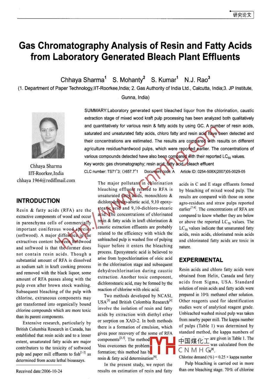 研究論文Gas Chromatography Analysis of Resin and Fatty Acidsfrom Laboratory Generated Bleach Plant EffluentsChhaya Sharma' S. Mohanty2 S. Kumar' N.J. Rao'(1. Department of Paper Technology,lIT-Roorkee,India; 2. Gas Authority of India Ltd.,. Calcutta, India;3. JP Institute,Gunna, India)SUMMARY:Laboratory generated spent bleached liquor from the chlorination, causticextraction stage of mixed wood kraft pulp processing has been analyzed both qualitativelyand quantitatively for various resin & fatty acids by using GC. A number of resin acids,saturated and unsaturated fatty acids, chloro fatty and resin acid have been detected andtheir concentrations are estimated. The results are compared with results on differentagriculture residue/hardwood pulps, which were reported earlier. The concentrations ofvarious compounds detected have also been compared with their reported LCso values.Key words: gas chromatography; resin acid; fatty acid ; bleach efuentChhaya SharmaIT-Roorkee,IndiaCLC number: TS71*3; 0657.7*1 Document code:A Aticle ID: 0254-508X<(2007)05-0029-05chhaya 1964@rediffmail.comThe major pollutant in chlorinationacids in C and E stage effluents formedbleaching efluent related to RFA is by bleaching of mixed wood pulp. The :unsaturated fatty acids, monochloro &results are compared with those on someINTRODUCTIONdichlorodehydro-abietic acid, 9,10 epoxy-agro-residues and straw pulps reportedResin & fatty acids (RFA) are thestearic acid and 9,10-dichloro-stearicearlier"-8. The concentrations of RFA areextractive components of wood and occuracid. The concentrations of chlorinatedcompared to know whether they are belowin parenchyma cells of commerciallyresin & fatty acids in kraft chlorination &or above the reported LC5o values. Theimportant coniferous wood speciescaustic extraction effluents are probablyLCso values indicate that unsaturated fatty(softwood). A major difference in therelated to the eficiency with which the acids, resin acids, chorinated resin acidsextractives content between hardwoodunbleached pulp is washed free of pulpingand chlorinated fatty acids are toxic inand softwood is that the former doesliquor before it enters the bleachingnature.not contain resin acids. Though aprocess. Epoxystearic acid is believed tosubstantial amount of RFA is dissolvedarise from hypochlorination of oleic acidEXPERIMENTALas sodium salt in kraft cooking processin the chlorination stage and subsequentand removed with the black liquor, somedehydrochlorination during causticResin acids and chloro fatty acids wereamount of RFA passes along with theextraction. Another toxic component, obtained from Helix, Canada and fttypulp even after brown stock washing.dichlorostearic acid, may be formed bythe acids from Sigma, USA. StandardSubsequent bleaching of the pulp withreaction of chlorine with oleic acid.solution of resin acids and fatty acids wereTwo methods developed by NCASI,prepared in 10% methanol ether solution.chlorine, extraneous components mayget transformed into organically boundUSA國I and British Colombia Research'Other reagents used for identificationchlorine compounds which are more toxicinvolve the isolation of resin and fattystudies were of analytical reagent grade.acids by extraction with diethyl etherUnbleached washed mixed pulp was takenthan its parent components.Extensive research, particularly byor sorption on XAD-2. In both methods from nearby paper mill. The kappa numberBritish Columbia Research in Canada, hasthere is a formation of emulsion, whichof pulps (Table 1) was determined byestablished that resin acids and to a lessergives poor rcovery of the some of RFA_ standard method, the kappa numbers ofextent, unsaturated fatty acids are majorIcomponentsIBs. The method中國煤化工- are given in Table 1. The: was calculated from thecontributors to the toxicity of softwoodVoss overcomes the problenYCNMHGle.pulp and paper mill efuents to fshhh as formation; this mehod has!resin & fatty acid determination'Chlorine demand (%) = 0.25 x kappa numberdetermined from acute lethal bioassays.In the present study, we report thePulp bleaching is carried out in moreReceived date:2006-10-24results on estimation of resin and fattythan one bleaching stage. 70% of chlorine《中舅勞數(shù)糖07年第26卷第5期●29.研究論文demand has been applied as elemental total dissolved solids, BOD3 (biochemical was derivatized with dropwise additionchlorine during the chlorination stage. All oxygen demand)and COD (chemicalof ethereal solution of diazomethane till achemicals are applied as % od pulp (oven oxygen demand)Io. Color measurementpale yellow color persisted for sometime.dried; heated to constant weight in an oven was performed spectrophotometrically on The excess diazomethane was removed byat 105C for 12h). .a Shimadzu spectrophotometer model UVdropwise addition of glacial acetic acid.Unbleached pulp (equivalent to 35g 2100/S.The solution was made up to 0.5mL withod pulp) was bleached9in the laboratory50mL of E stage or 100mL of C stage10% methanol-ether and 0.5μL of theto generate effluents. The bleaching effuent adjusted to pH value 9 was solution was injected into the column forconditions are shown in Table 2. The extracted with equal volume of methylthe analysis of resin and faty acids (Fig.I).volumes of effluent generated in the tertiary butyl ether for 1 hour. The etherC stage and E stage were 1.81L and layer was separated and evaporated almost RESULTS AND DISCUSSION2.02L, respectively. The effluents were to dryness. It was then dissolved in 0.1mLThe various resin and fatty acids havecharacterized by determining the pH value, of methanol and the resulting solutionbeen identified by matching the retentiontime with the retention time of pureTable 1 Kappa number of various pulpssaturated compounds. The separation of33 resin and fatty acids has been achievedRaw materialKappa No.Eucalyptus17on OV-101 column (Table 3). HoweverKahi grass23certain groups of acids like oleic/inolenic/Bagasse24e