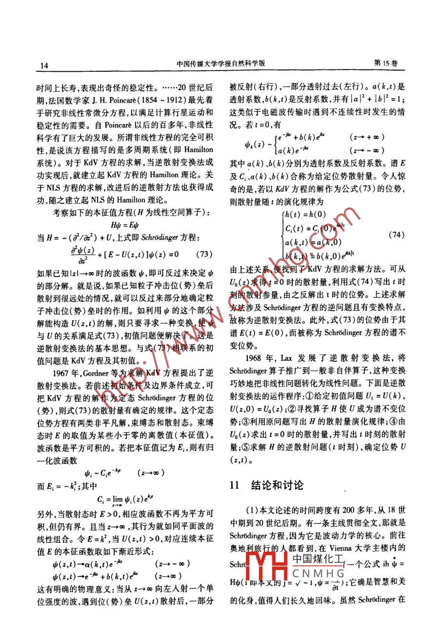 第15卷第4期中國傳媒大學(xué)學(xué)報自然科學(xué)版20084F 12 A JOURNAL OF COMMUNICATION UNIVERSITY OF CHINA(SCIENCE AND TECHNOLOGY)波動力學(xué)的發(fā)展黃志洵(中國傳媒大學(xué)信息工程學(xué)院,北京100024)摘要:本文是對波動力學(xué)(WM)進展的概迷。波動力學(xué)的發(fā)展源遠流長,最旱發(fā)端于最小作用原理,該原理可以說是“眾理之母”。對波動力學(xué)貢獻最大者是物理學(xué)家 Erwin Schrodinger,其次是 Louis de broglie;前者提出的schrodinger方程(SE)不僅用于處理微觀粒子的運動,而且早已用來分析一些宏觀科學(xué)技術(shù)問題。 Schrodinger本人沒有來得及在有生之年研究非線性 Schrodinger方程(NSE,亦稱NLS);而 de broglie卻曾致力于非線性波動力學(xué)(NLWM)的研究,并將其與孤立波聯(lián)系起來。當(dāng)前大量波動力學(xué)研究工作涉及數(shù)學(xué)上的非線性微分方程對其物理學(xué)意義反而有忽視的傾向。對電磁波的研究工作仍是波科學(xué)的重要方面,其基本理論尚待澄清之處甚多。波動力學(xué)的發(fā)展表明,經(jīng)典電磁波方程應(yīng)與量子力學(xué)波方程聯(lián)系起來研究,孤立地討論經(jīng)典的場與波的時代旱已結(jié)束。關(guān)鍵詞:波動力學(xué);波方程; Schrodinger方程;孤立波中圖分類號:TNo11文獻標識碼:A文章編號:1673-4793(2008)04-0001-16Advances in Wave Mechanics ResearchHUANG Zhi-XunCommunication University of China, Beijing 100024)Abstract: This paper get a general survey of advances in Wave Mechanics. The development of WaveMechanics goes back to ancient times. The principle of least action is the source of Wave Mechanics,soit is the mother of several principles. Erwin Schrodinger was the greatest contribution scientist of WaveMechanics, secondary was Louis de broglie. The Schrodinger equation not only can treat the movement ofmicroscopic particles, but also can analysed some of the macroscopic scientific problems. There's no timefor Schrodinger to study the non-linear Schrodinger equation NIS), but de broglie devoted oneself tothe study of nonlinear Wave Mechanics, and established contact with the solitary waves. At present, themost research works involve the nonlinear differential equations in mathematics, but ignore the physicalmeaning. In the sciences of waves, the study of electro-magnetic waves are important field, many problems demand clarification. From the Wave Mechanics point of view, we must integrate the classic electromagnetic wave equation with the Quantum Mechanics wave eqution, the isolated discussion age of classic fields and waves was extremely early ended.Key words: wave mechanics: wave equations; Schrodinger equation; solitary waves中國煤化工CNMHG收稿日期:2008-06-16作者簡介:黃志洵(1936-),男(漢族),北京市人,中國傳媒大學(xué)教授、博土生導(dǎo)師中國科學(xué)院電子學(xué)研究所客座研究員。中國傳媒大學(xué)學(xué)報自然科學(xué)版第15卷Schrodinger在講演中論述了軌道概念的無效性;指1引言出新量子力學(xué)的特點—邏輯上變“不是……就是…”為“既是……又是”;人們不再可以講何者真波動是自然界普遍存在的現(xiàn)象。人類早期觀察正發(fā)生,只能說在某一情況下將觀察到什么。另外較多的波動是水面波以及由弦或膜的振動導(dǎo)致的在不同條件下可能只用波動理論或只用粒子理論來機械波這些都具有可視的形態(tài)。田野里的麥浪也解決問題。是波。后來逐漸認識了一些不可目視的波動,如聲波、電磁波、光波。20世紀的研究深入到微觀層次之后,發(fā)現(xiàn)了物質(zhì)波(如電子運動伴隨的波動),又提出了幾率波。波動的參數(shù)包括波長、頻率、振幅、相位、速度、能量、動量等。雖然嚴格的線性波很少,但許多波呈現(xiàn)出線性。盡管對波動的研究開始得很早,但至今仍常令人陷入迷茫。例如關(guān)于電磁波的屬性;關(guān)于微觀粒子的波粒二象性;關(guān)于波函數(shù)的本質(zhì);關(guān)于光的本性,等等;至今仍是眾說紛紜。本文是從波方程圖1光線穿過大氣層到達地面( wave equations)入手而論述的,因為描寫波動的函所謂最小作用原理是 Fermat科學(xué)思想的基礎(chǔ)數(shù)一定含有時間變量,并以方程的形式勾勒出波的最早是古希臘學(xué)者 Heron(約公元3世紀),在光學(xué)時空關(guān)系。從本文內(nèi)容可知,就力學(xué)、聲學(xué)光學(xué)電方面他證明當(dāng)一條光線被反射時入射角等于反射磁學(xué)而言,波動遵循著大體上相同的規(guī)律。角,并且光線此時所走是最短路徑。公元6世紀時波動力學(xué)的英文寫法是 wave mechanic,它的主的學(xué)者 Olympiodoru則在其著作《反射光學(xué)》中說:要創(chuàng)立者是 Erwin Schrodinger他的工作承前啟后,“自然界不做任何多余的事或不必需的工作”。法順乎自然溝通微觀與宏觀因此成為本文的核心內(nèi)國數(shù)學(xué)家P.Fem(1601-165)曾提出最小光程容。本文原為給在讀博士生的講稿現(xiàn)整理成文,以原理,在1657年和162年他論證說:“光線總是以饗讀者。費時最少的路徑行進”。假定光由真空射向非真空媒質(zhì),后者的折射率n=c/v,v是光在該媒質(zhì)中的速2波動力學(xué)的基礎(chǔ)度。如媒質(zhì)為非均勻的,則n=n(x,y,z),v=v(x,y,z)。那么當(dāng)光沿曲線x(r),y(r),z(r)由第1點193年 E. Schrodinger的Nobe獲獎演說,題目先進到第2點時,需要的時間為便是“波動力學(xué)的基本思想”。他首先通俗地說明ds光線從太空向地球表面大氣層的入射(圖1),