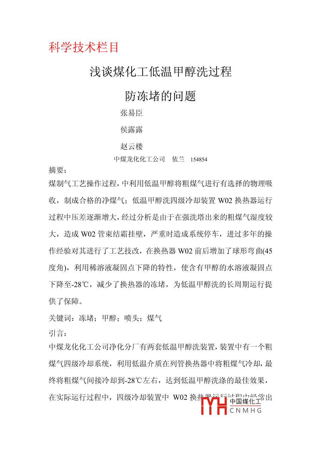 科學(xué)技術(shù)欄目淺談煤化工低溫甲醇洗過程防凍堵的問題張易臣侯露露趙云樓中煤龍化化工公司依蘭154854摘要:煤制氣工藝操作過程,中利用低溫甲醇將粗煤氣進行有選擇的物理吸收,制成合格的凈煤氣;低溫甲醇洗四級冷卻裝置wO02換熱器運行過程中壓差逐漸增大,經(jīng)過分析是由于在強洗塔出來的粗煤氣濕度較大,造成W02管束結(jié)霜掛壁,嚴重時造成系統(tǒng)停車,進過多年的操作經(jīng)驗對其進行了工藝技改,在換熱器W02前后增加了球形彎曲(45度角),利用稀溶液凝固點下降的特性,使含有甲醇的水溶液凝固點下降至-28℃,減少了換熱器的凍堵,為低溫甲醇洗的長周期運行提供了保障。關(guān)鍵詞:凍堵;甲醇;噴頭;煤氣中煤龍化化工公司凈化分廠有兩套低溫甲醇洗裝置,裝置中有一個粗煤氣四級冷卻系統(tǒng),利用低溫介質(zhì)在列管換熱器中將粗煤氣冷卻,最終將粗煤氣間接冷卻到-28℃左右,達到低溫甲醇洗滌的最佳效果,在實際運行過程中,四級冷卻裝置中WO2換書盧中國煤化置出CNMHG現(xiàn)壓差,經(jīng)過分析是由于在強洗塔出來的粗煤氣濕度較大,造成Wo2管束結(jié)霜掛壁,孔束逐漸減小,壓差逐漸增大,影響系統(tǒng)運行,甲醇裝置引氣困難,減少甲醇產(chǎn)量,而且被迫停車處理,給工廠造成巨大的經(jīng)濟損失,根據(jù)以上問題對此工藝進行了工藝技改,經(jīng)過中煤龍化凈化分廠低溫甲醇洗裝置多次試驗操作,決定將P14泵甲醇物流通過噴嘴引入w02換熱器前后,通過增加甲醇噴淋,使甲醇霧化溶入到氣相中,通過換熱器冷卻后,由于冰點降低,使煤氣中含有的水不能凝結(jié),因而改善了工況,消除了壓差,使裝置正常運行,保證了裝置的穩(wěn)定運行。工藝技術(shù)參數(shù)1、粗煤氣規(guī)格壓力最大2.8MPa(表)正常2.3MPa(表)最小1.8MPa(表)溫度最高50℃正常30℃最低25℃流量正常80000Nm3/h最大88000Nm3/h熱值低9.860MJNm高11.230MJ/Nm密度0.915kg/Nm3露點H2O25℃成份濃度(vo1%)CH48.06C0235.6647.786.06-11中國煤化工CNMHG0.30CnHm 1.2102小于0.5總硫0.1水蒸汽1.4g/Nm輕油4.56g/Nn2、甲醇密度800kg/Nm動力粘度:628+103MPaS運動粘度:788103mm2/S、工藝說明進裝置的粗煤氣,首先進入水洗塔K11利用高壓鍋爐給水、酚水洗滌粉塵、油等雜質(zhì),并將其中的氨洗至lppm以下;粗煤氣經(jīng)水洗塔初步洗滌后,被送到粗煤氣冷卻裝置(WO2-W05)。溫度由40°C間接冷卻至-28°C。在換熱器w02中,粗煤氣和冷的凈煤氣逆流接觸,由40°C間接冷卻到8°℃C,在換熱器wO2前后,向粗煤氣流中噴入甲醇,防止在換熱器wo02和wo3中結(jié)冰。甲醇來自泵P14的甲醇物流,并通過一個節(jié)流閥送到噴射點。在W03中,粗煤氣和冷的閃蒸氣逆流換熱,由8°C冷卻到5°C。如果粗煤氣進口溫度低于30°C,此粗煤氣溫度有可能低于0°C以下。為此,在W03之前又噴入一股甲醇。在換熱器W04中,粗煤氣與通過泵P12由塔K08送出的冷甲醇逆流換熱,由4C冷卻到-18°C。在換熱器W05中YH中國煤化工煤CNMHG氣逆流換熱,進一步從-18°C冷卻到-28°c以下。、解決四級冷卻裝置凍堵的方法通過增加甲醇噴淋,使甲醇霧化溶入到氣相中,通過換熱器冷卻后,由于冰點降低,使煤氣中含有的水不能凝結(jié),在換熱器W02前后增加了球形彎曲(45度角),利用稀溶液凝固點下降的特性,使含有甲醇的水溶液凝固點下降至-28℃,減少了換熱器的凍堵。其缺點之處在于有少量的甲醇損失,但是對于系統(tǒng)事故停車是微不足道的。四、流程說明K0塔噴甲醇噴甲醇中國煤化工CNMHG結(jié)束語該項工藝的技改和投用,效果一直很好。通過增加甲醇噴淋,使甲醇霧化溶入到氣相中,使冰點降低,煤氣中含有的水不能凝結(jié),為安全生產(chǎn)穩(wěn)定供氣提供了有力保障,此項技術(shù)改造獲得了中煤龍化哈爾濱煤化工有限公司技術(shù)改造成果獎。參考文獻[1]化工機械力學(xué)基礎(chǔ)。北京:化學(xué)工業(yè)出版社,1990[2]吳志泉等編,《工業(yè)化學(xué)》,華東化工學(xué)院院出版社,1991[3]《化工工業(yè)大全》,化工出版社,1979[4]蔣家俊,《化工工藝學(xué)》無機部分,高等教育出版社1988[5]吳指南主編,《環(huán)境學(xué)》,化工工業(yè)出版社,1984[6]壓力容器介質(zhì)手冊。北京:北京航空航天大學(xué)出版社,2000中國煤化工CNMHG中國煤化工CNMHG