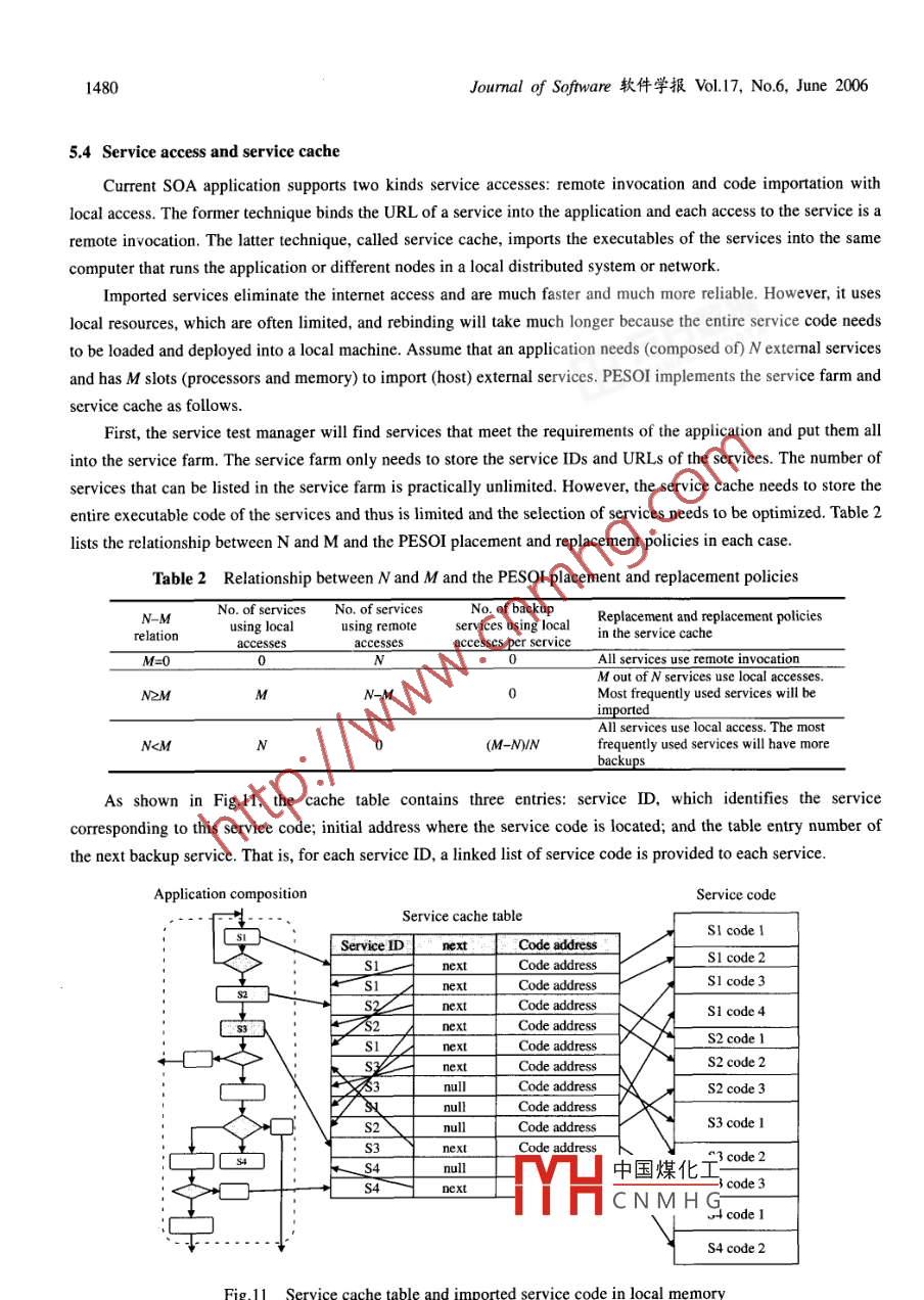 ISSN 100-9825, CODEN RUXUEWE-mail: jos@iscas.ac.cnJournal of Software, VoL.17, No.6, June 2006, pp.1470-1484htp://wwjos.org.cnDOI: 10.1360/jos171470Tel/Fax: +86- 10-62562563◎2006 by Journal of Software. All rights reserved.PESOI: Process Embedded Service-Oriented ArchitectureWei-Tek Isait, Yinong Chen, Chun Fan(Department of Computer Science and Engineering, Arizona State University, Tempe AZ, 85281, USA)+ Corresponding author: Phn: +1-480-7276921, Fax: +1-480-9652751, E-mail: wtsai@asu.eduTsai WT, Chen Y, Fan C. PESOI: Process embedded service-oriented architecture. Journal of Software, 2006,17(6):1470- -1484. htp://www.jos.org.cn/1000- 9825/17/1470.htmAbstract: Service Oriented Architecture (SOA) has drawn significant attention recently, and numerousarchitecture approaches have been proposed to represent SOA-based applications. The architecture of SOA-basedapplications is different from traditional software architecture, which is mainly static. The architecture of anSOA-based application is dynamic, i.e., the application can be composed at runtime using existing services, andthus the architecture is really determined at runtime, instead of design time. SOA applications have provided a newdirection for software architecture study, where the architecture can be dynanmically changed at runtime to meet thenew application requirements. This paper proposes a Process Embedded Service-Oriented Infrastructure to buildSOA-based applications. This infrastructure embeds the entire software lifecycle management and service-orientedsystem engineering into the application developed on this infrastructure. Thus, the users can easily re-develop theapplications during operation to meet the changing environments and requirements, through the supports providedby the embedded infrastructure.Key words: service -oriented computing; service-oriented architecture; software architecture; architectureclassification1 IntroductionService Oriented Architecture (SOA) has received significant attention recently as major computer andsoftware companies such as HP, IBM, Intel, Microsoft, and SAP, have all embraced SOA, as well as governmentagencies such as DoD (US department of defense) and NASA. The initial focus on SOA has been the developmentof interoperability standards and protocols, such as WSDL, SOAP, UDDI, and recently numerous SOA standardshave been proposed including ebSOA, ebXML, CPP, CPA, BPEL4WS, OWL-S, and RDF.SOA is a new software development paradigm in which software developers are grouped into three parties interms of their resposibilitis: the application builders (service requesters), the service brokers (service publishers),and the service providers (service developers), which is referred as the standard SOA. Service providers developservices independent of potential applications by following中國煤化工dards. Service brokerspublish the available services to the public such that the a, desired services andcompose the target application using the services. Thus a targe. aprJMYHCNMH Gservice discovery andservice composing instead of traditional process of designing and coding software.SOA has the following characteristics that are different from traditional software:反瓦教據(jù)006-02-15; Acepled 2006-03-14Wei-Tek Tsai, et al.: PESOI: Process Embedded Service Oriented Architecture1471Standard-Based interoperability: SOA emphasizes on stand based interface, protocols, communication,coordination, workflow, discovery, collaboration, and publishing via standard protocols. These standards allowservices developed in different computing platforms can interoperate with each other with the knowledge of servicespecifications only.Dynamic composition via discovery: SOA provides a new way of application development by composingservices just discovered. Furthermore, the composition and discovery can be carried out at runtime.Dynamic governance and orchestration: Execution of services needs to be controlled and severalmechanisms are available for execution control. One is service governance by policy. Specifically, policies can bespecified, checked, and enforced during both SOA development time and runtime to ensure the system complieswith the organization requirements. The other is orchestration where process execution will be coordinated by acentral controller and it is responsible for scheduling the execution of services that may be distributed across aconnectivity network such as ESB (enterprise service bus).A complex system is usually represented in layers, inPresentation: Portlets & WSRPRef.[1], a 5-layered architectural template is suggested forBusiness process choreographySOA applications, as ilustrated in Fig.l: Presentation,Services (composite services)Business process choreography, Services, Enterprise管冒Enterprise componentsg劉components, and Operational systems, with two supporting管mechanisms: Integration architecture and Management &Operational systermsmonitoring. The supporting mechanisms can be applied toFig.1 Layers of SOAeach of the five layers.Several studies have been conducted to investigate the architecture of SOA applications, e.g., IBM SOAFoundation architectull-4), Microsoft's .Net 2005 (Whitehore)5), SAP's NetWeaver'), OASIS's FERA7),enterprise SOA applications such as enterprise SOA[8] and Service-Oriented Enterprise (SOE)9), and self healingarchitecture PKUASI01.Software architecture has been an active research areas in software engineering for the last 10 years, withnumerous papers and books, such as Refs.[1,2,7-18]. Currently, several websites have been devoted to softwarearchitecture such as:Resources for Sofware Architects at htp://www.bredemeyer.com/;Global Enterprise Architecture Organization (GEAO) htp://www. geao.org;Software Engineering Institute at CMU software architecture at http://www.sei.cmu.edu/architecture/;Software architecture resource Sites at htp://ww2. umassd.edu/SECenter/SAResources.html;Handbook of Software Architecture at htp://www.booch.com/archite