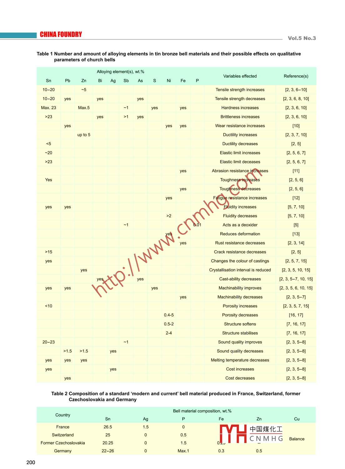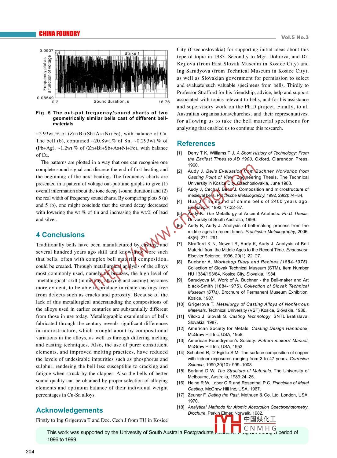 Overseas FoundryAugust 2008Analysis of bell materials: Tin bronzes*Jaromir Audy and Katarina Audy(Edith Cowan University, South West Campus Bunbury, Robertson Drive, 6230, Western Australia)Abstract: The present study was set up to examine the effect of alloying elements (including harmful elements)on metallurgical features (material properties and qualitative parameters) of tin bronzes, with particular referenceto church bells from Middle Ages to Current times. A driving force of this study was to identify and demonstratefeatures related to the quality of church bells made in different centuries. The findings have been derived viametallographic and chemical analysis of specimens of bells from various parts of Australasia and Europe. The bellmaterials consisted of a mixture of the a phase and the (a+3) eutectoid essenilly, in proportions determined by tincontent and mould materials during casting. The samples from the 15th century to the one from the 20th centuryshowed a progressive increase in hardness, ranging from the minimum of ~280 VHM20g to a maximum of ~470VHM20g for the (a+B) eutectoid, and ~160 VHM2og to ~230 VHM20g for the a phase. The investigation also showsthat the sound decay of the bell decreased with lowering the wt.% of tin and increasing the wt.% of lead and silver.This information is expected to provide an aditional interesting knowledge into manufacturing practices and theirsignificance in the quality of church bells over past centuries.Key words: tin bronzes; bell material; church bells; microstructure; chemical composition; material properties; qualityCLC number: TG146.1*1Document code: AArticle ID: 1672-6421(2008)03-0199-06he success of bell materials in bell making applications bell material compositions, their properties and effects on」L has to date largely been based on tin bronzes (1-61. It hasvarious qualitative/performance measures. The most importantbeen recognised that tin bronzes (Cu-Sn) vary widely infindings are summarised in Table 1 with references to differentcomposition. Traditionally, bell materials consist of a wideliterature sources [2-17].variety of other elements such as Pb, Zn, Bi, Ag, Sb, As, Ni,From Table 1 it is evident that the most appropriate bellFe, P, S and Si 12357. Some of these elements (e.g. Pb, Zn,material characteristics (such as cast ability, tensile strength,Ni, Fe, Ag, Sb) were used for alloying purposes, whereashardness, wear resistance, cast quality, sound, cost etc.) canothers such as S and P were impurities entering the bronzeprobably be obtained by having a type bronze composition as:liquid through the process of melting with coke and charcoal.~20wt.%Sn, < 2wt.%Ni, < 1.5wt%Pb, ~0.01wt.%P, < 1wt.%Sb,Bell materials differ in both number of alloying elements andtheir amount. This is because through the centuries the bellwith balance of Cu.makers have been searching for 'best' tin-bronze compositionTable 2 from ref. [5] shows the composition of a standardthat would satisfy: (a) melting/casting requirements, (b)‘modern and current' bell material produced in France,expectations in high quality of cast bell, (C) good bell materialSwitzerland, former Czechoslovakia and Germany.properties, (d) long service life, and (d) nice bell sound. It isTable 2 indicates that the quantitative recommendationstherefore not surprising that the knowledge associated withof weight percentage of the main elements (as a whole) in tinpreparation of a bell material mixture was closely guardedbronze materials are incomplete and vary in detail for eachsecret in different bell foundries.reference. Incomplete quantitative recommendations contributeIn the present study, the effects of individual elements onto the lack of knowledge about this popular and commondifferent type bell materials was investigated qualitatively -bell material. Furthermore, it is also anticipated that largeassessed by material properties, casting properties, servicelife, and bell sound. Different bell materials produced from thebecause of different bell manufacturers' knowledge/experience/Middle Ages to Current times were included for comparison.preference as reported in the reference [-11]. Therefore, it is1 Effects of bell material compositionnecessary to determine the quality of different bell materialson qualitative measures of bells:by metallurgical and chemical analyses, including themeasurement of mechanical properties (e.g. microhardness)reported datawhenever possible due to small size of specimens.An extensive literature survey has been carried out on different*Jaromir Audy2 Experiment VLT中國煤化工F1ethodsMale, born in 1962, Ph.D. Research interests: castingProperties and charaiCNMHGoforiginaltechnology and archaeo meallurgy.bell materials rangiTHui w " uiivit Eras wereE-mail: j.audy@ecu.edu.auReceived: 2008-01-22; Accepted: 2008-04-25investigated using chemical and microstructural analyses prior99CHINA FOUNDRYVol.5 No.3Table 1 Number and amount of alloying elements in tin bronze bell materials and their possible effects on qualitativeparameters of church bellsAlloying element(s), wt.%Variables effectedReference(s)SnPtiAgSbAsSNiFeP10- -20~Tensile strength increases[2, 3, 6-10]10-20yeyesTensile strength decreases[2,3,6, 8, 10]Max. 23Max.5~1esHardness increases[2,3,6, 10]23>1 yeBritleness increases[2,3, 6, 10]yes yesWear resistance increases[1upto5Dutilily increases[2,3,7, 10]<5Ductility decreases[2,5]20Elastic limit increases[2,5,6,7]Elastic limit deceases[2,5,6,.7]Abrasion resistance increases[11Toughness increases[2, 5, 6]Toughness decreasesFatigue resistance increases[12]Fluidity increases[5,7, 10]>2Fluidity decreases0.01Acts as a deoxider[5]Reduces deformation[13Rust resistance decreases[2,3, 14]15Crack resistance decreasesChanges the colour of castings[2,5,7,15]Crsallisation interval is reduced[2, 3, 5, 10, 15]Cast-ability decreases[2,3, 5-7, 10, 15]Machinability improves[2,3,5,6, 10, 15]Machinability decreases[2,3,5-7]10Porosity increases[2,3, 5.7, 15]0.4-5[16, 