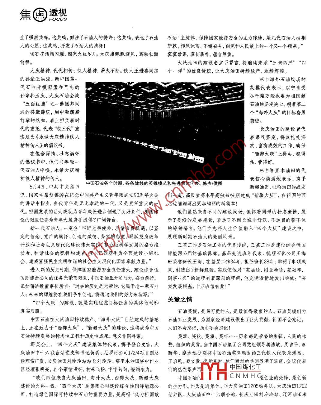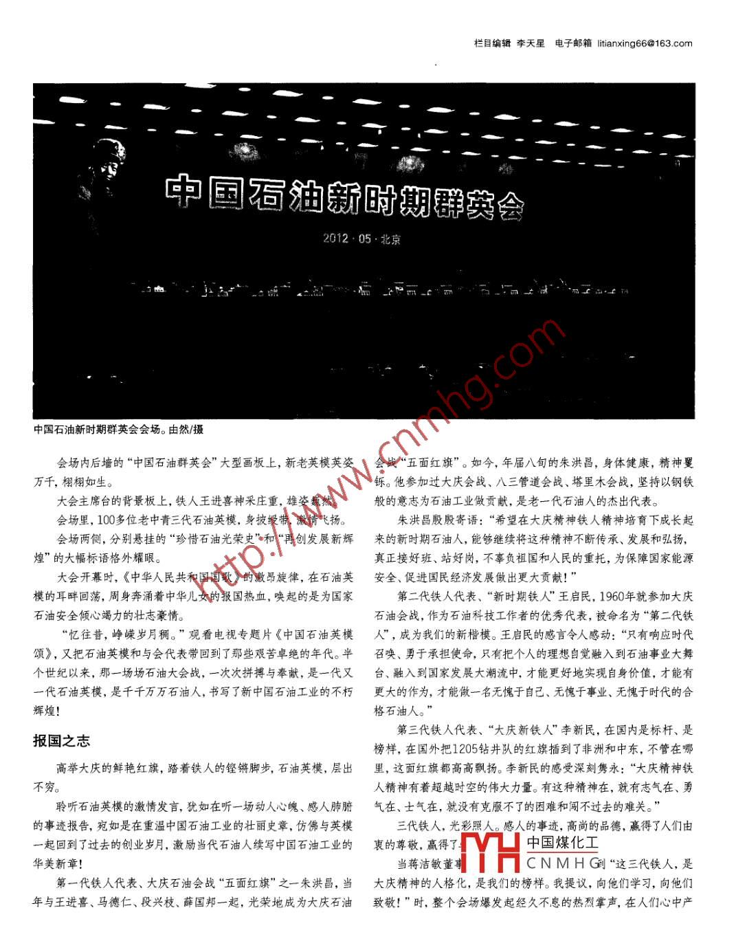 焦圇透視FOCUS“我國(guó)石油工業(yè)的發(fā)展史,是一部艱苦創(chuàng)業(yè)史,也是一部英模輩出的歷史?!薄笆陀⒛]叧?是中國(guó)石油與新中國(guó)同呼吸共命運(yùn)的歷史見(jiàn)證,是石油人擔(dān)當(dāng)使命、履行責(zé)任的時(shí)代縮影?!?石油時(shí)空五月鮮花獻(xiàn)英模一-中國(guó)石 油新時(shí)期群英會(huì)禮贊口文/本刊記者李天星5月的鮮花,格外艷麗; 5月的陽(yáng)光,和煦溫暖; 5月的群歷屆特等勞動(dòng)模范代表;中國(guó)石油榜樣、中國(guó)石油十大杰星,璀璨耀眼。出青年.中國(guó)石油十大金花加油站經(jīng)理、中國(guó)石油十大金花科技工作者代表;中國(guó)石油新時(shí)期十大標(biāo)桿集體、十大這是屬于勞動(dòng)者的節(jié)日,這是屬于創(chuàng)造者的節(jié)日,這命名班組、著名先進(jìn)集體代表等。是屬于英雄模范的節(jié)日!這些石油英模和先進(jìn)集體的代表,來(lái)自松遼大地的2012年5月3日,在五一勞動(dòng)節(jié)的濃厚氛圍里,中國(guó)石荒原堿灘,來(lái)自準(zhǔn)噶爾戈壁的荒漠曠野,來(lái)自塔克拉瑪油新時(shí)期群英會(huì)在北京隆重舉行。干的沙海深處,來(lái)自黃土塬.上的深山溝壑,來(lái)自波濤洶涌這次會(huì)議群英薈萃、頌揚(yáng)模范,鼓舞士氣、凝聚力的海.上鉆采平臺(tái),來(lái)自伊拉克的戰(zhàn)亂硝...風(fēng)塵仆仆量,對(duì)于繼承弘揚(yáng)大慶精神鐵人精神,加快推進(jìn)綜合性國(guó)齊聚京都,共同學(xué)習(xí)交流英雄模范的先進(jìn)事跡,共同抒發(fā)際能源公司建設(shè),具有重要的歷史意義和現(xiàn)實(shí)意義?!拔覟樽鎳?guó)獻(xiàn)石油”的滿腔豪情,共同憧憬中國(guó)石油美好的發(fā)展前景。榮譽(yù)之光在鐵人像前,中國(guó)石油集團(tuán)公司黨組領(lǐng)導(dǎo)與石油英模在中國(guó)石油總部的鐵人巨幅雕像前,百余名石油英代表和先進(jìn)集體代表合影留念。此舉,看似平常,其實(shí)寓模,身著亮麗的紅色綬帶,胸前綴滿金光耀眼的獎(jiǎng)?wù)?壯志意深含。這表達(dá)了領(lǐng)導(dǎo)與英模的親近親和,表達(dá)了領(lǐng)導(dǎo)對(duì)豪情充溢著胸膛,往日的歲月似在眼前浮現(xiàn)。英模的關(guān)心關(guān)愛(ài),表達(dá)了領(lǐng)導(dǎo)與石油人共創(chuàng)石油新輝煌的出席會(huì)議的石油英模和先進(jìn)集體代表,時(shí)間跨度長(zhǎng)堅(jiān)定信念。達(dá)60余年,從20世紀(jì)50年代到21世紀(jì)今天的各個(gè)時(shí)期;英模聚首,感既萬(wàn)千;本色不變,精神永恒。這儼然是參會(huì)代表分布廣泛,包括中國(guó)石油上中下游產(chǎn)業(yè)鏈的各條- 次跨越大半個(gè)世紀(jì)的歷史聚會(huì),是- -幅超越時(shí)空、超越戰(zhàn)線。歷史的石油英模群像圖,是一幅英姿勃發(fā)、立地擎天的石他們是:中國(guó)石油入選新中國(guó)成立60周年感動(dòng)中國(guó)人油精英薈萃畫! .物;全國(guó)宣傳的特重大典型;中國(guó)石油命名的先進(jìn)典型;中中國(guó)煤化工會(huì)會(huì)場(chǎng)內(nèi),座無(wú)虛席。國(guó)石油新時(shí)期十大標(biāo)兵個(gè)人;全國(guó)勞動(dòng)模范、全國(guó)優(yōu)秀共會(huì).HCHCNMHG產(chǎn)黨員代表;全國(guó)十大杰出工人、全國(guó)十大杰出青年、全國(guó)口油大侯館大幅圖片展板,英模聚國(guó)三八紅旗手標(biāo)兵、全國(guó)道德模范;中國(guó)石油勞動(dòng)英雄、集,豪氣盈天。40孵野數(shù)曙CHNTRTROEIEREE 120125欄目編輯李天星電子郵箱 ltinxing66@163.com .中國(guó)石油新時(shí)期群英會(huì)2012:05,北京中國(guó)石油新時(shí)期群英會(huì)會(huì)場(chǎng)。由然/攝會(huì)場(chǎng)內(nèi)后墻的“中國(guó)石油群英會(huì)”大型畫板.上,新老英模英姿會(huì)戰(zhàn)“五面紅旗”。如今,年屆八旬的朱洪昌,身體健康,精神矍萬(wàn)千,栩栩如生。鑠。他參加過(guò)大慶會(huì)戰(zhàn)、八三管道會(huì)戰(zhàn)、塔里木會(huì)戰(zhàn),堅(jiān)持以鋼鐵大會(huì)主席臺(tái)的背景板上,鐵人王進(jìn)喜神采莊重,雄姿巍然。般的意志為石油工業(yè)做貢獻(xiàn),是老一代石油人的杰出代表。會(huì)場(chǎng)里, 100多位老中青三代石油英模,身披綬帶,激情飛揚(yáng)。朱洪昌殷殷寄語(yǔ):“希望在大慶精神鐵人精神培育下成長(zhǎng)起會(huì)場(chǎng)兩側(cè),分別懸掛的“珍惜石油光榮史”和“再創(chuàng)發(fā)展新輝來(lái)的新時(shí)期石油人,能夠繼續(xù)將這種精神不斷傳承、發(fā)展和弘揚(yáng),煌”的大幅標(biāo)語(yǔ)格外耀眼。真正接好班、站好崗,不辜負(fù)祖國(guó)和人民的重托,為保障國(guó)家能源大會(huì)開幕時(shí),《中華人民共和國(guó)國(guó)歌》的激昂旋律,在石油英安全、促進(jìn)國(guó)民經(jīng)濟(jì)發(fā)展做出更大貢獻(xiàn)!”模的耳畔回蕩,周身奔涌著中華兒女的報(bào)國(guó)熱血,喚起的是為國(guó)家第二代鐵人代表、“新時(shí)期鐵人”王啟民,1960年就參加大慶石油安全傾心竭力的壯志豪情。石油會(huì)戰(zhàn),作為石油科技工作者的優(yōu)秀代表,被命名為“第二代鐵“憶往昔,崢嶸歲月稠?!庇^看電視專題片《中國(guó)石油英模人”,成為我們的新槽模。王啟民的感言令人感動(dòng):“只有響應(yīng)時(shí)代頌》,又把石油英模和與會(huì)代表帶回到了那些艱苦卓絕的年代。半召喚、勇于承