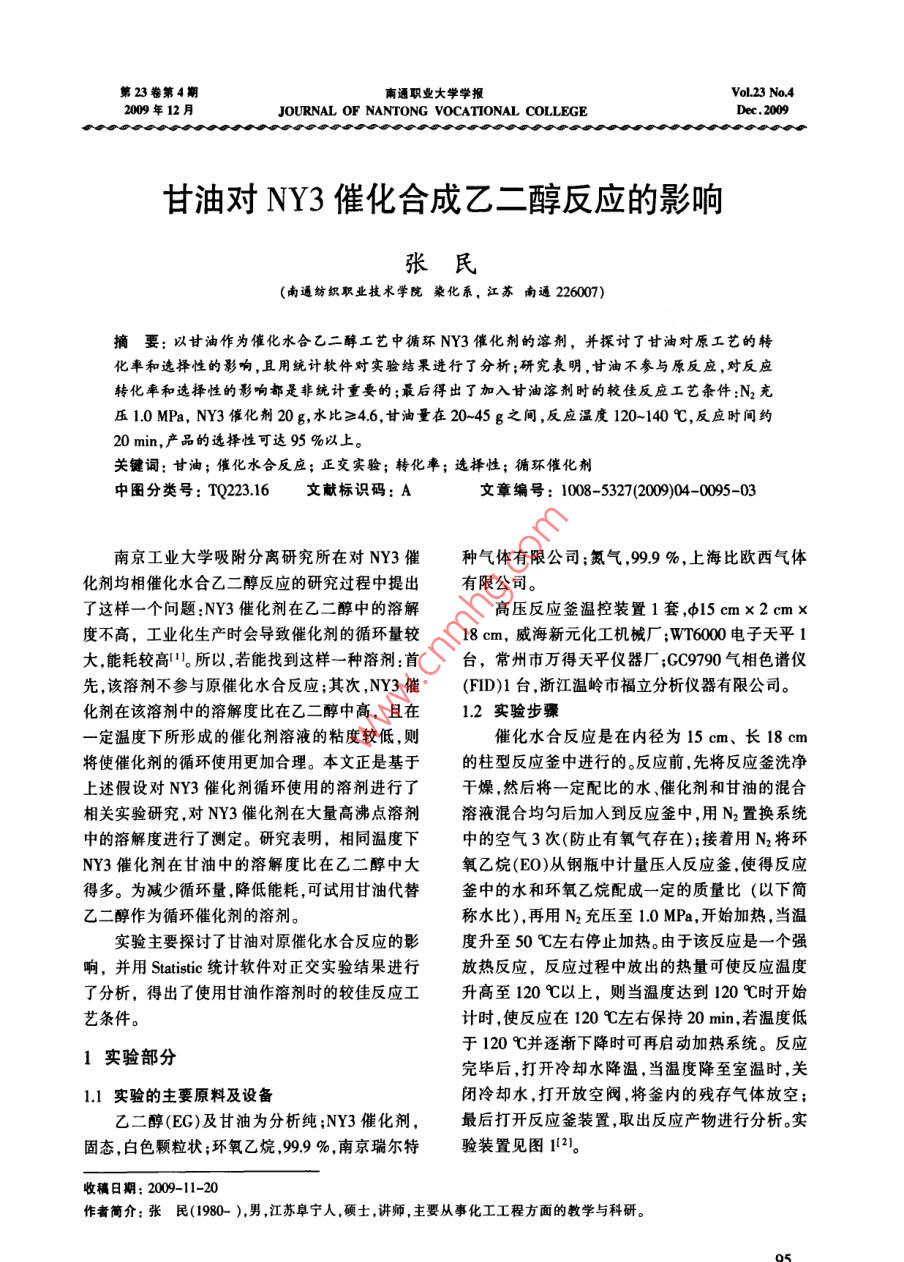甘油對(duì)NY3催化合成乙二醇反應(yīng)的影響