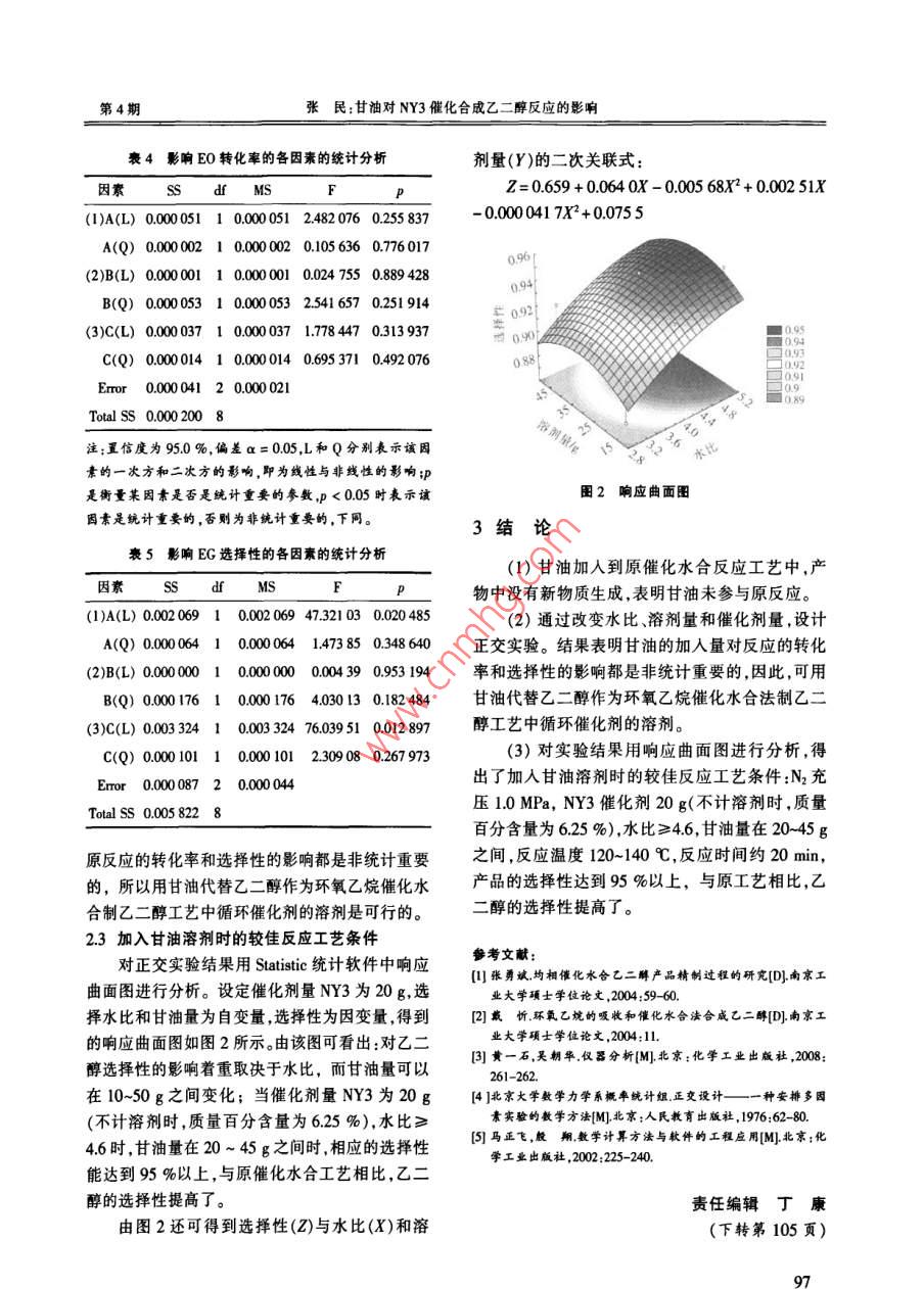 第23卷第4期南通職業(yè)大學(xué)學(xué)報(bào)Vol 23 No 42009年12月JOURNAL OF NANTONG VOCATIONAL COLLEGEDe.2009甘油對(duì)NY3催化合成乙二醇反應(yīng)的影響張民(南通紡織職業(yè)技術(shù)學(xué)院染化系,江蘇南通226007)摘要:以甘油作為催化水合乙二醇工藝中循環(huán)NY3催化劑的溶劑,并探討了甘油對(duì)原工藝的轉(zhuǎn)化率和選擇性的影響,且用統(tǒng)計(jì)軟件對(duì)實(shí)驗(yàn)結(jié)果進(jìn)行了分析;研究表明,甘油不參與原反應(yīng),對(duì)反應(yīng)轉(zhuǎn)化率和選擇性的影響都是非統(tǒng)計(jì)重要的;最后得出了加入甘油溶劑時(shí)的較佳反應(yīng)工藝條件:N2充壓1.0MPa,NY3催化劑20g,水比≥46,甘油量在20-45g之間,反應(yīng)溫度120-140℃,反應(yīng)時(shí)間約20min,產(chǎn)品的選擇性可達(dá)95%以上。關(guān)鍵詞:甘油;催化水合反應(yīng);正交實(shí)驗(yàn);轉(zhuǎn)化率;選擇性;循環(huán)催化劑中圖分類號(hào):TQ23.6文獻(xiàn)標(biāo)識(shí)碼:A文章編號(hào):1008-5327(2009)04-0095-03南京工業(yè)大學(xué)吸附分離研究所在對(duì)NY3催種氣體有限公司;氮?dú)?999%,上海比歐西氣體化劑均相催化水合乙二醇反應(yīng)的研究過程中提出有限公司。了這樣一個(gè)問題:NY3催化劑在乙二醇中的溶解高壓反應(yīng)釜溫控裝置1套,d15cm×2cmx度不高,工業(yè)化生產(chǎn)時(shí)會(huì)導(dǎo)致催化劑的循環(huán)量較18cm,威海新元化工機(jī)械廠;WT6000電子天平1大能耗較高所以,若能找到這樣一種溶劑:首臺(tái),常州市萬得天平儀器廠;CC9790氣相色譜儀先該溶劑不參與原催化水合反應(yīng);其次,NY3催(FID)1臺(tái)浙江溫嶺市福立分析儀器有限公司?;瘎┰谠撊軇┲械娜芙舛缺仍谝叶贾懈?且在12實(shí)驗(yàn)步驟一定溫度下所形成的催化劑溶液的粘度較低,則催化水合反應(yīng)是在內(nèi)徑為15cm、長(zhǎng)18cm將使催化劑的循環(huán)使用更加合理。本文正是基于的柱型反應(yīng)釜中進(jìn)行的。反應(yīng)前,先將反應(yīng)釜洗凈上述假設(shè)對(duì)NY3催化劑循環(huán)使用的溶劑進(jìn)行了干燥,然后將一定配比的水催化劑和甘油的混合相關(guān)實(shí)驗(yàn)研究,對(duì)NY3催化劑在大量高沸點(diǎn)溶劑溶液混合均勻后加入到反應(yīng)釜中,用N2置換系統(tǒng)中的溶解度進(jìn)行了測(cè)定。研究表明,相同溫度下中的空氣3次(防止有氧氣存在);接著用N2將環(huán)NY3催化劑在甘油中的溶解度比在乙二醇中大氧乙烷(EO)從鋼瓶中計(jì)量壓人反應(yīng)釜,使得反應(yīng)得多。為減少循環(huán)量,降低能耗,可試用甘油代替釜中的水和環(huán)氧乙烷配成一定的質(zhì)量比(以下簡(jiǎn)二醇作為循環(huán)催化劑的溶劑。稱水比),再用N2充壓至10MPa,開始加熱,當(dāng)溫實(shí)驗(yàn)主要探討了甘油對(duì)原催化水合反應(yīng)的影度升至50℃左右停止加熱。由于該反應(yīng)是一個(gè)強(qiáng)響,并用 Statisti統(tǒng)計(jì)軟件對(duì)正交實(shí)驗(yàn)結(jié)果進(jìn)行放熱反應(yīng),反應(yīng)過程中放出的熱量可使反應(yīng)溫度了分析,得出了使用甘油作溶劑時(shí)的較佳反應(yīng)工升高至120℃以上,則當(dāng)溫度達(dá)到120℃時(shí)開始藝條件。計(jì)時(shí),使反應(yīng)在120℃左右保持20min,若溫度低于120℃并逐漸下降時(shí)可再啟動(dòng)加熱系統(tǒng)。反應(yīng)1實(shí)驗(yàn)部分完畢后,打開冷卻水降溫,當(dāng)溫度降至室溫時(shí),關(guān)1.1實(shí)驗(yàn)的主要原料及設(shè)備閉冷卻水,打開放空閥,將釜內(nèi)的殘存氣體放空乙二醇(EG)及甘油為分析純;NY3催化劑最后打開反應(yīng)釜裝置,取出反應(yīng)產(chǎn)物進(jìn)行分析。實(shí)固態(tài)白色顆粒狀;環(huán)氧乙烷999%,南京瑞爾特驗(yàn)裝置見圖12l收稿日期:2009-11-20作者簡(jiǎn)介:張民(1980-),男,江蘇阜寧人,碩士,講師主要從事化工工程方面的教學(xué)與科研。南通職業(yè)大學(xué)學(xué)報(bào)2009年充壓10MPa,反應(yīng)溫度120~140℃,且在120℃左右保持20min參考相關(guān)文獻(xiàn)4,進(jìn)行三因素三水平的正交冷卻水實(shí)驗(yàn)。正交實(shí)驗(yàn)的因素水平如表2所示,相應(yīng)所得的正交實(shí)驗(yàn)結(jié)果如表3所示,序號(hào)所對(duì)應(yīng)的實(shí)驗(yàn)條件與正交表L4(34)一一對(duì)應(yīng)1N2鋼瓶;2天平:3EO鋼瓶;4高壓反應(yīng)釜;5溫度控制儀表2正交實(shí)驗(yàn)各因素水平圖1環(huán)氧乙烷催化水合乙二醇反應(yīng)的實(shí)驗(yàn)裝置圖因子因子代號(hào)第一水平第二水平第三水平1.3實(shí)驗(yàn)分析方法水比A采用GC9790氣相色譜儀(FTD)對(duì)產(chǎn)品進(jìn)行分析,色譜操作條件如下:色譜柱為長(zhǎng)2m、直徑溶劑量/g3mm的不銹鋼管,柱內(nèi)填充 Chromosorb-101催化劑量/gC1020(60-80目)載體;柱溫250℃,檢測(cè)器270℃,氣表3正交實(shí)驗(yàn)結(jié)果化室270℃載氣流量60mL/min。本實(shí)驗(yàn)以乙二實(shí)驗(yàn)號(hào) A Bg Cg轉(zhuǎn)化率%選擇性%醇作為標(biāo)準(zhǔn)物,在產(chǎn)品濃度范圍內(nèi)測(cè)得各組分的3151099338693校正因子3如表1所示。表1各組分的質(zhì)量校正因子33020993391.223453099419243組分環(huán)氧乙烷乙二醇二甘醇甘油4152099.,1993.18校正因子04391.0010421.8484303099.169502本文以反應(yīng)的環(huán)氧乙烷的物質(zhì)的量與進(jìn)料中64451099.178966環(huán)氧乙烷的物質(zhì)的量的