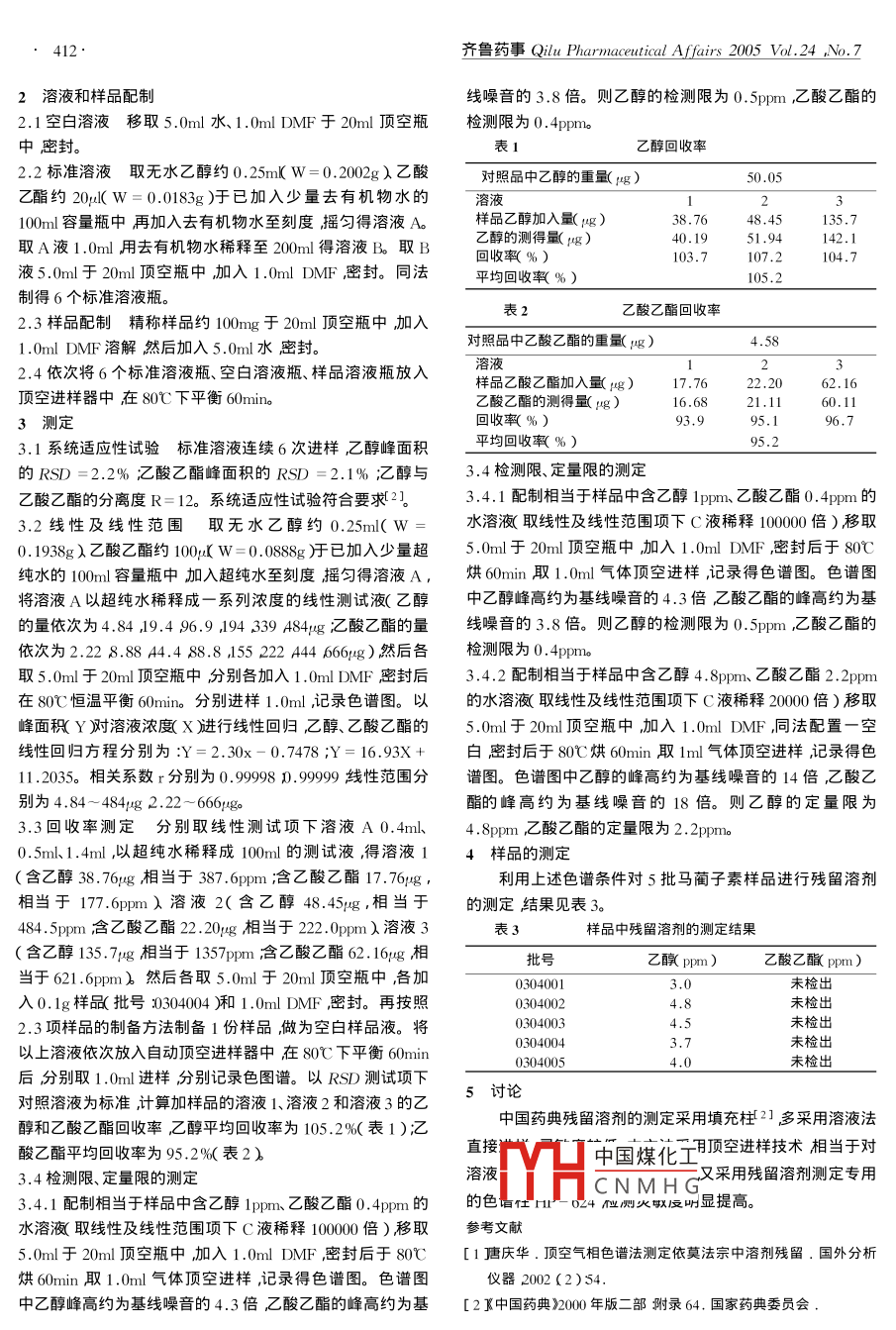 齊魯藥事 Qilu Pharmaceutical Affairs2005ol.24N.7馬藺子素中殘留乙醇、乙酸乙酯的測(cè)定豐宇勝邢玉君孫愛(ài)永山東新華制藥股份有限公司淄博2550051.淄博醫(yī)藥站淄博25005~)摘要淚目的應(yīng)用頂空氣相色譜法對(duì)馬藺子素中的殘留溶劑乙醇和乙酸乙酯進(jìn)行測(cè)定。方法采用固定相為94%二甲基聚硅氧烷-6%氰丙基苯基.53πm×30m膜厚3.υrm的色譜柱以氮?dú)鉃檩d氣FID檢測(cè)器通過(guò)外標(biāo)法計(jì)算殘留溶劑的含量。結(jié)果馬藺子素中有乙醇檢出乙酸乙酯未檢出。乙酸乙酯的線性范圍2.22-66;g(r=0.999)z醇的線性范圍4.84-484