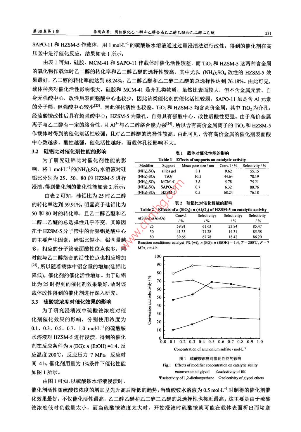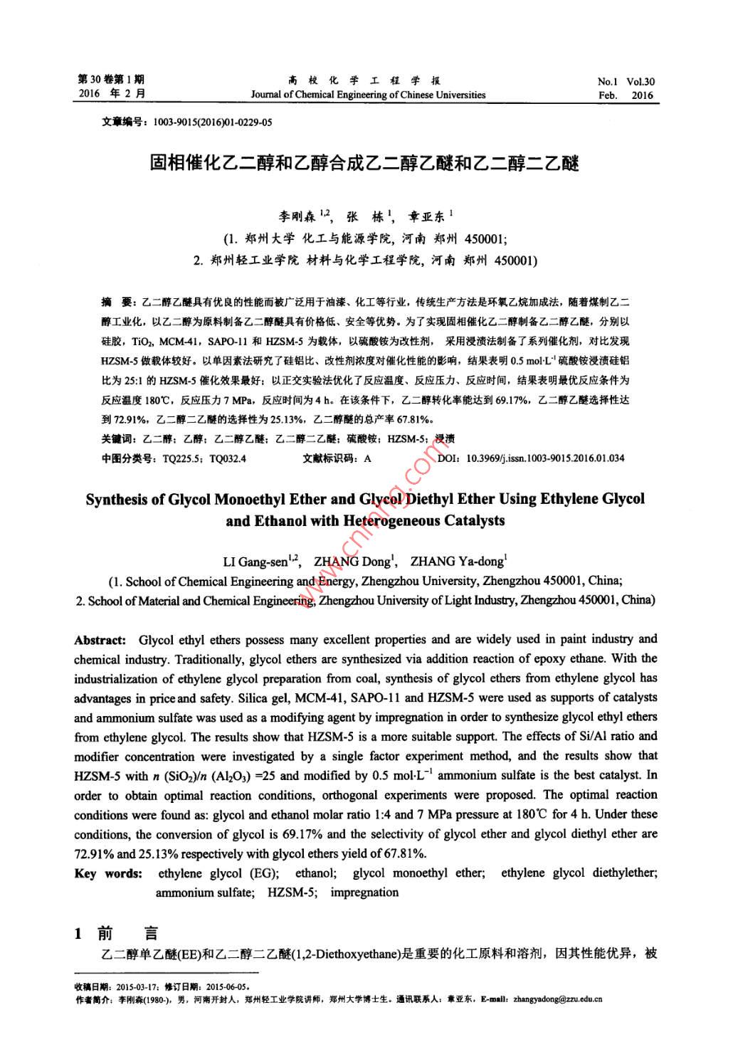 第30卷第1期高?;瘜W(xué)工程學(xué)報(bào)No. 1 vol, 302016年2月Jourmal of Chemical Engineering of Chinese Universities文章編號(hào):1003-905(2016014022905固相催化乙二醇和乙醇合成乙二醇乙醚和乙二醇二乙醚李剛森12,張棟,章亞?wèn)|(1.鄭州大學(xué)化工與能源學(xué)院,河南鄭州4500012.鄭州輕工業(yè)學(xué)院材料與化學(xué)工程學(xué)院,河南鄭州450001)摘要:乙二醇乙醚具有優(yōu)良的性能而被廣泛用于油漆、化工等行業(yè),傳統(tǒng)生產(chǎn)方法是環(huán)氧乙烷加成法,隨著煤制乙二醇工業(yè)化,以乙二醇為原料制備乙二醇醚具有價(jià)格低、安全等優(yōu)勢(shì)。為了實(shí)現(xiàn)固相催化乙二醇制備乙二醇乙醚,分別以硅膠,TiO2,MCM41,SAPO11l和HzSM5為載體,以硫酸銨為改性劑,采用浸漬法制備了系列催化劑,對(duì)比發(fā)現(xiàn)HzSM5做載體較好。以單因素法研究了硅鋁比、改性劑濃度對(duì)催化性能的影響,結(jié)果表明05molL硫酸銨浸漬硅鋁比為25:1的HZSM5催化效果最好;以正交實(shí)驗(yàn)法優(yōu)化了反應(yīng)溫度、反應(yīng)壓力、反應(yīng)時(shí)間,結(jié)果表明最優(yōu)反應(yīng)條件為反應(yīng)溫度180℃,反應(yīng)壓力7MPa,反應(yīng)時(shí)間為4h。在該條件下,乙二醇轉(zhuǎn)化率能達(dá)到6917%,乙二醇乙醚選擇性達(dá)到7291%乙二醇二乙醚的選擇性為2513%,乙二醇醚的總產(chǎn)率6781%。關(guān)鍵詞:乙二醇:乙醇;乙二醇乙醚;乙二醇二乙醚;硫酸銨;HZSM5;浸漬中圖分類(lèi)號(hào):TQ2255;TQ0324文獻(xiàn)標(biāo)識(shí)碼:ADO:10.3969/jss.1003-9015201601034Synthesis of Glycol Monoethyl Ether and Glycol Diethyl Ether Using Ethylene Glycoland Ethanol with Heterogeneous CatalystsLI Gang-sen", ZHANG Dong, ZHANG Ya-dong(1. School of Chemical Engineering and Energy, Zhengzhou University, Zhengzhou 450001, China2. School of Material and Chemical Engineering, Zhengzhou University of Light Industry, Zhengzhou 450001, ChinaAbstract: Glycol ethyl ethers possess many excellent properties and are widely used in paint industry andchemical industry. Traditionally, glycol ethers are synthesized via addition reaction of epoxy ethane. With theindustrialization of ethylene glycol preparation from coal, synthesis of glycol ethers from ethylene glycol hasdvantages in price and safety. Silica gel, MCM-41, SAPO-11 and HZSM-5 were used as supports of catalystsand ammonium sulfate was used as a modifying agent by impregnation in order to synthesize glycol ethy l ethersfrom ethylene glycol. The results show that HZSM-5 is a more suitable support. The effects of Si/Al ratio andmodifier concentration were investigated by a single factor experiment method, and the results show thatHZSM-5 with n(Sio2)/n(Al2O3)=25 and modified by 0.5 molL ammonium sulfate is the best catalyst. Inorder to obtain optimal reaction conditions, orthogonal experiments were proposed. The optimal reactionconditions were found as: glycol and ethanol molar ratio 1: 4 and 7 MPa pressure at 180C for 4 h. Under theseconditions, the conversion of glycol is 69. 17% and the selectivity of glycol ether and glycol diethyl ether are72.91%and 25. 13% respectively with glycol ethers yield of 67. 81%Key words: ethylene glycol(EG); ethanol; glycol monoethyl ether; ethylene glycol diethylether;ammonium sulfate; HZSM-5; impregnation前言乙二醇單乙醚E)和乙二醇二乙醚(1,2 Ethoxyethane)是重要的化工原料和溶劑,因其性能優(yōu)異,被收稿日期:201503-17;修訂日期:20150605作者簡(jiǎn)介;李剛森(1980),男,河南開(kāi)封人,鄭州輕工業(yè)學(xué)院講師,鄭州大學(xué)博士生通訊聯(lián)系人:章亞?wèn)|,Em:zhangdong@zzu.edu.cn30髙?;瘜W(xué)工程學(xué)報(bào)2016年2月廣泛用作溶劑、燃料、防凍劑、清洗劑、剎車(chē)液、化學(xué)中間體,2等。乙二醇乙醚傳統(tǒng)的生產(chǎn)方法是環(huán)氧乙烷加成法,該方法以環(huán)氧乙烷和無(wú)水乙醇為原料,在催化劑作用下合成乙二醇乙醚,由于環(huán)氧乙烷價(jià)格受石油價(jià)格影響較大,且屬于易爆危險(xiǎn)品,不利于長(zhǎng)途運(yùn)輸,使該方法應(yīng)用受到限制。為解決這一問(wèn)題,各國(guó)紛紛開(kāi)展乙二醇醚的合成新技術(shù)研究,如合成氣法也2.圍,乙烯法,二甘醇?xì)浣夥?乙二醇法161等。合成氣法因反應(yīng)條件苛刻,操作危險(xiǎn)性高;二甘醇?xì)浣夥óa(chǎn)品分離難度大,原料來(lái)源受限。隨著煤制乙二醇技術(shù)的成熟及項(xiàng)目建成投產(chǎn),國(guó)內(nèi)乙二醇將具有來(lái)源穩(wěn)定、成本較低的優(yōu)勢(shì)8,因此乙二醇法潛在應(yīng)用價(jià)值很高。對(duì)以乙二醇為原料生產(chǎn)乙二醇醚的研究較少, Behbahani等以碘甲烷和乙二醇為原料合成乙二醇單甲醚,選擇性為88%,由于碘甲烷價(jià)格昂貴,副產(chǎn)物碘化氫對(duì)設(shè)備腐蝕性強(qiáng),不適合工業(yè)生產(chǎn)。 TomoharuOku等7研究了乙二醇和甲醇合成乙二醇單甲醚的反應(yīng),使用 Cs/P/Si的氧化物為催化劑,反應(yīng)溫度300℃,反應(yīng)壓力01~12MPa,乙二醇轉(zhuǎn)化率23%~46%,乙二醇醚選擇性為10%~76%,乙二醇轉(zhuǎn)化率和選擇性都較低。為了解決乙二醇轉(zhuǎn)化率和乙二醇醚選擇性低的問(wèn)題,課題組前期做了AC1-Na2HPO4催化乙二醇合成乙二醇乙醚的研究,取得了較好效果,但催化劑含鹵素鹽,對(duì)不銹鋼設(shè)備有腐蝕性,且分離復(fù)雜、催化劑重復(fù)使用性較差。為解決這一問(wèn)題,開(kāi)發(fā)催化效率高,易于分離的固體催化劑以改進(jìn)該工藝,使其更適合工業(yè)化生產(chǎn)尤為重要