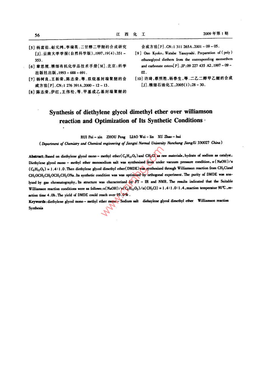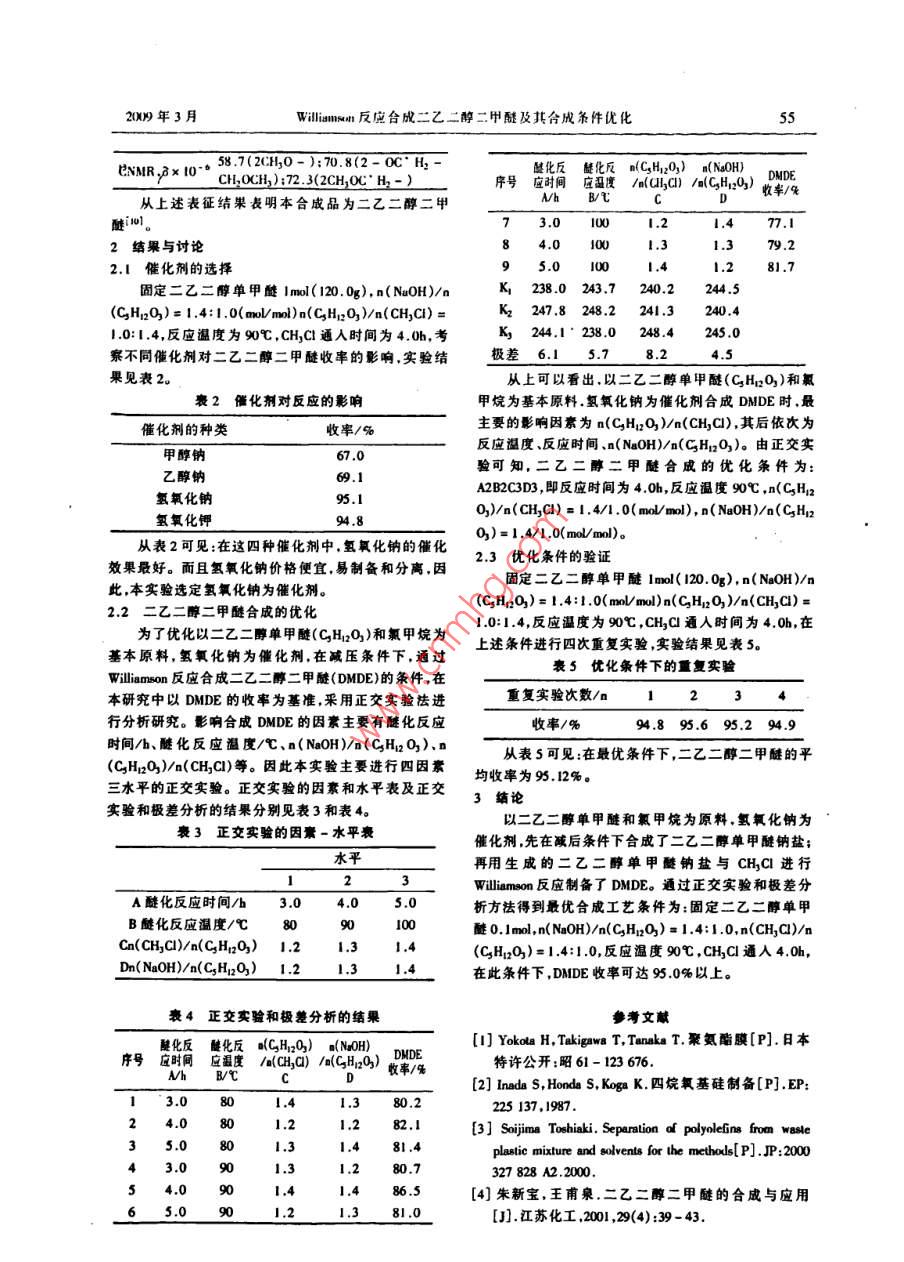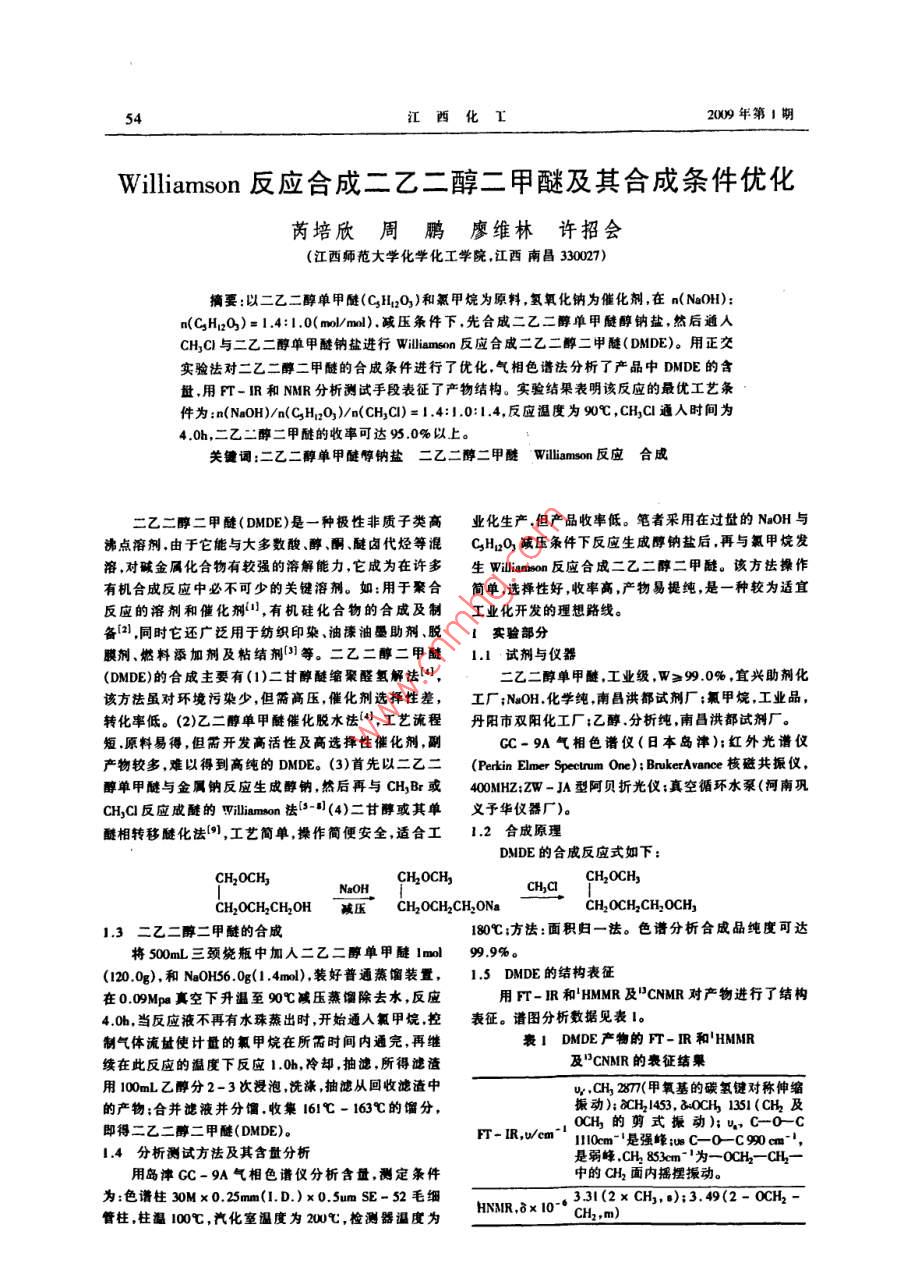 江西化T2009年第1期Williamson反應(yīng)合成二乙二醇二甲醚及其合成條件優(yōu)化芮培欣周鵬廖維林許招會(huì)(江西師范大學(xué)化學(xué)化工學(xué)院,江西南昌330027摘要:以二乙二醇單甲醚(C3H12O3)和氯甲烷為原料氫氧化鈉為催化劑,在n(NOH)n(C3H2O)=14:1.0(ml/ml)減壓條件下,先合成二乙二醇單甲醚醇鈉鹽,然后通人CH2C與二乙二醇單甲醚鈉鹽進(jìn)行 Williamson反應(yīng)合成二乙二醇二甲醚(DMDE)。用正交實(shí)驗(yàn)法對(duì)二乙二醇二甲醚的合成條件進(jìn)行了優(yōu)化氣相色譜法分析了產(chǎn)品中DMDE的含量,用F-IR和NMR分析測(cè)試手段表征了產(chǎn)物結(jié)構(gòu)。實(shí)驗(yàn)結(jié)果表明該反應(yīng)的最優(yōu)工藝條件為:n(NaOH)/a(CH2O3)/n(CH3Cl)=14:1.0:1.4,反應(yīng)溫度為90℃,CH1C通入時(shí)間為4.0h,二乙二醇二甲醚的收率可達(dá)950%以上。關(guān)鐙詞:二乙二醇單甲醚醇鈉鹽二乙二醇二甲醚 Williamson反應(yīng)合成二乙二醇二甲醚(DMDE)是一種極性非質(zhì)子類高業(yè)化生產(chǎn)但產(chǎn)品收率低。筆者采用在過量的NaOH與沸點(diǎn)溶劑,由于它能與大多數(shù)酸、醇酮、醚鹵代烴等混C3Hl2O3減壓條件下反應(yīng)生成醇鈉鹽后再與氯甲烷發(fā)溶,對(duì)堿金屬化合物有較強(qiáng)的溶解能力,它成為在許多生 williamson反應(yīng)合成二乙二醇二甲醚。該方法操作有機(jī)合成反應(yīng)中必不可少的關(guān)鍵溶劑。如:用于聚合簡(jiǎn)單選擇性好收率高,產(chǎn)物易提純是一種較為適宜反應(yīng)的溶劑和催化劑,有機(jī)硅化合物的合成及制工業(yè)化開發(fā)的理想路線。備2),同時(shí)它還廣泛用于紡織印染、油漆油墨助劑脫實(shí)驗(yàn)部分膜劑燃料添加劑及粘結(jié)劑引等。二乙二醇二甲醚1.1試劑與儀器(DMDE)的合成主要有()二甘醇醚縮聚醛氫解法{,二乙二醇單甲醚,工業(yè)級(jí),W≥99.0%,宜興助劑化該方法雖對(duì)環(huán)境污染少,但需高壓,催化劑選擇性差,工廠;NaOH化學(xué)純南昌洪都試劑廠;氯甲烷,工業(yè)品轉(zhuǎn)化率低。(2)乙二醇單甲醚催化脫水法,工藝流程丹陽(yáng)市雙陽(yáng)化工廠;乙醇分析純南昌洪都試劑廠。短原料易得,但需開發(fā)高活性及高選擇性催化劑副cC-9A氣相色譜儀(日本島津);紅外光譜僅產(chǎn)物較多難以得到高純的DMDE。(3)首先以二乙二( Perkin Elmer Spectrum One); Brukeravance核磁共振儀醇單甲醚與金屬鈉反應(yīng)生成醇鈉,然后再與CH2Br或400MHZ:Zw-IA型阿貝折光儀;真空循環(huán)水泵(河南鞏CHC反應(yīng)成醚的 WiLliamson法((4)二甘醇或其單義予華儀器廠)醚相轉(zhuǎn)移醚化法。,工藝簡(jiǎn)單操作簡(jiǎn)便安全,適合工1.2合成原理DMDE的合成反應(yīng)式如下:NaOHCH2OCH2CH ONaCH,, CH;OCH,1.3二乙二醇二甲醚的合成180℃;方法:面積歸一法。色譜分析合成品純度可達(dá)將500mL三頸燒瓶中加人二乙二醇單甲醚lml99.9%。(120.0g),和NaOH6.0g(14ml),裝好普通蒸餾裝置,1.5DMDE的結(jié)構(gòu)表征在009Mp真空下升溫至90℃減壓蒸餾除去水,反應(yīng)用FT-IR和HMMR及cNMR對(duì)產(chǎn)物進(jìn)行了結(jié)構(gòu)40,當(dāng)反應(yīng)液不再有水珠蒸出時(shí),開始通入氯甲烷控表征。譜圖分析數(shù)據(jù)見表l制氣體流量使計(jì)量的氯甲烷在所需時(shí)間內(nèi)通完,再繼表1DMDE產(chǎn)物的FT-R和HMMR續(xù)在此反應(yīng)的溫度下反應(yīng)10h,冷卻,抽濾所得濾渣及"CNMR的征結(jié)果用100mL乙醇分2-3次浸泡,洗滌,抽濾從回收濾渣中w,c28(甲氧基的碳?xì)滏I對(duì)稱伸縮的產(chǎn)物;合并濾液并分餾,收集16℃-163℃的餾分,振動(dòng));bCH2453,O1351(cH2及即得二乙二醇二甲醚(DMDE)0cH的剪式振動(dòng));U,C-0F-,wcm1okm-是強(qiáng)峰;c-0c9cm1.4分析測(cè)試方法及其含量分析是弱峰CH2853m為一OcH2-CH用島津GC-9A氣相色譜儀分析含量,測(cè)定條件中的∝H2面內(nèi)搖擺振動(dòng)為:色譜柱30Mx0.25mm(L.D.)x0.5um$E-52毛。331(2xCH,n);3.49(2-0H2-管柱,柱溫100℃,汽化室溫度為200℃,檢測(cè)器溫度為HNR×10cH2,m)2年3月william反應(yīng)合成二乙二醇二甲醚及其合成條件優(yōu)化CNMR. 3 x 10-b7(HO-=);70.8(2-0cH2HH1):723(2CH1OC`H2-)序號(hào)化反齪北反(C、H202)a(NOH應(yīng)時(shí)間應(yīng)溫度dl CI)/a( C H 0,)hf從上述表征結(jié)果表明本合成品為二乙二醇二甲3.021,42結(jié)果與討論2.L催化劑的選擇5.0固定二乙二醇單甲醚ml(120.0g),n(NaOH)/nK1238.0243.72402244.5(cH12O)=1.4:1.0(m/m)n(cH12O2)/n(cHCl)=K22478248.2241.3240,41.0:14,反應(yīng)溫度為90℃,CH3C通入時(shí)間為4.0h,考K3244.1238.0248.4245.0察不同催化劑對(duì)二乙二醇二甲醚收率的影響,實(shí)驗(yàn)結(jié)極差615782果見表2。從上可以看出,以二乙二醇單甲醚(C3H2O3)和氯褒2催化劑對(duì)反應(yīng)的彩響甲烷為基本原料氫氧化鈉為催化劑合成DMDE時(shí),最催化劑的種類收率/%主要的影響因素為n(cHl2O3)/n(CH2C),其后依次為甲醇鈉67.0反應(yīng)溫度反應(yīng)時(shí)間、n(NaOH)/n(CH2O3)。由正交實(shí)乙醇鈉驗(yàn)可知,二乙二醇二甲醚合成的優(yōu)化條件為:氫氧化鈉A2B2c3D3,即反應(yīng)時(shí)間為4.0h,反應(yīng)溫度9℃,n(CH氫氧化鉀03)/n(CH3C)=1.4/1.0(m/ml),n(NaOH)/n(C3H2從表2可見:在這四種催化劑中,氫氧化鈉的催化03)=14/1.0(mo/ml)23優(yōu)化條件的驗(yàn)證效果最好。而且氫氧化鈉價(jià)格便宜,易制備和分離,因此,本實(shí)驗(yàn)選定氫氧化鈉為催化劑固定二乙二醇單甲醚lmol(120.0g),n(NaOH)/n22二乙二醇二甲醚合