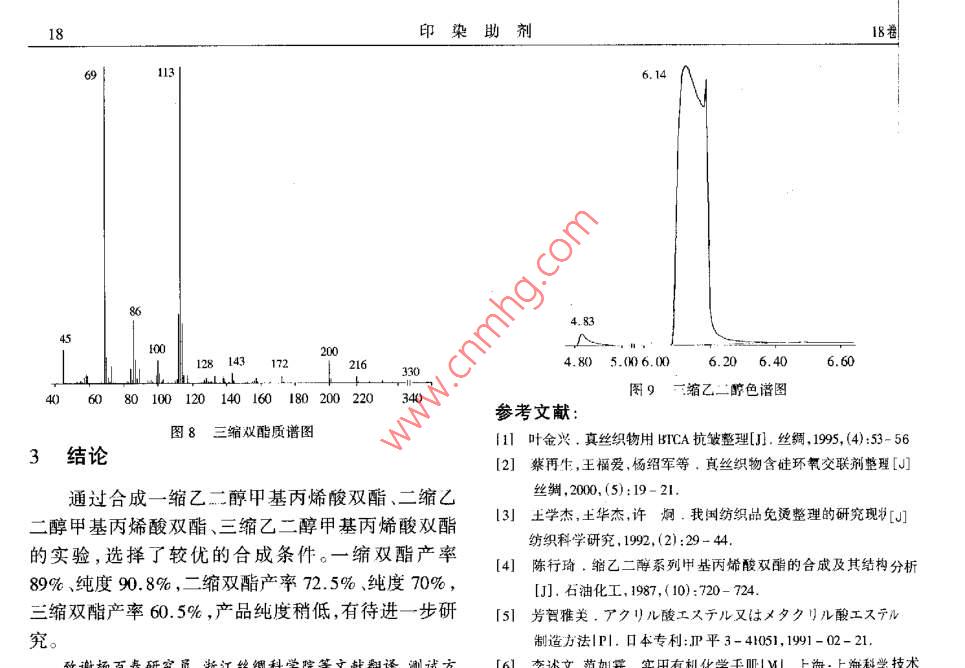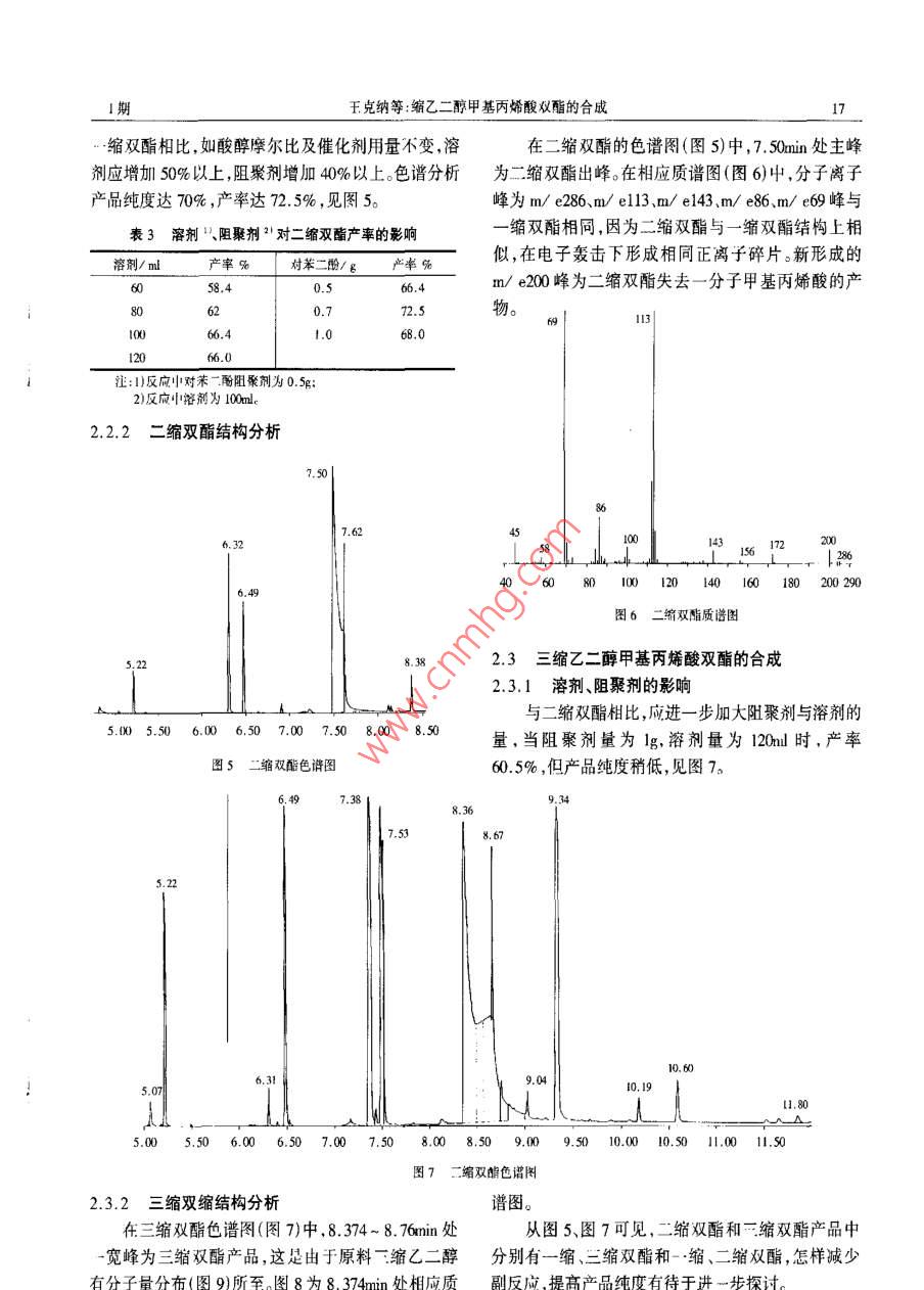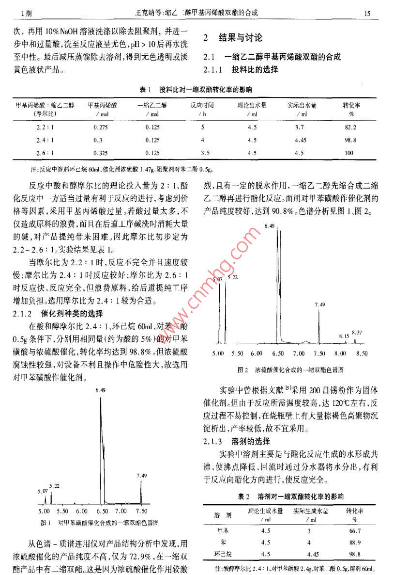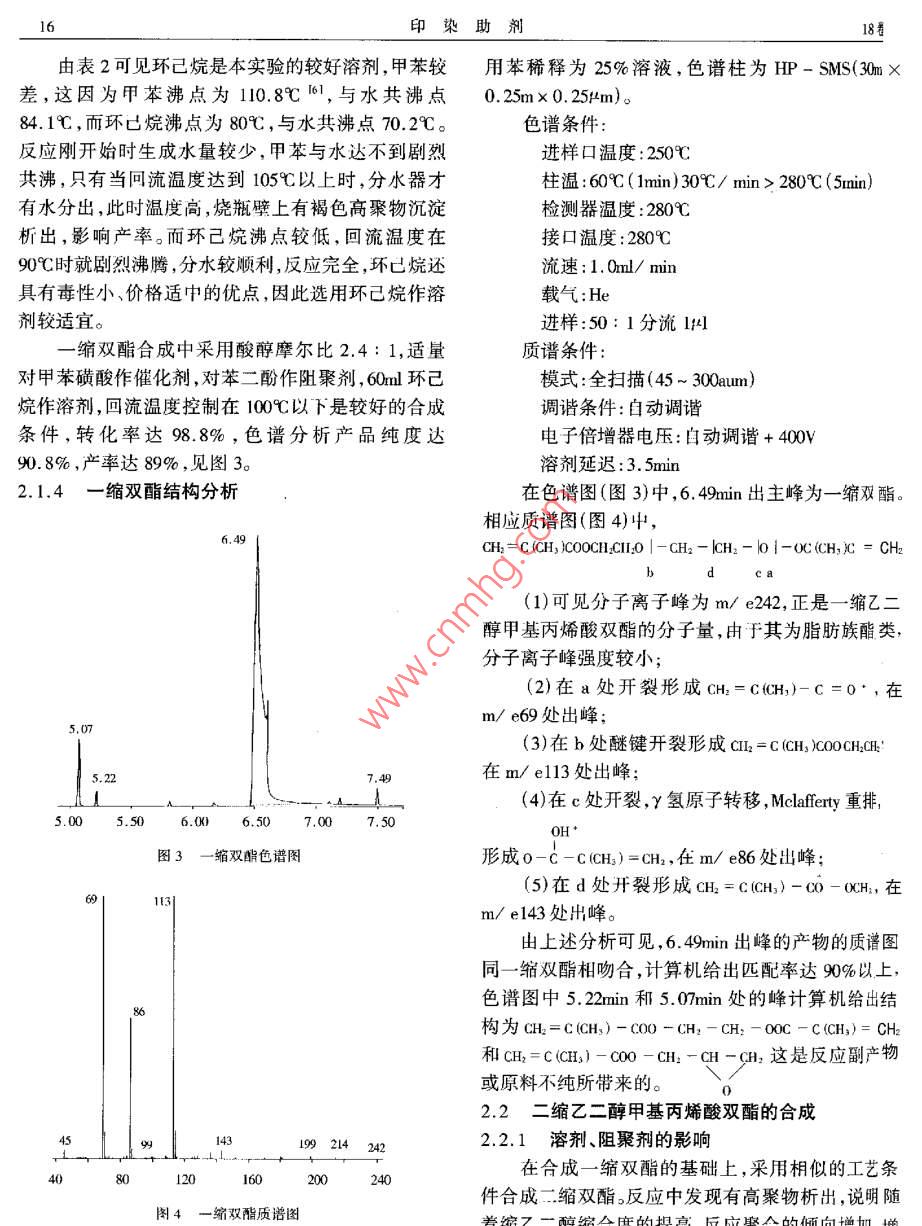 笫18卷笫1期Vol 18 No200年2月TEXTILE AUXILIARIEFeb 2001縮乙二醇甲基丙烯酸雙酯的合成王克納,陳國(guó)強(qiáng),張煒新,王健業(yè)(蘇州大學(xué)材料學(xué)院,江蘇蘇州215021)摘要:制價(jià)格適中效果好的真絲無(wú)甲酐抗皺埋劑。采閏縮乙二與壘丙憑酸酯化反匝,合成乙二酵甲墨丙烯酸雙釃(理劑),并彩因素{催化劑、溶劑陽(yáng)聚劑)和嚴(yán)品粒進(jìn)行了究分析,從而洗擇了最優(yōu)合成條。一縮雙酯轉(zhuǎn)化率98.8%,度90.8%,產(chǎn)宰89%。關(guān)鍵詞:有機(jī)合成;縮乙二醉;甲基丙烯酸;雙中圖分類(lèi)號(hào):0623.42“6.2文就標(biāo)識(shí)碼:A文章編號(hào):104-0439(200101-014-05SYNTHESIS OF DIGLYCOL METHACRYLATEWANG Ke-na, CHEN Guo-qiang, ZHANG Wei-xin, WANG Jian-ye(The Material College of Suzhou University, Suzhou 215021, China)Abstract: For preparing an effective and reasonable pr ice non-formaldehyde anti-crease finishing agent fornatural silk, diglycol methacrylate (finishing agent) was synthesized by esterifying reaction of diglycol with methacrylicthe product. Thus, the best synthesis conditions were selected. The conversion rate of the product: 98. 8%, purity90. 8% and yield rate: 89%Key words: organic synthesis; diglycol; methacrylic acid: diester目前,真絲綢無(wú)甲醛抗皺整理劑-3,如多羧酸1試劑環(huán)氧化合物等,對(duì)真絲抗皺效果較好,但價(jià)格昂貴原料:甲基丙烯酸、一縮乙二醇、二縮乙二醇手感下降,實(shí)現(xiàn)工業(yè)化大生產(chǎn)的很少縮乙二醇系列縮乙二醇均為化學(xué)純催化劑:濃硫酸(分析純甲基丙烯酸雙酯“是一類(lèi)重要的化工產(chǎn)品,曾廣泛用甲苯磺酸(化學(xué)純)、錫粉(200日);阻聚劑:對(duì)苯_于生產(chǎn)厭氧膠粘劑和光固化涂料膠粘劑。因其為雙(分析純):溶劑:環(huán)己烷苯、甲苯均為分析純。功能團(tuán)的雙烯化合物,有良好的交聯(lián)作用,可用作真1.2儀器絲及纖維素織物的無(wú)甲醛交聯(lián)劑-6,與絲素大分子250ml三口燒瓶,回流冷凝管,分水器,油浴鍋接枝交聯(lián),提高真絲的十濕抗皺性,改善真絲過(guò)于綿分液漏斗,JB-90-2型定時(shí)恒溫磁力攪拌器F軟、易皺折的缺點(diǎn)CC6890-5973MSD色譜-質(zhì)譜連用儀。1實(shí)驗(yàn)部分1.3合成2cH:=C(CH, lCOoll II0(CI CHIO ,H ->CH,=C(CH: )C00( 0 ),OC(CH,)C CH: n=2.34在三口燒瓶中按一定投料比加入縮乙二醇、甲三口燒瓶放入油浴鍋內(nèi),恒溫?cái)嚢璺磻?yīng),回流溫度基丙烯酸,再依次加入適量對(duì)苯二酚、溶劑(環(huán)己烷、制在95~105℃。當(dāng)觀察到回流速度變慢,分離出甲苯、苯三者取一)、催化劑(濃硫酸、對(duì)甲苯磺酸二水量接近理論值時(shí),叮認(rèn)為酯化反應(yīng)基本完成。者取-),攪拌。裝好溫度計(jì)、分水器、回流冷凝管,將將燒瓶中反應(yīng)液冷卻后倒入分液漏斗,先水洗收稿日期:20)-09-0作者筒介:王克納(1叨72-)女,江蘇邱州人,蘇州大學(xué)材料學(xué)院在讀願(yuàn)士,主要從事紡織品功能性整理及其助劑的研究與開(kāi)發(fā)。王克納等縮乙醇甲基丙烯酸雙酷的合成次,再用10%NaOH溶液洗滌以除去阻聚劑,并進(jìn)步中和過(guò)量酸,洗至反應(yīng)液呈尤色,p>10后再水洗2結(jié)果與討論至中性。最后減壓蒸餾除去溶劑,得到無(wú)色透明或淡2.1一縮乙二醇甲基丙烯酸雙酯的合成黃色液狀產(chǎn)品2.1.1投料比的選擇表1投料比對(duì)一編雙酯轉(zhuǎn)化率的影響屮基丙烯酸:縮乙二醇甲基丙烯酸縮乙二醇反成時(shí)間理論出水量實(shí)際出水敏轉(zhuǎn)化率摩爾比2.2:101.2750,1252,6:13.54.54.5汴:反中溶劑環(huán)已烷6m,催化劑濃硫酸147g,阻聚劑對(duì)苯二酚0.5g反應(yīng)中酸和醇摩爾比的理論投入量為2:1,酯烈,且有一定的脫水作用,一縮乙二醇先縮合成二縮化反應(yīng)中·方適當(dāng)過(guò)量有利∫反應(yīng)的進(jìn)行,考慮到價(jià)乙二醇再進(jìn)行酯化反應(yīng)而用對(duì)甲苯磺酸作催化劑的格等因索,采用甲基內(nèi)烯酸過(guò)量。若酸過(guò)量太多,不產(chǎn)品純度較好,達(dá)到90.8%色譜分析見(jiàn)圖1、圖2。僅造成原料的浪費(fèi),而且在后道L序堿洗時(shí)消耗大量的堿,對(duì)產(chǎn)品提純帶來(lái)困難。因此摩爾比初步定為22-26:1實(shí)驗(yàn)結(jié)果見(jiàn)表1當(dāng)摩爾比為22:1時(shí),反應(yīng)不完余并用速度較慢:摩爾比為24:1時(shí)反應(yīng)較好;摩爾比為26:1時(shí)反應(yīng)快,反應(yīng)完全,但浪費(fèi)原料,給后道提純T序增加負(fù)擔(dān)。選用摩爾比為24:1較為合適。2.1.2催化劑種類(lèi)的選擇在酸和醇摩爾比2.4:1、環(huán)已烷60nl、對(duì)苯二酚0.5g條件下,分別用相同量(約為酸的5%)的對(duì)甲苯磺酸與濃硫酸催化,轉(zhuǎn)化率均達(dá)到98.8%但濃硫酸5.∞5.506,∞6.507,00-7、8.∞)85腐蝕性較強(qiáng),對(duì)設(shè)備不利且操作中危險(xiǎn)性大,故選用2濃硫酸催化合成的一雙酯色譜圖對(duì)甲苯磺酸作催化劑。實(shí)驗(yàn)屮中曾根據(jù)文獻(xiàn)采用200目錫粉作為固體催化劑但由于反應(yīng)所需溫度較高,達(dá)120℃左右,反應(yīng)過(guò)程不易控制,在燒瓶壁上有大量棕褐色高聚物沉淀析出,產(chǎn)率較低,故不宜釆用。2.1.3溶劑的選擇實(shí)驗(yàn)屮溶劑主要是與酯化反應(yīng)生成的水形成共沸,使沸點(diǎn)降低,回流時(shí)通過(guò)分水器將水分出,有利于反應(yīng)向酯化方向進(jìn)行,使反應(yīng)完全。2Es 20's表2溶劑對(duì)一縮雙酯轉(zhuǎn