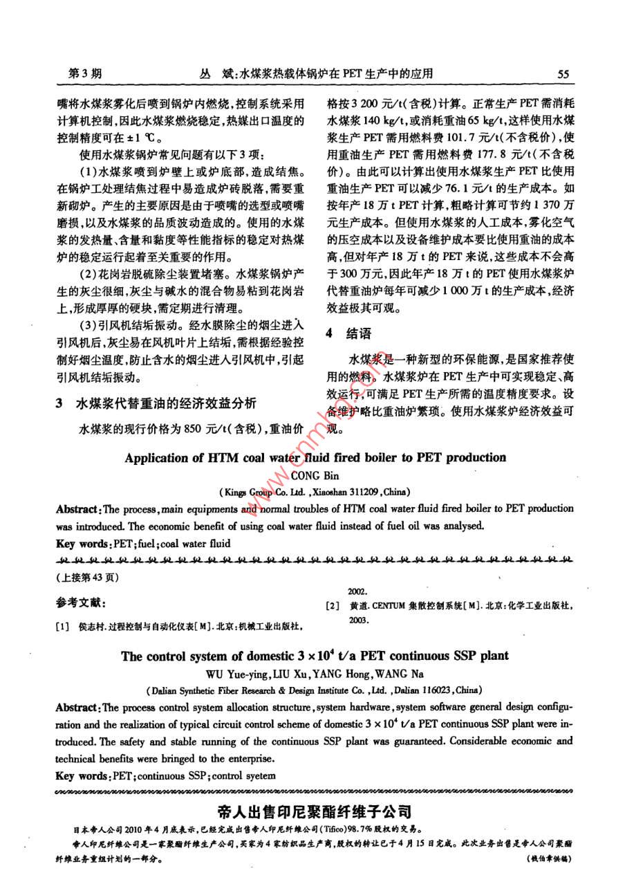 第23卷第3期聚酯工業(yè)Vol 23 No. 3201005Polyester IndustryMay 2010di:10.3969/j,im.10088261.2010.03.017水煤漿熱載體鍋爐在PET生產(chǎn)中的應(yīng)用叢斌(開氏集團有限公司,浙江蕭山311209)摘要:介紹了PET生產(chǎn)中使用水煤漿熱載體鍋爐的主要流程、設(shè)備及常見的問題,以及使用水煤漿代替重油的經(jīng)濟效益。關(guān)鍵詞:PET;燃料;水煤漿中圖分類號:TQ323.41文獻標識碼:B文章綿號:1008861(2010)03005402早期的PET生產(chǎn)所使用的加熱爐大都是重油能輸送給用熱設(shè)備后,繼而返回重新加熱的直流式爐。重油爐具有操作方便,溫度控制精度高,可以快特種工業(yè)爐。水煤漿有機熱載體加熱爐是整個供熱速提高或降低熱量供給的優(yōu)點。近年來,國際市場系統(tǒng)的心臟。上原油價格屢創(chuàng)新高,采用重油生產(chǎn)PET的成本越天元滌綸水煤漿鍋爐爐體為臥式方箱型盤管結(jié)來越高部分PET廠將重油爐改為煤爐,這樣大幅構(gòu),其受熱面輻射段盤管和對流段盤管置于燃燒室度降低了PET生產(chǎn)的成本。但燃煤鍋爐存在環(huán)保上部。高溫?zé)煔饨?jīng)輻射段盤管輻射換熱后,從過渡和資源浪費問題,江浙一帶已經(jīng)不允許新增燃煤鍋區(qū)上部進入對流段前部盤管的第一對流換熱區(qū),經(jīng)爐,水煤漿鍋爐成為政策推薦的使用鍋爐。對流換熱后由下部進入對流段后部盤管的第二對流水煤漿由70%左右的煤,30%的水及少量化學(xué)換熱區(qū),對流換熱后,由排煙口排出。添加劑制成,是一種漿體燃料,可以像油一樣泵送、水煤漿燃燒器采用先進的旋流形式的專用燃燒霧化、貯存和穩(wěn)定燃燒,其熱值相當(dāng)于燃料油的一器,為滿足負荷調(diào)節(jié)、霧化燃燒等要求,采用2臺燃半,可代替燃料油用于鍋爐、電站、工業(yè)爐和窯爐,用燒器,具有自動燃燒器的各種功能,如自動點火,噴于代替煤炭燃用,具有燃燒效益髙、負荷調(diào)整便利、漿,自動清洗漿槍及油槍,漿槍自動進退、自動火焰減少環(huán)境污染、改善勞動條件和節(jié)省用煤等優(yōu)點。檢測等功能,其霧化介質(zhì)采用壓縮空氣噴嘴釆用多開氏集團下屬杭州天元滌綸有限公司已于級撞擊式結(jié)構(gòu)使霧化品質(zhì)好,燃燒充分2007年10月將PET生產(chǎn)中的重油爐改為水煤漿鍋爐出灰由特制的鏈式刮板出渣機完成,其他爐,是國內(nèi)第1家使用水煤漿爐生產(chǎn)PET的廠家。鏈條采用合金材料能完成自動出灰對流管束積灰1水煤漿爐簡介設(shè)計有空氣吹掃裝置。鍋爐煙氣經(jīng)余熱鍋爐回收余熱后降溫,余熱鍋1.1水煤漿爐流程爐產(chǎn)生的蒸汽可供PET、紡絲空調(diào)等使用。整個煙水煤漿爐工藝流程見圖1。氣凈化系統(tǒng)包括兩大部分:()以多管除塵器進行干法除塵;(2)以SXC·Ⅰ花崗巖濕法脫硫除塵器配套鈉堿法"脫硫工藝進行綜合脫硫除塵。包括脫硫劑水煤黎水煤漿鍋爐余熱鍋爐鈉堿除硫除塵的貯存、脫硫除塵器、吸收循環(huán)系統(tǒng)及脫硫產(chǎn)物的處理系統(tǒng)。通過鈉堿脫硫除塵設(shè)備可達到除塵效率大2氣以風(fēng)饑]國灰設(shè)型[[列風(fēng)機]于9%脫硫效率大于75%鼓風(fēng)機將空氣送到燃燒器,作為燃料燃燒的助圖1水煤漿爐工藝流程燃空氣。Flg. 1 Coal water fluid fired boller process系統(tǒng)控制采用工控機控制,控制穩(wěn)定12水煤漿爐設(shè)備水煤漿有機熱載體加熱爐是以水煤漿為燃料,2水煤漿鍋爐使用過程中常見的問題以導(dǎo)熱油為熱載體,利用循環(huán)泵強制液相循環(huán),將熱水煤漿熱媒爐的燃燒器同重油爐的相似,由噴收稿日期:2010014。作者筒介:叢斌(1964-),女黑龍江伊春人,高級工程師碩士,從事PET生產(chǎn)技術(shù)管理工作。第3期叢斌:水煤漿熱載體鍋爐在PET生產(chǎn)中的應(yīng)用嘴將水煤漿霧化后噴到鍋爐內(nèi)燃燒,控制系統(tǒng)采用格按3200元/t(含稅)計算。正常生產(chǎn)PET需消耗計箅機控制,因此水煤漿燃燒穩(wěn)定,熱媒出口溫度的水煤漿140kg/t,或消耗重油65kg/′,這樣使用水煤控制精度可在±1℃。漿生產(chǎn)PET需用燃料費101.7元t(不含稅價),使使用水煤漿鍋爐常見問題有以下3項:用重油生產(chǎn)PET需用燃料費177.8元/t(不含稅(1)水煤漿噴到爐璧上或爐底部,造成結(jié)焦。價)。由此可以計算出使用水煤漿生產(chǎn)PET比使用在鍋爐工處理結(jié)焦過程中易造成爐磚脫落需要重重油生產(chǎn)PET可以減少76.1元/的生產(chǎn)成本。如新砌爐。產(chǎn)生的主要原因是由于噴嘴的選型或噴嘴按年產(chǎn)18萬tPET計算粗略計算可節(jié)約1370萬磨損,以及水煤漿的品質(zhì)波動造成的。使用的水煤元生產(chǎn)成本。但使用水煤漿的人工成本,霧化空氣漿的發(fā)熱量、含量和黏度等性能指標的穩(wěn)定對熱煤的壓空成本以及設(shè)備維護成本要比使用重油的成本爐的穩(wěn)定運行起著至關(guān)重要的作用。高,但對年產(chǎn)18萬t的PET來說這些成本不會高(2)花崗巖脫硫除塵裝置堵塞。水煤漿鍋爐產(chǎn)于300萬元因此年產(chǎn)18萬t的PET使用水煤漿爐生的灰塵很細灰塵與堿水的混合物易粘到花崗巖代替重油爐每年可減少1000萬t的生產(chǎn)成本,經(jīng)濟上,形成厚厚的硬塊,需定期進行清理。效益極其可觀。(3)引風(fēng)機結(jié)垢振動。經(jīng)水膜除塵的煙塵進入引風(fēng)機后灰塵易在風(fēng)機葉片上結(jié)垢需根據(jù)經(jīng)驗4結(j