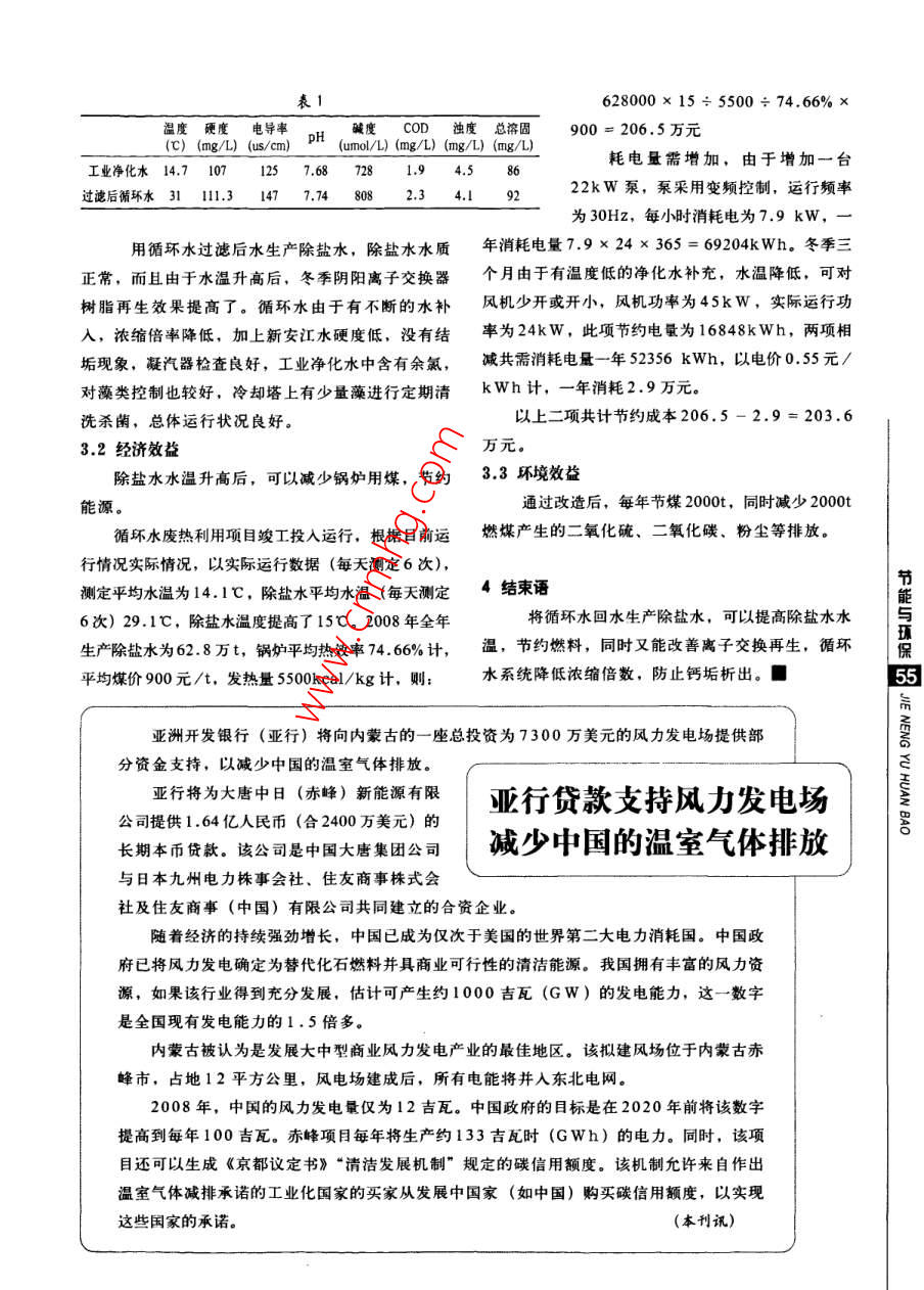 利用循環(huán)水回水王產(chǎn)期高水的能劉紅春(漸江新安化工集團股份有限公司,漸江杭州311600)浙江新安化工集團股份有限公司建德熱電廠共有兩臺6000kW發(fā)電機組,其中一臺抽背機組,臺抽凝機組。電廠循環(huán)水主要用于抽凝機組冷凝器換熱,循環(huán)水換熱后經(jīng)冷卻塔冷卻后循環(huán)使用。由于抽凝式汽輪機冷源熱損失很大,乏汽在凝結成凝摘要循環(huán)水回水經(jīng)過的熱交換后,溫度在25~結水過程中所釋放出的熱量通過循環(huán)水換熱被循環(huán)37℃左右,比生產(chǎn)除鹽水的原水溫度高,用循環(huán)水吸收而浪費掉了,造成了能源的浪費。循環(huán)水系水生產(chǎn)除鹽水,可以提高除鹽水水溫,降低循環(huán)節(jié)統(tǒng)保有水量450m3,循環(huán)水出水水溫度24~32水濃縮倍率,節(jié)約燃料,降低消耗,減少污染?;厮疁囟?8~36℃。工廠除鹽水生產(chǎn)原水取于新安關鍵詞:熱電廠;循環(huán)水:除鹽水能與保52飛江江水,新安江江水是新安江大壩水下60m深的水發(fā)電時排出的,因此長年水溫恒定,平均水溫在152改造后的工藝541℃左右。江水經(jīng)預處理后為工業(yè)凈化水,再供陰陽將循環(huán)水系統(tǒng)與除鹽水生產(chǎn)系統(tǒng)聯(lián)在一起,將離子交換器生產(chǎn)除鹽水,現(xiàn)有除鹽水生產(chǎn)共有兩套凈化水作為循環(huán)水補充水,將原工業(yè)凈化水改為循60t/h、兩套35t/h的陰陽離子交換器,一開一備,環(huán)水補水,將循環(huán)水回水通過回壓泵加壓再經(jīng)雙層毎小時用水量在70~90t左右。用循環(huán)水生產(chǎn)除鹽濾料機械過濾器過濾后,到陰陽離子交換器交換,水可以將除鹽水水溫提高15℃以上,全年可節(jié)約大生產(chǎn)除鹽水,使除鹽水水溫提高,如圖2。量的燃料。離子交換躕1改造前的循環(huán)水除鹽水工藝(圖1)循環(huán)水池除碳器工業(yè)凈化水回水中水泡28~36℃24~32℃陽離子交換器離子交換器工業(yè)凈化水工業(yè)水(少量補水)機械過濾子除碳器除鹽水篇凝汽器循環(huán)水池水溫平均30)中間水池鍋爐除氧器[開離∫交糗器出水圖228-36℃+24-32℃除鹽水箱凝汽器3實際效果水溫平均15℃3.I水質(zhì)情況[鍋鐘除召通過以上改造后除鹽水溫度增加了,陰陽離子交換器進水水質(zhì)達到要求,表1是循環(huán)水經(jīng)過濾后水質(zhì)與凈化水水質(zhì)對比情況628000×15÷5500÷74.66%X溫度硬度電導率堿度CD濁度總溶固900=206.5萬元(℃)(mg/L)(us/cm)(umol/L)(mg/L)(mg/L)(mg/L)工業(yè)凈化水14.71071257.68728194.586耗電量需增加,由于增加一臺過濾后環(huán)水31Ⅲ1:31#1x80823449222W,.果用變頻控制,運行頻率為30Hz,每小時消耗電為7.9kW,用循環(huán)水過濾后水生產(chǎn)除鹽水,除鹽水水質(zhì)年消耗電量7.9×24×365=69204kWh。冬季三正常,而且由于水溫升高后,冬季陰陽離子交換器個月由于有溫度低的凈化水補充,水溫降低,可對樹脂再生效果提高了。循環(huán)水由于有不斷的水補風機少開或開小,風機功率為45kW,實際運行功入,濃縮倍率降低,加上新安江水硬度低,沒有結率為24kW,此項節(jié)約電量為16848kWh,兩項相垢現(xiàn)象,凝汽器檢查良好,工業(yè)凈化水中含有余氯,減共需消耗電量一年52356kWh,以電價055元/對藻類控制也較好,冷卻塔上有少量藻進行定期清kWh計,一年消耗2.9萬元。洗殺菌,總體運行狀況良好以上二項共計節(jié)約成本206.5-2.9=203.63.2經(jīng)濟效益萬元。除鹽水水溫升高后,可以減少鍋爐用煤,節(jié)約3,3環(huán)境效益能源通過改造后,每年節(jié)煤2000t,同時減少2000t循環(huán)水廢熱利用項目竣工投入運行,根據(jù)目前運燃煤產(chǎn)生的二氧化硫、二氧化磯、粉塵等排放。行情況實際情況,以實際運行數(shù)據(jù)(每天測定6次),測定平均水溫為14.1℃,除鹽水平均水溫(每天測定4結束語將循環(huán)水回水生產(chǎn)除鹽水,可以提高除鹽水水節(jié)能與6次)29.1℃,除鹽水溫度提高了15℃。2008年全年環(huán)生產(chǎn)除鹽水為62.8萬t,鍋爐平均熱效率746%計,溫,節(jié)約燃料,同時又能改善離子交換再生,循環(huán)保平均煤價900元/t,發(fā)熱量5500kcal/kg計,則水系統(tǒng)降低濃縮倍數(shù),防止鈣垢析出?!?亞洲開發(fā)銀行(亞行)將向內(nèi)蒙古的一座總投資為7300萬美元的風力發(fā)電場提供部分資金支持,以減少中國的溫室氣體排放。亞行將為大唐中日(赤峰)新能源有限亞行貨款支持風力發(fā)電場公司提供1.64億人民幣(合2400萬美元)的長期本幣貸款。該公司是中國大唐集團公司減少中國的溫室氣體排放8與日本九州電力株事會社、住友商事株式會社及住友商事(中國)有限公司共同建立的合資企業(yè)。隨著經(jīng)濟的持續(xù)強勁增長,中國已成為僅次于美國的世界第二大電力消耗國。中國政府已將風力發(fā)電確定為替代化石燃料并具商業(yè)可行性的清潔能源。我國擁有豐富的風力資源,如果該行業(yè)得到充分發(fā)展,估計可產(chǎn)生約1000吉瓦(GW)的發(fā)電能力,這一數(shù)字是全國現(xiàn)有發(fā)電能力的1.5倍多。內(nèi)蒙古被認為是發(fā)展大中型商業(yè)風力發(fā)電產(chǎn)業(yè)的最佳地區(qū)。該擬建風場位于內(nèi)蒙古赤峰市,占地12平方公里,風電場建成后,所有電能將井入東北電網(wǎng)。2008年,中國的風力發(fā)電量僅為12吉瓦。中國政府的目標是在2020年前將該數(shù)字提高到每年100吉瓦。赤峰項目毎年將生