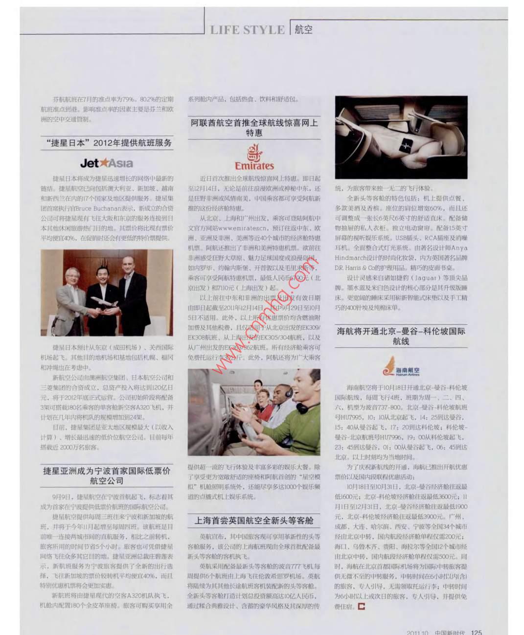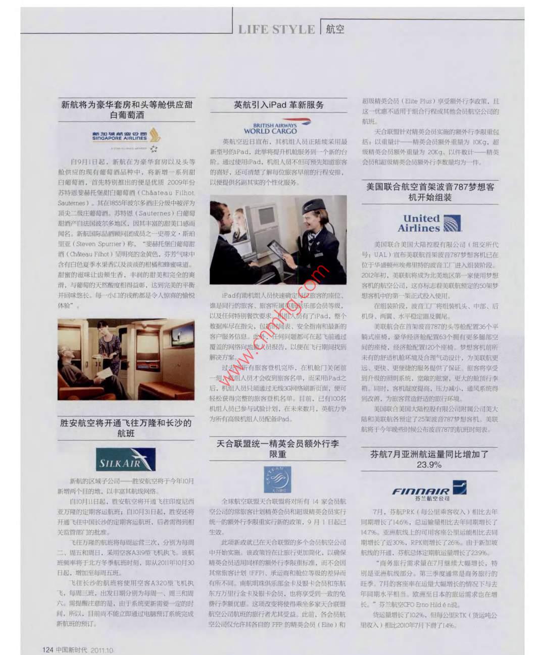 LIFE STYLE|航空新航將為豪華套房和頭等艙供應(yīng)甜英航引入Pad革新服務(wù)超級精英會員( Elite Plus)享受外行李政策,且白葡萄酒這一優(yōu)惠不適用于組合行程或其他會員航空公司的航班。WORLD CARGOm她t天合聯(lián)盟針對精英會員實施的額外行李限重包英航空近日直布,其機組人員正陸續(xù)采用最括:以重量計一精英會員額外重量為10Kg,超新型號的Pad,此舉將是開機艙服務(wù)到一個新的臺級精英會員額外重量為20Kq、以件數(shù)計一精英自9月1日起,新航在為豪華套房以及頭等階。通過使用ad,機組人員不但可預先知道底客會員和超級精英會員額外行李數(shù)量均為一件艙供應(yīng)的現(xiàn)有萄酒品種中,將新增一系列甜的喜好,還可清楚了解每位旅客早前的行程安排白葡萄酒,首先特別推出的便是優(yōu)質(zhì)2009年份以便提供名副其實的個性化服務(wù)蘇特恩斐赫托堡甜白葡萄酒( Chaateau filho美國聯(lián)合航空首架波音787夢想客Sauternes),其在855年波爾多酒分級中被評為機開始組裝頂尖二級莊葡萄酒。蘇特恩( Sauternes)白葡萄甜酒產(chǎn)自法國波爾多地區(qū),因其豐富的甜美口感而UnitedAirlines聞名。新航國際品酒額問團成員之一史蒂文·斯珀里亞( Steven Spurrier)稱,“斐赫托堡白葡萄甜美國聯(lián)合美國大陸控股有限公司(組交所代酒( Chateau Fthot)呈明亮的金黃色,芬芳氣味中號:UAL)宣布美聯(lián)航首架波音787夢想客機已在含有白色夏季水果香以及淡談的柑橘和蜂密味道位于華領(lǐng)州埃弗里特的玻音工廠進入組裝階段甜蜜的滋味讓齒生香,豐潤的甜美和完全的爽2012年初,美聯(lián)航將成為北美地區(qū)第一家使用夢想滑,與葡萄的天然酸度相得益彰,達到完美的平衡客機的航空公司,這亦標志著美聯(lián)航預定的50架夢并回味悠長。每一小口的找的都是令人驚喜的愉悅Pad有助機組人員快速確定每位旅客的座位、想客機中的第一架正式投入使用誰是同行的旅客、旅客所屬英航俱樂部會員等級在組裝階段,波音工廠將組裝機頭、中部、后以及任何特別餐飲要求。機組人員有了Pad,整個機身、兩翼、水平穩(wěn)定圖及尾數(shù)據(jù)庫盡在指尖,包括時間表、安全指南和最新的美聯(lián)航會在首架波首787的頭等艙配置36個平客戶服務(wù)信息。此外,任何問題都可在起飛前通過躺式座椅,豪華經(jīng)濟艙配置63個擁有更多腿郵空覆蓋的網(wǎng)絡(luò)向地勤人員報告,以便在飛行期間找到間的座椅,經(jīng)濟艙配置20個座椅。夢想客機前所解決方案未有的新適機艙環(huán)境及合理氣動設(shè)計,為美聯(lián)航更過去當所有服客登機完畢,在機艙門關(guān)閉前遠、更快、更便捷的服務(wù)提供了保證。旅客將享受一刻,機組人員才會收到旅客名單,而采用Pad之到升級的照明系統(tǒng),寬敞的腦窗,更大的艙頂行李后,機組人員只須通過無線3G網(wǎng)絡(luò)刷新頁面,便可箱,同時,客機濕度提高,壓力減小,通風系統(tǒng)得輕松獲得完整的旅客登機名單。目前,已有0名到改善,為旅客造舒適的旋行環(huán)境機組人員已參與試驗計劃,在未來數(shù)月,英航力爭美國聯(lián)合美國大陸控股有限公司附屬公司美大勝安航空將開通飛往萬隆和長沙的為所有高級機組人員配備ad陸和美聯(lián)航各預定了25架波音787夢想客機。美聯(lián)航班航將于今年晚些時候公布波音78的航班時刻表。天合聯(lián)盟統(tǒng)一精英會員額外行李限重芬航7月亞洲航運量同比增加了SILKAIR23.9%新航的區(qū)域子公司一勝安航空將于今年1O月新增兩個目的地,以豐富其航線網(wǎng)絡(luò)FNAIR自O(shè)月1日起,勝安航空將開通飛往印度尼西全球航空聯(lián)盟天合聯(lián)盟將對所有14家會員航芬蘭航空公司萬隆的定期客運航班;自O(shè)月3日起,勝安還將空公司的常旅客計劃精英會員和超級精英會員實行7月,芬航PRK(每公里乘客收入)相比去年開通飛往中國長沙的定期客運航班,后者需得到相統(tǒng)一的額外行季限重實行新的政策,9月1日起已同期增長了146%,總運輸量相比去年同期增長了關(guān)監(jiān)管部門的批準。147%。亞洲航線上的可用客座公里運能相比去同飛往萬隆的航班將每周運營三次,分別為每固此項新政就已在天合聯(lián)盟的多個會員航空公司期增長了近30%,RPK則增長了26%。由于新加坡二、周五和周日,采用空客A39型飛機執(zhí)飛。該航中開始實施。該政策旨在讓旅行更加簡化,以確保航線的開通,芬航總體定期航運量增長了239%班頻率將于北方冬季航班時刻,即從20年月30精英會員適用同樣的額外行李限重標準,而不會因商務(wù)旅行需求量在了月繼續(xù)大幅增長,特日起,增加至每周五班其常旅客計劃FF、承運商和艙位等級的差異而別是亞洲航線部分。第三季度通常是商務(wù)旅行的飛往長沙的航班將使用空客A320型飛機執(zhí)有所不同。南航明珠俱樂部金卡及銀卡會員和東航旺季。7月的客座率在運量大幅增長的情況下與去飛,每固三班,出發(fā)日期分為每周一、周三和周東方方里行金卡及銀卡會員,也將享受到一致的免年同期水平相當。歐洲至日本的旅運需求也在增六。需提醒注意的是,由于系統(tǒng)更新需要一定的時費行李額優(yōu)惠。這項改變將使得乘坐多家天合聯(lián)盟長?!狈姨m航空 CFO Eno Hilden說間,所以,目前尚不能立即通過電腦預訂系統(tǒng)完成航空公司航班的旅