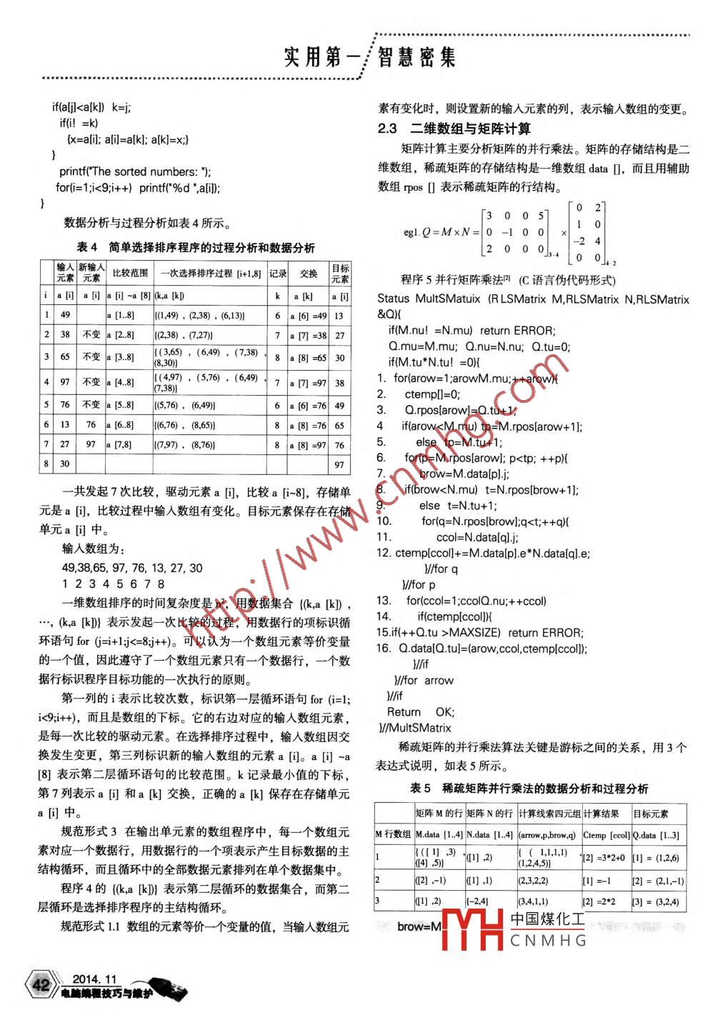 實用第一/智慧密集源程序過程分析與數(shù)據(jù)分析林榕慧(仰恩大學(xué)計算機與信息學(xué)院,泉州福建362000)摘要: 源程序分析的實質(zhì)是程序的過程分析和數(shù)據(jù)分析,目的是提供一種程序閱讀的方法,實現(xiàn)程序理解。方法是詳細分析復(fù)雜程序的執(zhí)行過程,關(guān)鍵語句的結(jié)構(gòu)與功能,建立變量、數(shù)組、二維數(shù)組或者輔助數(shù)組3個層次的程序數(shù)據(jù)的處理架構(gòu),并且用數(shù)據(jù)行和一維數(shù)據(jù)集合表示。源程序分析的5個規(guī)范使過程分析和數(shù)據(jù)分析有章可循。程序的功能分析是更進一步的分析方法,發(fā)現(xiàn)源程序的具有不可分割性的功能塊,以此建立程序的功能結(jié)構(gòu),掌握高級編程方法。關(guān)鍵詞:過程分析與數(shù)據(jù)分析;程序數(shù)據(jù);數(shù)組;輔助數(shù)組;原子功能if(b>c) {t=b;b=c;c=t;//比較語句31概述print(%5.2f,%5.2f,%5.2f ,a,b,c);}源程序分析與現(xiàn)有的程序分析不同。現(xiàn)有程序分析分為靜{a,b,c}元素的組合(a,b) , (a,c) , (b,e) 是全部有效的對比態(tài)分析和動態(tài)分析兩類,作用是(1)發(fā)現(xiàn)程序語句的錯誤;數(shù),經(jīng)過3次比較和交換,得到三元組