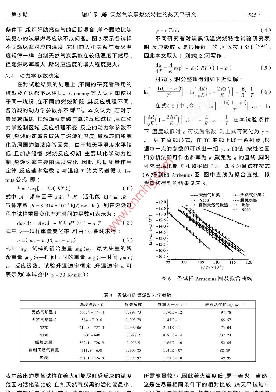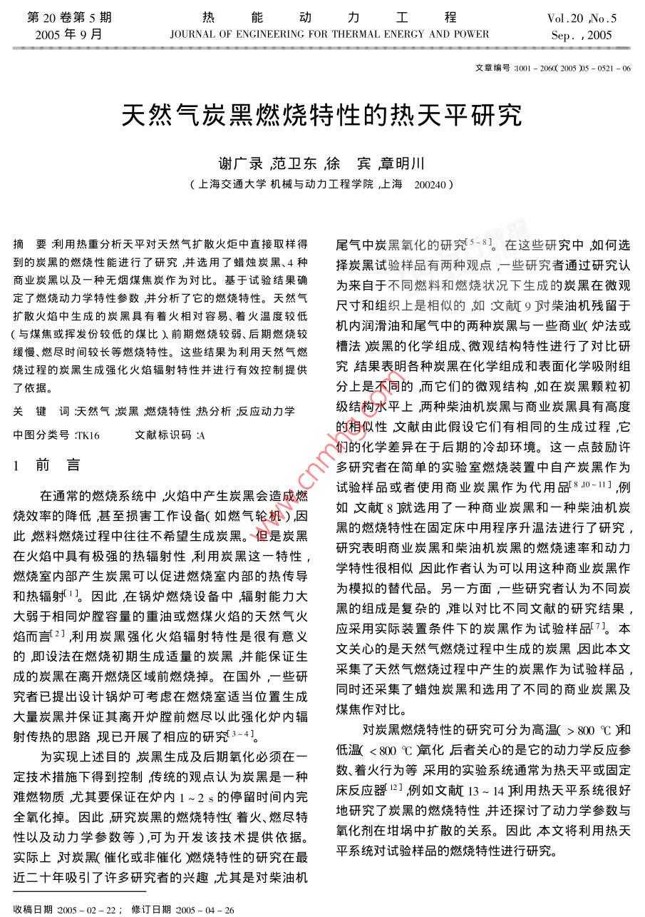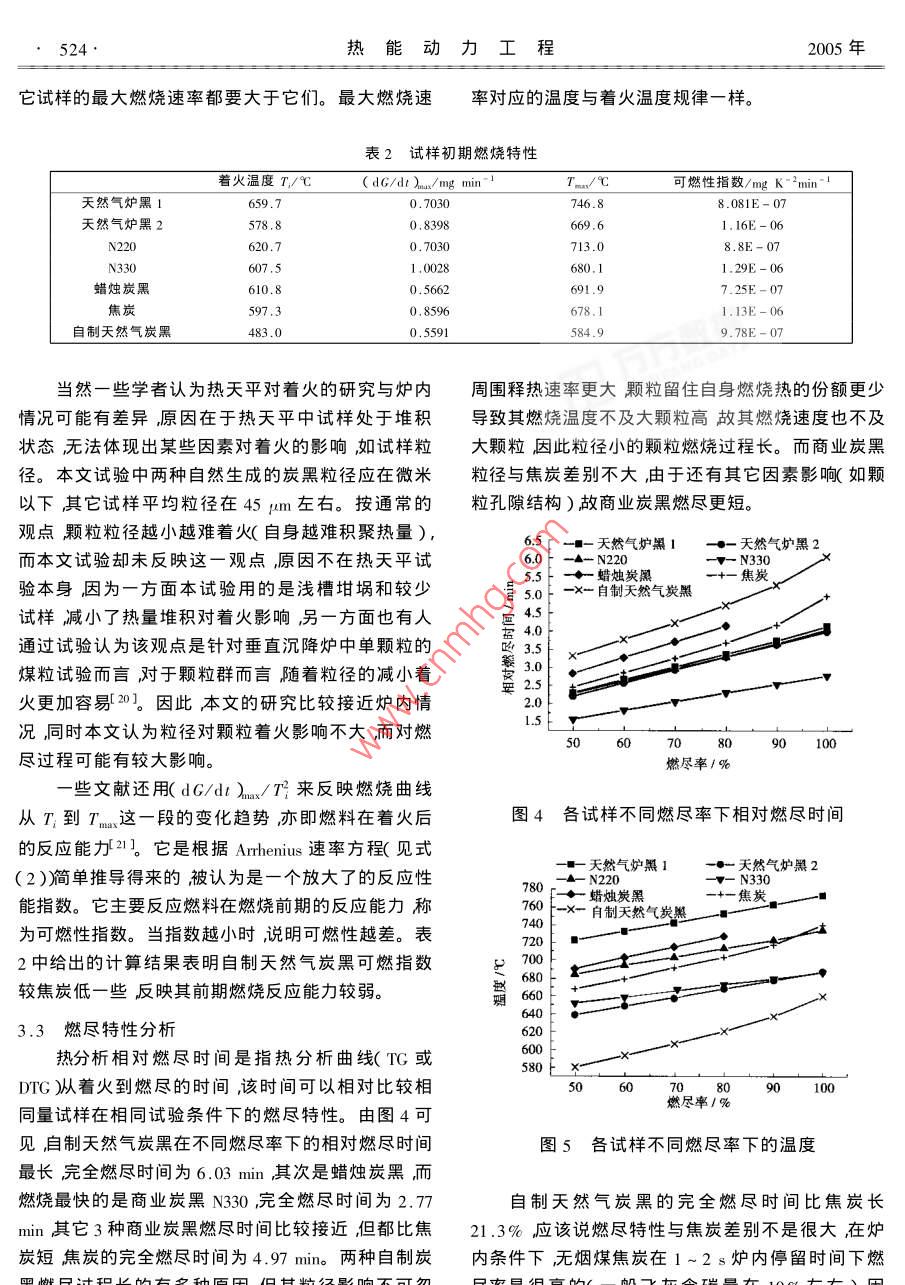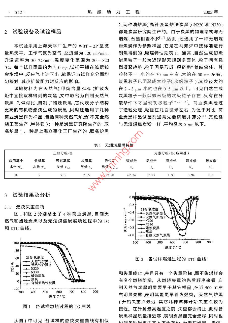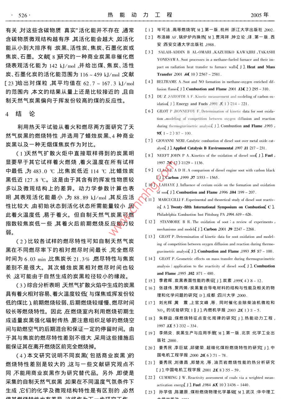 第20卷第5期熱能程Vol 20 No 52005年9月JOURNAL OF ENGINEERING FOR THERMAL ENERGY AND POWERsep.,2005文章綿號(hào):001-2060200505-0521-06天然氣炭黑燃燒特性的熱天平研究謝廣錄范衛(wèi)東徐賓章明川上海交通大學(xué)機(jī)械與動(dòng)力工程學(xué)院,上海200240)摘要利用熱重分析天平對(duì)天然氣擴(kuò)散火炬中直接取樣得尾氣中炭黑氧化的研究58。在這些研究中如何選到的炭黑的燃燒性能進(jìn)行了研究并選用了蠟燭炭黑、4種擇炭黑試驗(yàn)樣品有兩種觀點(diǎn),一些研究者通過(guò)研究認(rèn)商業(yè)炭黑以及一種無(wú)煙煤焦炭作為對(duì)比。基于試驗(yàn)結(jié)果確為來(lái)自于不同燃料和燃燒狀況下生成的炭黑在微觀定了燃燒動(dòng)力學(xué)特性參數(shù)并分析了它的燃燒特性。天然氣尺寸和組織上是相似的如文獻(xiàn)9對(duì)柴油機(jī)殘留于擴(kuò)散火焰中生成的炭黑具有著火相對(duì)容易、著火溫度較低與煤焦或揮發(fā)份較低的煤比)前期燃燒較弱、后期燃燒較機(jī)內(nèi)潤(rùn)滑油和尾氣中的兩種炭黑與一些商業(yè)爐法或緩慢、燃盡時(shí)間較長(zhǎng)等燃燒特性。這些結(jié)果為利用天然氣燃槽法炭黑的化學(xué)組成、微觀結(jié)構(gòu)特性進(jìn)行了對(duì)比研燒過(guò)程的炭黑生成強(qiáng)化火焰輻射特性并進(jìn)行有效控制提供究結(jié)果表明各種炭黑在化學(xué)組成和表面化學(xué)吸附組了依據(jù)分上是不同的而它們的微觀結(jié)構(gòu)如在炭黑顆粒初關(guān)鍵詞沃天然氣炭黑燃燒特性熱分析;應(yīng)動(dòng)力學(xué)級(jí)結(jié)構(gòu)水平上兩種柴油機(jī)炭黑與商業(yè)炭黑具有高度中圖分類號(hào):TK16文獻(xiàn)標(biāo)識(shí)碼的相似性文獻(xiàn)由此假設(shè)它們有相同的生成過(guò)程,它們的化學(xué)差異在于后期的冷卻環(huán)境。這一點(diǎn)鼓勵(lì)許1前言多研究者在簡(jiǎn)單的實(shí)驗(yàn)室燃燒裝置中自產(chǎn)炭黑作為在通常的燃燒系統(tǒng)中火焰中產(chǎn)生炭黑會(huì)造成燃試驗(yàn)樣品或者使用商業(yè)炭黑作為代用品810-11例燒效率的降低甚至損害工作設(shè)備(如燃?xì)廨啓C(jī))因如文獻(xiàn)8就選用了一種商業(yè)炭黑和一種柴油機(jī)炭此燃料燃燒過(guò)程中往往不希望生成炭黑。但是炭黑黑的燃燒特性在固定床中用程序升溫法進(jìn)行了研究,在火焰中具有極強(qiáng)的熱輻射性利用炭黑這一特性研究表明商業(yè)炭黑和柴油機(jī)炭黑的燃燒速率和動(dòng)力燃燒室內(nèi)部產(chǎn)生炭黑可以促進(jìn)燃燒室內(nèi)部的熱傳導(dǎo)學(xué)特性很相似因此作者認(rèn)為可以用這種商業(yè)炭黑作和熱輻射1。因此在鍋爐燃燒設(shè)備中輻射能力大為模擬的替代品。另一方面一些研究者認(rèn)為不同炭大弱于相同爐膛容量的重油或燃煤火焰的天然氣火黑的組成是復(fù)雜的難以對(duì)比不同文獻(xiàn)的研究結(jié)果焰而言)用發(fā)黑強(qiáng)化火焰輻射特性是很有意義應(yīng)采用實(shí)際裝置條件下的炭黑作為試驗(yàn)樣品。本的即設(shè)法在燃燒初期生成適量的炭黑并能保證生文關(guān)心的是天然氣燃燒過(guò)程中生成的發(fā)黑因此本文采集了天然氣燃燒過(guò)程中產(chǎn)生的炭黑作為試驗(yàn)樣品究者已提出設(shè)計(jì)鍋爐可考慮在燃燒室適當(dāng)位置生成同時(shí)還采集了蠟燭炭黑和選用了不同的商業(yè)炭黑及大量炭黑并保證其離開(kāi)爐膛前燃盡以此強(qiáng)化爐內(nèi)輻煤焦作對(duì)比射傳熱的思路現(xiàn)已開(kāi)展了相應(yīng)的研究3-4對(duì)炭黑燃燒特性的研究可分為高溫>800℃廂和為實(shí)現(xiàn)上述目的炭黑生成及后期氧化必須在一低溫<80℃化后者關(guān)心的是它的動(dòng)力學(xué)反應(yīng)參定技術(shù)措施下得到控制傳統(tǒng)的觀點(diǎn)認(rèn)為炭黑是一種數(shù)、著火行為等采用的實(shí)驗(yàn)系統(tǒng)通常為熱天平或固定難燃物質(zhì)尤其要保證在爐內(nèi)1-2s的停留時(shí)間內(nèi)完反應(yīng)器例如文獻(xiàn)13-14利用熱天平系統(tǒng)很好全氧化掉。因此研究炭黑的燃燒特性(著火、燃盡特地研究了炭黑的燃燒特性并還探討了動(dòng)力學(xué)參數(shù)與性以及動(dòng)力學(xué)參數(shù)等)可為開(kāi)發(fā)該技術(shù)提供依據(jù)。氧化劑在坩堝中擴(kuò)散的關(guān)系。因此本文將利用熱天實(shí)際上對(duì)炭黑催化或非催化燃燒特性的研究在最平系統(tǒng)對(duì)試驗(yàn)樣品的燃燒特性進(jìn)行研究近二十年吸引了許多研究者的興趣尤其是對(duì)柴油機(jī)收稿日期2005-02-22;修訂日期2005-04-26熱能動(dòng)力工程2005年2兩種油爐黑(高補(bǔ)強(qiáng)型爐法炭黑):N220和N330,2試驗(yàn)設(shè)備及試驗(yàn)樣品都是炭黑研究院生產(chǎn)的。由于炭黑的物理結(jié)構(gòu)與無(wú)煙煤、石墨相差不多,因此還選用了一種無(wú)煙煤本試驗(yàn)采用上海天平廠生產(chǎn)的WRT-2P型微粉焦炭作為參照樣品,它是在馬弗爐中按標(biāo)準(zhǔn)進(jìn)行量熱天平。工作氣氛為空氣總流量為120ml/min,制焦得到的原煤特性見(jiàn)表1。通常自然生成初級(jí)升溫速率為30℃/min,溫度變化范圍為20~820炭黑粒子一般為近球形無(wú)規(guī)則多面體粒子間有強(qiáng)℃。毎個(gè)試樣重量約為5.0mg,試樣平鋪在淺槽鉑烈凝聚趨勢(shì)粒子間