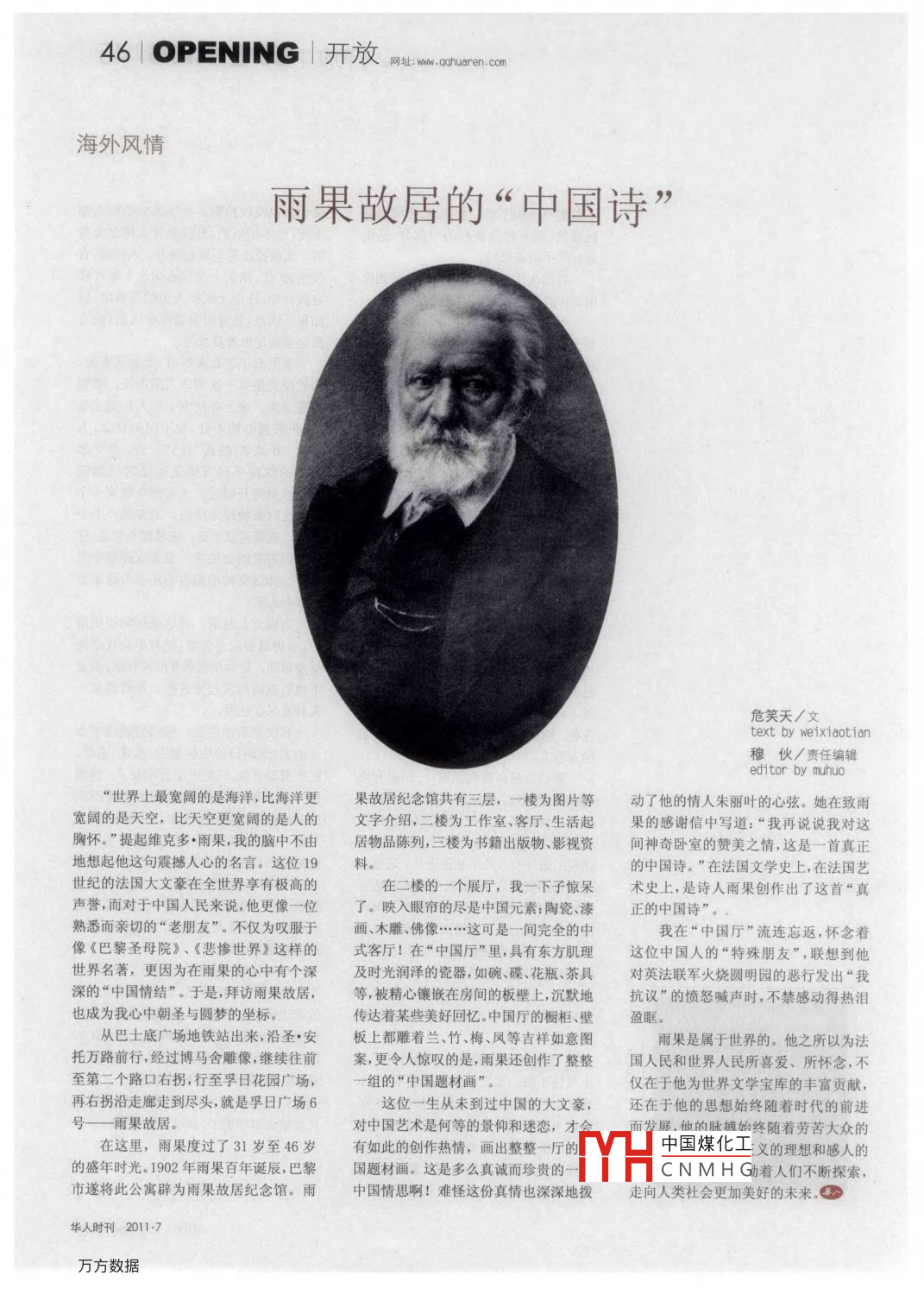 46 OPENING開放海外風情雨果故居的“中國詩危笑天/文穆伙/責任編輯editor by muhuo“世界上最寬闊的是海洋,比海洋更果故居紀念館共有三層,一樓為圖片等動了他的情人朱麗葉的心弦。她在致雨寬闊的是天空,比天空更寬闊的是人的文字介紹,二樓為工作室、客廳、生活起果的感謝信中寫道:“我再說說我對這胸懷?!碧崞鹁S克多·雨果,我的腦中不由居物品陳列,三樓為書籍出版物、影視資間神奇臥室的贊美之情,這是一首真正地想起他這句震撼人心的名言。這位19料。的中國詩?!痹诜▏膶W(xué)史上,在法國藝世紀的法國大文豪在全世界享有極高的在二樓的一個展廳,我一下子驚呆術(shù)史上,是詩人雨果創(chuàng)作出了這首“真聲譽,而對于中國人民來說,他更像一位了。映入眼簾的盡是中國元素:陶瓷、漆正的中國詩”。熟悉而親切的“老朋友”。不僅為嘆服于畫、木雕、佛像……這可是一間完全的中我在“中國廳”流連忘返,懷念著像《巴黎圣母院》、《悲慘世界》這樣的式客廳!在“中國廳”里,具有東方肌理這位中國人的“特殊朋友”,聯(lián)想到他世界名著,更因為在雨果的心中有個深及時光潤澤的瓷器,如碗、碟、花瓶、茶具對英法聯(lián)軍火燒圓明園的惡行發(fā)出“我深的“中國情結(jié)”。于是,拜訪雨果故居,等,被精心鑲嵌在房間的板壁上,沉默地抗議”的憤怒喊聲時,不禁感動得熱淚也成為我心中朝圣與圓夢的坐標。傳達著某些美好回憶。中國廳的櫥柜、壁盈眶。從巴士底廣場地鐵站出來沿圣·安板上都雕著蘭、竹、梅、風等吉祥如意圖雨果是屬于世界的。他之所以為法托萬路前行,經(jīng)過博馬舍雕像,繼續(xù)往前案,更令人驚嘆的是,雨果還創(chuàng)作了整整國人民和世界人民所喜愛、所懷念,不至第二個路口右拐,行至孚日花園廣場,組的“中國題材畫”。僅在于他為世界文學(xué)寶庫的豐富貢獻,再右拐沿走廊走到盡頭,就是孚日廣場6這位一生從未到過中國的大文豪還在于他的思想始終隨著時代的前進號—雨果故居。對中國藝術(shù)是何等的景仰和迷戀,才,他的脈捕始終隨著勞苦大眾的在這里,雨果度過了31歲至46歲有如此的創(chuàng)作熱情,畫出整整一廳的中國煤化工義的理想和感人的的盛年時光。1902年雨果百年誕辰,巴黎國題材畫。這是多么真誠而珍貴的CNMH動著人們不斷探索市遂將此公寓辟為雨果故居紀念館。雨中國情思啊!難怪這份真情也深深地撥走向人類社會更加美好的未來O華人時刊20117