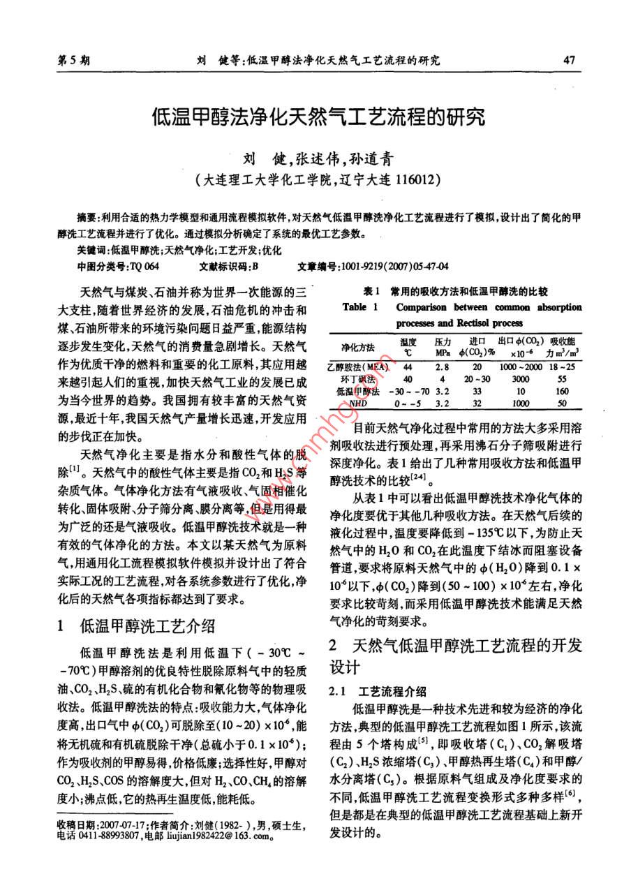 第5期劉健等:低溫甲醇法凈化天然氣工藝流程的研究低溫甲醇法凈化天然氣工藝流程的研究劉健,張述偉,孫道青(大連理工大學化工學院,遼寧大連116012摘要:利用合適的熱力學模型和通用流程模擬軟件,對天然氣低溫甲醇洗凈化工藝流程進行了模擬,設計出了簡化的甲醇洗工藝流程并進行了優(yōu)化。通過模擬分析確定了系統(tǒng)的最優(yōu)工藝參數關鍵詞:低溫甲醇洗;天然氣凈化;工藝開發(fā);優(yōu)化中圖分類號:TQ064文獻標識碼:B文章編號:1001-9219(2007)054704天然氣與煤炭、石油并稱為世界一次能源的三表1常用的吸收方法和低溫甲醇洗的比較大支柱隨著世界經濟的發(fā)展,石油危機的沖擊和 Table 1 Comparison between common absorption煤、石油所帶來的環(huán)境污染問題日益嚴重能源結構processes and Rectisol process逐步發(fā)生變化,天然氣的消費量急劇增長。天然氣凈化方法溫度壓力進口出口(CO2)吸收能x106力m3/m3作為優(yōu)質干凈的燃料和重要的化工原料,其應用越乙醇胺法(MEA)42.8201002018-25-來越引起人們的重視加快天然氣工業(yè)的發(fā)展已成為當今世界的趨勢。我國擁有較豐富的天然氣資低溫甲醇法-30--703.233NHD0--53.232源最近十年,我國天然氣產量增長迅速,開發(fā)應用的步伐正在加快。目前天然氣凈化過程中常用的方法大多采用溶天然氣凈化主要是指水分和酸性氣體的脫劑吸收法進行預處理再采用沸石分子篩吸附進行除。天然氣中的酸性氣體主要是指CO2和H2S等深度凈化。表1給出了幾種常用吸收方法和低溫甲醇洗技術的比較2。雜質氣體。氣體凈化方法有氣液吸收、氣固相催化從表1中可以看出低溫甲醇洗技術凈化氣體的轉化固體吸附、分子師分離膜分離等,但是用得最凈化度要優(yōu)于其他幾種吸收方法。在天然氣后續(xù)的為廣泛的還是氣液吸收。低溫甲醇洗技術就是一種液化過程中,溫度要降低到-135℃以下為防止天有效的氣體凈化的方法。本文以某天然氣為原料然氣中的H2O和CO2在此溫度下結冰而阻塞設備氣用通用化工流程模擬軟件模擬并設計出了符合管道,要求將原料天然氣中的ψ(H2O)降到0.1x實際工況的工藝流程對各系統(tǒng)參數進行了優(yōu)化凈10◆以下,d(CO2)降到(50-100)×10左右凈化化后的天然氣各項指標都達到了要求。要求比較苛刻,而采用低溫甲醇洗技術能滿足天然1低溫甲醇洗工藝介紹氣凈化的苛刻要求。低溫甲醇洗法是利用低溫下(-30℃~2天然氣低溫甲醇洗工藝流程的開發(fā)-70℃)甲醇溶劑的優(yōu)良特性脫除原料氣中的輕質設計油、CO2H2S硫的有機化合物和氰化物等的物理吸2.1工藝流程介紹收法。低溫甲醇洗法的特點:吸收能力大,氣體凈化低溫甲醇洗是一種技術先進和較為經濟的凈化度高出口氣中(CO2)可脫除至(10-20)×106,能方法,典型的低溫甲醇洗工藝流程如圖1所示該流將無機硫和有機硫脫除干凈(總硫小于0.1×10);程由5個塔構成,即吸收塔(C1)、CO2解吸塔作為吸收劑的甲醇易得,價格低廉;選擇性好,甲醇對(C2)、H2S濃縮塔(C3)、甲醇熱再生塔(C)和甲醇CO2H2SCOS的溶解度大但對H2、CO、CH的溶解水分離塔(C3)。根據原料氣組成及凈化度要求的度小;沸點低它的熱再生溫度低能耗低。不同低溫甲醇洗工藝流程變換形式多種多樣間但是都是在典型的低溫甲醇洗工藝流程基礎上新開電81:3減:181:預土生,發(fā)設計的。天然氣化工2007年第32卷METHANOI圖1典型的低溫甲醇洗工藝流程圖1 Flow digram ot typical Rectisol process根據某天然氣的實際工況條件(見表2),對典4℃后進入Ⅴ3罐閃蒸閃蒸出的氣體送出界區(qū)進型的“五塔”工藝流程進行了簡化燃料系統(tǒng),罐底的甲醇液返回V2,用以回收甲醇。(1)由于粗天然氣中不含硫化氫,可省去吸收貧甲醇從C2塔底出來后經換熱降溫后送到吸收塔塔的脫硫段,同時省去H2S濃縮塔C3。頂。系統(tǒng)中多臺的換熱器組成的換熱網絡用以回收(2)由于粗天然氣中不含水,可省去甲醇水分冷量并保證必要的工藝條件1離塔C5(3)由于粗天然氣中不含硫,CO2含量較低,可燃料系統(tǒng)尾氣凈化氣以用閃蒸罐來代替CO2解吸塔C2。為了能更好地通過以上分析最終得出符合該實際工況的筒t2解吸出氣體中的CO2氣體本流程采用兩級閃蒸?;募状枷磧艋に嚵鞒?只保留了典型甲醇洗流程的吸收塔C1和甲醇熱再生塔C4,新的簡化的工藝流程見圖2。天然氣進入吸收塔(C1)塔底,塔頂部用-55℃的貧甲醇洗滌原料氣中的CO2,從C1塔塔頂采出的氣C一吸收塔;Ⅴ1—一級閃蒸罐;V2一二級閃燕;C2一甲醇熱再生塔體為凈化氣其中d(CO2)<20x10°。從吸收塔底圖2設計出的天然氣凈化低溫甲醇洗工藝流程圖出來的含有CO2的甲醇液減壓至18MPa并換熱后rg2 low diagram of designed Rectisol process for進入V1罐,閃蒸出溶解的CH4及少量CO2等氣體,natural gas purification經增壓并降溫后與進料天然氣匯合,以回收CH4從V罐出來的甲醇液再次減壓至0.MPa后送入22吸收塔G的模擬與優(yōu)化第二級壓力的2罐閃蒸出溶解在甲醇中的CH4和在吸收甲醇溫度和吸收塔的理論板數一定時,C2等氣體。氣相是含有CO2的甲烷氣,這部分氣影響天然氣凈化效果的關鍵因素是吸收塔的循環(huán)甲體經加壓后與V,罐閃蒸出的氣體匯合返回進料天醇量。然氣管線通過此方法,可以保證進料天然氣中的甲從圖3可知洗滌甲醇用量越多,則凈化氣中的烷回收率達到995%以上。從V2罐底部出來的液CQ2含量越低,但是當循環(huán)甲醇用量達到