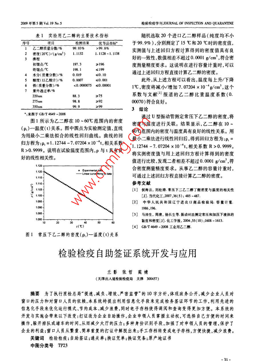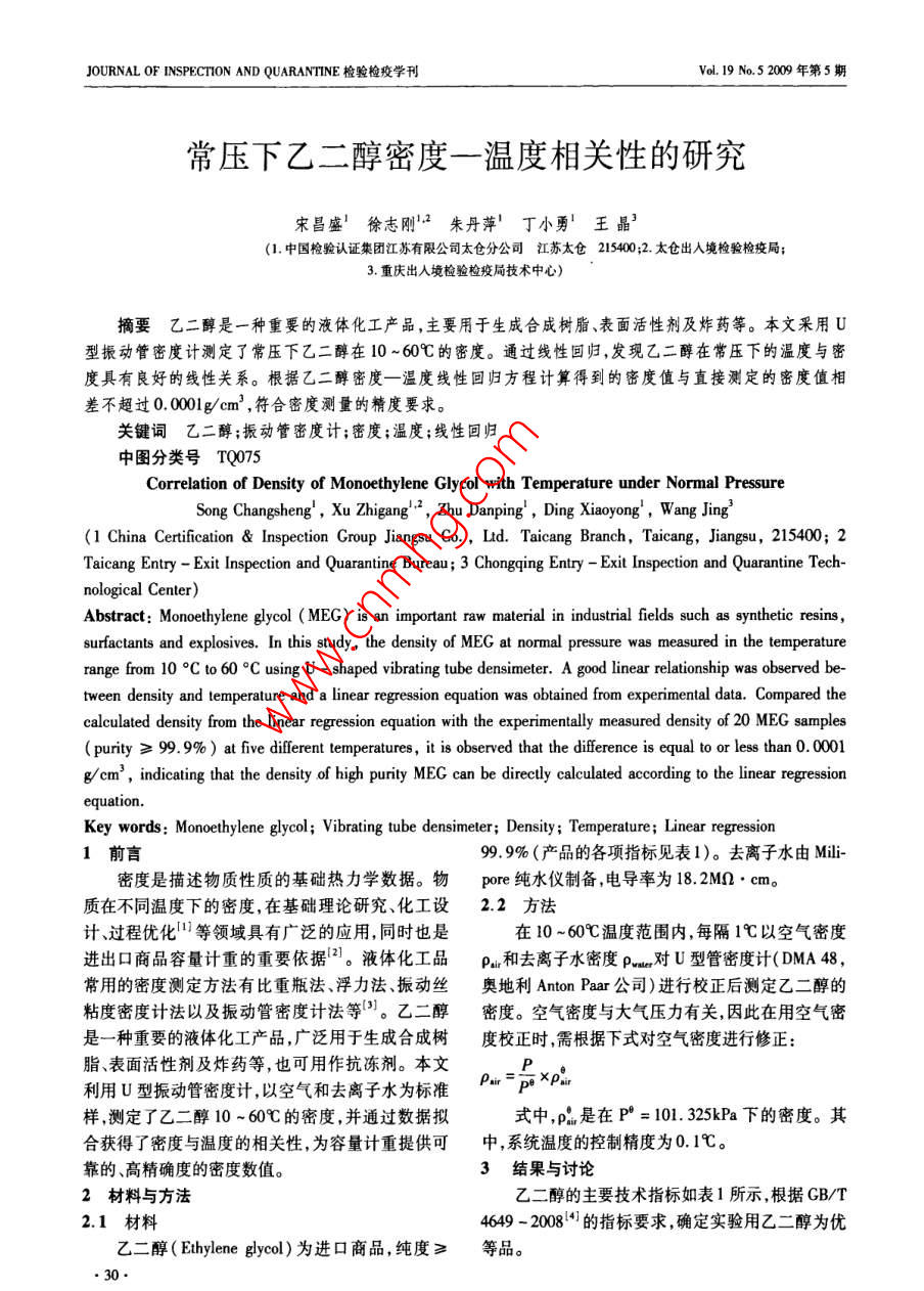 JOURNAL OF INSPECTION AND QUARANTINE檢驗(yàn)檢疫學(xué)刊vl.19No.52009年第5期常壓下乙二醇密度一溫度相關(guān)性的研究宋昌盛!徐志剛2朱丹萍'丁小勇王晶(1.中國(guó)檢驗(yàn)認(rèn)證集團(tuán)江蘇有限公司太倉分公司江蘇太倉215400;2.太倉出入境檢驗(yàn)檢疫局;3.重慶出入境檢驗(yàn)檢疫局技術(shù)中心)摘要乙二醇是一種重要的液體化工產(chǎn)品,主要用于生成合成樹脂、表面活性劑及炸藥等。本文采用U型振動(dòng)管密度計(jì)測(cè)定了常壓下乙二醇在10~60℃的密度。通過線性回歸,發(fā)現(xiàn)乙二醇在常壓下的溫度與密度具有良好的線性關(guān)系。根據(jù)乙二醇密度一溫度線性回歸方程計(jì)算得到的密度值與直接測(cè)定的密度值相差不超過0.001ycm3,符合密度測(cè)量的精度要求。關(guān)鍵詞乙二醇;振動(dòng)管密度計(jì);密度;溫度;線性回歸中圖分類號(hào)TQ075Correlation of Density of Monoethylene Glycol with Temperature under Normal PressureSong Changsheng, Xu Zhigang", Zhu Danping, Ding Xiaoyong, Wang Jing(1 China Certification Inspection Group Jiangsu Co, Ltd. Taicang Branch, Taicang, Jiangsu, 215400; 2Taicang Entry-Exit Inspection and Quarantine Bureau; 3 Chongqing Entry-Exit Inspection and Quarantine TechAbstract: Monoethylene glycol MEG)is an important raw material in industrial fields such as synthetic resinssurfactants and explosives. In this study, the density of MEG at normal pressure was measured in the temperaturerange from 10C to 60C using U-shaped vibrating tube densimeter. A good linear relationship was observed be-tween density and temperature and a linear regression equation was obtained from experimental data. Compared thecalculated density from the linear regression equation with the experimentally measured density of 20 MEG samplespurity >99.9%)at five different temperatures, it is observed that the difference is equal to or less than 0 0001g/cm, indicating that the density of high purity MEG can be directly calculated according to the linear regressionequationKey words Monoethylene glycol; Vibrating tube densimeter; Density; Temperature; Linear regression1前言99.9%(產(chǎn)品的各項(xiàng)指標(biāo)見表1)。去離子水由Mili密度是描述物質(zhì)性質(zhì)的基礎(chǔ)熱力學(xué)數(shù)據(jù)。物pore純水儀制備,電導(dǎo)率為182Mn·cm。質(zhì)在不同溫度下的密度,在基礎(chǔ)理論研究、化工設(shè)2.2方法計(jì)、過程優(yōu)化等領(lǐng)域具有廣泛的應(yīng)用,同時(shí)也是在10~60℃溫度范圍內(nèi),每隔1℃以空氣密度進(jìn)出口商品容量計(jì)重的重要依據(jù)。液體化工品p和去離子水密度p對(duì)U型管密度計(jì)(DMA48,常用的密度測(cè)定方法有比重瓶法、浮力法振動(dòng)絲奧地利 Anton Paar公司)進(jìn)行校正后測(cè)定乙二醇的粘度密度計(jì)法以及振動(dòng)管密度計(jì)法等。乙二醇密度。空氣密度與大氣壓力有關(guān),因此在用空氣密是一種重要的液體化工產(chǎn)品,廣泛用于生成合成樹度校正時(shí)需根據(jù)下式對(duì)空氣密度進(jìn)行修正:脂、表面活性劑及炸藥等,也可用作抗凍劑。本文利用U型振動(dòng)管密度計(jì),以空氣和去離子水為標(biāo)準(zhǔn)uPxp樣測(cè)定了乙二醇10~60℃的密度,并通過數(shù)據(jù)擬式中,p是在P=101.325kPa下的密度。其合獲得了密度與溫度的相關(guān)性,為容量計(jì)重提供可中,系統(tǒng)溫度的控制精度為01℃靠的、高精確度的密度數(shù)值。3結(jié)果與討論2材料與方法乙二醇的主要技術(shù)指標(biāo)如表1所示,根據(jù)GB/T2.1材料4649-20081的指標(biāo)要求確定實(shí)驗(yàn)用乙二醇為優(yōu)乙二醇( Ethylene glycol)為進(jìn)口商品,純度≥等品009年第5期vol9N5檢驗(yàn)檢疫學(xué)刊 JOURNAL OF INSPECTION AND QUARANTINE表1實(shí)驗(yàn)用乙二醇的主要技術(shù)指標(biāo)隨機(jī)選取20個(gè)進(jìn)口乙二醇樣品(純度均不小月檢測(cè)結(jié)果優(yōu)等品指于99.9%),分別測(cè)定了15℃和20℃時(shí)的密度值,1乙二醇質(zhì)量分?jǐn)?shù)/%99.93%>99.8%2密度(20℃)/(g/cm3)1.132l.II28-1.1138實(shí)測(cè)值與上述回歸方程計(jì)算得到的密度值具有良3沸程好的一致性數(shù)值相差不超過0000g/cm3,符合密初餾點(diǎn)/℃≥196度測(cè)量精度要求。這說明在進(jìn)行容量計(jì)重時(shí),可以終餾點(diǎn)℃水分(質(zhì)量分?jǐn)?shù))%0.019通過上述回歸方程直接計(jì)算乙二醇的密度。5酸度(以乙酸計(jì))%0≤0.001此外,從上述方程可以看出,溫度每上升/下降6鐵(質(zhì)量分?jǐn)?shù))/%<0.0000075≤0.000017紫外透過率/%1℃,密度將減小增加7.07204×10-g/cm3,這個(gè)88.3≥75系數(shù)與文獻(xiàn)報(bào)道的乙二醇比重溫度系數(shù)(00070)符合良好。3結(jié)論來源于GB/T4649-2008通過U型振動(dòng)管測(cè)定常壓下乙二醇的密度將圖1所示為乙二醇在10~60℃范圍內(nèi)的密度密度與溫度進(jìn)行關(guān)聯(lián)。結(jié)果顯示,乙二醇在10(p)一溫度(t)關(guān)系。圖中圓點(diǎn)為實(shí)驗(yàn)測(cè)定值,直線60℃范圍內(nèi)的密度與溫度具有良好的線性關(guān)系。用為用最小二乘法擬合的線性回歸曲線。曲線的回最小二乘法進(jìn)行線性回歸后,得到回歸方程為:p1=歸方程為:p1=1.12744-7.07204×10‘t,相關(guān)系數(shù)R>0999說明在試驗(yàn)溫度范圍內(nèi),p與具有良1.1274-7.07204×10t,相關(guān)系數(shù)R>0.999好的線性相關(guān)性。將實(shí)測(cè)密度值與用上述回歸方程計(jì)算得到的密度值進(jìn)行比較發(f