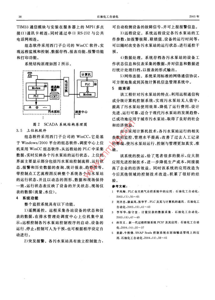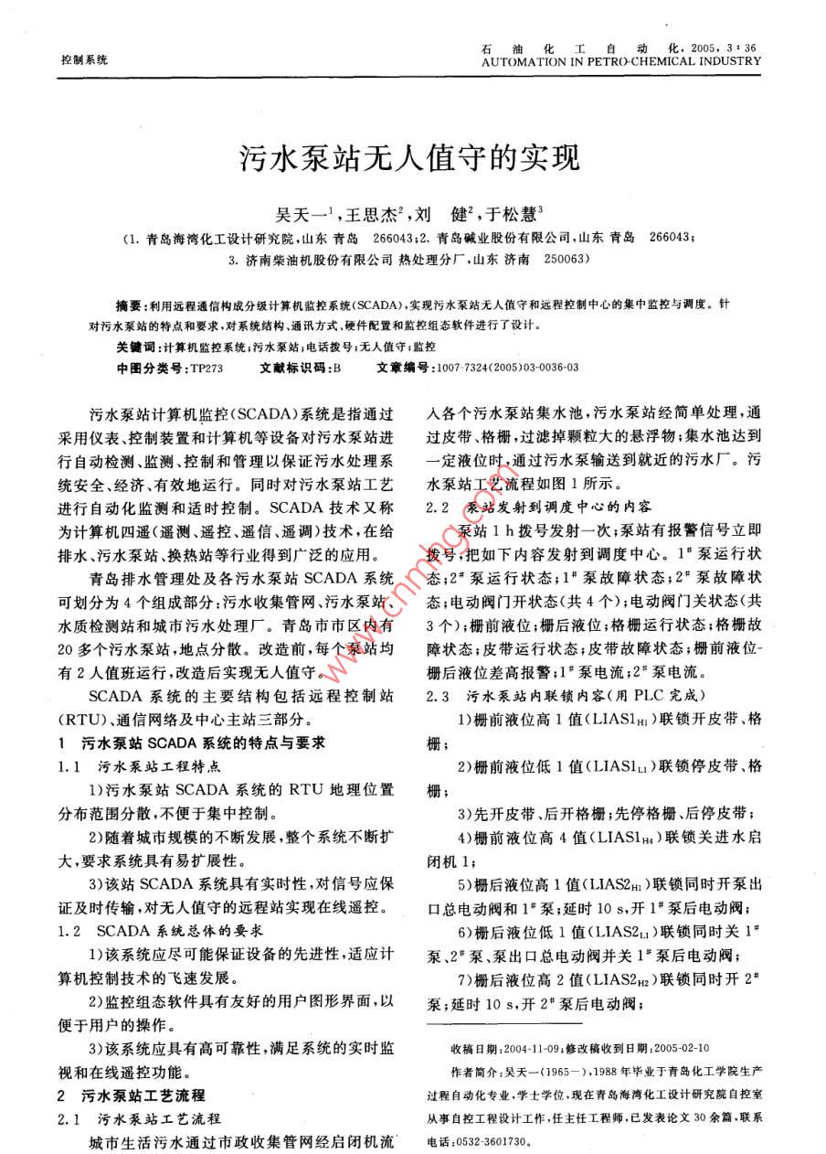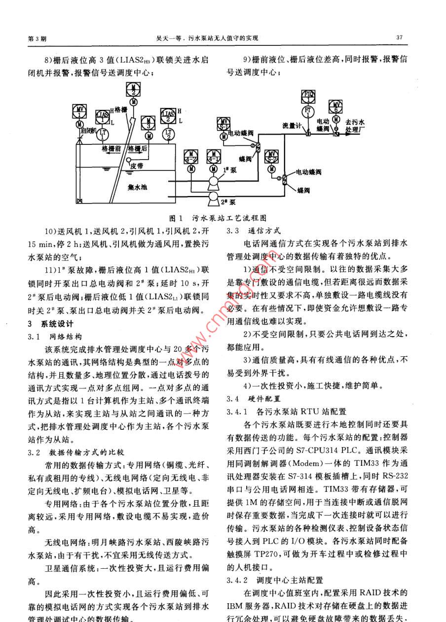 工自動(dòng)化,2005,3:36控制系統(tǒng)AUTOMATION IN PETRO-CHEMICAL INDUSTRY污水泵站無(wú)人值守的實(shí)現(xiàn)吳天一1,王思杰2,劉健2,于松慧(1.青島海灣化工設(shè)計(jì)研究院山東青島26043;2.青島堿業(yè)股份有限公司山東青島2660433.濟(jì)南柴油機(jī)股份有限公司熱處理分廠,山東濟(jì)南250063)摘要:利用遠(yuǎn)程通信構(gòu)成分級(jí)計(jì)算機(jī)監(jiān)控系統(tǒng)( SCADA),實(shí)現(xiàn)污水泵站無(wú)人值守和遠(yuǎn)程控制中心的集中監(jiān)控與調(diào)度,針對(duì)污水泵站的特點(diǎn)和要求,對(duì)系統(tǒng)結(jié)構(gòu)、通訊方式硬件配置和監(jiān)控組態(tài)軟件進(jìn)行了設(shè)計(jì)關(guān)鍵詞:計(jì)算機(jī)監(jiān)控系統(tǒng);污水泵站;電話撥號(hào);無(wú)人值守;監(jiān)控中圖分類號(hào):TP273文獻(xiàn)標(biāo)識(shí)碼:B文章編號(hào):1007-7324(2005)030036-03污水泵站計(jì)算機(jī)監(jiān)控( SCADA)系統(tǒng)是指通過(guò)入各個(gè)污水泵站集水池,污水泵站經(jīng)簡(jiǎn)單處理,通采用儀表、控制裝置和計(jì)算機(jī)等設(shè)備對(duì)污水泵站進(jìn)過(guò)皮帶格柵過(guò)濾掉顆粒大的懸浮物;集水池達(dá)到行自動(dòng)檢測(cè)、監(jiān)測(cè)、控制和管理以保證污水處理系定液位時(shí),通過(guò)污水泵輸送到就近的污水廠。污統(tǒng)安全經(jīng)濟(jì)、有效地運(yùn)行。同時(shí)對(duì)污水泵站工藝水泵站工藝流程如圖1所示。進(jìn)行自動(dòng)化監(jiān)測(cè)和適時(shí)控制。 SCADA技術(shù)又稱2.2泵站發(fā)射到調(diào)度中心的內(nèi)容為計(jì)算機(jī)四遙(遙測(cè)、遙控、遙信、遙調(diào))技術(shù),在給泵站1h撥號(hào)發(fā)射一次;泵站有報(bào)警信號(hào)立即排水、污水泵站、換熱站等行業(yè)得到廣泛的應(yīng)用撥號(hào),把如下內(nèi)容發(fā)射到調(diào)度中心。1“泵運(yùn)行狀青島排水管理處及各污水泵站 SCADA系統(tǒng)態(tài);2泵運(yùn)行狀態(tài);1#泵故障狀態(tài);2·泵故障狀可劃分為4個(gè)組成部分:污水收集管網(wǎng)、污水泵站、態(tài);電動(dòng)閥門開狀態(tài)(共4個(gè));電動(dòng)閥門關(guān)狀態(tài)(共水質(zhì)檢測(cè)站和城市污水處理廠。青島市市區(qū)內(nèi)有3個(gè));柵前液位;柵后液位;格柵運(yùn)行狀態(tài);格柵故20多個(gè)污水泵站,地點(diǎn)分散。改造前,每個(gè)泵站均障狀態(tài);皮帶運(yùn)行狀態(tài);皮帶故障狀態(tài);柵前液位有2人值班運(yùn)行,改造后實(shí)現(xiàn)無(wú)人值守。柵后液位差高報(bào)警;1*泵電流;2泵電流。SCADA系統(tǒng)的主要結(jié)構(gòu)包括遠(yuǎn)程控制站2.3污水泵站內(nèi)聯(lián)鎖內(nèi)容(用PLC完成)(RTU)、通信網(wǎng)絡(luò)及中心主站三部分1)柵前液位高1值(LIAS1H)聯(lián)鎖開皮帶、格1污水泵站 SCADA系統(tǒng)的特點(diǎn)與要求柵1.1污水泵站工程特點(diǎn)2)柵前液位低1值( LIASILI)聯(lián)鎖停皮帶、格1)污水泵站 SCADA系統(tǒng)的RTU地理位置柵;分布范圍分散,不便于集中控制。3)先開皮帶、后開格柵;先停格柵、后停皮帶;2)隨著城市規(guī)模的不斷發(fā)展,整個(gè)系統(tǒng)不斷擴(kuò)4)柵前液位高4值(LIAS1H)聯(lián)鎖關(guān)進(jìn)水啟大,要求系統(tǒng)具有易擴(kuò)展性。閉機(jī)13)該站 SCADA系統(tǒng)具有實(shí)時(shí)性,對(duì)信號(hào)應(yīng)保5)柵后液位高1值(LIAS2H)聯(lián)鎖同時(shí)開泵出證及時(shí)傳輸,對(duì)無(wú)人值守的遠(yuǎn)程站實(shí)現(xiàn)在線遙控??诳傠妱?dòng)閥和1“泵;延時(shí)10s,開1泵后電動(dòng)閥;1.2 SCADA系統(tǒng)總體的要求6)柵后液位低1值(LIAS2u1)聯(lián)鎖同時(shí)關(guān)11)該系統(tǒng)應(yīng)盡可能保證設(shè)備的先進(jìn)性,適應(yīng)計(jì)泵、2泵、泵出口總電動(dòng)閥并關(guān)1“泵后電動(dòng)閥;算機(jī)控制技術(shù)的飛速發(fā)展。7)柵后液位高2值(LIAS2m)聯(lián)鎖同時(shí)開22)監(jiān)控組態(tài)軟件具有友好的用戶圖形界面,以泵;延時(shí)10s,開2"泵后電動(dòng)閥;便于用戶的操作。3)該系統(tǒng)應(yīng)具有高可靠性,滿足系統(tǒng)的實(shí)時(shí)監(jiān)收稿日期:2004-1109;修改稿收到日期:20050210視和在線遙控功能作者簡(jiǎn)介:吳天一(1965-),1988年畢業(yè)于青島化工學(xué)院生產(chǎn)2污水泵站工藝流程過(guò)程自動(dòng)化專業(yè),學(xué)士學(xué)位,現(xiàn)在青島海灣化工設(shè)計(jì)研究院自控室2.1污水泵站工藝流程從事自控工程設(shè)計(jì)工作,任主任工程師已發(fā)表論文30余篇聯(lián)系城市生活污水通過(guò)市政收集管網(wǎng)經(jīng)啟閉機(jī)流電話:05323601730第3期吳天一等,污水泵站無(wú)人值守的實(shí)現(xiàn)8)柵后液位高3值(LIAS2H)聯(lián)鎖關(guān)進(jìn)水啟9)柵前液位、柵后液位差高,同時(shí)報(bào)警,報(bào)警信閉機(jī)并報(bào)警,報(bào)警信號(hào)送調(diào)度中心;號(hào)送調(diào)度中心;流量計(jì)、|電動(dòng)去污水電動(dòng)蝶閥理廠格搔前/格皮帶Q@譚泵電動(dòng)螓閥集水池2*泵圖1污水泵站工藝流程圖10)送風(fēng)機(jī)1,送風(fēng)機(jī)2,引風(fēng)機(jī)1,引風(fēng)機(jī)2,開3.3通信方式15min,停2h;送風(fēng)機(jī)、引風(fēng)機(jī)做為通風(fēng)用,置換污電話網(wǎng)通信方式在實(shí)現(xiàn)各個(gè)污水泵站到排水水泵站的空氣;管理處調(diào)度