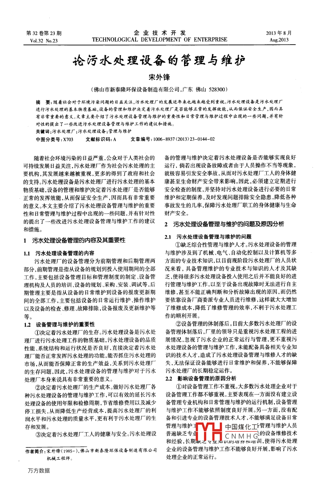 第32卷第23期.企業(yè)技術(shù)開發(fā)2013年8月Vol.32 No.23TECHNOLOGICAL DEVELOPMENT OF ENTERPRISEAug2013論污水處理設(shè)備的管理與維護(hù)宋外鋒(佛山市新泰隆環(huán)保設(shè)備制造有限公司,廣東佛山528300)摘要:隨著社會(huì)對(duì)于環(huán)境污 染問題的日益關(guān)注,污水處理廠的發(fā)展近年來也越來越受到重視。污水處理設(shè)備是污水處理廠進(jìn)行污水處理的基本物質(zhì)基礎(chǔ),設(shè)備的管理和維護(hù)決定著污水處理廠是否能夠正常的發(fā)揮效能,從而保證安全生產(chǎn),因而具有非常重要的意義。文章主要介紹了污水處理設(shè)備管理與維護(hù)的重要性和日常管理與維護(hù)過程中出現(xiàn)的一些問題,并有針對(duì)性的提出了一些改進(jìn)污水處理設(shè)備管理與維護(hù)工作的建議和措施。關(guān)鍵詞:污水處理廠;污水處理設(shè)備;管理與維護(hù)中圖分類號(hào):X703文獻(xiàn)標(biāo)識(shí)碼:A文章編號(hào): 1006-8937 (2013)23- -0144-02隨著社會(huì)環(huán)境污染的8益嚴(yán)重,公眾對(duì)于人類社會(huì)的備 的管理與維護(hù)決定著污水處理設(shè)備是否能夠?qū)崿F(xiàn)良好可持續(xù)發(fā)展日益關(guān)注.污水處理廠作為社會(huì)污水處理的主運(yùn)行, 倘若出現(xiàn)設(shè)備故障或者由于人員操作不當(dāng)?shù)痊F(xiàn)象,要機(jī)構(gòu),其發(fā)展越來越被重視,更多的得到了政府和社會(huì)就極 容易引發(fā)安全事故,從而對(duì)污水處理廠工人的身體健的支持。污水處理設(shè)備是污水處理廠進(jìn)行污水處理的基本康甚 至生命財(cái)產(chǎn)安全帶來影響。因此,必須建立定期進(jìn)行物質(zhì)基礎(chǔ),設(shè)備的管理和維護(hù)決定著污水處理廠是否能夠安 全檢查的制度,并堅(jiān)持對(duì)污水處理設(shè)備進(jìn)行必要的日常正常的發(fā)揮效能,從而保證安全生產(chǎn),因而具有非常重要維護(hù)和定 期保養(yǎng),及時(shí)發(fā)現(xiàn)問題排除安全隱患,降低各種的意義。本文主要介紹了污水處理設(shè)備管理與維護(hù)的重要事故發(fā)生的 幾率,保障污水處理廠職工的身體健康與生命性和8常管理與維護(hù)過程中出現(xiàn)的一些問題,并有針對(duì)性財(cái)產(chǎn)安全。的提出了一些改進(jìn)污水處理設(shè)備管理與維護(hù)工作的建議2污水處理設(shè)備 管理與維護(hù)的問題及原因分析和措施。2.1污水處理設(shè) 備管理與維護(hù)的問題1污水處理設(shè)備管理的內(nèi)容及其重要性①缺乏綜合性管理與維護(hù)人才。污水處理設(shè)備的管理1.1 污水處理設(shè)備 管理的內(nèi)容與維護(hù)涉及到了機(jī)械、電氣、自動(dòng)化控制以及計(jì)算機(jī)等多污水處理廠的設(shè)備管理分為前期管理和后期管理兩方面的專業(yè)技術(shù)知識(shí).以目前現(xiàn)階段污水處理廠的人員狀部分,前期管理是指從設(shè)備的規(guī)劃到投入使用期間的全部況來看,具備管理維護(hù)的專業(yè)技術(shù)與知識(shí)的人才及其缺工作,主要包括設(shè)備管理目標(biāo)和管理制度的制定、設(shè)備管乏,使得很多污水處理設(shè)備投人使用之后并不能良好的進(jìn)理機(jī)構(gòu)及人員的培訓(xùn)、設(shè)備的規(guī)劃、采購、安裝、調(diào)試等,后行管理與維護(hù)工作,以至于設(shè)備出現(xiàn)故障時(shí)無法進(jìn)行自主期管理主要是指從設(shè)備的日常維護(hù)到設(shè)備的報(bào)廢更新期維修,甚至不能正確判斷和分析故障出現(xiàn)的原因,而仍然間的全部工作,主要包括設(shè)備的日常運(yùn)行維護(hù)操作維護(hù)要依靠設(shè)備廠商委派專業(yè)人員進(jìn)行維修,這樣就大大增加以及設(shè)備的檢查、修理、故障排除,設(shè)備報(bào)廢及更新維護(hù)等了維修成本,降低了維修管理的效率,不利于污水處理工等作的順利開展。1.2 設(shè)備管理 與維護(hù)的重要性②設(shè)備管理的體制落后。目前大多數(shù)污水處理廠的設(shè)①?zèng)Q定著污水處理廠的生存。污水處理設(shè)備是污水處備管理體制落后,廠里的領(lǐng)導(dǎo)只是重視污水處理工程的進(jìn)理廠進(jìn)行污水處理工作的物質(zhì)基礎(chǔ),污水處理設(shè)備的品質(zhì)展情況,忽視了污水企業(yè)的正常運(yùn)行與管理,更不重視污性能.系統(tǒng)結(jié)構(gòu)和運(yùn)行狀況是否良好.直接決定著污水處水處理設(shè)備的管理與維護(hù)工作,未能配備具備相關(guān)專業(yè)知理廠能否正常發(fā)揮污水處理的功能,能否抓住污水處理的識(shí)的技術(shù)人才,造成了污水處理設(shè)備管理與維修人才的缺市場(chǎng),從而能否保障正常的生產(chǎn)效益,關(guān)系到污水處理廠失,無法保證設(shè)備能夠進(jìn)行日常維護(hù)和保養(yǎng),不能夠保障的生存問題,因此,污水處理設(shè)備的管理與維護(hù)對(duì)于污水污水處理廠的長(zhǎng)期穩(wěn)定運(yùn)作。處理廠“本身來說具有非常重要的意義。2.2影響設(shè)備管理的原因分析②決定著污水處理廠的生產(chǎn)成本。做好污水處理廠各①對(duì)設(shè)備管理工作不重視。大多數(shù)污水處理企業(yè)對(duì)于種污水處理設(shè)備的管理與維護(hù)工作,可以有效的延長(zhǎng)污水設(shè)備管理工作都不夠重視,主要表現(xiàn)在- -方面沒有建立設(sh