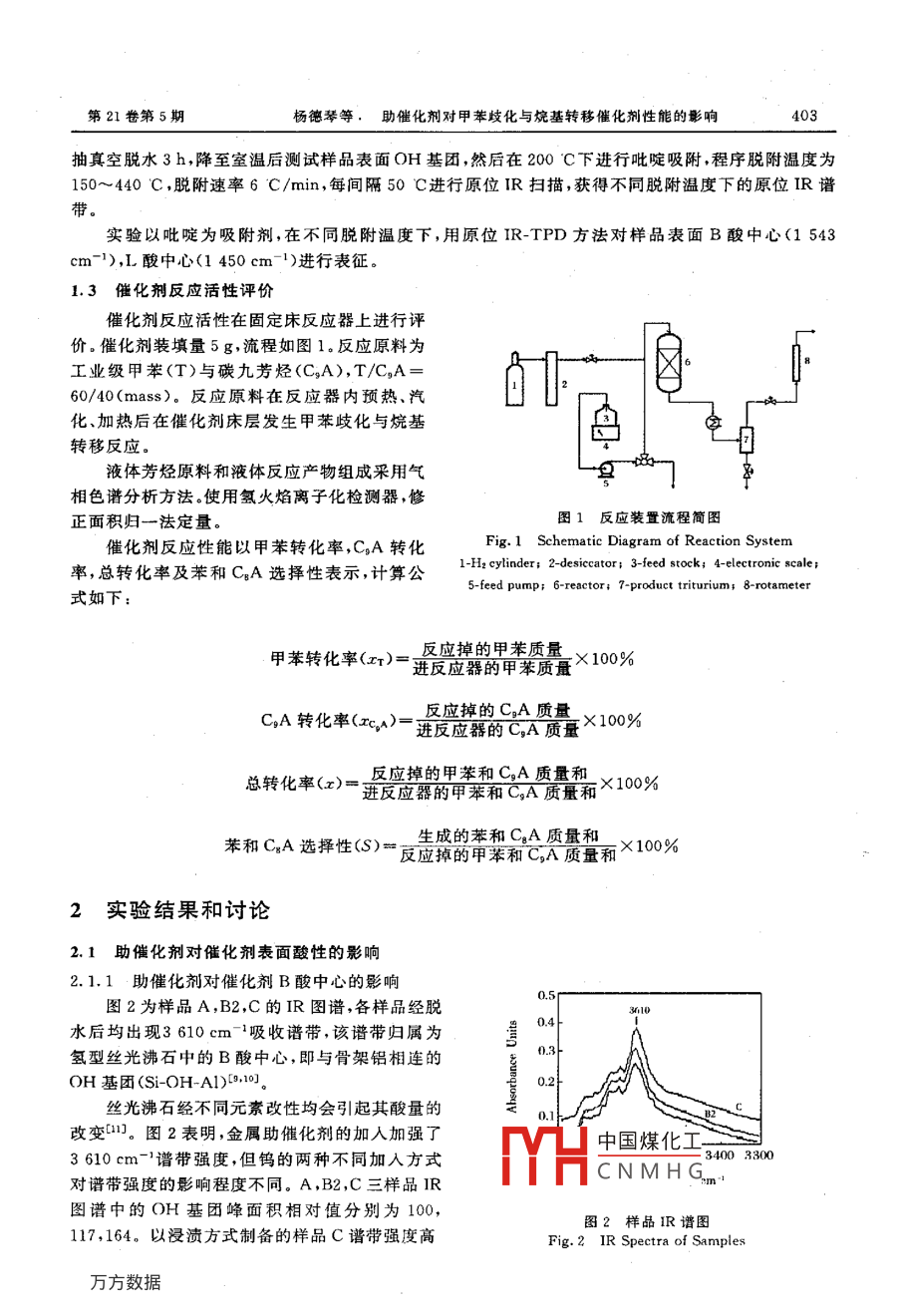 第21卷第5期化學反應工程與工藝Vol 21, No 52005年10月Chemical Reaction Engineering and TechnologyOct.2005文章編號;1001-763102005)05-0402-06助催化劑對甲苯歧化與烷基轉移催化劑性能的影響楊德琴孔德金郭宏利中國石油化工股份有限公司上海石油化工研究院,上海201208)要:采用助催化劑對絲光沸石進行改性,通過紅外光譜(FT-IR)方法表征了該改性分子篩制備的催化劑樣品表面酸性的變化,并探討了酸性變化對甲苯垓化與烷基轉移反應催化活性的影響。結果表明,助催化劑wo3的加人能有效地調(diào)節(jié)催化劑表面酸性,經(jīng)氫氣還原后催化劑B酸量隨助催化劑量增加而增加,且與助催化劑相對含量呈對數(shù)關系;而L酸量隨助催化劑相對含量的增加先上升,隨后趨于平穩(wěn);催化劑的反應活性隨助催化劑含量的增加而增加,但副反應也隨之加大。關鍵詞:助催化劑;甲苯歧化;烷基轉移:表面酸性;催化性能中圖分類號:TQ241.12文獻標識碼:A苯和對二甲苯是重要的有機化工原料。甲苯歧化與烷基轉移工藝其主要目的是將市場上相對廉價和過剩的甲苯(T)和碳九芳烴C2A)轉化為苯(B)和混二甲苯(X)口。芳烴聯(lián)合裝置中,50%左右的對二甲苯是通過甲苯歧化與烷基轉移裝置生產(chǎn)的混二甲苯經(jīng)分離轉化獲得2甲苯歧化與烷基轉移是以固體酸為催化劑的反應,不同的分子篩催化劑具有不同的酸性和酸量,酸性和酸量直接影響著催化劑的活性選擇性和穩(wěn)定性。國內(nèi)外已發(fā)表了許多在絲光沸石上進行鐵鈷、鎳鉬、鈀、鉑等改性甲苯歧化催化劑的專利與文獻-7。典型的工業(yè)催化劑TA-3,TA-4以及國產(chǎn)ZA-系列催化劑為氫型絲光沸石催化劑,不含助催化劑。上海石化研究院研發(fā)的HAT095甲苯歧化與烷基轉移催化劑添加助催化劑后,催化劑的酸強度和酸量得到提高,從而提高了催化劑的反應活性及穩(wěn)定性。本實驗采用紅外光譜測試催化劑的表面結構羥基及表面酸中心,探討了助催化劑含量對分子篩催化劑表面酸性和酸量的影響規(guī)律,并對改性前后的催化性能進行了評價與討論。1實驗部分1.1催化劑制備將硅鋁比為0的市售鈉型絲光沸石經(jīng)酸脫鋁及離子交換后,與粘結劑氧化鋁按一定比例混合均勻,加適量水和酸捏合,然后擠條成型、切粒、焙燒,得樣品催化劑A。在催化劑A制備過程中將適量金屬鎢的硝酸鹽粉碎后與氧化鋁混合,按金屬氧化物含量從小到大分別制備得到樣品B1,B2,B3和B4。按與催化劑B2同樣氧化物含量的硝酸鹽溶解后,對樣品催化劑A進行等體積浸漬,制得催化劑12催化劑表征傅立葉紅外(FT-IR)測定采用 Bruker IFs88光A~1n0cm-1,分辨率取中國煤化工4.0cm稱取一定量樣品經(jīng)本體壓片,制成直徑15m園薄YHCNMHG,加熱至400C,收稿日期:2005-06-15;修訂日期:2005-09-07作者簡介:楊德琴(1965—),女,高級工程師, E-mail:ylu@ sript,com,cn第21卷第5期楊德琴等,助催化劑對甲苯歧化與烷基轉移催化劑性能的影響403抽真空脫水3h,降至室溫后測試樣品表面OH基團,然后在200C下進行吡啶吸附,程序脫附溫度為150~440℃,脫附速率6C/min,每間隔50℃進行原位IR掃描,獲得不同脫附溫度下的原位IR譜帶實驗以吡啶為吸附劑,在不同脫附溫度下,用原位IR-TPD方法對樣品表面B酸中心(1543cm-1),L酸中心(1450cm-1)進行表征13催化劑反應活性評價催化劑反應活性在固定床反應器上進行評價。催化劑裝填量5g,流程如圖1。反應原料為工業(yè)級甲苯(T)與碳九芳烴(C3A),T/CA=60/40mass)。反應原料在反應器內(nèi)預熱、汽化、加熱后在催化劑床層發(fā)生甲苯歧化與烷基轉移反應。液體芳烴原料和液體反應產(chǎn)物組成采用氣相色譜分析方法。使用氫火焰離子化檢測器,修正面積歸一法定量圖1反應裝置流程簡圖催化劑反應性能以甲苯轉化率,CA轉化Fig 1 Schematic Diagram of Reaction Syster率,總轉化率及苯和C3A選擇性表示,計算公H2 cylinder: 2-desiccatori 3-feed stock: 4-electronic scale5-feed pump: 6-reactor: 7-product triturium: 8-rotameter式如下:甲苯轉化率(x7)=反應掉的甲苯質量進反應器的甲苯質量×100%CBACA轉化率(xcA)=進反應器的CA質量×100%總轉化率(x)=反應掉的甲苯和CA質量和×100%生成的苯和C8A質量和苯和CA選擇性(S)=反應掉的甲苯和CA質量和×100%2實驗結果和討論2.1助催化劑對催化劑表面酸性的影響2.1.1助催化劑對催化劑B酸中心的影響圖2為樣品A,B2,C的IR圖譜,各樣品經(jīng)脫水后均出現(xiàn)3610cm1吸收譜帶,該譜帶歸屬氫型絲光沸石中的B酸中心,即與骨架鋁相連OH基團(S-OHA1)910。絲光沸石經(jīng)不同元素改性均會引起其酸量的改變。圖2表明,金屬助催化劑的加入加強了中國煤化工3610cm-譜帶強度,但鎢的兩種不同加入方式34003300對譜帶強度的影響程度不同。A,B2,C三樣品IRCNMHG圖譜中的OH基團峰面積相對值分別為100,圖2樣品IR譜圖117,164。以浸漬方式制備的樣品C譜帶強度高Fig 2 IR Spectra of Samples404化學反應工程與工藝2005年10月于混合方式制備的樣品B2。這可能是因為浸漬方式可使WO3比較均勻地分布到絲光沸石微孔內(nèi)部,而機械混合方式則較難使WO3均勻地分布到絲光沸石內(nèi)表面122.1.2助催化劑含量對催化劑酸性的影響圖3為助催化劑添加量對催化劑表面OH影響。圖4為助催化劑添加量與催化劑B酸中心的關系。由圖3和圖4可知,當助催化劑相對添加量小于20%時,隨著鎢加入量的增加,3610cm-1譜帶強度明顯加強,催化劑表面B酸中心量增加;鎢相對添加量20%時,
