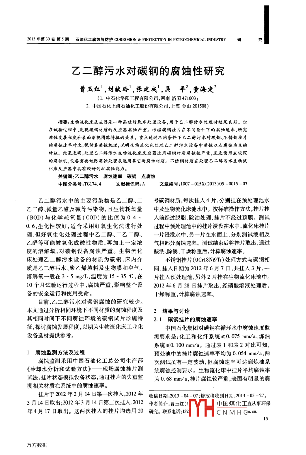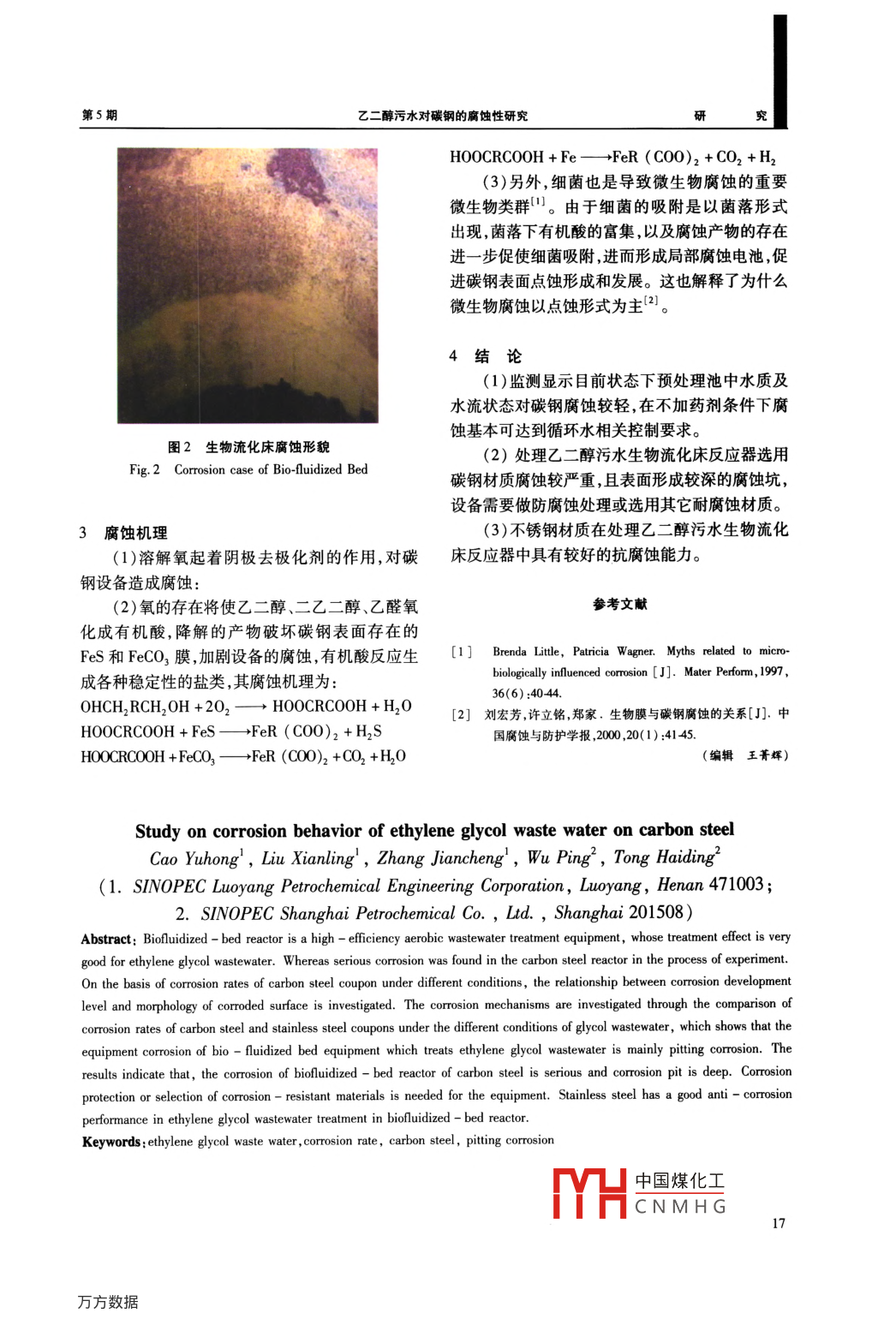 2013年第30卷第5期石油化工腐蝕與防護(hù) CORROSION& PROTECITON IN PETROCHEMICAL INDUSTRY研乙二醇污水對碳鋼的腐蝕性研究曾玉紅,劉獻(xiàn)玲,張建成,吳平2,童海定2(1.中石化洛陽工程有限公司,河南洛陽4710032.中國石化上海石油化工股份有限公司,上海金山201508)摘要:生物流化床反應(yīng)器是一種高效好氧水處理設(shè)備,用于乙二醇污水處理時(shí)效果良好。但在試驗(yàn)過程中,發(fā)現(xiàn)碳鋼材質(zhì)的反應(yīng)器腐蝕嚴(yán)重。根據(jù)碳鋼掛片在不同條件下的腐蝕速率,研究腐蝕發(fā)展程度和表面形貌圖像特征的關(guān)系。重點(diǎn)通過不同條件下乙二醇污水對碳鋼、不銹鋼掛片的腐蝕速率對比,探討其腐蝕機(jī)理,說明生物流化床處理乙二醇污水設(shè)備中腐蝕以點(diǎn)腐蝕為主的特征。結(jié)果表明,處理乙二醇污水生物流化床反應(yīng)器選用碳鋼材質(zhì)腐蝕較嚴(yán)重,且表面形成較深的腐蝕坑,設(shè)備需要做防腐蝕處理或選用其它耐腐蝕材質(zhì)。不銹鋼材質(zhì)在處理乙二醇污水生物流化床反應(yīng)器中具有較妤的抗腐蝕能力。關(guān)鍵詞:乙二醇污水腐蝕速率碳鋼點(diǎn)腐蝕中圖分類號:TG1744文獻(xiàn)標(biāo)識碼:A文章編號:1007-015X(2013)05-0015-03乙二醇污水中的主要污染物是乙二醇、二號碳鋼材質(zhì),每次掛入4片,分別掛在預(yù)處理池水乙二醇、微量乙醛及堿等污染物,且生物耗氧量中及生物流化床池水中。按標(biāo)準(zhǔn)操作方法,掛片掛(BOD)與化學(xué)耗氧量(COD)的比值為0.4-人前經(jīng)過脫脂、除油處理,掛片不經(jīng)過預(yù)膜。測試0.6,生化性較好,適合采用好氧生化法進(jìn)行處過程中預(yù)處理池中的掛片浸沒在水中,流化床掛片理,但好氧生化處理過程中乙二醇、二乙二醇片浸沒水中,另一片在水面上,分別測試液相及乙醛等可能被氧化成酸性物質(zhì),再加上一定濃氣相部分腐蝕速率。測試結(jié)束后將掛片取出,通過度的溶解氧,對碳鋼設(shè)備腐蝕嚴(yán)重。生物流化酸洗、除銹、干燥稱重后,計(jì)算腐蝕速率。床處理乙二醇污水設(shè)備的材質(zhì)為碳鋼,床內(nèi)介不銹鋼掛片(0Cr18N9T)處理方式與碳鋼相質(zhì)是乙二醇污水、聚乙烯填料及生物膜和空氣,同,掛入日期為2012年6月7日,共掛入3片溶解氧一般在3~5mg/L,溫度為15~35℃,在片掛入預(yù)處理池,另外2片掛在生物流化床池中。10個(gè)月試驗(yàn)運(yùn)行過程中,腐蝕嚴(yán)重,影響整個(gè)設(shè)2012年6月28日掛片取出,經(jīng)硝酸溶液處理后,備的安全運(yùn)行和使用受命。干燥稱重,計(jì)算腐蝕速率。目前,乙二醇污水對碳鋼腐蝕的研究較少。本文通過分析相同環(huán)境下不同材質(zhì)的腐蝕程度及2結(jié)果與討論其相同時(shí)間下不同腐蝕環(huán)境的碳鋼試片形貌特2.1碳鋼掛片的腐蝕速率征,探討腐蝕發(fā)展程度,以期為生物流化床工業(yè)化中國石化集團(tuán)對碳鋼在循環(huán)水中腐蝕速度監(jiān)設(shè)備選材提供參考。測要求是:化工和化纖系統(tǒng)≤0.075mm/a,煉油系統(tǒng)≤0.通過表1和表2對比可知腐蝕監(jiān)測方法及過程預(yù)處池中的掛片腐蝕速率平均為0.054mm/a,兩腐蝕監(jiān)測采用中國石油化工總公司生產(chǎn)部次測試雖有一定波動(dòng),但腐蝕速率可達(dá)到煉油系《冷卻水分析和試驗(yàn)方法》—現(xiàn)場腐蝕掛片測統(tǒng)腐蝕控制要求。生物流化床中掛片平均腐蝕率試法掛片狀態(tài)模擬設(shè)備狀態(tài),通過掛片的失重監(jiān)為0.68mm/a,掛片腐蝕較嚴(yán)重,表面有明顯的腐測相關(guān)材質(zhì)在系統(tǒng)中的腐蝕速率。掛片于2012年2月14日第一次掛入,2012年收稿日期:2013-04-07;修改稿收到日期:2013-05-27。3月14日取出;2012年3月14日第二次掛入,2012作者簡介:曹玉紅(H中國煤化工直從事環(huán)保年4月17日取出。這兩次掛入的掛片均選用20研究。聯(lián)系電話:3CNMHGn.cn石油化工腐蝕與防護(hù)2013年第30卷蝕坑,也就是點(diǎn)腐蝕形式,說明生物流化床水質(zhì)或率基本相同,測試過程中由于氣泡存在使氣液兩生物體會對碳鋼產(chǎn)生較強(qiáng)的腐蝕作用。流化床中相分界并不明顯,這可能是氣液兩相腐蝕速率相氣相部分掛片與液相部分掛片腐蝕形態(tài)及腐蝕速同的原因。表1第一次20號碳鋼掛片腐蝕速率Table 1 Corrosion rate of the first 20" carbon steel coupons試片編號/位置2735/預(yù)處理池2736/預(yù)處理池2737/流化床(氣相)2738/流化床(液相)試驗(yàn)周期/h696.0696.0696.0696.0試前質(zhì)量/g8.575519.900519.950120.0462試后質(zhì)量/g18.411319.725572528.7465腐蝕速度/(m·a-1)0.0940.1000.7010.743表2第二次20號碳鋼掛片腐蝕速率Table 2 Corrosion rate of the second 20" carbon steel coupon試片編號2642掛片位置預(yù)處理池預(yù)處理池流化床(氣相)流化床(液相)試驗(yàn)周期/h816.0816816.0816.0式前質(zhì)量/g19.96330.116920.11810.1202試后質(zhì)量/g19.940920.094118.796018.7962腐蝕速度/(mm·a-1)0.0110.0110.6450.646生物流化床中掛片平均腐蝕率比預(yù)處理池中2.3生物流化床腐蝕現(xiàn)場照片的掛片腐蝕速率高十幾倍,兩者所處的環(huán)境基本試驗(yàn)從2011年10月至2012年7月運(yùn)行,生相同。分析原因有兩點(diǎn),其一是生物流化床中溶物流化床導(dǎo)流筒和外筒均發(fā)生嚴(yán)重腐蝕,見圖1解氧濃度高,其二是生物流化床中細(xì)菌數(shù)量多。和圖2。可以看出,導(dǎo)