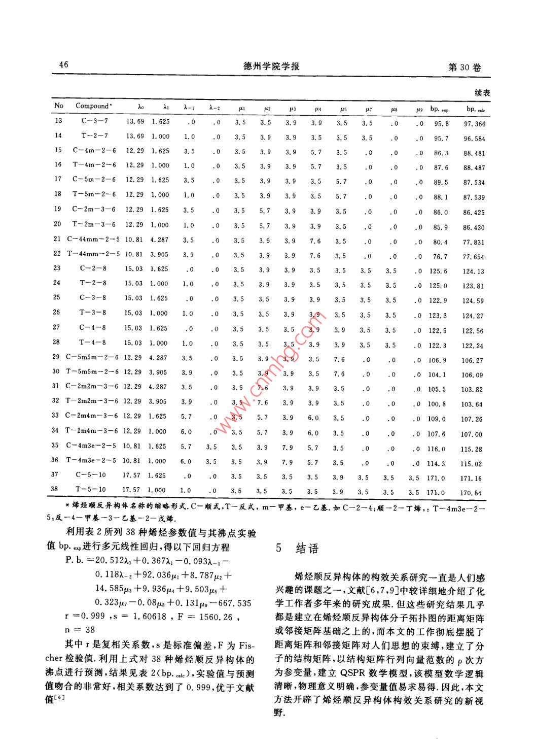 14德州學(xué)院學(xué)報第30卷6(011601A=6666601060)6.666600160]顯然矩陣A≠B,因此分子的結(jié)構(gòu)矩陣可有效按照賦權(quán)圖的原樣分別給出順4,4-2m-2戊地將烯烴的順反異構(gòu)現(xiàn)象區(qū)分開來. 表1列出了文烯和反4,4- 2m-2戊烯的結(jié)構(gòu)矩陣A與B(注意獻(xiàn)[6,7]中所能查到的38種烯烴順反異構(gòu)體的一-部空白處用0填充)分烯烴的結(jié)構(gòu)矩陣.表」部分烯烴順反異構(gòu)體的規(guī)范化分子結(jié)構(gòu)圉及其結(jié)構(gòu)矩陣NcCompoundMolecular structure imagesStructure matrixes1順-2-丁烯.c-c-C-c(6.6)H2反-2-丁烯C--C-C-C(0100)6666|(001o順-4甲基-2-戊婿HHC(°11ε)cocbc反-4甲基-2-戊烯(00100)aH5順-4,4-二甲基-2戊烯.C-0C-C-C00060)反-4,4-二甲基-2戊婼順-2,4-二甲基-3己烷CHCc-c(°6160°)cH反-2.4一二甲基-3已烷00060o)順-4甲基-3乙基-2戊烷(66666,HC10反-4甲基-3乙基-2戊烷C-C-C-C00600]第4期劉新華:烯烴順反異構(gòu)體沸點的定量構(gòu)效關(guān)系5方向?qū)ξ镔|(zhì)組成的結(jié)構(gòu)進(jìn)行詳細(xì)刻畫.又因為組成3 QSPR數(shù)學(xué)模型物質(zhì)結(jié)構(gòu)矩陣的元素是由分子結(jié)構(gòu)圖頂點處原子的原子序數(shù)構(gòu)成的,而原子序數(shù)與原子是一一對應(yīng)關(guān)as1as2 .. as系,因此分子的結(jié)構(gòu)矩陣可有效的反映構(gòu)成物質(zhì)的8--1.1 ag-1.2 " ag-1,n原子類型以及連接各支鏈的空間方位的信息量.同時,由于物質(zhì)原子的原子量與原子序數(shù)成正相關(guān)關(guān)設(shè)A=| aolao是某一系,因此以結(jié)構(gòu)矩陣的行、列向量1范數(shù)的ρ次方根構(gòu)建的結(jié)構(gòu)信息指數(shù)的物理意義是:參數(shù)λ。反映了物質(zhì)分子主鏈原子量與物性P的關(guān)系;而參數(shù)入:中包含著分子的支化程度和順式結(jié)構(gòu)的信息量;參數(shù)m行n列的分子結(jié)構(gòu)矩陣,其中A的第零行對應(yīng)于λ2則給出了長度超過1的取代基個數(shù)對性質(zhì)P所作分子結(jié)構(gòu)圖的主鏈,主鏈上方的行依次定義為第1,貢獻(xiàn)的拓?fù)淞恐?參數(shù)λ-1中既含有反式結(jié)構(gòu)的信2...s行,主鏈下方的行依次定義為矩陣A的第-息量,也反映了分子叔原子數(shù)對物性P的貢獻(xiàn)值;1,-2...-t行,用a; = (an ,a*.,an)表示矩陣而參數(shù)μ;( j =1,2,.",n)表達(dá)了主鏈第j個原子上A的第i個(i=-t,-t+...,0,.2...s)行向量,取代基的具體信息量.由此可知,結(jié)構(gòu)信息指數(shù)入,β, = (a,a,r,".,ao,a-,a. e.,*,a,)T,表示Aμ;是從縱橫不同方向?qū)Ψ肿游⒂^結(jié)構(gòu)的細(xì)化描述.的第j(j=1,2,-.,n)個列向量.基于以上事實,本文將分子結(jié)構(gòu)矩陣的行、列向量的設(shè)P是稀烴化合物的性質(zhì),入;= lall',p,=1范數(shù)的p次方根λi,μ作為分子的結(jié)構(gòu)信息指數(shù)用I|1I',其中1| * |I' 表示向量的1范數(shù)的ρ次算.于烯烴順反異構(gòu)體結(jié)構(gòu)物性規(guī)律的研究.術(shù)根.依λ;,p;作為參變量,建立如下形式的QSPR數(shù)學(xué)模型:4烯烴順反異構(gòu)體沸點的定量構(gòu)效關(guān)P= 2ex;+ Ed,u,+e(*)由結(jié)構(gòu)矩陣的定義可知,烯烴順反異構(gòu)體的結(jié)根據(jù)表1所列烯烴順反異構(gòu)體的結(jié)構(gòu)矩陣,借構(gòu)矩陣是其分子結(jié)構(gòu)圖原樣的量化,它相當(dāng)于分子助SPSS軟件,確定模型參數(shù)p=0. 7,并計算結(jié)構(gòu)矩結(jié)構(gòu)圖的一張數(shù)碼照片,結(jié)構(gòu)矩陣的行數(shù)列數(shù)反映陣的行、列向量的1范數(shù)[8] ,剔除線性相關(guān)向量,將了物質(zhì)分子的整體規(guī)模,是對分子大小的宏觀描述;模型所需獨立參數(shù)的取值以及烯烴涕點實驗值和預(yù)而組成矩陣的行向量組和列向量組分別從縱橫兩個測值列于表2.喪2 38個烯烴的結(jié)構(gòu)信息指數(shù)及其沸點實驗值和預(yù)測值No Compound*。 λ1 λ-1 A-zμiμ2必μμsp8 μ9 bp.c坤bp. aleC-2-49.25 1.625.0.93.72. 4112T-2-49.25 1. 0003.93.53.0.82. 0888C-2-510.81 1. 62503.53.93.93.53.536. 865T-2-510.81 1. 0000) 3.53.9 3.9 3.5 3.36.336. 543C-2-612.29 1. 625)3.53.93.93.53.50 68.867. 060T-2-612.29 1 000 .1.00 67.966. 737C-3-603.53.53.93.93.5066.67. 519 .T- 3-612.29 1. 000.) 3.5 3.5 3.9 3.9 3.567. 1969 C-4m-2-5 10.81 I.625 .3.5.03.53.93.95.73.558. 28710 T-4m-2-5 10.81 1.0003.958.658. 020C-2-713.69 1.625..536. 90712T-3-713.691. 000.53.53.93.93.53.97.043.46德州學(xué)院學(xué)報第30卷No Compound*λo λ1 λ-1-2451748pu9 bp.oxpbp. ale13C-3-713.69 1. 625.(.0.5 3.5 3.9 3.9 3.5 3.5.0 95.8 97.36613. 69 1. 0001.0.595. 796. 584 .15 C-4m-2-6 12.29 1.6253.5.03.53.93.95.73.586.388. 48116 T-4m-2-6 12.29 1.00003.53.93.95.73.5,0 87.6 88.487C-5m-2-6 12.29 1. 6253.5 3.9.989.5 87. 53418 T-5m-2-6 12.29 1.000 .88.187. 53919 C- -2m-3-612. 291. 6253.503.55.7,3.93.93.5086. 42503.55.73.93.93.50 85.9 86. 43021 C-44mm-2-5 10.81 4. 28780. 477.83122 T-44mm-2-5 10.81 3.905 3.903.53.93.97.63.576. 777. 654C-2-815.03 1. 625 .0 3.5 3.9 3.9 3.5 3.5 3.5 3.5 .0 125.6 124.13T-2-815.03 1. 0003.90 125.0123. 8125C-3-8.15.03 1. 625) 3.5 3.5 3.9 3.9 3.5 3..0 122.9124. 592T-3-815.031.000 1. 003.53.53.93.93.53.53.5.0123.3124. 27C-4-815.031. 625) 3.5 3.5 3.5 3.9 3.9 3.5 3.5. 0 122.5 122. 56T-4-8122.2429 C-5m5m-2-6 12.29 4.287 3. 503.53.93.93.57.6106. 2730 T-5m5m-2-6 12.29 3.905 3. 9) 3.5 3.9 3.9 3.5 7.6.0 104.1106. 09.31 C- 2m2m-3-6 12.29 4. 287103. 8232 T- 2m2m- -3-612.29 3.905 3. 90 3.5 7.6 3.103. 6433 C- -2m4m-3-6 12.29 1.625 5.70 3.5 5.7 3.9 6.0 3.5.0 109.0107. 2634 T- -2m4m-3-6 12.29 1. 00006.0 3.0 107.6107. 0035 C-4m3e-2-5 10.81 1.625 5.7 3.5 3.115. 236 T-4m3e-2-5 10.81 1.000 6.0 3.