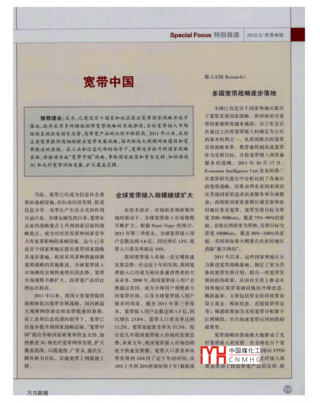 Special Focus特別報道|20123/世界電信寬帶中國源: CATR Research)。多國寬帶戰(zhàn)略逐步落地全球已有近百個國家和地區(qū)提出推薦理由:迄今,已有近百個國家和地區(qū)提出寬帶國家戰(zhàn)略并逐步了寬帶發(fā)展國家戰(zhàn)略。各國政府對寬落地,政府采用多種措施保障寬帶戰(zhàn)略的實(shí)施推進(jìn),全球?qū)拵Ы尤胧袌鰩У闹匾暢潭仍絹碓礁?芬蘭更是首繼續(xù)呈現(xiàn)快速增長態(tài)勢,高帶寬產(chǎn)品的比例不斷提高。2011年以來,我國次通過立法將寬帶接入權(quán)確定為公民主要寬帶提供商相繼提出寬帶發(fā)展戰(zhàn)略,國內(nèi)掀起大規(guī)模網(wǎng)絡(luò)建設(shè)和寬的基本權(quán)利之一。從各國提出的寬帶帶提速的浪潮。在工業(yè)和信息化部的倡導(dǎo)下,寬帶逐步提升到國家戰(zhàn)略發(fā)展戰(zhàn)略來看,都普遍將超高速寬帶層面,將推動實(shí)施“寬帶中國”戰(zhàn)略,爭取國家政策和資金支持,加快推進(jìn)作為發(fā)展目標(biāo),并將寬帶納入到普遍3和光纖寬帶網(wǎng)絡(luò)發(fā)展,擴(kuò)大覆蓋范圍。服務(wù)的范疇。2011年10月17日Economist Intelligence Unit發(fā)布的第三次寬帶研究報告中分析比較了各地區(qū)的寬帶戰(zhàn)略,結(jié)果表明東亞國家政府當(dāng)前,寬帶已經(jīng)成為信息社會重全球?qū)拵Ы尤胍?guī)模繼續(xù)擴(kuò)大比其他國家更追求高速服務(wù)和全面覆要的基礎(chǔ)設(shè)施,在拉動經(jīng)濟(jì)發(fā)展、促進(jìn)蓋;而西歐國家更重視區(qū)域發(fā)展和農(nóng)信息分享、變革生產(chǎn)生活方式的作用在技術(shù)進(jìn)步、市場需求和政策環(huán)村地區(qū)普及寬帶,寬帶發(fā)展目標(biāo)為帶日益凸顯。全球金融危機(jī)以來,寬帶從境的驅(qū)動下,全球?qū)拵Ы尤胧袌鲆?guī)模寬20M-50Mbi/s,覆蓋75%-90%的家企業(yè)的戰(zhàn)略重點(diǎn)上升到國家層面的戰(zhàn)不斷擴(kuò)大。根據(jù) Point- Topic的統(tǒng)計(jì),庭。北歐比西歐更為積極,發(fā)展目標(biāo)為略重點(diǎn),成為對經(jīng)濟(jì)發(fā)展和國家競爭2011年第二季度末,全球?qū)拵Ы尤胗脦?00Mbi/s,覆蓋90%~100%的家力有顯著影響的基礎(chǔ)設(shè)施。迄今,已有戶總數(shù)達(dá)到56億,同比增長12%,寬庭。美國和加拿大則重點(diǎn)在農(nóng)村地區(qū)近百個國家和地區(qū)提出寬帶國家戰(zhàn)略帶人口普及率接近10%。消除“數(shù)字鴻溝”。并逐步落地,政府采用多種措施保障我國寬帶接入市場一直呈現(xiàn)快速2011年以來,這些國家和地區(qū)大寬帶戰(zhàn)略的實(shí)施推進(jìn),全球?qū)拵Ы尤氚l(fā)展態(tài)勢。經(jīng)過近十年的發(fā)展,我國寬力推進(jìn)寬帶戰(zhàn)略落地,制定了更為具市場繼續(xù)呈現(xiàn)快速增長的態(tài)勢,寬帶帶接入已經(jīng)成為面向普通消費(fèi)者的大體的寬帶發(fā)展計(jì)劃,提出一些寬帶發(fā)市場規(guī)模不斷擴(kuò)大,高帶寬產(chǎn)品的比眾業(yè)務(wù)。2008年,我國寬帶接入用戶總展的扶持政策,從而在實(shí)質(zhì)上推動本例也在提高數(shù)超過美國,成為全球用戶規(guī)模最大國和地區(qū)寬帶基礎(chǔ)設(shè)施的升級改造。2011年以來,我國主要寬帶提供的寬帶市場,以及全球?qū)拵Ы尤胗脩舾爬ㄆ饋?主要包括資金扶持政策如商相繼提出寬帶發(fā)展戰(zhàn)略,國內(nèi)掀起最多的國家。截至2011年第三季度設(shè)立基金、稅收優(yōu)惠、直接提供資金大規(guī)模網(wǎng)絡(luò)建設(shè)和寬帶提速的浪潮。末,寬帶接入用戶總數(shù)達(dá)到1.5億,同等;頻譜政策如為無線寬帶分配數(shù)字在工業(yè)和信息化部的倡導(dǎo)下,寬帶已比增長23.8%,寬帶人口普及率達(dá)到紅利頻段;出臺加速寬帶應(yīng)用的鼓勵經(jīng)逐步提升到國家戰(zhàn)略層面,“寬帶中11.2%,寬帶家庭普及率為37.3%。綜政策等。國”提出爭取國家政策和資金支持,加合近幾年我國寬帶接入市場的發(fā)展態(tài)寬帶戰(zhàn)略的落地極大地推動了光快推進(jìn)3G和光纖寬帶網(wǎng)絡(luò)發(fā)展,擴(kuò)大勢,未來五年,我國寬帶接入市場仍將纖寬帶接入的發(fā)展,在全球近百個寬覆蓋范圍。以提速度,廣普及,惠民生、處于快速發(fā)展期,寬帶人口普及率從V凵中國煤化工絡(luò)向Fm降價格為目標(biāo),實(shí)施寬帶上網(wǎng)提速工零發(fā)展到10%用了近十年的時間,從CNMHG光纖接入部程10%上升到20%將縮短到5年(數(shù)據(jù)來署也帶動了較高帶寬產(chǎn)品的發(fā)展,根20123/世界電信 Special Focus特別報道據(jù) Point Topic對全球2000余款寬帶接劃,如上海電信對全市家庭光網(wǎng)客戶帶基礎(chǔ)設(shè)施薄弱的局面得到根本性入套餐的調(diào)查顯示,1M-5M帶寬仍是進(jìn)行統(tǒng)一分批升速,家庭光網(wǎng)客戶對改變。當(dāng)前運(yùn)營商主推的寬帶接入速率,但應(yīng)不同的路徑,將分別免費(fèi)升速至10運(yùn)營商提供的10M-50M的寬帶套餐兆、20兆、30兆。升速工作預(yù)計(jì)在11發(fā)展寬帶成為全球目標(biāo)數(shù)量在不斷增多。帶寬在1M-5M的套月底完成,上海電信家庭光網(wǎng)客戶的餐數(shù)占總套餐數(shù)量的35.1%;帶寬在平均帶寬將超過16兆。北京、天津、江在2011年TU世界電信展上,聯(lián)10M-50M的套餐數(shù)量占據(jù)了總套餐數(shù)蘇等省市也提出了類似目標(biāo)。合國數(shù)字發(fā)展寬
