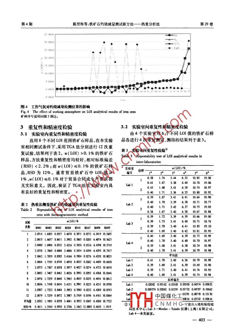 2010年08月巖礦測(cè)試VoL 29August 2010ROCK AND MINERAL ANALYSIS399文章編號(hào):0254-5357(2010)04-039907鐵礦石灼燒減量測(cè)試新方法——熱重分析法陳賀海',張愛珍',余清',任春生,廖海平,應(yīng)海松,楊勇2,華正江,劉尊武(1.寧波出入境檢驗(yàn)檢疫局鐵礦檢測(cè)中心國家級(jí)重點(diǎn)實(shí)驗(yàn)室,浙江寧波315800;2.上海出入境檢驗(yàn)檢疫局,上海200135;3.寧波出入境檢驗(yàn)檢疫局技術(shù)中心,浙江寧波3150124. Mettler- Toledo儀器(上海)有限公司,上海20023)摘要:采用熱重分析法(TGA)測(cè)量鐵礦石樣品灼燒減量,對(duì)保溫時(shí)間、加熱溫度、加熱速率和工作氣氛等工作條件進(jìn)行了系統(tǒng)研究,確立TGA法適宜的工作條件為:20℃/min加熱至1000℃,保溫30min,全程選用高純氦為工作氣體。對(duì)多種進(jìn)口鐵礦石樣品采用TCA法和常規(guī)馬弗爐加熱法進(jìn)行測(cè)量,對(duì)比結(jié)果表明,TGA法具有方便快捷、準(zhǔn)確可靠、適用范圍寬、樣品消耗量小等優(yōu)點(diǎn),且可以清楚監(jiān)控樣品失重全過程,為鐵礦石揮發(fā)分的成分分析提供有力的數(shù)據(jù)參考。關(guān)鍵詞:灼燒減量;鐵礦石;熱重法中圖分類號(hào):0655.1;P578.12文獻(xiàn)標(biāo)識(shí)碼:BA New Method for the Determination of Loss on Ignition in Iron OresThermogravimetryCHEN He-hai', ZHANG Ai-zhen', YU Qing, REN Chun-sheng, LIAO Hai-pingYING Hai-song, YANG Yong, HUA Zheng-jiang', LIU Zun-wu( 1. State Key Laboratory of Iron Ore, Iron Ore Test Center of Ningbo Entry-Exit Inspection andQuarantine Bureau, Ningbo 315800, China2. Shanghai Entry-Exit Inspection and Quarantine Bureau, Shanghai 200135, China3. Technique Center of Ningbo Entry-Exit Inspection and Quarantine Bureau, Ningbo 315012, china;4. Mettler-Toledo Apparatus Ltd, Shanghai 200233, China)Abstract: A new method for the determination of loss on ignition in iron ores-thermogravimetry analysis (TGA)was developed. The measurement conditions were systematically studieoptimized. Samples were heated upto 1000C with heating rate of 20C/min and held for 30 min under the protection with high pure argon flow rateof 50 mL/ min throughout the experiments. The results of comparative test of TGA with traditional method( mufflefurnace burning) for various kinds of imported iron ores showed that the TGV method provided the advantages ofgher accuracy and reliability, more convenience, wide application range, smaller sample consumption and wasespecially suitable for the analysis of volatile components in iron oresKey words loss on ignition; iron ore; thermogravimetry近年來隨著我國鋼鐵工業(yè)的迅猛發(fā)展鐵礦石石品質(zhì)的要求越來越嚴(yán)格。鐵礦石灼燒減量進(jìn)口量逐年上升,價(jià)格居高不下,貿(mào)易各方對(duì)鐵礦(LOI)不僅關(guān)系到鐵礦石有效利用量,更與冶煉過收稿日期:200908-26;修訂日期:200-11-25H中國煤化工基金項(xiàng)目:直屬局方法研究項(xiàng)目資助(甬F06-2009)NMHG作者簡(jiǎn)介:陳賀海(1979-),男,河北邯鄲人,博土,工程師從事巴扎于幾工作。E-mail: bl. chenhh@ nbciq . gov.en399一第4期巖礦測(cè)試htp:∥w.ykes.ac.cn2010年程中的填料配比有著密切的聯(lián)系,一直以來都是貿(mào)毛里塔尼亞等12個(gè)主要鐵礦石輸出國的35種鐵礦易方面關(guān)注的重要指標(biāo)之樣品及2個(gè)高壓鐵鐵礦石標(biāo)準(zhǔn)樣品。按照ISO由于我國鐵礦石的進(jìn)口國比較分散,礦石種類3082-2002進(jìn)行取制樣。一般試樣粒度應(yīng)小于多樣原有的灼燒減量檢測(cè)方法不僅耗時(shí)長,100μm;如試樣中化合水或易氧化物含量高時(shí),其粒且實(shí)驗(yàn)環(huán)境為空氣介質(zhì)狀態(tài)準(zhǔn)確度相對(duì)較低,適度應(yīng)小于160μm。按照O774-20062在用范圍受限,已經(jīng)不能滿足實(shí)際把關(guān)需求(105±2)℃下將試樣干燥4h,置于干燥器中備用。熱重分析技術(shù)從20世紀(jì)中葉發(fā)展至今已基本14測(cè)定方法成熟9,以動(dòng)態(tài)稱量、過程可控、結(jié)果精確的優(yōu)(1)編輯方法。設(shè)定起始溫度、升溫速率、工勢(shì)廣泛應(yīng)用于礦物資源的熱力學(xué)和動(dòng)力學(xué)特征分作氣類型和流量(根據(jù)儀器操作指南,本試驗(yàn)均選析-16),對(duì)鐵礦的研究多趨向于熱解機(jī)制-1和用50mL/min)及溫度保持時(shí)間。燒結(jié)性能的探索。(2)輸入樣品編號(hào),放置對(duì)應(yīng)的樣品坩堝,稱本文采用熱重分析(TGA)手段,對(duì)多種進(jìn)口取坩堝質(zhì)量。鐵礦石灼燒減量檢測(cè)中的保溫時(shí)間、加熱溫度、升(3)在坩堝中添加預(yù)干燥試樣,壓實(shí),約至坩溫速率和工作氣氛等條件進(jìn)行系統(tǒng)研究,建立了一堝容積的1/3~2/3,放回原位,開始測(cè)試種叮操作性強(qiáng)、準(zhǔn)確度高、適用范圍廣的鐵礦石灼4)結(jié)果讀取。使用儀器配套軟件,對(duì)檢測(cè)結(jié)燒減量(LOI)檢測(cè)方法,大幅提高了該項(xiàng)指標(biāo)的檢果進(jìn)行分析,從樣品失重曲線(見圖1)上讀取樣品測(cè)效率和結(jié)果準(zhǔn)確性。失重比例,即為LOI值。1實(shí)驗(yàn)部分1.1儀器及工作條件8503TGA DSC1專業(yè)型熱重差熱分析儀(瑞上梅特120mn勒托利多公司),工作參數(shù)列于表1表1熱重差熱分析儀工作參數(shù)Table 1 Working parameters of TGA/DSCI工作參數(shù)工作參數(shù)溫度范圍室溫-0線性降溫速率0.l-20℃/mi溫度準(zhǔn)確度0.3℃最大稱樣量溫度重復(fù)性±0,2℃天平靈敏度線性升溫速率0.1-10℃/m工作氣流量50m/mim馬弗