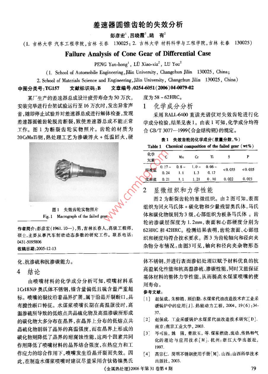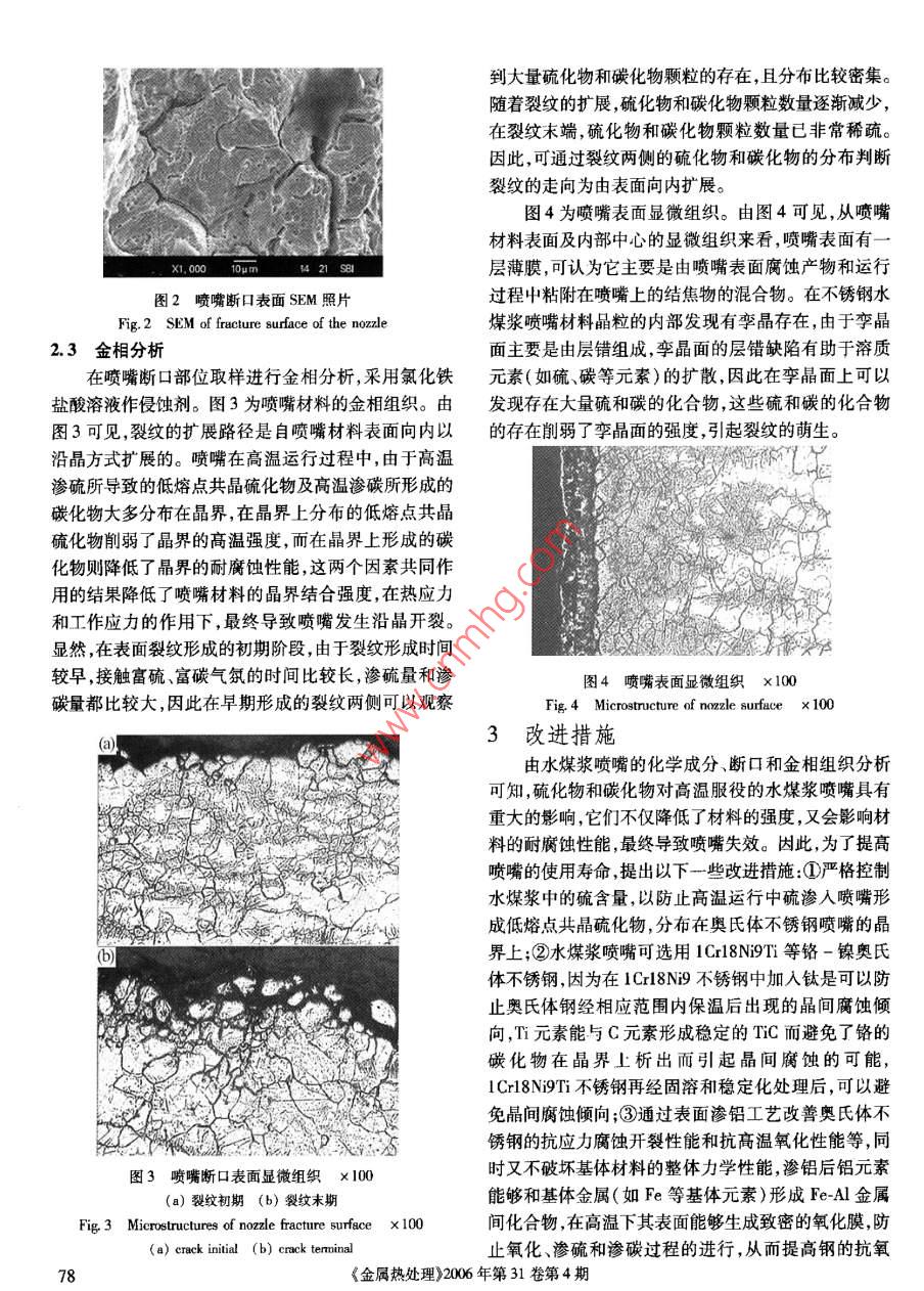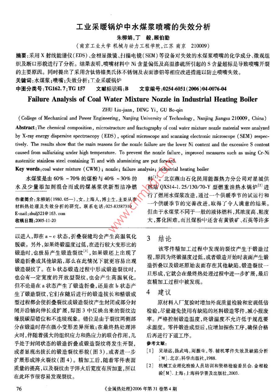 工業(yè)采暖鍋爐中水煤漿噴嘴的失效分析朱柳娟,丁毅,顧伯勤(南京工業(yè)大學機械與動力工程學院,江蘇南京21000摘要:采用X射線能譜儀(EDS)、金相顯微鏡、掃描電鏡(SEM)等設備對失效的水煤漿噴嘴的化學成分、徽觀組織及斷口形貌進行了分析。結果表明,噴嘴材料中N含量偏低及高溫滲硫所引起的S含量超標是導致噴嘴開裂的主要原因。同時提出了采用含鈦鉻鎳奧氏體不銹鋼及表面滲鋁等相應改進措施以防止噴嘴失效。關鍵詞:水煤漿;噴嘴;失效分析;工業(yè)釆暖鍋爐中圖分類號:TG1627;TG157文獻標識碼:B文章編號:025446051(2006)040076-4Failure Analysis of Coal Water Mixture Nozzle in Industrial Heating boilerZHU Liu-juan, DING Yi, GU Bo-qinCollege of Mechanical and Power Engineering, Nanjing University of Technology, Nanjing Jiangsu 210009, China)Abstract: The chemical composition, microstructure and fractography of coal water mixture nozzle material were analyzedby X-ray energy dispersive spectroscopy(EDS), optical microscope and scanning electronic microscope(SEM)respec-tively. The results show that the main reasons for the nozzle failure are the lower Ni content and the excessive s contercaused from sulfurizing under high temperature. To prevent the nozzle failure, improved measures such as using Craustenitic stainless steel containing Ti and with aluminizing are put forward.Key words: coal water mixture( CWM); nozzle; failure analysis; industrial heating boiler水煤漿是由60%~70%的煤粉與40%~30%的料。北京燕山石化民用能源熱力分公司對星城供水及少量添加劑混合而成的煤基漿狀新型潔凈燃熱站QXS141.25/13070-Y型燃重油熱水鍋爐2進作者簡介:朱柳娟(1980.05-),女,上海人,博士生,主要從事行了燃用水煤漿改造,通過一個供暖季節(jié)的試運行和材料熱處理及失效分析的研究。聯(lián)系電話:02583587310一個供暖季節(jié)的完善改進,取得了令人滿意的結果。E-mail:zhulj521@163.com但由于水煤漿不同于一般的液體燃料,其濃度高、粘度收稿日期:2005-11-20大,霧化困難,而且煤粉屮還含有黃鐵礦、石英等許多以進入,即在a~狀態(tài),折疊裂縫均會產生高溫氧化3結論脫碳。另外,如果終鍛溫度過低,在進行較大變形比的鍛造時,也極易產生鍛造裂紋,如果鍛坯上出現(xiàn)了該零件精加工過程中發(fā)現(xiàn)的裂紋產生于鍛造過鍛造折疊或其他缺陷,那么在此情況下就更容易出現(xiàn)程,原因為終鍛溫度過低,或者鍛造開始時表面產生鍛鍛造裂紋了。在b狀態(tài)鍛造過程中形成鍛造裂紋時造折疊以及鍛坯原始表面存在其他缺陷,鍛造裂紋一也會有一定寬度的開放型裂紋,也會產生高溫氧化旦形成,它就會在最終熱處理過程中進一步擴展,最后但不論是在a狀態(tài)產生了鍛造折疊,還是在b狀態(tài)產在精加工過程中被發(fā)現(xiàn)。生了鍛造裂紋,它們在隨后進行的鍛造拔長和精鍛成4建議型過程都會使折疊裂紋或鍛造裂紋產生封閉或部分封原材料入廠復驗時增加外觀質量檢驗和宏觀低倍閉并沿軸向伸長或擴展,即圖3中反映出來的裂紋邊檢驗,盡量避免使用有缺陷的坯料鍛造零件,減小報廢緣脫碳層錯位和不連續(xù)現(xiàn)象。錯位是由于裂紋兩側部率。嚴格控制鍛造溫度,終鍛溫度不允許低于規(guī)范要分在鍛造時存在微小變形差異所致;在最終熱處理淬求溫度。零件鍛造成型后,應增加探傷工序確保合格火時,伴隨著強大的組織應力和熱應力的聯(lián)合作用,幾后再進行下道工序。乎處于封閉狀態(tài)的鍛造折疊或鍛造裂紋將發(fā)生開裂,參考文獻:或者顯現(xiàn)出拔長的鍛造裂紋形貌(圖3),或者進一步1吳培遠,揚武鳴,周振生等輔機零件失效及缺陷分析擴展形成淬火裂紋(圖4)。精加工后,隨著零件表面M].北京:科學出版社,1988質量的提高,以及裂紋由于淬火后寬度有所加重,所以2]機械工業(yè)理化檢驗人員培訓和資格檢驗委員會金相檢在此環(huán)節(jié)很容易發(fā)現(xiàn)裂紋。驗[M].上海:上海科學普及出版社,2003金屬熱處理》2006年第31卷第4期高硬度(>2500Hv)雜質。在高溫運行過程中含有固算嵌件槽擊坎體煤粉粒子的水煤漿流體連續(xù)沖擊噴嘴表面,產生顆粒沖蝕磨損,使噴嘴表面發(fā)生破壞3。本文以QXS141.25/130/70-Y型燃水煤漿工業(yè)采暖鍋爐中已失效的煤漿+髯化氣噴嘴為研究對象,對其進行失效分析,并提H相應的改進措施,提高噴嘴的使用壽命。水煤漿噴嘴的結構和工作環(huán)境水煤漿通過噴嘴將其霧化成液滴后才能燃燒,因此,噴嘴是水煤漿燃燒器中的關鍵部件之一,其結構圖1水煤漿噴嘴頭部結構示蕙圖的合理性決定了水煤漿的霧化效果。燃燒裝置采用Fig 1 Schematic diagram of coal water mixture nozzle head旋流式水煤漿燃燒器,配壓縮空氣霧化噴槍。水煤漿可達1300℃)。噴嘴內部存在溫度梯度,而且在水煤燃料由供漿泵向噴槍輸送,再由壓縮空氣霧化噴出。漿的連續(xù)沖擊下溫度會發(fā)生變化。由于長期在高溫下氣體霧化撞擊式水煤漿噴槍是利用壓縮空氣多級撞工作,當水煤漿燃燒不穩(wěn)定時,會引起爐膛內溫度分布擊水煤漿,使壓縮空氣與水煤漿充分混合、細化噴射不均勻或噴嘴處結焦,使噴嘴因溫差產生熱應力局部而出。在水煤漿表面形成的初次霧化漿滴,在高溫氣產生變形。另外長期在高溫條件以及周圍腐蝕性氣氛流的沖擊下進一步霧化成更細小的漿滴,并逐級霧化下工作,對噴嘴材料的組織、力學性能和化學性能也產使?jié){滴滿足要求。當水煤漿在噴