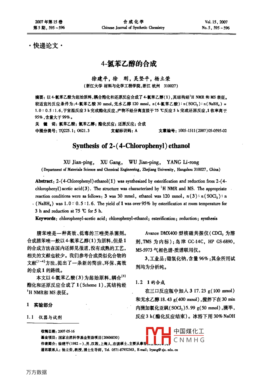 2007年第15卷合成化學(xué)第5期,595~596Chinese Joumal of Synthetic ChemistryNo.5,595-596快遞論文·4氯苯乙醇的合成徐建平,徐剛,吳堅(jiān)平,楊立榮(漸江大學(xué)材料與化學(xué)工程學(xué)院浙江杭州310027)摘要:以4氯苯乙酸為起始原料耦合酯化和還原反應(yīng)合成了4氯苯乙醇(1),其結(jié)構(gòu)經(jīng)HNMR和MS表征較適宜的反應(yīng)條件為4氯苯乙酸30mml,無水乙醇120mml,n(4氯苯乙酸):n(SOC2):n(NaBH1.0:0.5:16,于室溫反應(yīng)3b完成酯化反應(yīng),產(chǎn)物不經(jīng)分離直接于75℃反應(yīng)5h完成還原反應(yīng)收率高于95%,含量大于9%關(guān)詞:氯苯乙酸;氯苯乙醇;酯化反應(yīng);還原反應(yīng);合成中圖分類號(hào):TQ225.1;06213文獻(xiàn)標(biāo)識(shí)碼:A文章編號(hào):1005-1511(2007)0509502Synthesis of 2(4-Chlorophenyl)ethanolXU Jian-ping, XU Gang, WU Jian-ping, YANG Li-rongDepartment of Materials Science and Chemical Engineering, Zhejiang University, Hangzbou 310027, China)Abstract: 2-(4-Chlorophenyl)ethanol(1)was synthesized by esterification and reduction from 2(4chlorophenyl)acetic acid(3). The structure was characterized by H NMR and MS. The appropriatereaction conditions were as follows: 3 was 30 mmol, ethanol was 120 mmol, n(3):n(SOCl,): n( NaBH )was 1.0: 0.5: 1.6. The yield of I was ower 95% by esterification at room temperature for3 h and reduction at 75C for 5 hKeywords: chlorophenyl-acetic acid; chlorophenyl-ethanol; esterification; reduction; synthesis腈苯唑是一種高效、低毒的三唑類殺菌劑。Avance DMX400型核磁共振儀(CDCl2為溶合成腈苯唑一般以4氯苯乙醇(1)為原料但是1劑TMS為內(nèi)標(biāo));島津CC14C,HPCS6890,的合成方法在國內(nèi)還鮮見報(bào)道,沒有成熟的工藝,Ms93氣相色譜質(zhì)譜聯(lián)用儀。相關(guān)的文獻(xiàn)也較少。我們參考合成類似化合物的3,工業(yè)品;硼氫化鈉,含量9%;其余所用試文獻(xiàn){4方法提出了一條新的簡潔、環(huán)保、高效的合成1的路線劑均為分析純。本文以4氯苯乙酸(3)為起始原料耦合酯化和還原反應(yīng)合成了1( Scheme1),其結(jié)構(gòu)經(jīng)1.21的合成HNMR和M表征。在三口反應(yīng)瓶中加人317.23g(100mmo)和無水乙醇1843g(400mml),攪拌下在30min實(shí)驗(yàn)部分內(nèi)滴加氯化亞砜(SOc2)599g(50mmol),滴畢,1.1儀器與試劑反應(yīng)3h(酯化反應(yīng)結(jié)束)。冰浴下用30%NaOH收稿日期:20070516中國煤化工基金項(xiàng)目:國家自然科學(xué)基金資助項(xiàng)目(20606030)CNMHG作者簡介:徐建平(1982-),男漢族上海人在讀碩士,主要從事有口H通訊聯(lián)系人:楊立榮教授博士生導(dǎo)師,T.057187952363, E-mail: Ryang如,dum合成化學(xué)vdL.15,2007OH SOCL, EtOHOEt NaBh, EtoHH20℃,3.5h75℃,5hC溶液調(diào)節(jié)pH值至弱堿性。室溫下在1h內(nèi)滴加330mmol,無水乙醇120mmol,s0cl215硼氫化鈉(NaBH4)6.31g(160mmo)的水(10mmod,其余反應(yīng)條件同1.2,考察NaBH用量對合mL)溶液滴畢,回流反應(yīng)4h(還原反應(yīng)結(jié)束)。成1的影響結(jié)果見表2。由表2可知,NaBH4用量冰浴下用10%鹽酸調(diào)節(jié)pH值至弱酸性用乙酸為48mmol時(shí)[n(3):n(NBH)=1.0:1.6],1收乙酯(3×30m)萃取合并有機(jī)層,經(jīng)脫溶、干燥率高于95%,含量接近9%得無色液體115.03g,收率95.1%,含量99.1%;HNMR8:7.27(d,J=84H,2H,ArH),2.3還原反應(yīng)溫度與時(shí)間的對應(yīng)關(guān)系7.14(d,J=8.4Hz,2H,ArH),3.79(t,J330mmol,無水乙醇120mmol,socl215136H,16.8H,2H,CH1OH),27(t,J=mm,№BH48mo,其余反應(yīng)條件同2,166出,132H,2H,ACH2),235(b,1H,收率高于95%,含量大于99%時(shí)結(jié)束反應(yīng),反應(yīng)OH);EMSm/z(%):156(M’,32),125溫度與反應(yīng)時(shí)間的對應(yīng)關(guān)系見表3。由表3可(100),99(8),91(37),63(12)。知當(dāng)還原反應(yīng)溫度為75℃時(shí),反應(yīng)僅需5h2結(jié)果與討論3還原反應(yīng)溫度對合成1的影響Table 3 Eect of reduction temperature on yield of 12.1SoCl2用量對合成1的影響反應(yīng)溫度/2040607075330mmol,無水乙醇120mml,NaBH460反應(yīng)時(shí)間h4820137mmol,其余反應(yīng)條件同1.2,考察Socl2用量對合s0215mmol,NaBH48mmol,其余反應(yīng)條件同成1的影響結(jié)果見表1。由表1可知,Socl2用表1,1收率高于95%,含量大于99%時(shí)結(jié)束反應(yīng)量為15mmol時(shí)[n(3):a(Socl2)=1.0:0.5],1收率高于95%,含量接近99%。綜上所述合成1的較適宜反應(yīng)條件為330mmd,無水乙醇120mmol,n(3):n(SoCl2):n1S0C2用量對合成1的影響(NaBH4)=1.0:05:1.6,于室溫反應(yīng)3h完成Table 1 Eect of soCl amount on yield of 1酯化反應(yīng),產(chǎn)物不經(jīng)分離直接于75℃反應(yīng)5h完101520353成還原反應(yīng)1收率高于9%含量大于99%含量/%95.498.599.299.199.5收率%928954參考文獻(xiàn)395.796.1330mml,無水乙醇120mml,NaB460mmol,其1 I Rohm and Haas Company.,1-and4 arylcyano-alkyl-1余反應(yīng)條件同122, 4-triazoles and fungicidal useIP]表2·NBH用量對合成1的影響[2]Table 2 .Eect of Nabh, amount on yield of 1yl-lH-1, 2, 4-trinazole-l-propanenitriles[P].EP 0251NaBh/mmol 30 45.48 60 90775,1988含量/%75.696298.599.499.3[3] Rohm and Haas Compamy. Process for alkylation withtriazoles[P].US5510493,1996收率%70.193.8%5295.5964[4]中國煤化工)M.北京化socl215mmol,其余反應(yīng)條件同表1HCNMHG生有機(jī)合成中的2.2NaBH4用量對合成1的彩響研究進(jìn)展[J]應(yīng)用化學(xué),2002,19(5):409-415