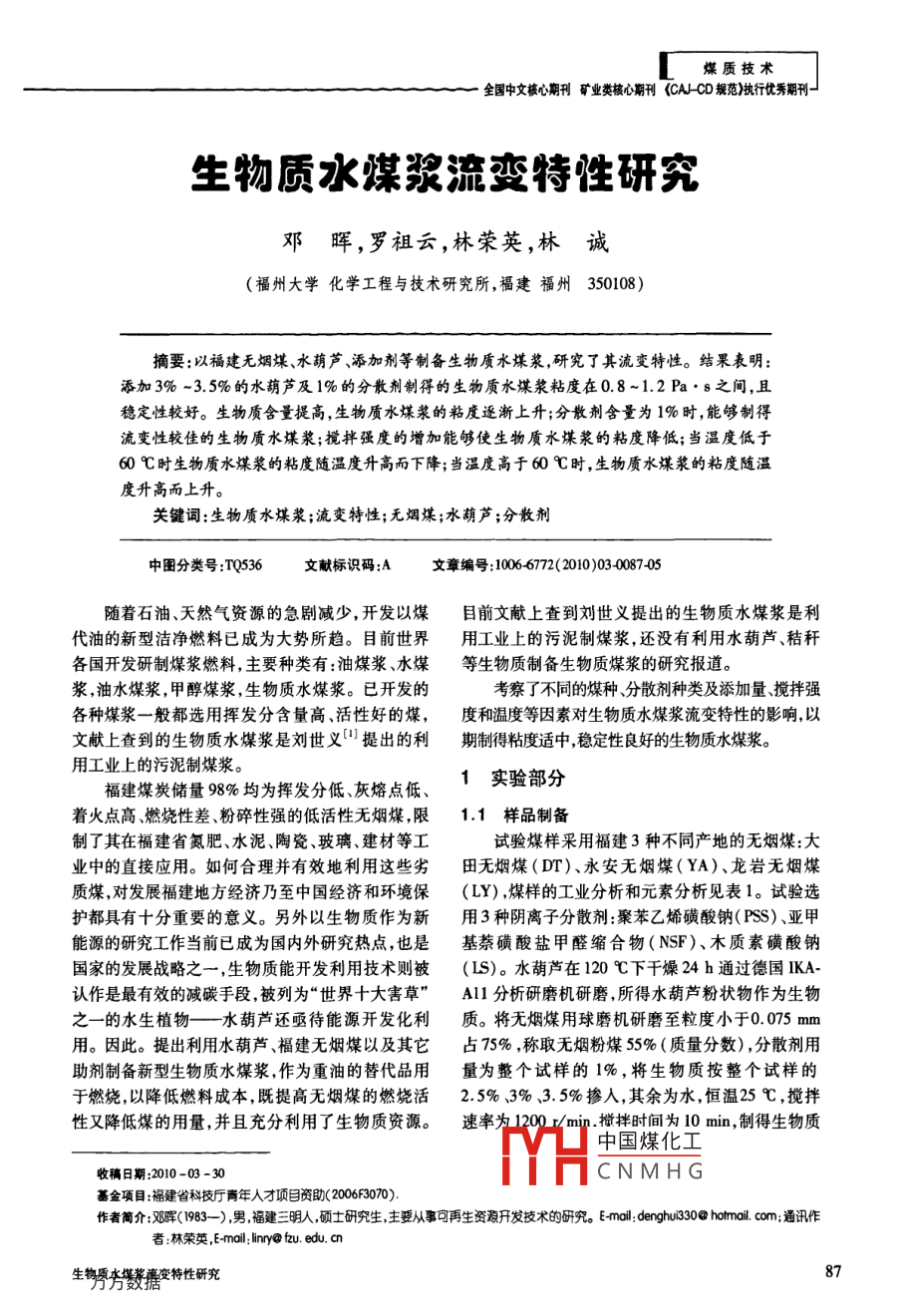 煤質(zhì)技術(shù)一全國(guó)中文核心期刊礦業(yè)類核心期刊《cAcD規(guī)范》執(zhí)行優(yōu)秀期刊生物質(zhì)水煤漿流變特性研究鄧暉,羅祖云,林榮英,林誠(chéng)(福州大學(xué)化學(xué)工程與技術(shù)研究所,福建福州350108)摘要:以福建無(wú)煙煤、水葫蘆、添加劑等制備生物質(zhì)水煤漿,研究了其流變特性。結(jié)果表明:添加3%~3.5%的水葫蘆及1%的分散劑制得的生物質(zhì)水煤漿粘度在0.8~1.2Pa·s之穩(wěn)定性較好。生物質(zhì)含量提高,生物質(zhì)水煤漿的粘度逐漸上升;分散劑含量為1%時(shí),能夠制得流變性較佳的生物質(zhì)水煤漿;攪拌強(qiáng)度的增加能夠使生物質(zhì)水煤漿的粘度降低;當(dāng)溫度低于60℃時(shí)生物質(zhì)水煤漿的粘度隨溫度升高而下降;當(dāng)溫度高于60℃時(shí),生物質(zhì)水煤漿的粘度隨溫度升高而上升。關(guān)鍵詞:生物質(zhì)水煤漿;流變特性;無(wú)煙煤;水葫蘆;分散劑中圖分類號(hào):TQ536文獻(xiàn)標(biāo)識(shí)碼:A文章編號(hào):1006172(2010)03008705隨著石油、天然氣資源的急劇減少,開(kāi)發(fā)以煤目前文獻(xiàn)上查到劉世義提出的生物質(zhì)水煤漿是利代油的新型潔凈燃料已成為大勢(shì)所趨。目前世界用工業(yè)上的污泥制煤漿,還沒(méi)有利用水葫蘆、秸稈各國(guó)開(kāi)發(fā)研制煤漿燃料,主要種類有:油煤漿、水煤等生物質(zhì)制備生物質(zhì)煤漿的研究報(bào)道。漿,油水煤漿,甲醇煤漿,生物質(zhì)水煤漿。已開(kāi)發(fā)的考察了不同的煤種、分散劑種類及添加量攪拌強(qiáng)各種煤漿一般都選用揮發(fā)分含量高、活性好的煤,度和溫度等因素對(duì)生物質(zhì)水煤漿流變特性的影響,以文獻(xiàn)上查到的生物質(zhì)水煤漿是劉世義口提出的利期制得粘度適中穩(wěn)定性良好的生物質(zhì)水煤漿。用工業(yè)上的污泥制煤漿。福建煤炭?jī)?chǔ)量98%均為揮發(fā)分低、灰熔點(diǎn)低、1實(shí)驗(yàn)部分著火點(diǎn)高、燃燒性差、粉碎性強(qiáng)的低活性無(wú)煙煤,限1.1樣品制備制了其在福建省氮肥、水泥、陶瓷、玻璃、建材等工試驗(yàn)煤樣采用福建3種不同產(chǎn)地的無(wú)煙煤:大業(yè)中的直接應(yīng)用。如何合理并有效地利用這些劣田無(wú)煙煤(DT)、永安無(wú)煙煤(YA)、龍巖無(wú)煙煤質(zhì)煤,對(duì)發(fā)展福建地方經(jīng)濟(jì)乃至中國(guó)經(jīng)濟(jì)和環(huán)境保(LY),煤樣的工業(yè)分析和元素分析見(jiàn)表1。試驗(yàn)選護(hù)都具有十分重要的意義。另外以生物質(zhì)作為新用3種陰離子分散劑:聚苯乙烯磺酸鈉(PSS)、亞甲能源的研究工作當(dāng)前已成為國(guó)內(nèi)外研究熱點(diǎn),也是基萘磺酸鹽甲醛縮合物(NSF)、木質(zhì)素磺酸鈉國(guó)家的發(fā)展戰(zhàn)略之一,生物質(zhì)能開(kāi)發(fā)利用技術(shù)則被(LS)。水葫蘆在120℃下干燥24h通過(guò)德國(guó)IKA認(rèn)作是最有效的減碳手段,被列為“世界十大害草”A11分析研磨機(jī)研磨,所得水葫蘆粉狀物作為生物之一的水生植物——水葫蘆還亟待能源開(kāi)發(fā)化利質(zhì)。將無(wú)煙煤用球磨機(jī)研磨至粒度小于0.075mm用。因此。提出利用水葫蘆、福建無(wú)煙煤以及其它占75%,稱取無(wú)煙粉煤55%(質(zhì)量分?jǐn)?shù)),分散劑用助劑制備新型生物質(zhì)水煤漿,作為重油的替代品用量為整個(gè)試樣的1%,將生物質(zhì)按整個(gè)試樣的于燃燒,以降低燃料成本,既提高無(wú)煙煤的燃燒活2.5%、3%3.5%摻人,其余為水,恒溫25℃,攪拌性又降低煤的用量,并且充分利用了生物質(zhì)資源。速率TH擋拌時(shí)間為10min,制得生物質(zhì)中國(guó)煤化工收稿日期:2010-03-30CNMHG基金項(xiàng)目:福建省科技廳青年人才項(xiàng)目資助(20063070)作者簡(jiǎn)介:鄧暉(1983-),男,福建三明人碩士研究生,主要從事可再生資穩(wěn)開(kāi)發(fā)技術(shù)的研究。Emol:Menghu330@hotmail.com;通訊作者林榮英,Emol: linry@ fzu物夯搪變特性研究煤質(zhì)技術(shù)水煤漿。表1煤樣的工業(yè)分析和元素分析工業(yè)分析/%元素分析/%煤種3.4473.320.7113.722.4880.982.470.085.880.80采用美國(guó)麥克ASAP2020MP物理吸附分析儀,2.1煤種對(duì)生物質(zhì)水煤漿粘度的影響利用不同相對(duì)壓力條件下對(duì)應(yīng)的吸附氣體的體積在3種福建無(wú)煙煤中,分別以占整個(gè)樣品數(shù)據(jù),可以計(jì)算出煤樣的比表面積以及孔徑分布2.5%3%、3.5%、4%4.5%的比例添加生物質(zhì),添等。比表面積用BET方法計(jì)算孔體積用BJH法計(jì)加1%分散劑和55%煤粉,其余為水制備生物質(zhì)水算,孔體積-孔徑分布用DFT密度函數(shù)方法。結(jié)煤漿可得不同煤種與生物質(zhì)水煤漿粘度的關(guān)系,果見(jiàn)表2如圖1所示。圖(a)中DT煤與YA煤所得生物質(zhì)水煤漿粘度相差不大,而LY煤較另外2種無(wú)煙煤表2比表面與孔徑分析結(jié)果所得粘度小;圖(b)中DT煤與YA煤所得生物質(zhì)水煤漿粘度仍然相近,且3種無(wú)煙煤在生物質(zhì)含量為單點(diǎn)比表面積/(m2·g1)282.982393.5%時(shí)所得生物質(zhì)水煤漿粘度相近,但是當(dāng)生物吸附平均孔徑寬度/2.28374.8057質(zhì)含量繼續(xù)上升時(shí),LY煤明顯小于另外2種無(wú)1.2性能測(cè)試煙煤。試驗(yàn)采用NXS-11A旋轉(zhuǎn)粘度計(jì)測(cè)試生物質(zhì)水總之,在生物質(zhì)含量為2.5%時(shí),不同的福建無(wú)煤漿的表觀粘
