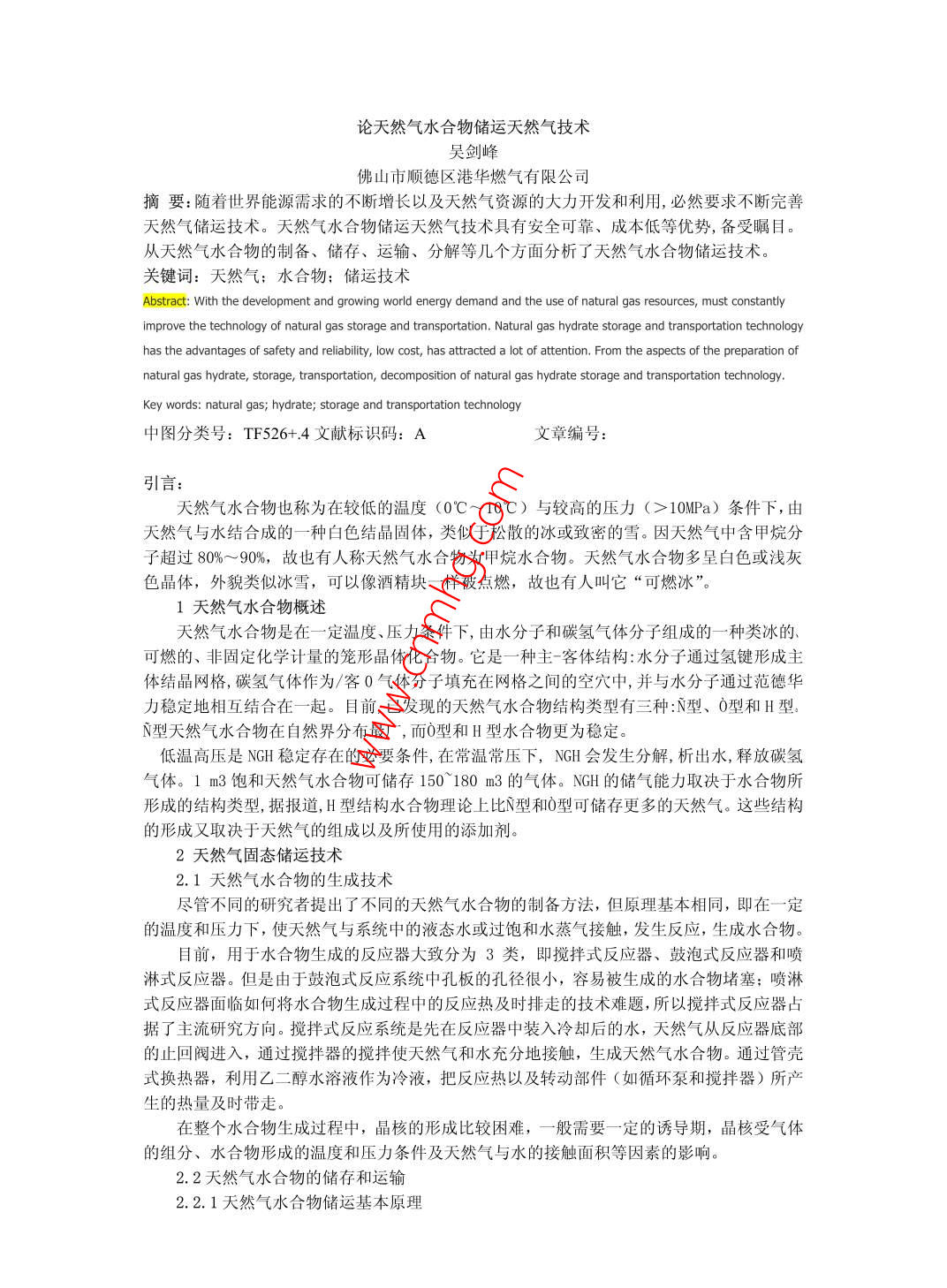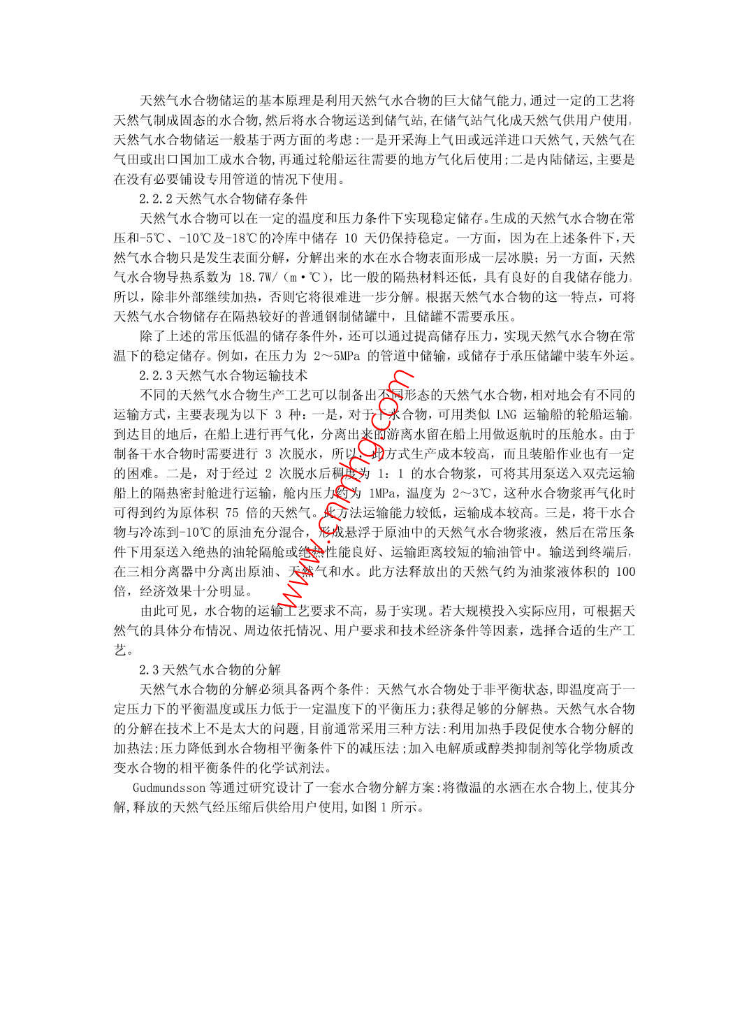 論天然氣水合物儲運天然氣技術(shù)吳劍峰佛山市順德區(qū)港華燃氣有限公司摘要:隨著世界能源需求的不斷增長以及天然氣資源的大力開發(fā)和利用,必然要求不斷完善天然氣儲運技術(shù)。天然氣水合物儲運天然氣技術(shù)具有安全可靠、成本低等優(yōu)勢,備受矚目。從天然氣水合物的制備、儲存、運輸、分解等幾個方面分析了天然氣水合物儲運技術(shù)。關(guān)鍵詞:天然氣;水合物:儲運技術(shù)Abstract: With the development and growing world energy demand and the use of natural gas resources, must constantlyimprove the tehnology of natural gas storage and transportation. Natural gas hydrate storage and transportation technologyhas the advantages of safety and rlabilit, low cost, has ttracted a lot of attention. From the aspects of the preparation ofnatural gas hydrate, storage, transportation, decomposition of natural gas hydrate storage and transportation technology.Key words: natural gas; hydrate; storage and transportation technology中圖分類號: TF526+.4 文獻標(biāo)識碼: A .文章編號:引言:天然氣水合物也稱為在較低的溫度(0°C~10C) 與較高的壓力(> 10MPa)條件下,由天然氣與水結(jié)合成的一種白色結(jié)晶固體,類似于松散的冰或致密的雪。因天然氣中含甲烷分子超過80%~90%,故也有人稱天然氣水合物為甲烷水合物。天然氣水合物多呈白色或淺灰色晶體,外貌類似冰雪,可以像酒精塊一樣被點燃, 故也有人叫它“可燃冰”。1天然氣水合物概述天然氣水合物是在一定溫度、 壓力條件下,由水分子和碳氫氣體分子組成的一種類冰的、可燃的、非固定化學(xué)計量的籠形晶體化合物。它是一種主-客體結(jié)構(gòu):水分子通過氫鍵形成主體結(jié)晶網(wǎng)格,碳氫氣體作為/客0氣體分子填充在網(wǎng)格之間的空穴中,并與水分子通過范德華力穩(wěn)定地相互結(jié)合在一起。目前,已發(fā)現(xiàn)的天然氣水合物結(jié)構(gòu)類型有三種:N型、0型和H型。N型天然氣水合物在自然界分布最廣,而0型和H型水合物更為穩(wěn)定。低溫高壓是NGH穩(wěn)定存在的必要條件,在常溫常壓下,NGH會發(fā)生分解,析出水,釋放碳氫氣體。1 m3飽和天然氣水合物可儲存150^ 180 m3的氣體。NGH的儲氣能力取決于水合物所形成的結(jié)構(gòu)類型,據(jù)報道,H型結(jié)構(gòu)水合物理論上比N型和0型可儲存更多的天然氣。這些結(jié)構(gòu)的形成又取決于天然氣的組成以及所使用的添加劑。2天然氣固態(tài)儲運技術(shù)2.1天然氣水合物的生成技術(shù)盡管不同的研究者提出了不同的天然氣水合物的制備方法,但原理基本相同,即在一定的溫度和壓力下,使天然氣與系統(tǒng)中的液態(tài)水或過飽和水蒸氣接觸,發(fā)生反應(yīng),生成水合物。目前,用于水合物生成的反應(yīng)器大致分為3類,即攪拌式反應(yīng)器、鼓泡式反應(yīng)器和噴淋式反應(yīng)器。但是由于鼓泡式反應(yīng)系統(tǒng)中孔板的孔徑很小,容易被生成的水合物堵塞;噴淋式反應(yīng)器面臨如何將水合物生成過程中的反應(yīng)熱及時排走的技術(shù)難題,所以攪拌式反應(yīng)器占據(jù)了主流研究方向。攪拌式反應(yīng)系統(tǒng)是先在反應(yīng)器中裝入冷卻后的水,天然氣從反應(yīng)器底部的止回閥進入,通過攪拌器的攪拌使天然氣和水充分地接觸,生成天然氣水合物。通過管殼式換熱器,利用乙二醇水溶液作為冷液,把反應(yīng)熱以及轉(zhuǎn)動部件(如循環(huán)泵和攪拌器)所產(chǎn)生的熱量及時帶走。在整個水合物生成過程中,晶核的形成比較困難,一般需要一 定的誘導(dǎo)期, 晶核受氣體的組分、水合物形成的溫度和壓力條件及天然氣與水的接觸面積等因素的影響。2. 2天然氣水合物的儲存和運輸2.2.1天然氣水合物儲運基本原理天然氣水合物儲運的基本原理是利用天然氣水合物的巨大儲氣能力,通過一定的工藝將天然氣制成固態(tài)的水合物,然后將水合物運送到儲氣站,在儲氣站氣化成天然氣供用戶使用,天然氣水合物儲運一-般基 于兩方面的考慮:-是開采海上氣田或遠洋進口天然氣,天然氣在氣田或出口國加工成水合物,再通過輪船運往需要的地方氣化后使用;二是內(nèi)陸儲運,主要是在沒有必要鋪設(shè)專用管道的情況下使用。2.2. 2天然氣水合物儲存條件天然氣水合物可以在一-定的溫度和壓力條件下實現(xiàn)穩(wěn)定儲存。生成的天然氣水合物在常壓和- 5°C、-10'C及-18C的冷庫中儲存10天仍保持穩(wěn)定。一.方面,因為在上述條件下,天然氣水合物只是發(fā)生表面分解,分解出來的水在水合物表面形成一層冰膜; 另一方面, 天然氣水合物導(dǎo)熱系數(shù)為18. 7W/ (m●°C),比一-般的隔熱材料還低,具有良好的自我儲存能力。所以,除非外部繼續(xù)加熱,否則它將很難進一步分解。根據(jù)天然氣水合物的這一-特點, 可將天然氣水合物儲存在隔熱較好的普通鋼制儲罐中,且儲罐不需要承壓。除了上述的常壓低溫的儲存條件外,還可以通過提高儲存壓力,實現(xiàn)天然氣水合物在常溫下的穩(wěn)定儲存。例如,在壓力為2~5MPa 的管道中儲輸,或儲存于承壓儲罐中裝車外運。2. 2.3天然氣水合物運輸技術(shù)不同的天然氣水合物生產(chǎn)工藝可以制備出不同形態(tài)的天然氣水合物,相對地會有不同的運輸方式,主要表現(xiàn)為以下3種:一是, 對于干水合物,可用類似LNG運輸船的輪船運輸。到達目的地后,在船