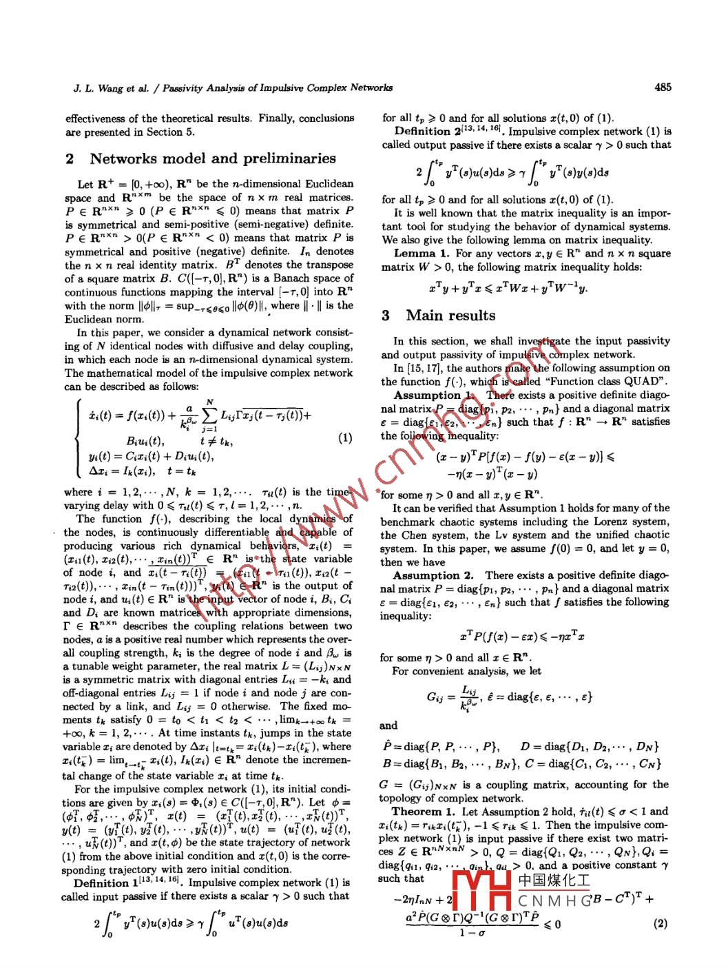 International Journal of Automation and Computing8(4), November 2011, 484-489DOI: 10.1007/811633-011-0607-zPassivity Analysis of Impulsive Complex NetworksJin-Liang Wang'Huai-Ning Wu1Zhi-Chun Yang2Science and Technology on Aircraft Control Laboratory, School of Automation Science and Electrical Engineering, Beihang University,Beijing 100191, PRC2College of Mathematice Science, Chongqing Normal Universit, Chongqing 400047, PRCAbstract: In this paper, we first investigate input passivity and output passivity for a class of impulsive complex networks withtime varying delays. By constructing suitable Lyapunov functionals, some input passivity and output passivity conditions are derivedfor the impulsive complex networks. Finally, an example is given to show the effectiveness of the proposed criteria.Keywords: Impulsive complex networks, time varying delays, input p88sive, output passive, Lyapunov functional.1 Introductionsystems and neural networks, and many interesting resultshave been derived!5-12. Song et al.l8l investigated the pas-In the past ten years, there have been much activity tosivity for a cla8s of discrete-time stochastic neural networkswards studying the topology and dynamical behavior ofwith time varying delays. A generalized activation functioncomplex networks across manyfields of science and enwas considered, where the traditional assumptions on thegineering, such as power grids, communication networks,boundedness, monotony and differentiability of the activa-and Internet, the World Wide Web, metabolic systems,tion functions were removed. A delay-dependent pa88ivityfood webs, etc. One of the most remarkable phenomenacondition was derived in terms of linear matrix inequali-in the dynamics of complex networks is their spontaneousties (LMIs) by constructing a proper Lyapunov-Krasovskiisynchronizationl, which has been extensively investigated.functional and stochastic analysis technique. To our knowl-It is well known that impulsive effects are common pheedge, there are few studies on the passivity of complex dy-nomena in many systems such as computer networks, au-namical networks(13,14, in which Yao et al. obtained sometomatic control systems, signal processing systems andsuficient conditions on passivity properties for linear (ortelecommunications. Therefore, the study of complex netlinearized) complex dynamical networks with and withoutworks with impulsive effects is important for understandingcoupling delays (constant delay). However, in the practi~the dynamical behaviors of real networks. Recently, syn-cal evolutionaryprocesses of networks, absolute constantchronization of impulsive complex dynamical networks hasdelay may be scarce and delays frequently vary with time.been investigated by researchers. For instance, Cai et al.lTherefore, such simplifcation does not match the peculiari-investigated robust impulsive synchronization of complexties of real networks in many circumstances, and it is neces-delayed dynamical networks with nonsymmetrical couplingsary to further investigate the passivity properties of com-from the view point of dynamics and control. Some criplex delayed dynamical networks. In [11], Chen and Leeteria for robust impulsive synchronization were establishedfirst developed input passivity to study both input-outputand internal stability problems for feedback connections ofsystems. In [3], Li and Lai studied the adaptive impulsivediscrete-time linear descriptor systems. By applying thesynchronization of uncertain complex dynamical networks.input passivity and Lyapunov theory, Chang et al.L2] de-On the basis of the stability analysis of impulsive system,rived the relaxed stability conditions to guarantee the sta-several network synchronization criteria for local and globalbility and passivity property of closed-loop systems. Toadaptive-impulsive synchronization were established. Zhouthe best of our knowledge, the input passivity of impul-et al.(4) investigated the synchronization of complex delayeddynamical networks with impulsive effects. Some criteriabeen established. Therefore, it is important and interestingwere derived for global synchronization based on the im-to study the input passivity of impulsive complex networkspulsive stability theory.with time-varying delays.On the other hand, passivity is also an important conceptMotivated by the above discussions, we investigate theof system theory and plays an important role in both elec-input passivity of complex delayed dynamical networks withtrical networks and nonlinear control systems, and providesimpulsive effects. As a natural extension of input passivity,a nice tool for analyzing the stability of systems. Therefore,we also introduce the output passivity in order to studythe passivity theory has received a lot of attention. In recentthe dynamical behavior of impulsive complex networks in ayears, some researchers have studied the passivity of fuzzymuch better way.The rest of thThis work was supported by National Natural Science FaSection 2, ou中國(guó)煤化工opulsive complexdation. of. China_ (No. 10971240,No. 6100404,No 61074057),networks withCN M H Gsented and some(No. CSTC2008BB2364),F(xiàn)oundation of Science and Technologypreliminaries ac g:YH∈ai ipui auu output passivityProject of Chongqing Education Commission(No. KJ080806), Fun-criteria are established in Section 3. In Section 4, a numer-nd& for the Central Universities, China(No. YWF- 10-01-A19).ical example and its simulation are given to illustrate theJ. L. Wang et al. / Passivity Analysis of Impulsive Complex Networks485effectiveness of the theoretical results. Finally, conclusionsfor all tp≥0 and for all solutions x(t,0) of (1).are presented in Section 5.Definition 2Impulsive complex network (1) iscalled output passive if there exists a scalar ry > 0 such that2 Networks model and preliminariesLet R+ = [0, +∞), R" be the n-dimensional Euclideanspace and rnxm be the space of nx m real matrices.P∈Rnxn≥0(P∈R"xn≤0)meansthatma