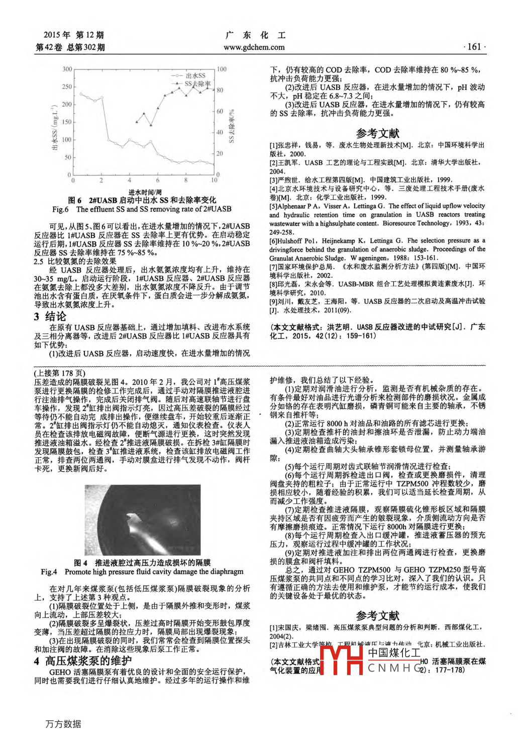2015年第12期廣東化工第42卷總第302期www.gdchem.com177GEHO活塞隔膜泵在煤氣化裝置的應用趙強,李瑞才,王亞輝渭河煤化工集團有限責任公司,陜西渭南714000摘要]介紹了 GEHO TZPM型號活塞隔膜泵在渭化煤氣化裝置的應用情況,簡述了 GEHO TZPM50與 GEHO TZPM250型號高壓煤漿泵的共同點和不同點,并從操作和維護層面對高壓煤漿泵進行著重介紹,針對典型的問題進行了分析和判斷,總結了維修經(jīng)驗?!戈P鍵詞]活塞隔膜泵;高壓煤漿泵;氣化裝置:典型問題:分析維護中圖分類號TQ[文獻標識碼]A[文章編號]1007-1865(2015)120177-02GEHO Diaphragm Piston Pump in the Application of Coal Gasification DeviceZhao Qiang, Li Ruicai, Wang Yahui(Weihe Coal Chemical Ltd, Weinan 714000, ChinaAbstract: Introduces the GEHO TZPM type piston diaphragm pump in the application of coal gasification device, nutrient-laden introduced GEHO TZPM500with GEHO TZPM250 type high-pressure coal slurry pump similarities and differences, and from the operation and maintenance level of high-pressure coal slurrypump is introduced, aiming at the typical problems are analyzed and judgment, maintenance experience is summarized.Keywords: the piston diaphragm pump: high-pressure coal slurry pump: gasification unit: typical problems: analysis of the maintenance高壓煤漿泵是水煤漿氣化裝置的關鍵設備,用來給氣化爐提運動,推動隔膜,通過隔膜室容積和壓力的變化實現(xiàn)對介質的輸?shù)腉EHO隔膜活塞泵和德國的 FELUWA軟管隔膜活塞泵。在渭塞潤滑系統(tǒng)、一個推進液系統(tǒng)。入口和出口分別配置有脈動緩沖化氣化裝置中(包括已建成投產(chǎn)的2期裝置),共使用了4臺GEHO裝置。高壓隔膜活塞泵,其中TZPM250型號3臺,TZPM500型號1臺。1 GEHO TZPM型號活塞隔膜泵簡介表1TZPM250與TZPM500參數(shù)對比GEHO活塞隔膜泵其TZPM型號是往復式定容排液泵,是為TZPM250 compared with TZPM5O0 parameters處理含有固體物質流體而設計的,特別適用于含有磨蝕性介質的性能參數(shù)Qm3h) P/MPa N/(s min)Pkw場合,如煤漿、泥漿和礦泥。泵送介質流量的改變通過變頻電機TZPM50017~759.51l1~4849~212的轉速調節(jié)而實現(xiàn)。泵送含固介質與處于推進液中的運動部件如TZPM25017.3~40.2952257~598491~1144活塞、缸套相隔離。橡膠隔膜是隔離部件,中心嵌入有一個扁錐注:N為往復泵每分鐘沖程數(shù)形鋼板并在其推進液側聯(lián)結有一個帶有磁鐵的監(jiān)測桿,正常操作時隔膜中心錐形板區(qū)域不與隔膜室前蓋和后壁接觸,通過位置開在設備方面2期TZPM500較1期TZPM250有了許多改進。關來限制隔膜在正確的區(qū)間往復運動。隔膜室介質側底部聯(lián)結吸(1)減速機為兩級減速,輸出軸通過齒式聯(lián)軸節(jié)直聯(lián)曲軸,減入閥室和管道,頂部聯(lián)結排出閥室和管道。部件如活塞密封環(huán)速機配置了冷卻水;TzPM250是一級減速,輸出軸通過齒式聯(lián)軸缸套、活塞桿可被視作無磨損部件。唯一磨損的部件是吸入和排節(jié)聯(lián)接一副齒輪驅動曲軸。出閥閥盤,泵隔膜是可更換部件。 GEHO TZPM型號活塞隔膜泵(2)曲軸的材質變更為鍛件,可在高負荷下有更好的穩(wěn)定性。簡圖見圖1(3)曲軸輸入端增設了接近開關,直接對曲軸轉速進行檢測和輸出(4)動力端強制潤滑系統(tǒng)與TZPM250不同的是入口濾網(wǎng)由油箱內置改為外置,出口由單濾網(wǎng)和旁路改進為可切換的雙濾筒,路增設了流量感應器和流量開關。動力端油流量低則報警,低低則聯(lián)鎖泵跳車。系統(tǒng)提供對泵十七個潤滑點的潤滑。(5)TZM500最大的改進在推進液和活塞沖洗油系統(tǒng)TZPM250是兩個獨立的系統(tǒng),見圖2。而TZPM500把兩者并為個系統(tǒng),使用一個油泵來提供推進液和沖洗油,設備得到了簡化而控制系統(tǒng)增加了復雜性。油路總管增設了流量感應器和流量開關。泵出口壓力有3個開關值:1000kPa,500kPa,400kPac斷去活塞桿潤滑油路,專供推進液蓄壓器充壓—若壓力高于1000kPa,則程控閥門開啟溝通去活塞桿潤滑油路,若條件不具備程控閥門持續(xù)關閉超過1min,程控閥門會開啟5s以防止活塞失潤滑情況發(fā)生。壓力低于400kPa會給出報警信號。TZPM5003圖1 GEHO TZPM型號泵簡圖個推進液腔安裝有現(xiàn)場壓力計,通過其運行壓力,可以直觀準確地判斷3個隔膜室是否在正常工作。Fig 1 GEHO TZPM type pump diagramT2(6TzPM250每個推進液腔各自設置兩個安全閥,而M5003個推進液腔通過管線聯(lián)結起來,共用安全閥,在2 GEHO TZPM500與 GEHO TZPM50型號3個推進液腔至安全閥的管線上設置有止逆閥,設備得到了簡化,高壓煤漿泵的比較壓。這將是我們在使用泵過程中應該注意的問題渭化1期氣化裝置(q2.8mq2.8m,投煤漿量346m3/h)選用(7)TZPM500采用API8型錐形閥門,直徑110膜直了3臺 GEHO TZPM250型號高壓水煤漿泵,2期氣化裝置(q28徑520m,T門,直徑90mm,隔m/32m,投煤漿量56m/h)考慮選型的一致性和性能需求選用膜直徑44m中國煤化工大至75L,以更好地了1臺 GEHO TZPM500型號其性能參數(shù)比較如表減少泵入口壓GEHO TZPM500與TZPM250泵均為3缸單作用(8)更重CNMHG配置了帶有觸摸屏的通過減速機驅動120°分布的曲軸帶動活塞,改變旋轉運動為往復制器??刂破鞒丝梢詫Ρ眠M行控制操作外,還提供了256條[收稿日期]201505-21作者簡介]趙強1977),男,陜西華縣人,大學本科,渭化氣化車間主任、工程師,主要研究方向為煤化工研究生產(chǎn)廣東化工2015年第12期178www.gdchem.com第42卷總第302期操作記錄,256條警報記錄,泵操作壓力與時間的