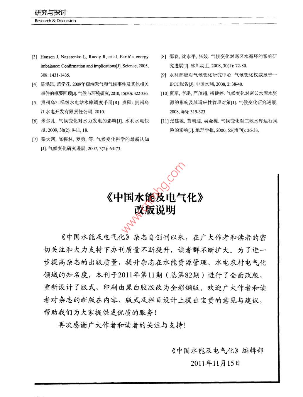 研究與探討Research & Discussion[3] Hansen J, Nazarenko L, Ruedy R, et al. Earth' s energy[8]邵春, 沈永平,張姣.氣候變化對寒區(qū)水循環(huán)的影響研imbalance: Confirmation and implications[J]. Science, 2005,究進展[]冰川動t, 2008, 30(1): 72-80.308: 1431-1435.[9]水利部應對氣候變化研究中心氣候變化權(quán)威報告一[4] 陳洪濱,范學花2009年極端天氣和氣候事件及其他相關IPCC報告[D中國水利, 2008, 2: 38-40.事件的概要回顧[I]氣候與環(huán)境研究,2010, 15(30): 32336.[10]夏軍,李璐,嚴茂超,褚健婷.氣候變化對密云水庫水資[5]貴州烏江梯級水電站水庫調(diào)度手冊[R].貴陽:貴州烏源的影響及其適應性管理對策[].氣候變化研究進展,江水電開發(fā)有限責任公司, 2010.2008, 4(6): 319-323.[6]米爾扎.氣候變化對水力發(fā)電的影響[].水利水電快[11]張建敏,黃朝迎,吳金棟.氣候變化對三峽水庫運行風報, 2009, 30(2): 9-11, 18.險的影響[].地理學報, 2000, 55(增刊): 26-33.7] 秦大河,陳振林,羅勇,等.氣候變化科學的最新認知[].氣候變化研究進展, 2007, 3(2): 63-73.《中國水能及電氣化》改版說明《中國水能及電氣化》雜志自創(chuàng)刊以來,在廣大作者和讀者的密切關注和大力支持下辦刊質(zhì)量不斷提升,讀者群不斷擴大。為了進一步提高雜志的出版質(zhì)量,提升雜志在水能資源管理、水電農(nóng)村電氣化領域的知名度,本刊于2011年第11期(總第82期)進行了全面改版,重新設計了版式,印刷由黑白膠版改為全彩銅版。歡迎廣大作者和讀者對雜志的新版在內(nèi)容、版式及欄目設計上提出寶貴的意見與建議,幫助我們?yōu)榇蠹姨峁└鼉?yōu)質(zhì)的服務!再次感謝廣大作者和讀者的關注與支持!《中國水能及電氣化》編輯部2011年11月15日
