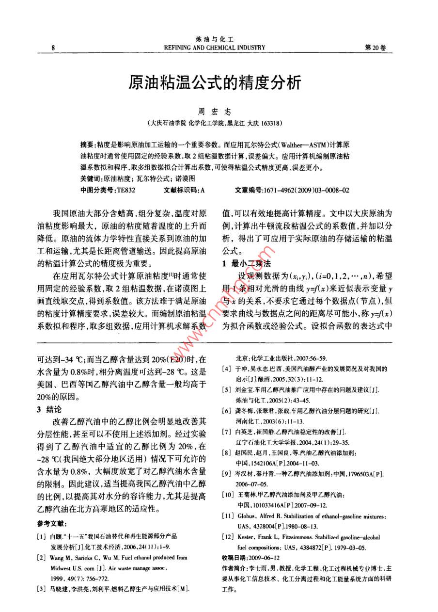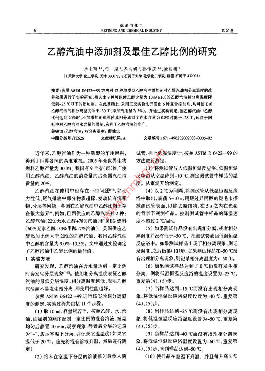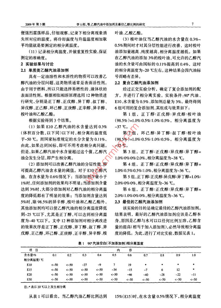 煉油與化工REFINING AND CHEMICAL INDUSTRY第20卷乙醇汽油中添加劑及最佳乙醇比例的研究李士雨12,司瑞,齊向娟',孫傳慶12,徐麗梅(1天津大學(xué)化工學(xué)院天津300072:2石河子大學(xué)化學(xué)化工學(xué)院新疆石河子43003)摘要:參照 ASTM D642299方法對12種單質(zhì)型乙醇汽油添加劑對乙醇汽油相分離溫度的改善效果進行了實驗研究,篩選出9種可以使乙醇含量為10%(E10)的乙醇汽油相分離溫度降低到-25℃以下的添加劑。在此基礎(chǔ)上,采用正交實驗法開發(fā)出6種復(fù)合添加劑均可使E10乙醇汽油的相分離溫度低于-30℃(添加劑用量為3%)。并通過實驗確定,當(dāng)乙醇汽油中乙醇比例達到20%時,不加添加劑也可使其相分離溫度在水含量為0.8%時低于-28℃,遠(yuǎn)高于國標(biāo)中對乙醇汽油水含量的限制,有利于乙醇汽油的推廣。關(guān)鍵詞:乙醇汽油;相分離溫度;醇油比中圖分類號:TE626文獻標(biāo)識碼:A文章編號:1671-4962(2009)03-000-0近年來,乙醇汽油作為一種新型的車用燃料,試管,插上低溫溫度計,按照 ASTM D6422-99的得到了世界各國的高度重視。2005年全世界生物方法進行測定。燃料乙醇產(chǎn)量為30Mt。我國有9個省(市)推廣使(3)將測試管放入低溫恒溫反應(yīng)浴。低溫恒溫用乙醇汽油,乙醇汽油的消費量約占全國汽油消反應(yīng)浴從室溫降到-10℃,測定測試管中樣品的溫費量的20%。度。從室溫開始測定。乙醇汽油在使用中也存在一些問題5,如動4)以2℃為間隔將測試管從低溫恒溫反應(yīng)力性低、尾氣排放中部分物質(zhì)超標(biāo)、發(fā)動機有沉積浴中取出,震蕩5~10s,用蘸過異丙醇的濕毛巾擦物、分層等問題。各國在乙醇汽油中乙醇比例上存拭測試管表面,以除去凝結(jié)物在5s之內(nèi)在光亮在很大差異,例如,巴西供應(yīng)的乙醇汽油有2種:的背景下觀測樣品??刂茰y試管中樣品的降溫速乙醇汽油(22%無水乙醇+78%汽油)和MEG燃料度不超過2℃/min。(60%無水乙醇+33%甲醇+7%汽油),美國供應(yīng)乙(5)如果測試樣品沒有出現(xiàn)相分離,或者相分醇添加比例大于20%的乙醇汽油,我國乙醇汽油離溫度并沒有低于-50℃,把測試管放回低溫恒溫中乙醇的含量為90%-10.5%。文中通過實驗確定反應(yīng)浴中。如果測試樣品出現(xiàn)了相分離現(xiàn)象,則記了乙醇汽油中乙醇比例的最佳值。錄溫度,之后做第(10)步。如果測試樣品在-50℃沒1實驗方法有出現(xiàn)相分離現(xiàn)象則記錄相分離溫度為<-50℃研究發(fā)現(xiàn),乙醇汽油在含水量達到一定比例(6)如果測試樣品達到了0℃仍沒有發(fā)生相時會發(fā)生分層現(xiàn)象。使用相分離溫度表征乙醇分離,則將低溫恒溫反應(yīng)浴的溫度設(shè)置為-25℃,汽油的最低分層溫度,相分離溫度越低,表明乙醇重復(fù)第(4)、(5)步。汽油越不易發(fā)生相分離,即使用性能越好。(7)當(dāng)樣品達到-15℃而沒有出現(xiàn)相分離現(xiàn)參照 ASTM D642299進行該實驗相分離溫象,將低溫恒溫反應(yīng)浴溫度設(shè)置為-40℃,重復(fù)第度的測定,實驗過程共包括11個步驟。(4)、(5)步。1)取10mL容量瓶若干,按照乙醇、水汽8)當(dāng)樣品達到-25℃而沒有出現(xiàn)相分離現(xiàn)油、添加劑的順序配制一定比例的混合溶液,搖晃象將低溫恒溫反應(yīng)浴溫度設(shè)置為-50℃,重復(fù)第均勻后靜置10min,觀察現(xiàn)象靜置后分層的記錄(4)、(5)步為“-”,表示室溫下分層,并記錄室溫溫度(如果室(9)當(dāng)樣品達到-40℃而沒有出現(xiàn)相分離現(xiàn)溫低于20℃,應(yīng)先將混合溶液升溫,然后進行測象,將低溫恒溫反應(yīng)浴溫度設(shè)置為-60℃,重復(fù)第定)。(4)、(5)步,直到樣品達到-50℃(2)將未在室溫下分層的溶液搖勻后倒入測(10)使樣品在室溫下升溫,并且每升高2℃00年第3期李土雨等乙醇汽油中添加劑及最佳乙醇比例的研究便強烈震蕩樣品,仔細(xì)觀察,記錄下相分離現(xiàn)象消葉油、乙酸乙酯。失所對應(yīng)的溫度。將冷卻溫度與升溫溫度相加取(3)桉葉油僅當(dāng)乙醇汽油的水含量在03%平均值就是要測定的相分離溫度。0.5%期間時才對其分層性能進行改善,這時桉葉(11)記錄相分離溫度,并做重復(fù)性實驗,保證油添加量越高、純度越高,相分離溫度越低。如果測定的準(zhǔn)確度。在乙醇汽油的添加3%的桉葉油,可允許的乙醇汽2實驗結(jié)果與討論油的水含量可由國標(biāo)的0.11%提高到04%,這時21單質(zhì)類乙醇汽油添加劑的相分離溫度為-20℃左右。這種結(jié)果會因汽油標(biāo)具有一定油溶性和水溶性的物質(zhì)可以改善乙號而略有差異。醇汽油的分層問題,這類物質(zhì)通常是表面活性劑。22復(fù)合乙醇汽油添加劑由于用于燃料,所以只能選擇易燃性的、液體狀的經(jīng)過正交實驗分析,確定了復(fù)合添加劑的配表面活性劑。根據(jù)相似相溶原理選用12種物質(zhì)進方,并進行了相分離實驗。實驗條件:90汽油、行研究,分別是正丁醇、正戊醇、異丁醇、叔丁醇、E10、水含量為0.5%添加劑總量為3%。最終得到異戊醇、正己醇、環(huán)己醇、正庚醇、正辛醇、異辛醇、6組可用的復(fù)合添加劑,其組成與效果如下:桉葉油和乙酸乙酯。第1組,正丁醇:正戊醇:異戊醇:桉葉油根據(jù)實驗得到3個結(jié)果。(985%)=1.0%0.5%:1.0%:0.5%,相分離溫度為(1)如果E10乙醇汽油的水含量達到03%-37℃。(體積百分?jǐn)?shù),以下同)以下時,相分離的溫度低第2組,環(huán