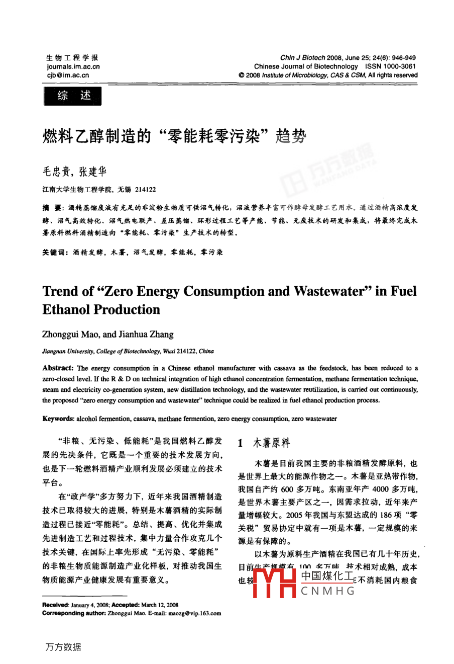 生物工程學(xué)報(bào)Chin J Biotech 2008, June 25: 24(6): 946-949journals. imaccnChinese Journal of Biotechnology IssN 1000-3061cjb e imaccn@2008 Institute of Microbiology, CAs& CSM, All rights reserved綜述燃料乙醇制造的“零能耗零污染”趨勢(shì)毛忠貴,張建華江南大學(xué)生物工程學(xué)院,無錫214122摘要:酒精蒸餾廢液有充足的非淀粉生物質(zhì)可供沼氣轉(zhuǎn)化,沼液營(yíng)養(yǎng)肀富可作酵母發(fā)酵工藝用水。通過酒精髙濃度發(fā)酵、沼氣高效轉(zhuǎn)化、沼氣熱電聯(lián)產(chǎn)、差壓蒸餾、環(huán)形過程工藝等產(chǎn)能、節(jié)能、無廢技術(shù)的研發(fā)和集成,將最終完成木薯原料燃料酒精制造向“零能耗、零污染”生產(chǎn)技術(shù)的轉(zhuǎn)型鍵詞:酒精發(fā)酵,木薯,沼氣發(fā)酵,零能耗,零污染Trend of"Zero Energy Consumption and Wastewater"in FuelEthanol productionZhonggui Mao, and Jianhua ZhangJiangnan University, College of Biotechnology, Wuxi 214122, ChinaAbstract: The energy consumption in a Chinese ethanol manufacturer with cassava as the feedstock, has been reduced to azero-closed level. If the r& d on technical integration of high ethanol concentration fermentation, methane fermentation technique,steam and electricity co-generation system, new distillation technology, and the wastewater reutilization, is camied out continuously,the proposed"zero energy consumption and wastewater"technique could be realized in fuel ethanol production process.Keywords: alcohol fermention, cassava, methane fermention, zero energy consumption, zero wastewater“非糧、無污染、低能耗”是我國(guó)燃料乙醇發(fā)1木薯原料展的先決條件,它既是一個(gè)重要的技術(shù)發(fā)展方向,也是下一輪燃料酒精產(chǎn)業(yè)順利發(fā)展必須建立的技術(shù)木薯是目前我國(guó)主要的非糧酒精發(fā)酵原料,也平臺(tái)。是世界上最大的能源作物之一。木薯是亞熱帶作物在“政產(chǎn)學(xué)”多方努力下,近年來我國(guó)酒精制進(jìn)我國(guó)自產(chǎn)約600多萬(wàn)噸。東南亞年產(chǎn)4000多萬(wàn)噸,是世界木薯主要產(chǎn)區(qū)之一,因需求拉動(dòng),近年來產(chǎn)技術(shù)已取得較大的進(jìn)展,特別是木薯酒精的實(shí)際制量增幅較大。2005年我國(guó)與東盟達(dá)成的186項(xiàng)“零造過程已接近“零能耗”??偨Y(jié)、提高、優(yōu)化并集成關(guān)稅”貿(mào)易協(xié)定中就有一項(xiàng)是木薯,一定規(guī)模的來先進(jìn)制造工藝和過程技術(shù),集中力量合作攻克幾個(gè)源是有保障的。技術(shù)關(guān)鍵,在國(guó)際上率先形成“無污染、零能耗”以木薯為原料生產(chǎn)酒精在我國(guó)已有幾十年歷史,的非糧生物質(zhì)能源制造產(chǎn)業(yè)化樣板,對(duì)推動(dòng)我國(guó)生目前10n多萬(wàn)咖枯術(shù)相對(duì)成熟,成本物質(zhì)能源產(chǎn)業(yè)健康發(fā)展有重要意義。也較YHE中國(guó)煤化工不消耗國(guó)內(nèi)糧食CNMHGReceIved: January 4, 2008: Accepted: March 12, 2008CorrespondingauthorZhongguiMaoE-mail:maozg@vip.163.com忠貴等:燃料乙醇制造的“零能耗零污染”趨勢(shì)947和不擠占耕地的前提下保持一個(gè)合適的規(guī)模是適很快。宜的。23酒精差壓蒸餾差壓蒸餾實(shí)質(zhì)上是雙效蒸餾技術(shù)。安徽宿縣從2幾個(gè)重要的產(chǎn)能和節(jié)能技術(shù)法國(guó)引進(jìn)第一套裝置至今已有20年歷史,期間經(jīng)歷21沼氣發(fā)酵酒精工業(yè)不景氣,企業(yè)普遍規(guī)模小投資大因而實(shí)際木薯酒精蒸餾廢液的COD高達(dá)80001000推廣緩慢。2000年以后四個(gè)規(guī)模化的燃料酒精定點(diǎn)ppm固液分離前),CN為25-30,處于沼氣發(fā)酵CN企業(yè)全部采用差壓蒸餾技術(shù),國(guó)內(nèi)其他年產(chǎn)10萬(wàn)噸比的最佳范圍內(nèi),加上蒸餾廢液本身溫度較高以上非定點(diǎn)的酒精生產(chǎn)企業(yè)也在逐步使用中,技術(shù)(100C左右因而容易實(shí)現(xiàn)沼氣的高溫發(fā)酵。十多年已比較成熟。實(shí)際運(yùn)行噸酒精可節(jié)約蒸餾耗汽35%,來木薯酒精廢液的沼氣發(fā)酵在工藝和工程技術(shù)上進(jìn)相當(dāng)于酒精生產(chǎn)全過程節(jié)約蒸汽23%。步很大,特別是2級(jí)串聯(lián)的UASB厭氧發(fā)酵工藝。2.4高濃度酒精發(fā)酵新建的UASB反應(yīng)器單只容量一般都在3000m3,最我國(guó)玉米酒精發(fā)酵濃度一般在12%,較美國(guó)普大的已達(dá)500m3。木薯酒精蒸餾廢液的沼氣發(fā)酵技遍在15%以上相差3個(gè)百分點(diǎn)。而木薯原料因營(yíng)養(yǎng)術(shù)已成為大規(guī)模工業(yè)沼氣發(fā)酵的成功典范。國(guó)內(nèi)一較玉米差,發(fā)酵濃度更低,僅9%-10%。酒精高濃度般產(chǎn)沼氣水平為260Nm3酒精(∞5%,W,最好的發(fā)酵既能提高裝備產(chǎn)能,又能較大幅度降低能耗,已達(dá)330Nm/t酒精,其主要差異在沼氣發(fā)酵工藝如酒精濃度從12%提高到15%,則蒸餾蒸汽消耗降的安排上,即先固液分離后沼氣發(fā)酵還是2級(jí)串低15%。因而高濃度酒精發(fā)酵是一個(gè)重要的技術(shù)方聯(lián)中間分離,后者因生物質(zhì)轉(zhuǎn)化更為充分故沼氣產(chǎn)向”,玉米酒精發(fā)酵濃度15%,木薯酒精發(fā)酵濃度量大1213%應(yīng)是近期比較合理的目標(biāo)。盡管沼氣發(fā)酵技術(shù)進(jìn)步很大,但仍有很大潛力木薯酒精廢液中還剩余40%的固態(tài)生物質(zhì)(未溶3酒精制造“零能耗”的實(shí)現(xiàn)解的纖維和