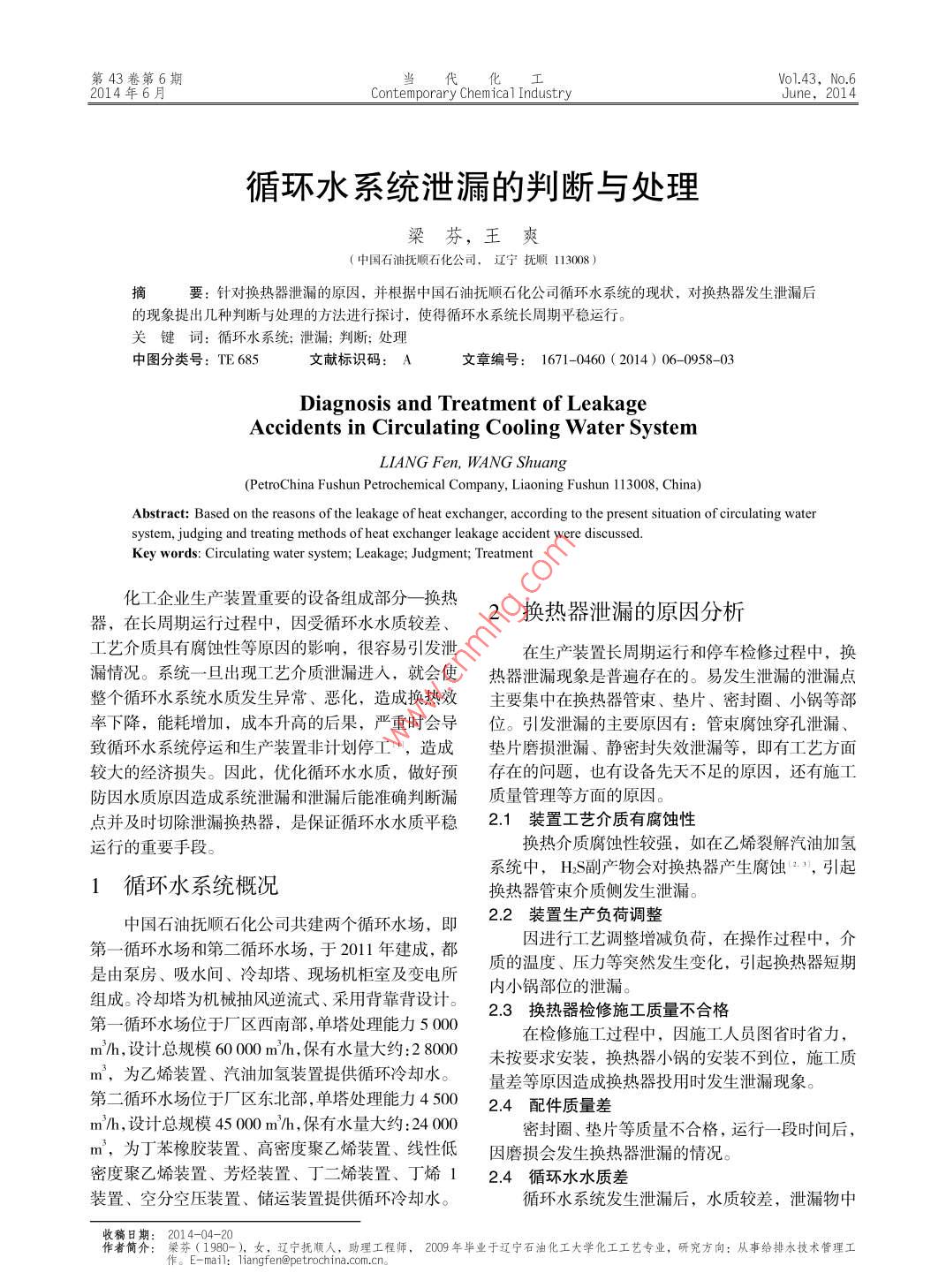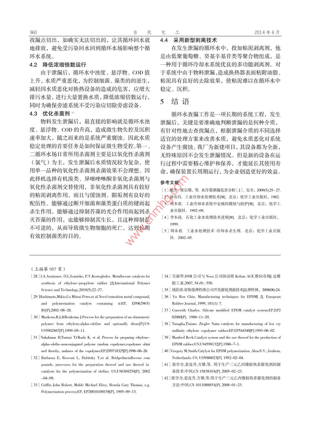 第43卷第6期當(dāng)代化工o1.43,No.62014年6月Contemporary Chemical IndustryJune, 2014循環(huán)水系統(tǒng)泄漏的判斷與處理梁芬,王爽中國(guó)石油撫順石化公司,遼寧撫順113008)的空幾為與眾用的次進(jìn)行使6年水長(zhǎng)的明的心,換熱發(fā)生關(guān)鍵詞:循環(huán)水系統(tǒng);泄漏:判斷;處理中圖分類號(hào):TE68文獻(xiàn)標(biāo)識(shí)碼:A文章編號(hào):1671-0460(2014)06-0958-03Diagnosis and Treatment of leakageAccidents in Circulating Cooling Water SystemLIANG Fen, WANG Shue( Petro China Fushun Petrochemical Company, Liaoning Fushun 113008, China)Abstract: Based on the reasons of the leakage of heat exchanger, according to the present situation of circulating watersystem, judging and treating methods of heat exchanger leakage accident were discussedKey words: Circulating water system; Leakage; Judgment; Treatment化工企業(yè)生產(chǎn)裝置重要的設(shè)備組成部分—換熱器,在長(zhǎng)周期運(yùn)行過(guò)程中,因受循環(huán)水水質(zhì)較差、換熱器泄漏的原因分析工藝介質(zhì)具有腐蝕性等原因的影響,很容易引發(fā)泄在生產(chǎn)裝置長(zhǎng)周期運(yùn)行和停車檢修過(guò)程中,換漏情況。系統(tǒng)一旦出現(xiàn)工藝介質(zhì)泄漏進(jìn)入,就會(huì)使熱器泄漏現(xiàn)象是普遍存在的。易發(fā)生泄漏的泄漏點(diǎn)整個(gè)循環(huán)水系統(tǒng)水質(zhì)發(fā)生異常、惡化,造成換熱效主要集中在換熱器管束、墊片、密封圈、小鍋等部率下降,能耗增加,成本升高的后果,嚴(yán)重時(shí)會(huì)導(dǎo)位。引發(fā)泄漏的主要原因有:管束腐蝕穿孔泄漏、致循環(huán)水系統(tǒng)停運(yùn)和生產(chǎn)裝置非計(jì)劃停工,造成墊片磨損泄漏、靜密封失效泄漏等,即有工藝方面較大的經(jīng)濟(jì)損失。因此,優(yōu)化循環(huán)水水質(zhì),做好預(yù)存在的問(wèn)題,也有設(shè)備先天不足的原因,還有施工防因水質(zhì)原因造成系統(tǒng)泄漏和泄漏后能準(zhǔn)確判斷漏質(zhì)量管理等方面的原因。點(diǎn)并及時(shí)切除泄漏換熱器,是保證循環(huán)水水質(zhì)平穩(wěn)21裝置工藝介質(zhì)有腐蝕性運(yùn)行的重要手段。換熱介質(zhì)腐蝕性較強(qiáng),如在乙烯裂解汽油加氫系統(tǒng)中,HS副產(chǎn)物會(huì)對(duì)換熱器產(chǎn)生腐蝕,引起1循環(huán)水系統(tǒng)概況換熱器管束介質(zhì)側(cè)發(fā)生泄漏。中國(guó)石油撫順石化公司共建兩個(gè)循環(huán)水場(chǎng),即22裝置生產(chǎn)負(fù)荷調(diào)整第一循環(huán)水場(chǎng)和第二循環(huán)水場(chǎng),于2011年建成,都因進(jìn)行工藝調(diào)整增減負(fù)荷,在操作過(guò)程中,介是由泵房、吸水間、冷卻塔、現(xiàn)場(chǎng)機(jī)柜室及變電所質(zhì)的溫度、壓力等突然發(fā)生變化,引起換熱器短期組成。冷卻塔為機(jī)械抽風(fēng)逆流式、采用背靠背設(shè)計(jì)。內(nèi)小鍋部位的泄漏。2.3換熱器檢修施工質(zhì)量不合格第一循環(huán)水場(chǎng)位于廠區(qū)西南部,單塔處理能力5000在檢修施工過(guò)程中,因施工人員圖省時(shí)省力,m/h,設(shè)計(jì)總規(guī)模6000,保有水量大約:2800未按要求安裝,換熱器小鍋的安裝不到位,施工質(zhì)m3,為乙烯裝置、汽油加氫裝置提供循環(huán)冷卻水量差等原因造成換熱器投用時(shí)發(fā)生泄漏現(xiàn)象。第二循環(huán)水場(chǎng)位于廠區(qū)東北部,單塔處理能力45024配件質(zhì)量差m/h,設(shè)計(jì)總規(guī)模45000m/h,保有水量大約:24000密封圈、墊片等質(zhì)量不合格,運(yùn)行一段時(shí)間后m,為丁苯橡膠裝置、高密度聚乙烯裝置、線性低因磨損會(huì)發(fā)生換熱器泄漏的情況密度聚乙烯裝置、芳烴裝置、丁二烯裝置、丁烯24循環(huán)水水質(zhì)差裝置、空分空壓裝置、儲(chǔ)運(yùn)裝置提供循環(huán)冷卻水。循環(huán)水系統(tǒng)發(fā)生泄漏后,水質(zhì)較差,泄漏物中收稿日期:2014-04作者簡(jiǎn)介:梁芬(1980-遼寧撫順人,助理工程師,2009年畢業(yè)于遼寧石油化工大學(xué)化工工藝專業(yè),研究方向;從事給排水技術(shù)管理工n@petrochina.com.cn。第43卷第6期梁芬,等:循環(huán)水系統(tǒng)泄漏的判斷與處理的重組分有機(jī)物還可為某些細(xì)菌(如假單孢菌、脫硫預(yù)案,切除了旁濾系統(tǒng),并進(jìn)行排污置換,水質(zhì)得弧菌提供作為營(yíng)養(yǎng)的碳源“,微生物的繁殖得以加到改善(表1)速,且懸浮物、油等長(zhǎng)期沉積在管壁上,會(huì)引起微表1第一循環(huán)水場(chǎng)發(fā)現(xiàn)系統(tǒng)泄漏期間的數(shù)據(jù)變化(1)生物腐蝕或金屬垢下腐蝕穿孔,從而引發(fā)換熱器管 Table 1 The data changes during the period of material leak束水側(cè)發(fā)生泄漏。in 1# circulating water system (1)CODM3物料泄漏的判斷項(xiàng)目控制指標(biāo)循環(huán)水系統(tǒng)在運(yùn)行過(guò)程中,換熱器可能發(fā)生泄實(shí)驗(yàn)出水1,338155漏,會(huì)造成水質(zhì)惡化,顏色異常、濁度增加,水中5月20日1410.00有異味或黑色浮沫,從而增加循環(huán)水的腐蝕、結(jié)垢5月21日4.1·3-0524或微生物生長(zhǎng)的傾向。根據(jù)日常分析數(shù)據(jù),可判斷5月22日是否有泄漏:5月23日(1)pH值波動(dòng)較大,有明顯的上升或降低5月24日40.90791超出正常控制范圍。一般來(lái)說(shuō)系統(tǒng)中具有較高或者案例較低pH值介質(zhì)的換熱器不多,因此發(fā)生異常情