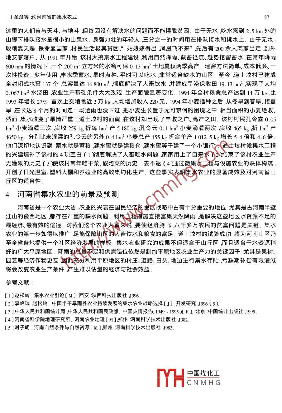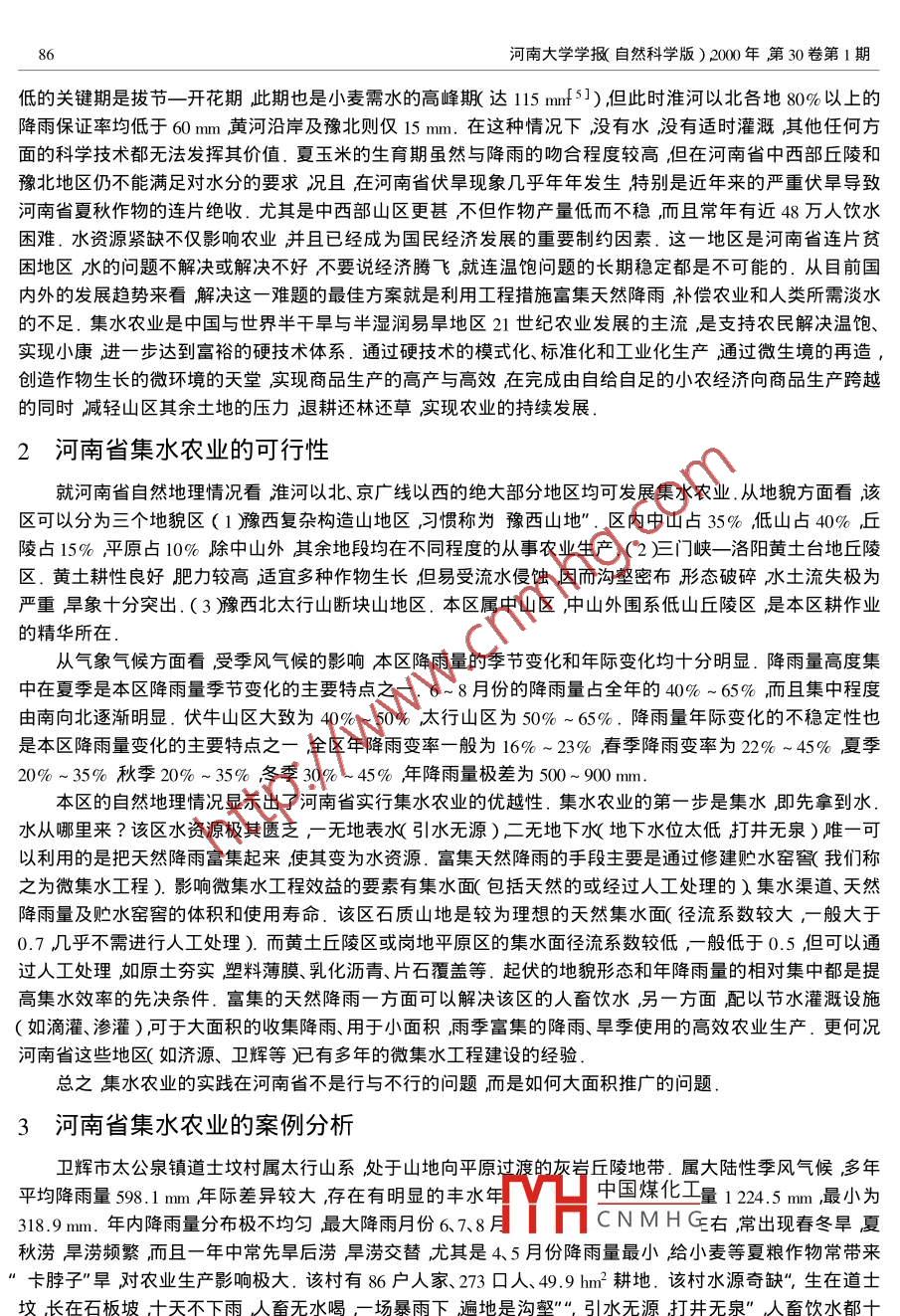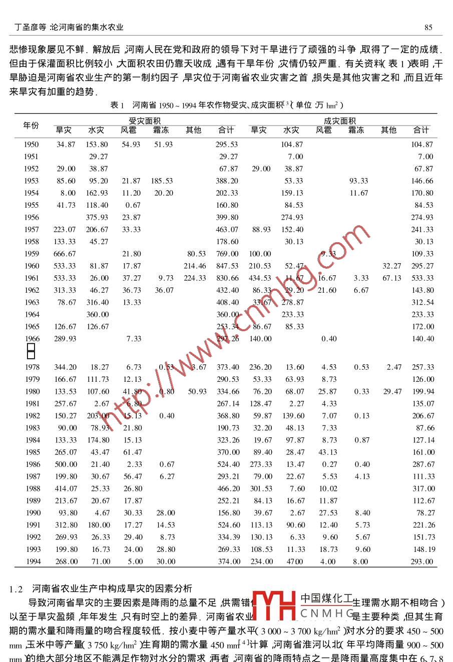 第30卷第1期河南大學(xué)學(xué)報(bào)(自然科學(xué)版)Vol.30 No. 1.2000年3月Joumal of Henan University ( Natural Science )Mar.2000論河南省的集水農(nóng)業(yè)丁圣彥| ,劉家棟2( 1.河南大學(xué)環(huán)境與規(guī)劃學(xué)院河南開(kāi)封475001; 2.商丘教育學(xué)院河南商丘476000)摘要:介紹了 集水農(nóng)業(yè)的概念及內(nèi)容,論述了河南省發(fā)展集水農(nóng)業(yè)的緊迫性和可行性并通過(guò)實(shí)例分析說(shuō)明集水農(nóng):業(yè)的理論在河南省農(nóng)業(yè)生產(chǎn)實(shí)踐中的適合性和發(fā)展前景.關(guān)鍵詞:旱災(zāi)集水農(nóng)業(yè)河南省中圖分類號(hào):F323 .213 S273.1文獻(xiàn)標(biāo)識(shí)碼:A文章編號(hào): 1003-4978 2000 )01-0084-04On the Rainwater Harvesting Agriculture of Henan ProvinceDING Sheng-yan',LIU Jia-dong2(1. College of Enmironment & Planning, Henan Uniersity, Kaifeng 475001,Henan, China;2. Shangqiu Education College, Shangqiu 476000, Henan, China)Abstract: The concept and its contents of Rainwater Harvesting Agriculture are introduced. The feasibility of developing RainwaterHarvesting Agriculture in Henan Province is discussed with examples indicating that the theory of Rainwater Harvesting Agiculturefits the agriculture practice and has vast vistas in Henan Province.Key words: drought; rainwater harvesting agriculture; Henan province集水( rainwater catchment )就是通過(guò)工程設(shè)施把天然降雨所形成的地表徑流富集并存儲(chǔ)起來(lái)變成可以利用的水資源.集水農(nóng)業(yè)( Rainwater Harvesting Agriculture )就是把對(duì)農(nóng)業(yè)無(wú)效部分的天然降雨通過(guò)工程設(shè)施富集起來(lái)實(shí)施時(shí)空調(diào)節(jié),有限供水補(bǔ)償農(nóng)田水分虧缺實(shí)現(xiàn)農(nóng)業(yè)生產(chǎn)力穩(wěn)定提高的技術(shù)體系1]其核心內(nèi)容.是在半干旱和半濕潤(rùn)易旱地區(qū),以微生境”再造理論為指導(dǎo),以天然降雨工程富集、儲(chǔ)存技術(shù)體系為基礎(chǔ),以節(jié)水有限補(bǔ)償灌溉為手段,以集水高效農(nóng)藝?yán)眉夹g(shù)體系為核心并把經(jīng)濟(jì)管理和技術(shù)服務(wù)作為重要組分而綜合發(fā)展的大農(nóng)業(yè)生產(chǎn)過(guò)程,它是一種旱地雨養(yǎng)農(nóng)業(yè)新的開(kāi)發(fā)模式或增長(zhǎng)方式終極目標(biāo)在于使雨養(yǎng)農(nóng)業(yè)由完全被動(dòng)抗旱型轉(zhuǎn)變?yōu)橹鲃?dòng)抗旱型實(shí)現(xiàn)干旱年農(nóng)業(yè)生產(chǎn)也能豐產(chǎn)和穩(wěn)產(chǎn),從而大力發(fā)展商品生產(chǎn)形成規(guī)模經(jīng)濟(jì)促進(jìn)整個(gè)地區(qū)社會(huì)和經(jīng)濟(jì)的全面發(fā)展.雨水集流利用是一種古老的富集利用天然降雨的傳統(tǒng)技術(shù),在以色列、土耳其以及非洲、拉丁美洲和亞洲的許多國(guó)家已流傳了數(shù)千年并一直沿用至今[21但以往雨水集流系統(tǒng)主要是為提供家庭或社區(qū)生活用水而設(shè)計(jì)真正用于農(nóng)田灌溉水源的并不多.在歷史上我國(guó)一些干旱缺水的地區(qū)有修水窖蓄雨水飲用的習(xí)慣但規(guī)模小,不足以解決人畜飲水更談不上用于農(nóng)田灌溉.集水農(nóng)業(yè)理論的創(chuàng)立與實(shí)踐給我國(guó)干旱、半干旱、半濕潤(rùn)易旱地區(qū)農(nóng)業(yè)的生產(chǎn)和農(nóng)村經(jīng)濟(jì)的綜合發(fā)展帶來(lái)了新曙光,它是人類農(nóng)業(yè)用水文明發(fā)展的新時(shí)期,同時(shí)也標(biāo)志著我國(guó)傳統(tǒng)旱地農(nóng)業(yè)發(fā)展進(jìn)入了一個(gè)新的歷史階段.1河南省發(fā)展集水農(nóng)業(yè)的緊迫性1.1 河南省歷史上的旱災(zāi)中國(guó)煤化工根據(jù)歷史時(shí)期資料的記載河南省在大旱年份赤地遍野,MYHCNMH G無(wú)寸草"而人相食"等收稿日期: 19904-21基金項(xiàng)目:河南省科委資助項(xiàng)目(984070600)作者簡(jiǎn)介:丁圣度( 1963- )男河南商丘人博士副教授.丁圣彥等論河南省的集水農(nóng)業(yè)85悲慘現(xiàn)象屢見(jiàn)不鮮.解放后河南人民在黨和政府的領(lǐng)導(dǎo)下對(duì)干旱進(jìn)行了頑強(qiáng)的斗爭(zhēng),取得了-定的成績(jī).但由于保灌面積比例較小大面積農(nóng)田仍靠天收成遇有干旱年份災(zāi)情仍較嚴(yán)重.有關(guān)資料(表1表明干旱脅迫是河南省農(nóng)業(yè)生產(chǎn)的第-制約因子旱災(zāi)位于河南省農(nóng)業(yè)災(zāi)害之首損失是其他災(zāi)害之和,而且近年來(lái)旱災(zāi)有加重的趨勢(shì).表1河南省1950~ 1994年農(nóng)作物受災(zāi)、成災(zāi)面積[3(單位萬(wàn)hm2)受災(zāi)面積成災(zāi)面積年份旱災(zāi)水災(zāi)風(fēng)雹霜凍其他合計(jì)‘旱災(zāi)水滅風(fēng)雹 霜凍合計(jì)195034.87 153 .8054.9351.93295.53104. 87104.87195129.2729. 277.00195229.00 38.8767.87 .29.0038.8767.87195385.60 95.2021.87 185..53388.2053.3393.33146.6619548.00 162.9311.2020.20202.33159.1311.67170.80195541.73 118 .400.67160.8084.5384.53 .1956375. 9323. 87399. 80274. 93274. 93.1957223.07206.6733.33463.0788.93152.40241.33 .1958133. 3345 .27178.6030.131959666.6721.8080.53 769.00 100.009.33109.331960533.33 81 .8717.87214.46 847.53 210.5352.4732.27 295 .271961533.33 26. 0037.279.73 224.33 830.66 434.53 11 .67 16. 673.3367.13 533.331962313.3346.2736.73 36.07432.4086.33 .29.20 21 .606. 67143. 80196378.67 316.4013.33408.4033.67 278. 87312.541964360.00233.33233. 331965126.67 126.67253.3486.67 85.33172.001966289.937.33297.26 140.000.40140.401978344.20 18. 276.730.533.67 373.40