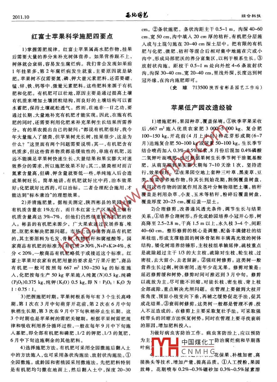 2011.10態(tài)先藝嫦合科技cm。②條狀施肥。條狀溝距主干0.5~1m,溝深40-60紅富士蘋果科學(xué)施肥四要點(diǎn)cm、寬50cm,溝中填入20cm厚的秸稈,有機(jī)肥分層施入或與土混勻施在20~40cm深土層中。把有限的有機(jī)1)掌握需肥規(guī)律。紅富士蘋果屬高水肥作物,掛果肥與化肥、微肥、秸稈等混合后相對(duì)集中地施在穴或小后需要大量的養(yǎng)分來(lái)補(bǔ)充樹體營(yíng)養(yǎng)。如果營(yíng)養(yǎng)跟不上,溝中,形成局部肥沃的養(yǎng)分富集區(qū),以利于根系生長(zhǎng)。③樹體就會(huì)衰弱,容易發(fā)生腐爛病。我們常會(huì)發(fā)現(xiàn)如果前放射狀溝施。距枝千05-1m處向外挖4-6條放射狀1年掛果多第2年腐爛病發(fā)生就重,主要原因就是缺溝,溝深3040cm、寬20-40cm,里淺外深,長(zhǎng)度達(dá)到樹肥。蘋果樹不僅需要氮磷、鉀大量元素肥料,還需要硼、冠外緣,在溝內(nèi)施肥即可。錳、鋅、鐵、鈣等中、微量元素肥料。這些肥料來(lái)源于有機(jī)(史瓊713500陜西省彬縣園藝工作站肥和化肥。有機(jī)肥可以壯地,原因主要是通過(guò)提高土壤有機(jī)質(zhì)來(lái)增加土壤團(tuán)粒結(jié)構(gòu),而良好的土壤結(jié)構(gòu)可以蓄水蓄肥,保持土壤疏松透氣。然而,壯地非一日之功,要蘋果低產(chǎn)園改造經(jīng)驗(yàn)通過(guò)長(zhǎng)期、大量地補(bǔ)充有機(jī)肥才能實(shí)現(xiàn)。因此,在施有機(jī)肥的同時(shí),還需要利用化肥來(lái)補(bǔ)充果樹生長(zhǎng)結(jié)果所需養(yǎng)1)增施肥料,果園種草,覆蓋保墑。①秋季蘋果采收分。有的果農(nóng)提出自已的疑問(wèn):“都說(shuō)有機(jī)肥很好,我今后,667m2施人優(yōu)質(zhì)農(nóng)家肥3000-5000kg、復(fù)合肥年大量施入了豬糞,但蘋果樹光長(zhǎng)樹掛果很少,這是為100-150kg,開(kāi)花前(4月上中旬)和花芽形成期(6-7什么?”這里面有兩個(gè)問(wèn)題需要說(shuō)明:其一,有機(jī)肥含有月)追施復(fù)合肥50-100kg或尿素50-100kg。生長(zhǎng)季節(jié)機(jī)質(zhì)多,但這些營(yíng)養(yǎng)物質(zhì)都是緩效性的,單施有機(jī)肥遠(yuǎn)結(jié)合噴藥加人0.3%0.5%尿素,8月份后混加04%磷酸遠(yuǎn)不能滿足蘋果樹快速生長(zhǎng)、大量結(jié)果和果實(shí)膨大對(duì)速二氫鉀葉面噴肥,也可根據(jù)果樹生長(zhǎng)季節(jié)樹干涂氨基酸效養(yǎng)分的需求,所以施肥效果不好;其二,豬糞相對(duì)而言肥,從萌芽期到果實(shí)膨大期每7-10天涂1次,堅(jiān)持進(jìn)氮素含量高但磷、鉀含量就要低一些,單純施入后會(huì)造行,效果很好。②在果園空地上套種三葉草、黑麥草、豆成果樹旺長(zhǎng)。簡(jiǎn)單地講,有機(jī)肥就好比中藥,治本效果類、油菜等養(yǎng)地作物,待其長(zhǎng)到始花期,割倒覆蓋樹盤好;化肥就好比西藥,可以治標(biāo)。二者合理配合施用,才利用這些作物的固氮作用及莖葉分解物培肥土壤。秸稈能達(dá)到“標(biāo)本兼治”的理想效果。覆蓋是利用雜草、小麥、玉米等秸稈,粉碎后覆蓋樹盤2)弄清施肥量。據(jù)相關(guān)測(cè)定,陜西彬縣的果園土壤覆蓋厚度20-25cm,覆后蓋一層土有機(jī)質(zhì)含量在1%左右,而日本紅富士產(chǎn)區(qū)果園土壤有2)合理修剪,改善通風(fēng)透光條件,調(diào)節(jié)生長(zhǎng)與結(jié)果機(jī)質(zhì)含量高達(dá)3%-7%,但他們?nèi)匀缓苤匾曈袡C(jī)肥的投關(guān)系。①培養(yǎng)合理樹形。喬化成齡園培養(yǎng)小冠開(kāi)心形,樹。彬縣的有機(jī)肥來(lái)源少,廣大果農(nóng)通過(guò)發(fā)展養(yǎng)畜、堆高降至25-28m,干高1.5m以上,永久枝3-4個(gè),間距肥、漚肥來(lái)解決肥源問(wèn)題。市場(chǎng)上也有銷售商品有機(jī)肥40-60cm。整形修剪的核心是調(diào)整、配備豐滿健壯的結(jié)的,其主要原料為毛發(fā)、骨粉、作物秸稈和腐殖酸等。果枝組,形成支撐穩(wěn)固的樹體骨架和豐滿高光效的樹體家商品有機(jī)肥的標(biāo)準(zhǔn)為:有機(jī)質(zhì)≥30%,N+PK≥4%,水結(jié)構(gòu)。矮化樹培養(yǎng)紡錘形,主枝枝組單軸延伸,疏枝重點(diǎn)分<20%,一般商品有機(jī)肥略低于或接近這個(gè)標(biāo)準(zhǔn)。紅是硫除超過(guò)主干1/3的大主枝,疏除對(duì)生枝、輪生枝、過(guò)富土蘋果對(duì)農(nóng)家有機(jī)肥用量的要求是“斤果斤肥”,商品密枝,去大留小,去老留新。②強(qiáng)旺樹修剪。這類樹一般有機(jī)肥一般可按照每667m2150-250kg的標(biāo)準(zhǔn)施營(yíng)養(yǎng)生長(zhǎng)過(guò)剩,樹體密閉,連年少花無(wú)果。修剪對(duì)策是:入,化肥按每生產(chǎn)50kg蘋果施入純氮(N)0.5kg、純磷延遲修剪緩和樹勢(shì),修剪時(shí)間可推遲到3月中旬。修剪(P03)0.375kg、純鉀(K0)0.5kg,即N:PO:KO為以疏放為主,盡可能不回縮,對(duì)徒長(zhǎng)枝、密生枝、背上枝1:0.75:1。全部疏除,重點(diǎn)解決光照問(wèn)題。在管理上要做到大枝開(kāi)3)把握施肥時(shí)期。蘋果樹根系每年有3個(gè)生長(zhǎng)高峰張角度、預(yù)留小枝變向下垂,再輔之緩勢(shì)促花手法,促其期,第1次在3月中旬萌芽開(kāi)花前,第2次在6月中旬成花結(jié)果。③衰弱樹修剪。這類樹一般都是管理不善、投秋梢生長(zhǎng)期,第3次在9月中下旬秋梢停止生長(zhǎng)期。這入不足造成的。在修剪上主要采取復(fù)壯手法??刹扇?qiáng)3個(gè)時(shí)期也是蘋果樹的需肥關(guān)鍵期。根據(jù)