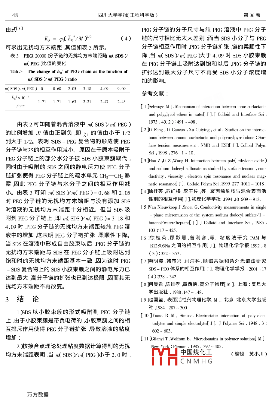 第36卷第1期四川大學(xué)學(xué)報(bào)(工程科學(xué)版)Vol.36 No.12004年1月JOURNAL OF SICHUAN UNIVERSITY( ENGINEERING SCIENCE EDITON )Jan.2004文章編號(hào):1009-3087 2004 )1-0045-04十二烷基硫酸鈉對(duì)溶液中聚乙二醇分子構(gòu)象的影響楊曉明,鄭慶康李瑞霞吳大誠(chéng)*(四川大學(xué)紡織研究所四川成都610065 )摘要:為了考察溶液中小分子 與高分子的相互作用采用粘度法研究了十二烷基硫酸鈉( SDS對(duì)溶液中聚乙二醇PEG )分子尺寸的影響并計(jì)算了混合溶液中PEG分子鏈的無(wú)擾均方末端距隨SDS加入的變化。結(jié)果表明在溶液中SDS與PEG之間形成復(fù)合物SDS以小膠束簇的形式結(jié)合在PEG高分子鏈上。由于復(fù)合物上的SDS小膠束簇的電離使得膠束簇與膠束簇之間產(chǎn)生靜電排斥作用,從而使高分子鏈擴(kuò)張,體系的粘度增大。當(dāng)m( SDS)m .(PEG)<2.0時(shí),PEG分子鏈的分子尺寸與純PEG溶液中的PEG分子鏈的尺寸相比無(wú)太大差別,當(dāng)m( SDS )Vm( PEG)>4.09時(shí)SDS小膠束簇在PEG分子鏈上吸附達(dá)到飽和以后,PEG 分子鏈的擴(kuò)張達(dá)到最大分子尺寸不再受SDS小分子濃度增加的影響。關(guān)鍵詞:聚乙二醇十二烷基硫酸粘度無(wú)擾均方末端距分子構(gòu)象中圖分類號(hào):TIQ323.1文獻(xiàn)標(biāo)識(shí)碼:AEffect of Sodium Dodecyl Sulfate to Molecular Size of Polyethylene Glycol in SolutionYANG Xiao ming ,ZHENG Qing kang ,LI Rui-xia ,WU Da-cheng( Inst. of Texile , Sichuan Univ. , Chengdu 610065 , China)Abstract :In order to investigate the interaction between small molecule and macromolecule in solution , the viscosimetrywas used to determine the effect of sodium dodecyl sulfate( SDS ) on the molecular size of polyethylene glycol( PEG ) insolution. The vary of the unperturbed mean square end - to - end distance of PEG molecule with the added SDS was cal-culated . The results showed that a complex of SDS and PEG was formed with the binding of SDS on PEG molecular chainin a micelle form. The electrostatic repulsion existing in the ionized SDS micelles resulted in the expansion of PEG micro-molecular chains and the increase of viscosity of the SDS and PEG mixing solution. Compared with the molecular size ofPEG molecular chain in PEG solution , in the SDS and PEG mixing solution , when the m( SDS )m( PEG )<2.0 , the .molecular size of PEG molecular chain was nearly the same as that of PEG molecular chain in PEG solution ,while whenthe m( SDS )m( PEG )>4.09 , the PEG molecular chain became saturated with SDS micelles , and the expansion PEGmolecular chain tended a limit size at this ratio and no longer increased with the increase of SDS concentration.Key words polyethylene glycol isodium dodecyl sulfate iviscosity imolecular size聚合物與表面活性劑之間的相互作用早已引起人們中國(guó)火煤化工的是陰離子表面活性劑( SDSEC1] ,PVp2] ,PEO3] ,收稿日期2003-03-03 .PAMMHCNMH(心4示。wi幾山平爾的實(shí)驗(yàn)方法有很多種基金項(xiàng)目國(guó)家自然科學(xué)基金資助項(xiàng)目(29974019)及高等學(xué)校如電導(dǎo)5]粘度6]表面張力[1] ,順磁譜7] ,NMR{$3]博土點(diǎn)專項(xiàng)科研基金資助項(xiàng)目( 20010600204 )熒光光譜2]等。這些工作表明高分子-表面活性作者簡(jiǎn)介楊曉明1973- )女搏士生.研究方向高分子表面.劑有特殊相互作用,即表面活性劑以小膠束簇的形*通訊聯(lián)索方數(shù)據(jù)46四川大學(xué)學(xué)報(bào)(工程科學(xué)版)第36卷式吸附于分子鏈上,而不是以單個(gè)的表面活性劑吸PEG分子鏈上形成復(fù)合物( Critical Aggregation Con-附在分子鏈上。然而,過(guò)去的研究較少注意表面活centration CAC j以及SDS自由膠束( CMC的形成。性劑小分子的加入對(duì)混合溶液中高分子鏈構(gòu)象變化1.6]的影響。眾所周知8]溶液粘度的變化可以用來(lái)研1.2究混合溶液中高分子鏈尺寸的改變。本文研究了小分子SDS的加入對(duì)混合溶液中PEG大分子鏈的無(wú)0.8擾均方末端距的影響。館0.411實(shí)驗(yàn)部分02030405060c(SDS)/(mmol!L門)1.1 試劑PEG :上海試劑一廠生產(chǎn)氣相色譜固定液分圖2 SDS- PEQ( 2000混合溶液的電導(dǎo)率子量:2000 A4000 ,6000 ,10000 ,20000 ;SDS :上海化學(xué)Fig.2 The conductivity of SDS - PEQ 20000 ) solutions試劑采購(gòu)站純度99%。經(jīng)分析純無(wú)水乙醇重結(jié)晶2.2 SDS與PEG混合溶液特性粘數(shù)兩次真空干燥;水三次蒸餾水電導(dǎo)率為1.05 pus/高分子鏈在溶液中構(gòu)象的變化和無(wú)擾均方末端距的變化一般通過(guò)測(cè)定溶液的特性粘數(shù)的改變來(lái)表cm。征。圖3是SDS的濃度恒定時(shí),PEG( 20000 )- SDS1.2 粘度測(cè)定用烏氏粘度計(jì)于( 30+0.1)C下測(cè)定恒定SDS混合溶液的比濃粘度隨PEG濃度變化的曲線。濃度以及恒定m(SDS)/m(PEG)比例時(shí)溶液的粘1.c(SDS)=36 mmolL:'!6。 16012.c(SDS)-I4 mmolL!.度。= 140-1 3.c(SDS)= 9 mmolL:'1.3 電導(dǎo)率測(cè)定三120' 4.c(SDS)- 6 mmolL-!100-S.c(SDS)= 0 mmolL'用DDS- 11A型電導(dǎo)儀于( 30+0.1)C下測(cè)定“801PEG濃度恒定時(shí)混合溶液電導(dǎo)率隨SDS濃度的變0化。011.0203.0 4.02結(jié)果與討論.Cp/(10'g:ml'")圖3 PEG - SDS溶液的比濃粘度隨PEG濃度的變化2.1 SDS與PEG混合溶液的電導(dǎo)率Fig.3 The values of ηp/ Cp as a function of cp at differentSDS溶液的電導(dǎo)率及SDS與濃度為4.4x 10-3SDS concentrationg/ml的PEQ(20000)的混合溶液的電導(dǎo)率曲線由圖由圖3可以看出,與 PEG溶液的比濃粘度曲線1和圖2給出。(曲線5)不同,由于SDS的存在并吸附在PEG分子1.8鏈.上使得原本電中性的PEG溶液呈現(xi