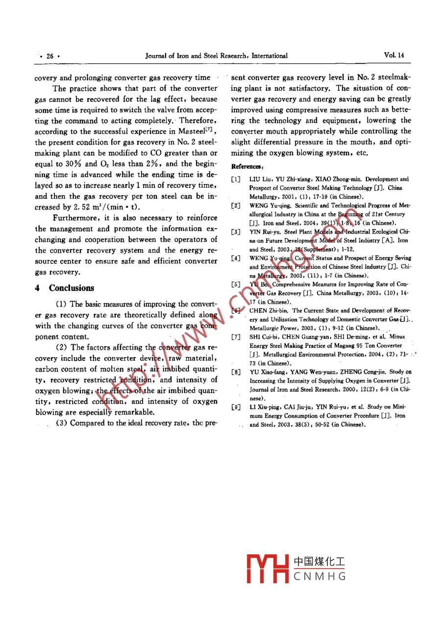 Availableonlineatwww.sciencedirect.com° ScienceDirectJOURNAL OF IRON AND STEEL RESEARCH, INTERNATIONAL. 2007, 14(6):22-26Affecting Factors and Improving Measures for Converter Gas RecoveryWANG Ai-hua, CAI Jiur-ju', LI Xiu-ping, WANG Ding Zhou Qing-an(1, School of Materials and Metallurgy, Northeastern University, Shenyang 110004, Liaoning, China;2. Energy Department, Baoshan Steel Co Ltd, Shanghai 201900, China)Abstract: To change the undesirable present situation of recovering and using converter gas in steel plants in China,the basic approaches to improving the converter gas recovery rate were analyzed theoretically along with the changecurves of the converter gas component content, based on the converter gas recovery system of Baosteel No. 2steel-making plant. The effects of converter device, raw material, air imbibed quantity, recovery restricted condition, andintensity of oxygen blowing on the converter gas recovery rate were studied. Among these, the effects of the air im-bibed quantity, recovery restricted condition, and intensity of oxygen blowing are remarkable. Comprehensive meas-ures were put forward for improving the converter gas recovery from the point of devices, etc, and good resultswere aKey words: steel plant; converter gas, recovery rate; affecting factorConverter gas is an important secondary energy common task of most domestic steel plants s)resource for steel enterprises, and is also one of theBased on the lt converter gas recovery systemeak points in the recovery and utilization of sec- of Baosteel No. 2 steelmaking plant, the factors andondary energy resources. Improving the converter the comprehensive measures of improving thecon-gas recovery rate can effectively reduce the produc-. verter gas recovery rate were investigated in thistion cost of steelmaking, laying the basis for"minus study.energy steelmaking",. and can remarkably decrease 1 Brief Introduction of Converter Gas Recov-the total quantities of pollutant emissions to realizecleaner production. Thus, " converter gas recoveryery Systemis an important technology in modern converterThe converter gas recovery system in No. 2steelmaking, and is regarded as one of the important steelmaking plant is an Lt system introduced fromtechnologies spread emphatically during the 10th Australia, and its working principlefive-year plan -a1Fig1(6. It mainly consists of flue gas coolingThe converter gas recovery system has long cleaning and recovcry, and dust pressing. Comparedpipes and complicated equipment, and several affect- with the traditional wet dust removal systeing factors. The literatures show that the recovery main technique traits are as follows. First, its highand utilization of converter gas are not satisfactory dust removal efficiency with the dust content in re-in most domestic steel plants, and its recovery rate covered gas less than 10 mg/mallows the converterlags behind the international advanced levell. This gas to be utilized directly by users. Secondly, it canwastes abundant energy resources and seriously pol- recover ferrous dust block of 50 000 t per year,andlutes the environment. Therefore, quick mastery of returns to the converter to replace iron ore for rawthe converter gas recovery technology, the complete materials. Thirdly, it does not cause secondary polexhaustion of equipment potential, and the safe and lution and sewage retreatment, and thus saves theeffective recovery of converter gas have become the energ中國(guó)煤化工 renter gas recoveryFoundation Item: Item Sponsored by National Natural Science Foundation of ChinaCNMHGBiography:WANGAi-hua(1976-),Male,DoctorCandidate:E-mail:wangaibua1976@yahoo.com.en:RevisedDateMay24,2006No 6Affecting Factors and Improving Measures for Converter Gas Recovery23·2 Analysis of Factors Affecting Converter Gas/tera arang conn DirrDissipation furnelRecoIn the smelting process, the converter producesDhrst ratchera large quantity of hot flue gas, which can becomethe available converter gas through the recovery sys-pe嶼tem. The data for the change of CO and O2 contentCoarse dust Rotary kInein converter gas during the smelting process areFg 1 Converter gas recovery process of LT systemnormal production conditions, and the scatter dia-grams of the content changing with the smeltingrate is very high. Therefore, the recovery process of time are obtained from the data, as shown in Fighe"LT"method has greater economic benefits andFig 2 indicates that: (1)during the smeltinenvironmental benefitsprocess, the Co and O2 content dots are always dis-O, content changeFlg 2 Change of Co content(a) and O, content(b)in converter gas with smelting timeributed on both sides of the two average curves, converter gas recovery quantity wasf obtainedwhich represent the rule of the content of CO and O2. through the gas caloric value multiplying the flowchanging with the smelting time. (2) Both the pro- rate of flue gas and converted by standard heatingduction quantity of CO and the content in converter value(8 360 kJ/m ) Fig 3 indicates that since thegas are different because of the different reaction flow rate of flue gas remains stable, the changing inmechanisms in the forepart, metaphase, and telo- stances of converter gas recovery can be known byphase of converter smelting, and the CO quantity investigating the changes of unit volume caloric val-and its content in converter gas reach the highest ue of converter gas. In Fig. 3, t, is beginning time oflevel in the smelting metaphasegas recovery and tr is ending time in the present re-covery condition. The unit volume caloric value of2.1 Approaches for improving converter gas recov- converter gas can be obtained by the area connectingery rateabc-d-ef-a in the Fig 3. Improving the unit vold Whether the converter gas must be recovered ume caloric value of converter gas indicates the im-pends on the content of Co and O, in the flue gas. provement of the converter gas recovery rate, name-The converter gas recovery restricted con