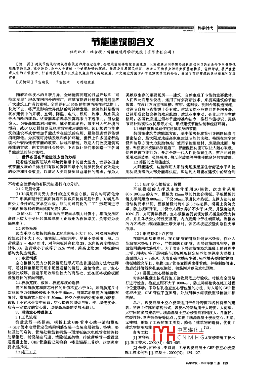 科學(xué)時(shí)代節(jié)能建筑的含義祖利比亞·吐合提/新疆建筑科學(xué)研究院(有限責(zé)任公司)[摘要]建筑節(jié)能是指建筑物在使用和建造過程中,合理地使用并有效利用能源,以便在滿足同等需要或達(dá)到相同目的的條件下盡量降低能耗節(jié)約能源,減少污染,為全人類營造一個(gè)健康和諧的環(huán)境。能源是發(fā)展國民經(jīng)濟(jì)、改善人民物質(zhì)生活的重要基礎(chǔ)物質(zhì),能源緊缺,將嚴(yán)重妨礙人們的正常生活、社會(huì)的發(fā)展進(jìn)步以及全民經(jīng)濟(jì)的可持續(xù)發(fā)展。本文通過對(duì)國內(nèi)外節(jié)能建筑情況的分析,提出了節(jié)能建筑的具體措施和發(fā)展前景。關(guān)鍵詞]節(jié)能建筑節(jié)能技術(shù)可持續(xù)發(fā)展隨著科學(xué)技術(shù)的日新月異,全球能源問題的日益嚴(yán)峻和“可類賴以生存的重要場所—建筑,自然也成了節(jié)能的重要載體持續(xù)發(fā)展”理念在國內(nèi)外的推廣,建筑節(jié)能設(shè)計(jì)越來越引起世界人們因此而想法設(shè)法,運(yùn)用了許多高新技術(shù),來提高建筑的節(jié)能廣大建筑工作者的重視。全世界有近3%的能源消耗在建筑物上,效果。在設(shè)計(jì)方面重視屋檐、窗簾、遮陽板、挑陽臺(tái)等構(gòu)造措施長此下去,將嚴(yán)重影響世界經(jīng)濟(jì)的可持續(xù)發(fā)展。建筑能耗是指消對(duì)調(diào)節(jié)自然節(jié)省能源十分有效。建筑節(jié)能業(yè)務(wù)在世界各國開展耗在建筑中的采暖、空調(diào)、降溫、電氣、照明、炊事、熱水供應(yīng)已經(jīng)形成比較完善的政府鼓勵(lì)、建筑業(yè)主主動(dòng)、企業(yè)運(yùn)作為主的等所消耗的能源。這些能源消耗單獨(dú)算起來并不起眼兒,但總量格局。各國政府通過頒布節(jié)能標(biāo)準(zhǔn)和法令、推行節(jié)能標(biāo)識(shí)、提供驚人。為提高能源利用效率,減少能源消耗,減少對(duì)大氣環(huán)境的節(jié)能補(bǔ)貼或稅收優(yōu)惠等方式,形成建筑節(jié)能法制和經(jīng)濟(jì)環(huán)境。污染,減少CO2排放以及地球溫室效應(yīng)的影響。因此加強(qiáng)節(jié)能建1.1韓國重視家庭住宅建筑本身的節(jié)能筑的建設(shè)率或者增加節(jié)能技術(shù)在建筑的應(yīng)用,最終促進(jìn)世界能源韓國在建筑節(jié)約能源方面,基本做法是政策引導(dǎo)同國民參與消耗降低。為實(shí)現(xiàn)可持續(xù)發(fā)展和保護(hù)環(huán)境,世界上許多國家都陸緊密結(jié)合,最大限度地提高家庭建筑節(jié)能的實(shí)效。韓國在住宅建續(xù)出臺(tái)鼓勵(lì)建筑節(jié)能的政策、法規(guī)和措施,鼓勵(lì)人們改變建筑髙設(shè)和裝修方面大力鼓勵(lì)和推廣使用節(jié)能型建材,房屋的地面、墻耗能的方式,向節(jié)約型社會(huì)轉(zhuǎn)變。下面就讓我們來領(lǐng)略一下各國壁、天棚要求按隔熱原理施工,智能溫控功能可以讓人隨心取暖節(jié)能建筑的好辦法吧促進(jìn)建筑節(jié)能行為,開啟全新一代人性化低碳生活,窗戶盡可能1、世界各國在節(jié)能建筑方面的妙招采用雙層玻璃、吸熱玻璃、熱反射玻璃等隔熱性能良好的窗玻璃隨著建筑能源短缺和環(huán)境污染帶來的巨大壓力,世界各國建1.2德國的太陽能建筑筑節(jié)能發(fā)展的目標(biāo)是用有限的資源和最小的能源代價(jià)來獲取最大太陽能建筑,應(yīng)能利用太陽能滿足房屋居住者舒適水平和使的經(jīng)濟(jì)和社會(huì)效益,以滿足人類對(duì)資源日益增長的需求。作為人用功能所需的大部分能源供應(yīng),即達(dá)到太陽能在建筑中的綜合利不考慮空腔影響的有限元法進(jìn)行內(nèi)力分析。(1)GBF空心樓板支、拆模212配筋計(jì)算平板模板的支撐及主龍骨采用50鋼管,次龍骨采用(1)對(duì)滿足雙向受力條件的邊支承空心板,兩向均可簡化為80×100mm的方木,模板為12mm厚的竹膠合模板。平板模板的“工”形截面進(jìn)行正截面抗彎和斜截面抗剪配筋計(jì)算;對(duì)滿足單鋼支撐間距為800mm,下設(shè)50m厚通長木墊板。支撐方法與普向受力條件的邊支承空心板,順肋向可簡化為“工”形截面進(jìn)行通結(jié)構(gòu)要求相同,模板鋪設(shè)時(shí)跨中按3.5‰起拱,混凝土澆筑完正截面抗彎和斜截面抗剪配筋計(jì)算。畢,防止板面開裂,并設(shè)專人灑水養(yǎng)護(hù)不少于14天。并強(qiáng)度達(dá)到(2)簡化后“工”形截面的正截面承載力計(jì)算中,截面受壓區(qū)100%后,方可拆除模板??招陌鍢巧w仍表現(xiàn)為板式樓蓋的受力特高度不應(yīng)大于受壓區(qū)翼緣厚度(正彎矩為板頂厚度,負(fù)彎矩為板點(diǎn),并且島狀受力特性更顯著,內(nèi)力更集中于柱端區(qū)域。當(dāng)樓蓋底厚度)。的內(nèi)區(qū)格板由現(xiàn)澆混凝土墻支承時(shí),該區(qū)格板應(yīng)按豎向剛性支承22選擇板厚考慮。邊支承空心樓板的跨高比對(duì)單向板不大于30,對(duì)雙向板跨度(2)鋼筋整體上浮控制按短邊計(jì)不大于40,在實(shí)際工程應(yīng)用中,盡量不要采用上限。當(dāng)在綁扎面層鋼筋時(shí),在GBF管的管座處鋪設(shè)木墊板,作業(yè)人荷載是2~4kNm時(shí),對(duì)單向板跨高比取28,雙向板跨度按短邊員站在木墊板上作業(yè),嚴(yán)禁踩踏GBF管,面層鋼筋綁扎完畢,將計(jì)取30;當(dāng)荷載小于或等