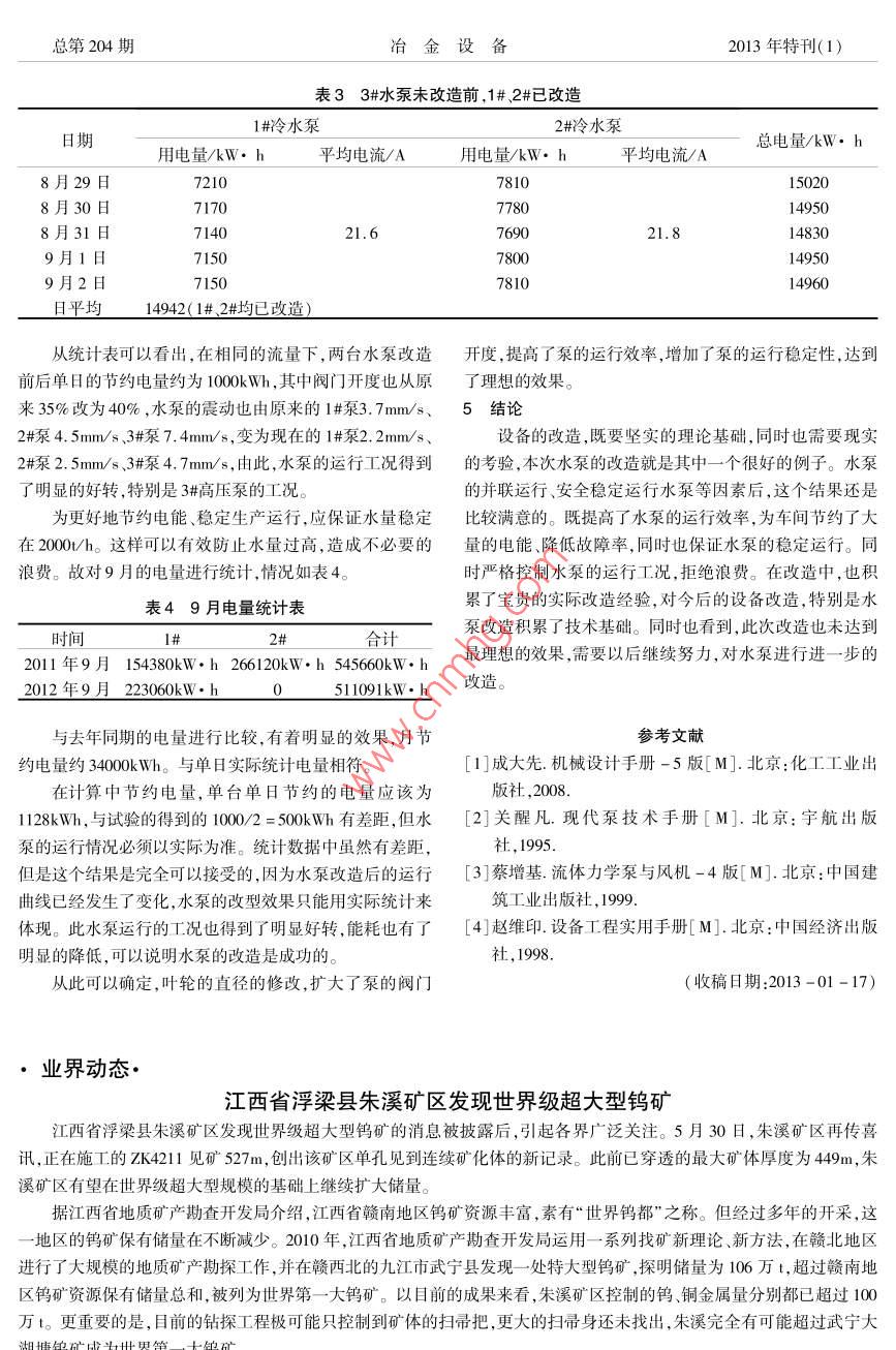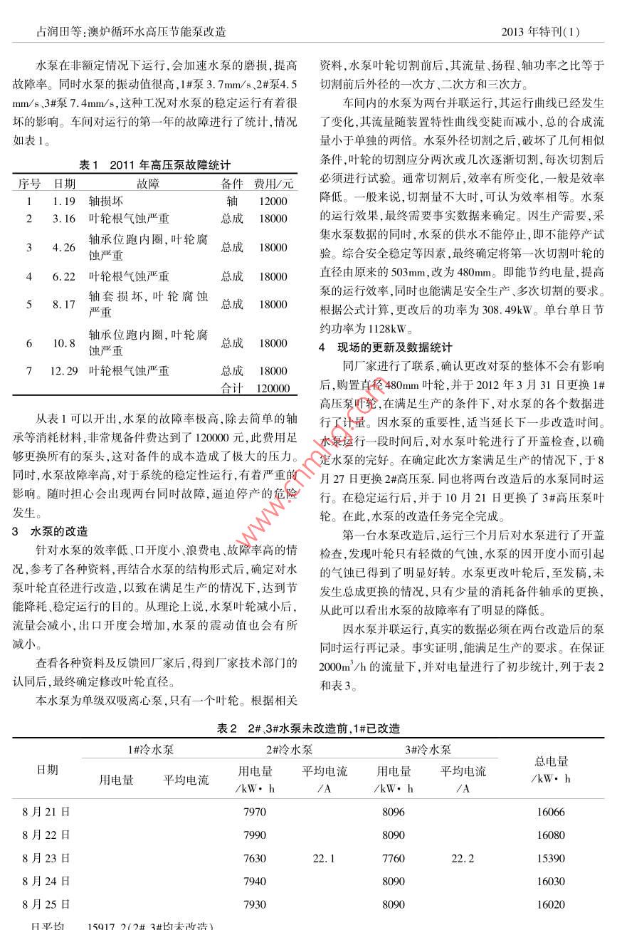 Total No, 204Extra Edtion( 1)2013METALLURGICAL EQUIPMEN2013年特刊(1)澳爐循環(huán)水高壓節(jié)能泵改造占潤田黃軍華(大冶有色金屬有限公司冶煉廠湖北黃石435005)摘要針對水泵故障率髙、效率低、閥門開度小、能耗浪費大等冋題,采用切割葉輪直徑的方法來解決,得到了很好的效果。關(guān)鍵詞水泵葉輪切割能耗降低故障率降低中圖分類號TM921.51文獻標識碼Bdoi:10.3969/.isn.10014269.2013.z1.019Renovation of High Pressure Energy-SavingPump in Ausmelt Furnace Recycling WaterZhan Runtian Huang JunhuaDaye Nonferrous Metals Co., Ltd, Smelter, Huangshi 435005)ABSTRACT Aiming on the problems such as high fault rate, low efficiency, small valve opening, and big ener-gy consumption for water pump, to adopt the method of cutting vane diameter to solve the problems, pleasant effectsKEYWORDS Water pump Vane cutting Energy consumption reducing Fault rate reducing1前言本車間有三臺型號為35075單級雙吸離心泵,流量2水泵存在的問題1260m3/h,揚程75m,轉(zhuǎn)速1450r/mn,功率為355kW,電機水泵所在的水系統(tǒng),設(shè)計生產(chǎn)所需要的流量在功率400kW。生產(chǎn)中為兩開一備。為澳爐、電爐、110thl800m3/h即可以滿足生產(chǎn)要求。而多余流量的水會從水鍋爐強制循環(huán)泵、引風機、鼓風機等提供冷卻水。水泵停箱中溢流,直接回到到熱水池,這樣就會造成很大的浪費。運,會導致澳爐停爐,最終將影響到全廠的安全生產(chǎn)。為而兩臺泵并聯(lián)運行時,在出口全開的情況下,現(xiàn)場統(tǒng)計到保證正常生產(chǎn),水泵是否正常運行至關(guān)重要。的出口流量為2400m/h,明顯的有多余的流量。為節(jié)約能源,在未做任何改造的情況下,調(diào)節(jié)出口閥門,以控制多兩臺水泵24小時不間斷運行,水泵成是車間的耗能大戶。水泵運行的好壞,直接影響到車間能耗。其生產(chǎn)流余的水量,以達到節(jié)約的目的。在調(diào)節(jié)水泵出口閥門,查看出口流量時,當達到程如圖1。l800m3/h時,出口開度只有20%,水泵的震動急劇增加,高位達到了11mm/s,已超過了極限指標7.5mm/s,而且水泵內(nèi)冷引風機鼓風機水箱的破碎聲也急劇增加,此狀態(tài)很不利于水泵的穩(wěn)定運行。塔保風機由此可看出水泵不能按照生產(chǎn)要求通過控制出口閥電爐門來控制流量。綜合考慮水泵現(xiàn)場的運行情況和生產(chǎn)流量,最終確定閥門出口開度為35%,流量為2000n/h,既熱水泵熱水池滿足了生產(chǎn),同時也有一定的余量,保證穩(wěn)定安全運行但是35%閥門開度與正常水泵出口閥門開度有著很大的循環(huán)泵(本次改造)差別,以致水泵的運行效率偏低,偏離額定功率曲線,極大圖1生產(chǎn)流程圖(黑色為主流程)地浪費電能占潤田等:澳爐循環(huán)水高壓節(jié)能乘改造013年特刊(1)水泵在非額定情況下運行,會加速水泵的磨損,提高資料,水泵葉輪切割前后,其流量、揚程、軸功率之比等于故障率。同時水泵的振動值很高,1#泵3.7mm/s、2#泵4.5切割前后外徑的一次方、二次方和三次方mm/s、3#泵7.4mm/s,這種工況對水泵的穩(wěn)定運行有著很車間內(nèi)的水泵為兩臺并聯(lián)運行,其運行曲線已經(jīng)發(fā)生壞的影響。車間對運行的第一年的故障進行了統(tǒng)計,情況了變化,其流量隨裝置特性曲線變陡而減小,總的合成流如表1。量小于單獨的兩倍。水泵外徑切割之后,破壞了幾何相似表12011年高壓泵故障統(tǒng)計條件,葉輪的切割應(yīng)分兩次或幾次逐漸切割,每次切割后序號日期故障備件費用/元必須進行試驗。通常切割后,效率有所變化,一般是效率軸損壞軸1200降低。一般來說,切割量不大時,可認為效率相等。水泵3.16葉輪根氣蝕嚴重總成1800的運行效果,最終需要事實數(shù)據(jù)來確定。因生產(chǎn)需要,采集水泵數(shù)據(jù)的同時,水泵的供水不能停止,即不能停產(chǎn)試34.26軸承位跑內(nèi)圈,葉輪腐總成1800驗。綜合安全穩(wěn)定等因素,最終確定將第一次切割葉輪的蝕嚴重46.22葉輪根氣蝕嚴重總成18000直徑由原來的503mm,改為480mm。即能節(jié)約電量,提高58.17軸套損壞,葉輪腐蝕泵的運行效率,同時也能滿足安全生產(chǎn)、多次切割的要求總成18000根據(jù)公式計算,更改后的功率為308.49kW。單臺單日節(jié)610.8軸承位跑內(nèi)圈,葉輪腐約功率為1128kW。蝕嚴重總成180004現(xiàn)場的更新及數(shù)據(jù)統(tǒng)計712.29葉輪根氣蝕嚴重總成18000同廠家進行了聯(lián)系,確認更改對泵的整體不會有影響合計120000后,購置直徑480nm葉輪,并于2012年3月31日更換1#高壓泵葉輪,在滿足生產(chǎn)的條件下,對水泵的各個數(shù)據(jù)進從表1可以開出,水泵的故障率極高,除去簡單的軸行了計量。因水泵的重要性,適當延長下一步改造時間承等消耗材料,非常規(guī)備件費達到了1200元此費用足水泵運行一段時間后,對水泵葉輪進行了開蓋檢查,以確夠更換所有的泵頭,這對備件的成本造成了極大的壓力。定水泵的完好。在確定此次方案滿足生產(chǎn)的情況下,于8同時,水泵故障率高,對于系統(tǒng)的穩(wěn)定性運行,有著嚴重的月27日更換2#高壓泵.同也將兩臺改造后的水泵同時運影響。隨時擔心會出現(xiàn)兩臺同時故障,逼迫停產(chǎn)的危險行。在穩(wěn)定運行后,并于10月21日更換了3#高壓泵葉輪。在此,水泵的改造任務(wù)完全完成。3水泵的改造第一臺水泵改造后,運行三個月后對水泵進行了開蓋針對水泵的效率低、口開度小、浪