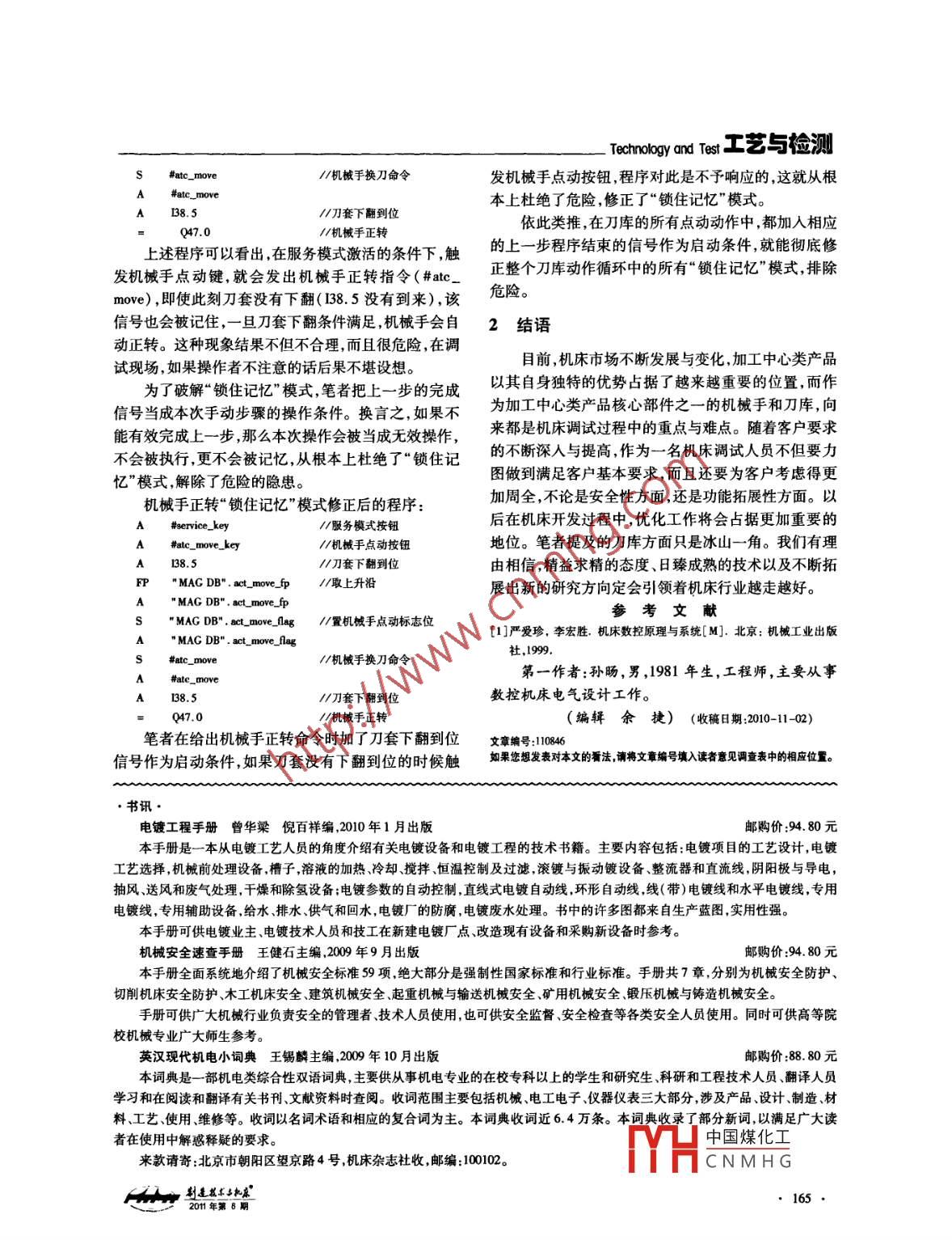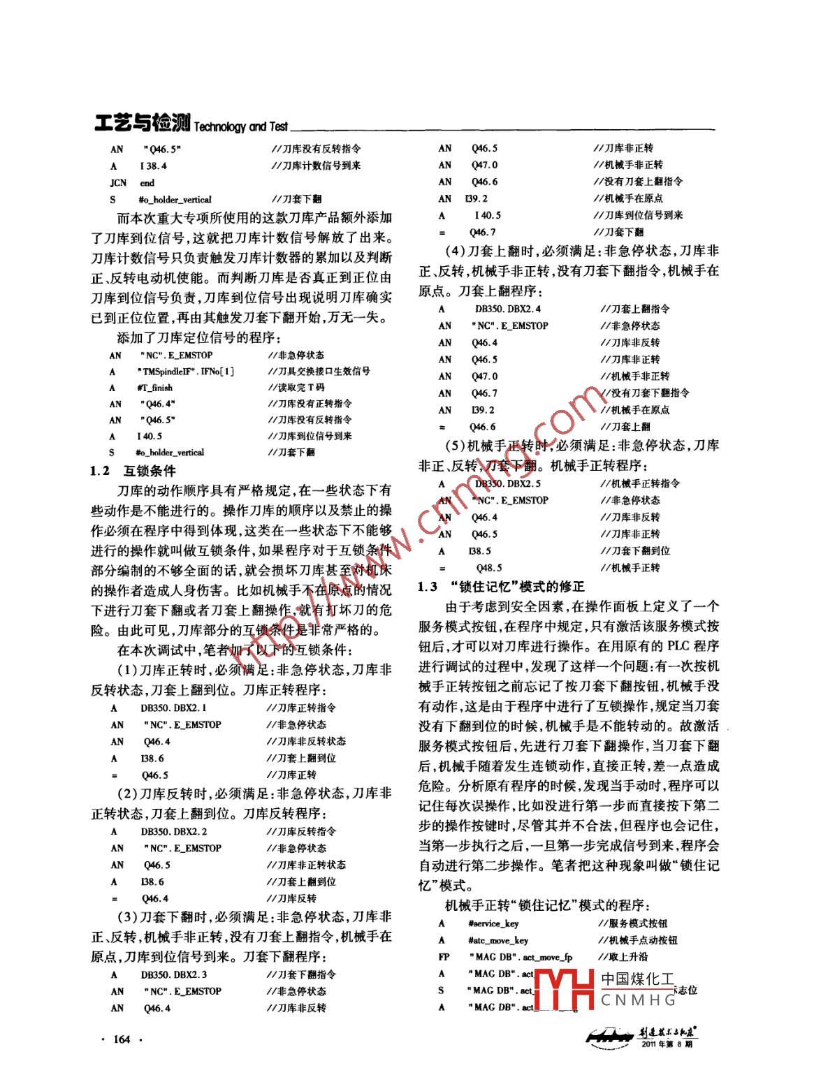 . Tennologv and Test工藝與檢測刀庫的調(diào)試及優(yōu)化孫旸化春雷李焱(沈陽機(jī)床(集團(tuán))有限責(zé)任公司,遼寧沈陽110142)摘要:針對重大專項(xiàng)機(jī)床產(chǎn) 品刀庫部分的調(diào)試,概括總結(jié)了在刀庫調(diào)試過程中可能出現(xiàn)的問題,分析了所述問題的成因,在此基礎(chǔ)上給出了各種問題的解決方法并對程序進(jìn)行優(yōu)化。關(guān)鍵詞:定位信號互鎖“鎖住記憶” 模式中圖分類號:TH39文獻(xiàn)標(biāo)識碼:BThe debugging and optimization of tool storageSUN Yang, HUA Chunlei, LI Yan(Shenyang Machine Tool( group) Co. , Ld. , Shenyang 110142, CHN)Abstract: In allusion to the debugging of tool storage in specific projects , this paper generalizes several probableproblems during the debugging process , analyses the reasons, and then brings forward the solutions ofthe mentioned problems , makes optimization finally.Keywords: Orientation Signals ;Interlock ;Locking Memory Mode刀庫系統(tǒng)是提供自動(dòng)化加工過程中所需的儲刀及累加。與此同時(shí),它實(shí)際上還有其他兩個(gè)額外的附加換刀需求的一種裝置,其自動(dòng)換刀機(jī)構(gòu)及可以儲放多功能:一是作為刀庫剎車信號,在刀庫真正到位之前來把刀具的特色改變了傳統(tǒng)以人為主的生產(chǎn)方式。其由臨,PLC讀取到該信號后,斷刀庫電動(dòng)機(jī)正、反轉(zhuǎn)使能,電腦程式的控制,可以完成各種不同的加工需求,如銑從而使得刀庫停下;二是作為刀庫到位檢測信號,來激削、鉆孔、鏜孔、攻牙等。根據(jù)刀庫的容量外形和取刀活刀套下翻電磁閥的啟動(dòng)。這是因?yàn)槿缜八?,它在方式可概分為斗笠式刀庫、圓盤式刀庫和鏈條式刀庫。刀庫真正到位之前到來,然后刀庫電動(dòng)機(jī)停止轉(zhuǎn)動(dòng),一本次重大專項(xiàng)所采用的是圓盤式刀庫。般認(rèn)為這個(gè)緩沖時(shí)間剛好能確保刀庫停在正位位置。但有時(shí)這也會(huì)出現(xiàn)偏差,造成的結(jié)果就是刀庫還沒轉(zhuǎn)1調(diào)試中容 易出現(xiàn)的問題及解決方法到正位刀套就開始下翻,易造成刀套受損。1.1刀庫定位信號的應(yīng)用利用刀庫計(jì)數(shù)信號充當(dāng)?shù)稁斓轿恍盘柕某绦?在以往所接觸到的刀庫中,在檢測刀庫是否轉(zhuǎn)到AN " NC". E. EMSTOP//非急停狀態(tài)位的方面,大多只有一個(gè)刀庫計(jì)數(shù)信號。所謂刀庫計(jì)"TMSpindlelF" . IFNo[1]1/刀具交換接口生效信號#T_ finish//讀取完T碼數(shù),顧名思義,就是刀庫每轉(zhuǎn)到下一工位的時(shí)候,由其AN " Q46.4"http://刀庫沒有正轉(zhuǎn)指令提供-一個(gè)信號,告訴PLC應(yīng)該把所記載的工位數(shù)隨之程序可移植性更高。結(jié)合實(shí)驗(yàn)室現(xiàn)有圓柱度儀通過大2004(11):54-56.量測量實(shí)例證明了該方法的正確性。這種方法還可以[4]Matlab COM Builder user' s guide [Z] . TheMathworks Ine ,2002.推廣到圓柱度、直線度、平面度等形狀誤差的評定計(jì)算[5]方沁林,徐振高.圓度誤差評定的算法研究與軟件設(shè)計(jì)[D].幗優(yōu)秀碩七學(xué)位論文全文數(shù)據(jù)庫,009(3).過程中。.[6]周劍平.基于MATLAB的圓度評定方法[J].計(jì)量與測試技術(shù),2005參考文獻(xiàn)(32).[1]岳玉芳,尤忠生,張玉雙.基于COM的VB與Matlab混合編程[J].第一作者:曾浩然,男,1985年生,碩士研究生,主計(jì)算機(jī)工程與設(shè)計(jì),2005(1) .61-65.要從事精度設(shè)計(jì)、GPS應(yīng)用技術(shù)等領(lǐng)域的研究。[2]王夢蛟,王麗莉基于COM組件的VB與Malab混合編程在醫(yī)學(xué)影中國煤化工像處理中的應(yīng)用[J].醫(yī)院數(shù)字化2009(24) :32-33.文章編號:110845[3]管亮,馮新滬. VB6. 0調(diào)用Matlab6. 5編程的實(shí)現(xiàn)[J].控制工程,如果您想發(fā)表對本文的看法,請IYHCNMHG相應(yīng)位置。2011年第8期, 163.工藝與檢測Tetnovy andTest .AN "Q46.5"http://刀庫沒有反轉(zhuǎn)指令I(lǐng)N Q46.5//刀]庫非正轉(zhuǎn)38.4//刀庫計(jì)數(shù)信號到來IN Q47.0//機(jī)械手非正轉(zhuǎn)JCN endN Q46.6//沒有]套上翻指令s物. holder- verical1/刀套下翻//機(jī)械手在原點(diǎn)而本次重大專項(xiàng)所使用的這款刀庫產(chǎn)品額外添加140.5//刀庫到位信號到來了刀庫到位信號,這就把刀庫計(jì)數(shù)信號解放了出來。Q46.7刀庫計(jì)數(shù)信號負(fù)責(zé)觸發(fā)刀庫計(jì)數(shù)器的累加以及判斷(4)刀套上翻時(shí),必須滿足:非急停狀態(tài),刀庫非正、反轉(zhuǎn)電動(dòng)機(jī)使能。而判斷刀庫是否真正到正位由正、反轉(zhuǎn),機(jī)械手非正轉(zhuǎn),沒有刀套下翻指令,機(jī)械手在刀庫到位信號負(fù)責(zé),刀庫到位信號出現(xiàn)說明刀庫確實(shí)原點(diǎn)。刀套上翻程序:DB350. DBX2.41/刀套上翻指令已到正位位置,再由其觸發(fā)刀套下翻開始,萬無- -失。.ANNC". E_ EMSTOP//非急停狀態(tài)添加了刀庫定位信號的程序:AN 0Q46.4//刀庫非反轉(zhuǎn)//刀J庫非E轉(zhuǎn)"TMSpindleIF" . IFNo[1]//刀具交換接口生效信號#T_ finish//讀取完T碼AN Q46.7//沒有刀套下翻指令A(yù)N "Q46.4"http://刀庫沒有正轉(zhuǎn)指令A(yù)N 139.2//刀]庫沒有反轉(zhuǎn)指令Q46.6//刀套上翻//刀庫到位信母到來(5)機(jī)械手正轉(zhuǎn)時(shí),必須滿足:非急停狀態(tài),刀庫#o_ holder. vertical//刀]套下翻1.2 互鎖條件非正、反轉(zhuǎn),刀套下翻。機(jī)械手正轉(zhuǎn)程序:DB350. DBX2.5//機(jī)械手正轉(zhuǎn)指令刀庫的動(dòng)作順序
