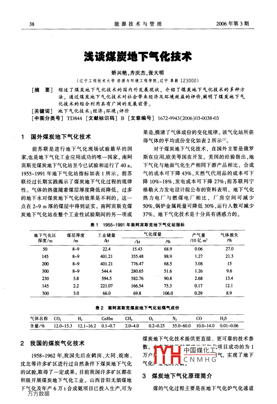 能源技術(shù)與管理2006年第3期淺談煤炭地下氣化技術(shù)矯興艷,齊慶杰,張大明(遼寧工程技術(shù)大學(xué)資源與環(huán)境工程學(xué)院,遼寧阜新123000)[摘要]綜述了煤炭地下氣化技術(shù)的國(guó)內(nèi)外發(fā)展現(xiàn)狀,介紹了煤炭地下氣化技術(shù)的多種方法。通過煤炭地下氣化技術(shù)對(duì)社會(huì)帶來經(jīng)濟(jì)及環(huán)境效益的評(píng)價(jià),闡明了煤炭地下氣化技術(shù)的綜合利用具有廣闊的發(fā)展前景[關(guān)鍵詞]地下氣化技術(shù);經(jīng)濟(jì);環(huán)境;評(píng)價(jià)[中圖分類號(hào)]TD844[文獻(xiàn)標(biāo)識(shí)碼]B[文章編號(hào)]16729943(2006)0300384031國(guó)外煤炭地下氣化技術(shù)果是摸清了氣體成份的變化規(guī)律。該氣化站所獲得氣體的平均成份變化如表2所示1前蘇聯(lián)是進(jìn)行地下氣化現(xiàn)場(chǎng)試驗(yàn)最早的國(guó)對(duì)于煤炭地下氣化技術(shù),在國(guó)外主要是俄羅家也是地下氣化工業(yè)應(yīng)用成功的唯一國(guó)家。南阿斯在應(yīng)用歐美等國(guó)在開發(fā)。美國(guó)的經(jīng)驗(yàn)指出,地賓斯克煤炭地下氣化站至今已試驗(yàn)和運(yùn)行了40a,下氣化與地面氣化生產(chǎn)相同下游產(chǎn)品相比,合成1955-1991年地下氣化站指標(biāo)如表1所示。前蘇氣的成本可下降43%,天然氣代用品的成本可下聯(lián)經(jīng)過長(zhǎng)期實(shí)踐揭示了煤炭地下氣化過程的規(guī)律降10%-18%,發(fā)電成本可下降27%;前蘇聯(lián)列寧性。氣體的熱值隨著煤層厚度降低而降低。過多格勒火力發(fā)電設(shè)計(jì)院公布的資料表明,地下氣化的地下水對(duì)煤炭地下氣化的效果是不利的。這一熱力電廠與燃煤電廠相比,廠房空間可減少點(diǎn)在2~9m厚的煤層中得到證實(shí)。南阿賓斯克煤50%,鍋爐金屬耗量可降低30%,運(yùn)行人數(shù)可減少炭地下氣化站在整個(gè)工業(yè)性試驗(yàn)期間的另一項(xiàng)成37%。地下氣化技術(shù)是十分具有誘惑力的。表11955~1991年南阿賓斯克地下氣化站指標(biāo)地下氣化區(qū)煤層厚度工業(yè)儲(chǔ)量氣化煤量產(chǎn)氣量氣體損失深度/m/1億m315433554821.38~9280.6551.6582761452210730069.810602南阿賓斯克煤炭地下氣化站煤氣成份氣體名稱CO2H2 CnHm CH,O2N2C0H5s含量/%120-15.312.1~16201-0.720400.2-0.25550-60.010.0-14.0001-0.06煤炭地下氣化技術(shù)提供更直接、更可靠的技術(shù)參2我國(guó)的煤炭氣化技術(shù)數(shù)中國(guó)煤化工項(xiàng)目成功的為11958-1962年我國(guó)先后在鶴崗、大同、皖南、萬戶沈北等許多礦區(qū)進(jìn)行過自然條件下煤炭地下氣化氣化CNMHG氣,實(shí)現(xiàn)了地下的試驗(yàn)取得了一定成果。目前我國(guó)許多礦區(qū)都在3煤炭地下氣化原理簡(jiǎn)介積極開展煤炭地下氣化工業(yè)。山西昔陽無煙煤地下氣化及年產(chǎn)6萬t合成氨項(xiàng)目已投入生產(chǎn),可為煤的氣化過程主要是在地下氣化爐氣化通道方數(shù)據(jù)2006年第3期矯興艷等淺談煤炭地下氣化技術(shù)中進(jìn)行??扇?xì)怏w的產(chǎn)生在氣化通道中經(jīng)過三個(gè)給料反應(yīng)區(qū)域即氧化區(qū),還原區(qū)和干餾干燥區(qū),如圖1所示。儲(chǔ)煤倉循環(huán)焦油排氣孔助孔水蒸氣驅(qū)動(dòng)閥冷淬分配器固定篩氣流通道固定篩傳動(dòng)L通道化煤層水蒸汽+氧氣灰份倉圖1煤炭地下氣化地理圖煤炭氣化技術(shù)的發(fā)展圖2Lurg氣化爐在向下運(yùn)行到容器,煤通過許多線條區(qū)域。床煤炭氣化的主要技術(shù)困難不在過程中的化學(xué)層頂部被稱為預(yù)熱區(qū),溫度能很快的達(dá)到400℃物質(zhì)而是煤的性質(zhì)。原則講,任何反應(yīng)過程必須使之后進(jìn)入一個(gè)預(yù)氣化區(qū)域,在此區(qū)域甲烷、高含固體碳表面與反應(yīng)氣體達(dá)到有效的接觸,在整個(gè)量的C、H化合物和焦油被混合。隨后,在氣化區(qū)系統(tǒng)中煤的粒度分布也影響此過程。域,產(chǎn)生一氧化碳和氫氣。燃燒區(qū)和灰份層在爐再者,當(dāng)加熱到400℃-500℃時(shí),大部分煙條以上。當(dāng)氣體溫度相對(duì)降低到40℃-60℃煤變軟,在此條件下,顆??赡芎喜⑿纬纱蟮墓腆w時(shí),通過洗滌塔,焦油和煙塵被除掉,同時(shí)溫度降結(jié)構(gòu)組織。有效的固氣接觸應(yīng)在原料的粒度大小到185℃準(zhǔn)備工作上被要求。原料應(yīng)選擇非焦煤或預(yù)處理Lurgi氣化爐從1936年開始使用,已建立65的煤去破壞它的焦油量煤中包含一定的礦物質(zhì),家商業(yè)單位,大部分是供氧氣的,但是也有一部分這些物質(zhì)在氣化爐中以干灰份煤渣或熔渣形式被用空氣來產(chǎn)生低熱值的氣體。被用的大部分是褐提取。然而在此過程中它們的形成取決于礦物形煤、無煙煤,很少用煙煤。長(zhǎng)時(shí)間的試驗(yàn)性勞動(dòng)是成和所達(dá)到的溫度。很明顯,應(yīng)使灰份中含有最少Iu過程的有利條件,不利條件是:機(jī)械復(fù)雜性的碳,才能達(dá)到最大的轉(zhuǎn)化率。和結(jié)果的高消耗;小容量;含有焦油產(chǎn)品;要求高第三考慮的是在氣化爐中放熱和吸熱區(qū)域間壓水蒸氣;煤的形狀和焦油量的選擇性要求有效的熱交換。人們?cè)噲D解決這些問題,促使有許懸浮汽化— koppers totzek過程多不同的氣化方法的發(fā)展2。幾種類型的例子描Kopper-Totzek過程如圖3所示。述如下固定